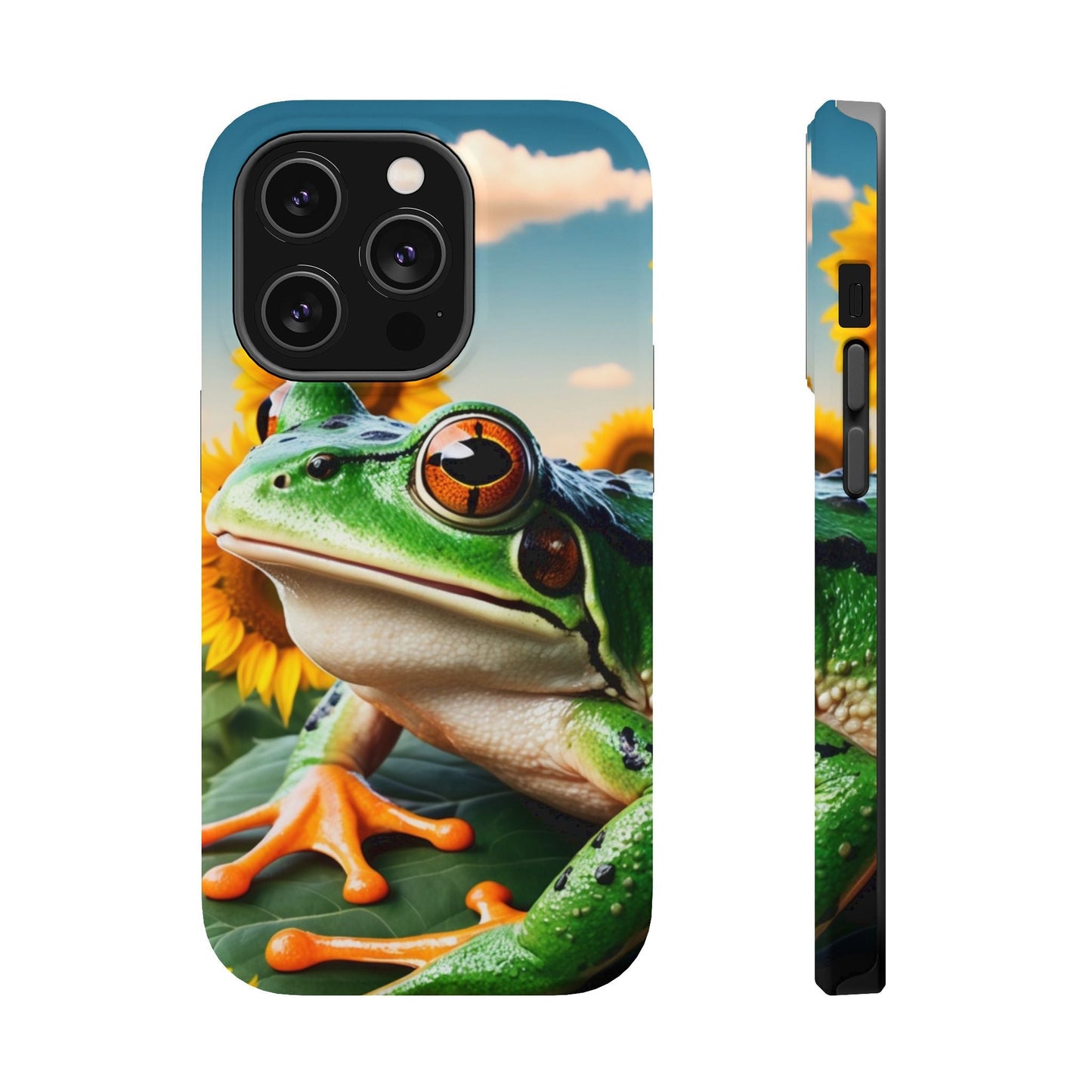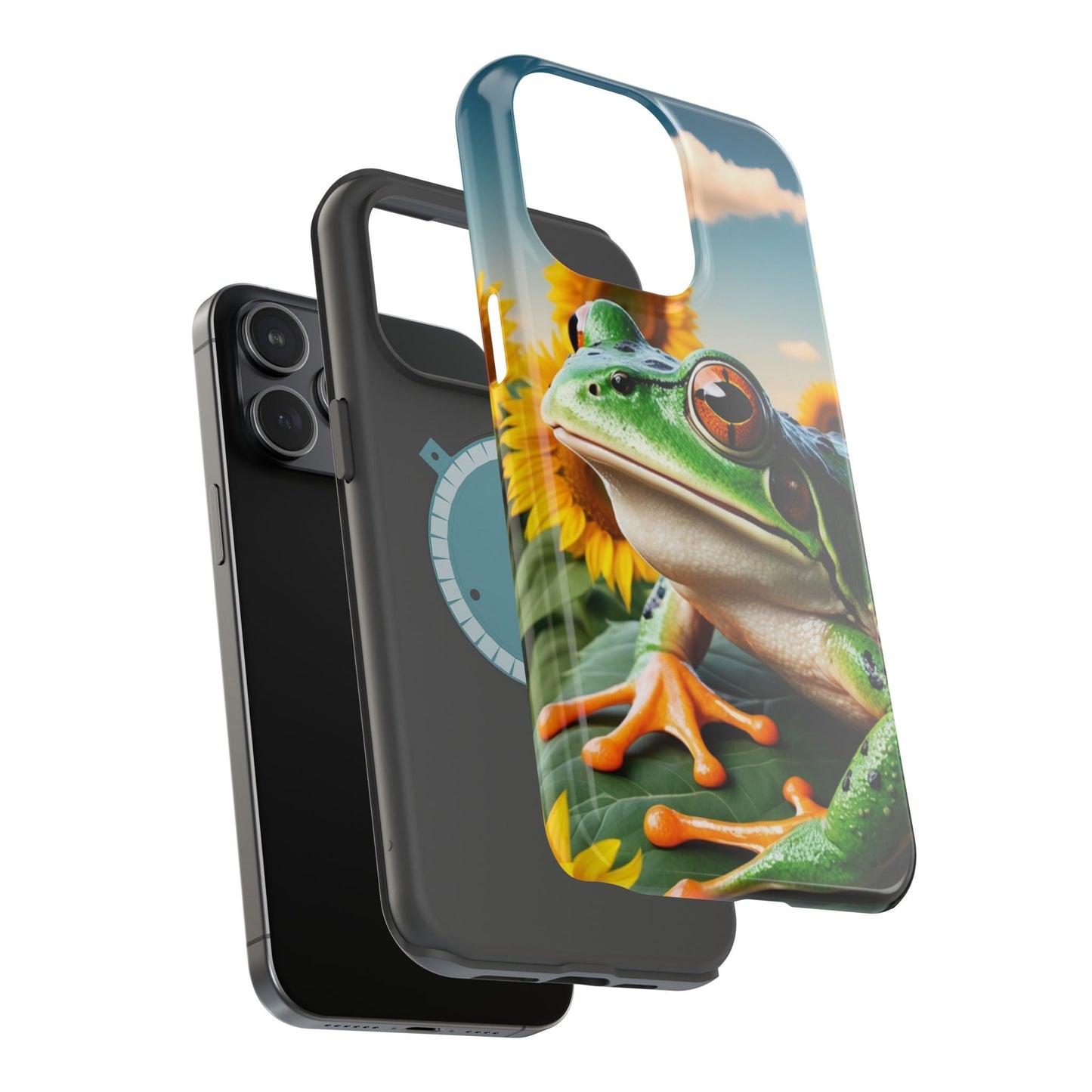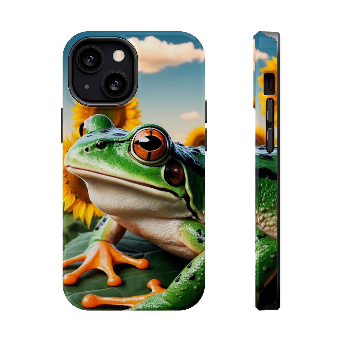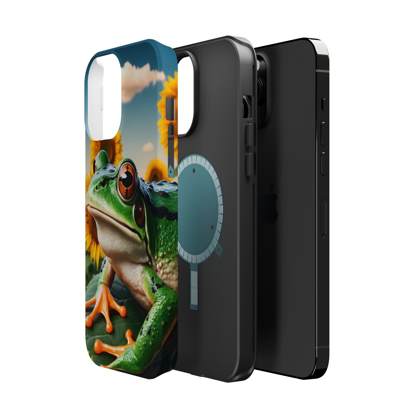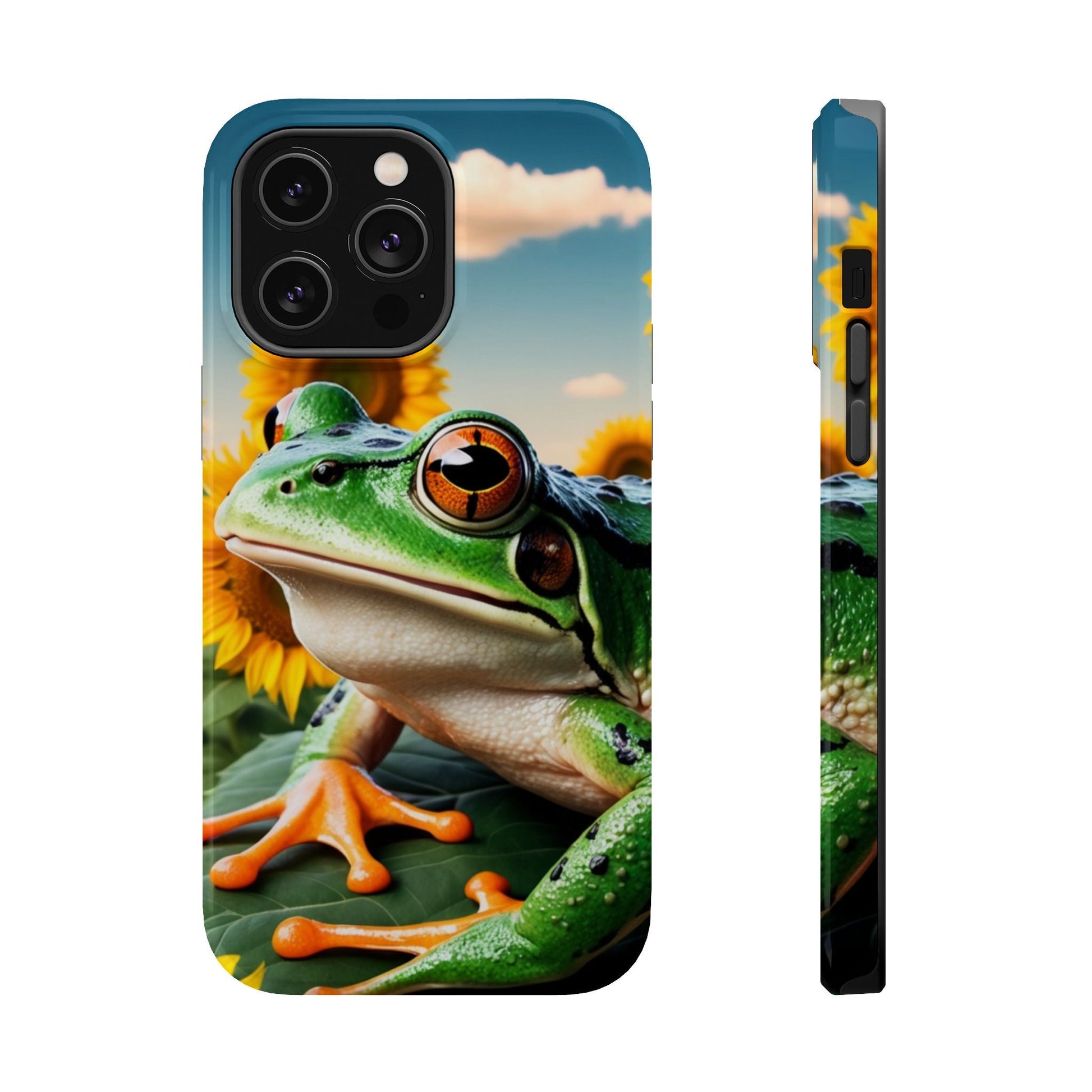 Let nature and sunshine inspire your daily vibe with the Sunflower Frog Aesthetic MagSafe iPhone Case! This beautifully detailed case showcases a lush, golden sunflower field with a realistic tree frog sitting among the leaves, bringing a whimsical yet elegant touch to your phone. Built with MagSafe-compatible magnets, it allows for fast, easy wireless charging while the shock-absorbing TPU bumper and raised edges keep your phone safe from drops and scratches.