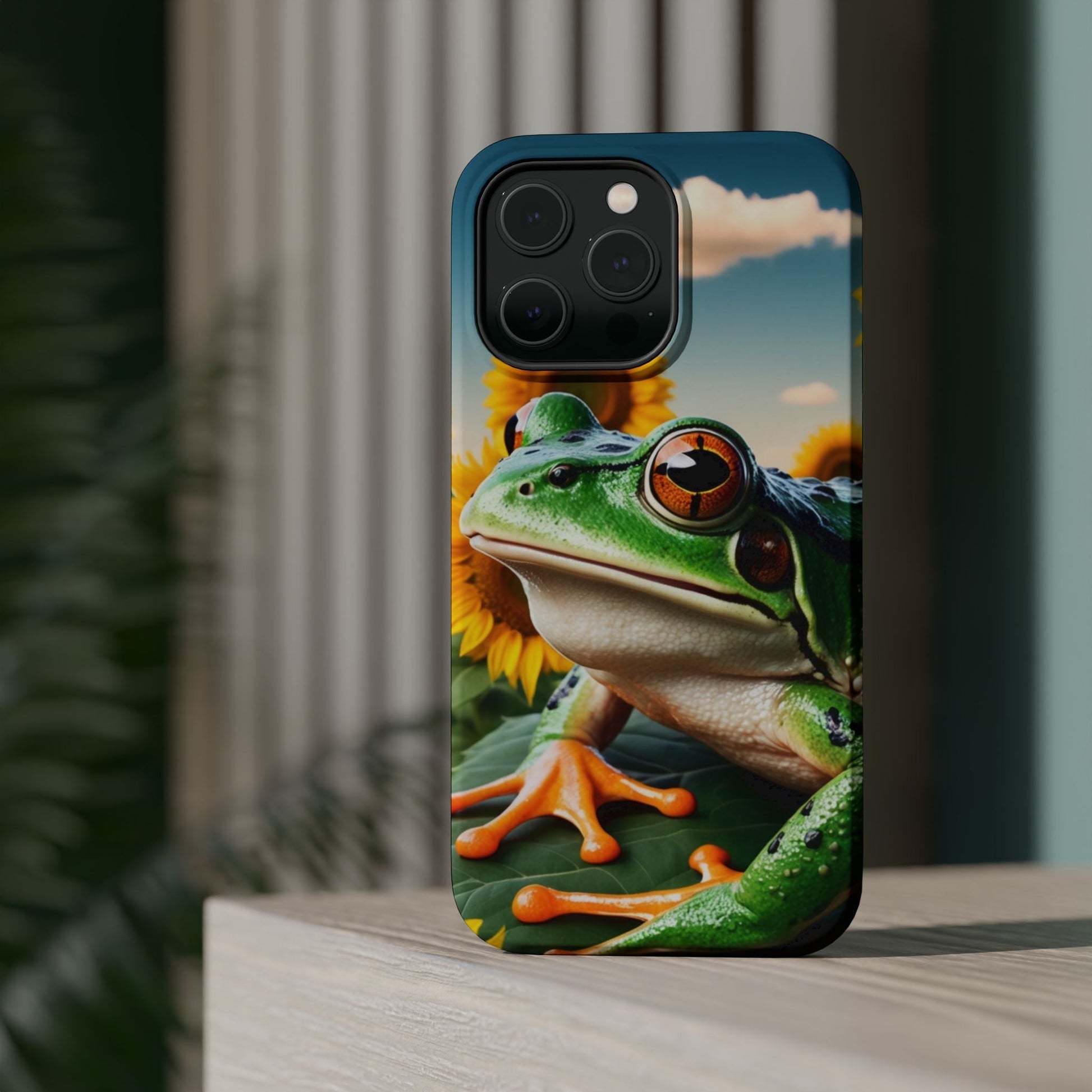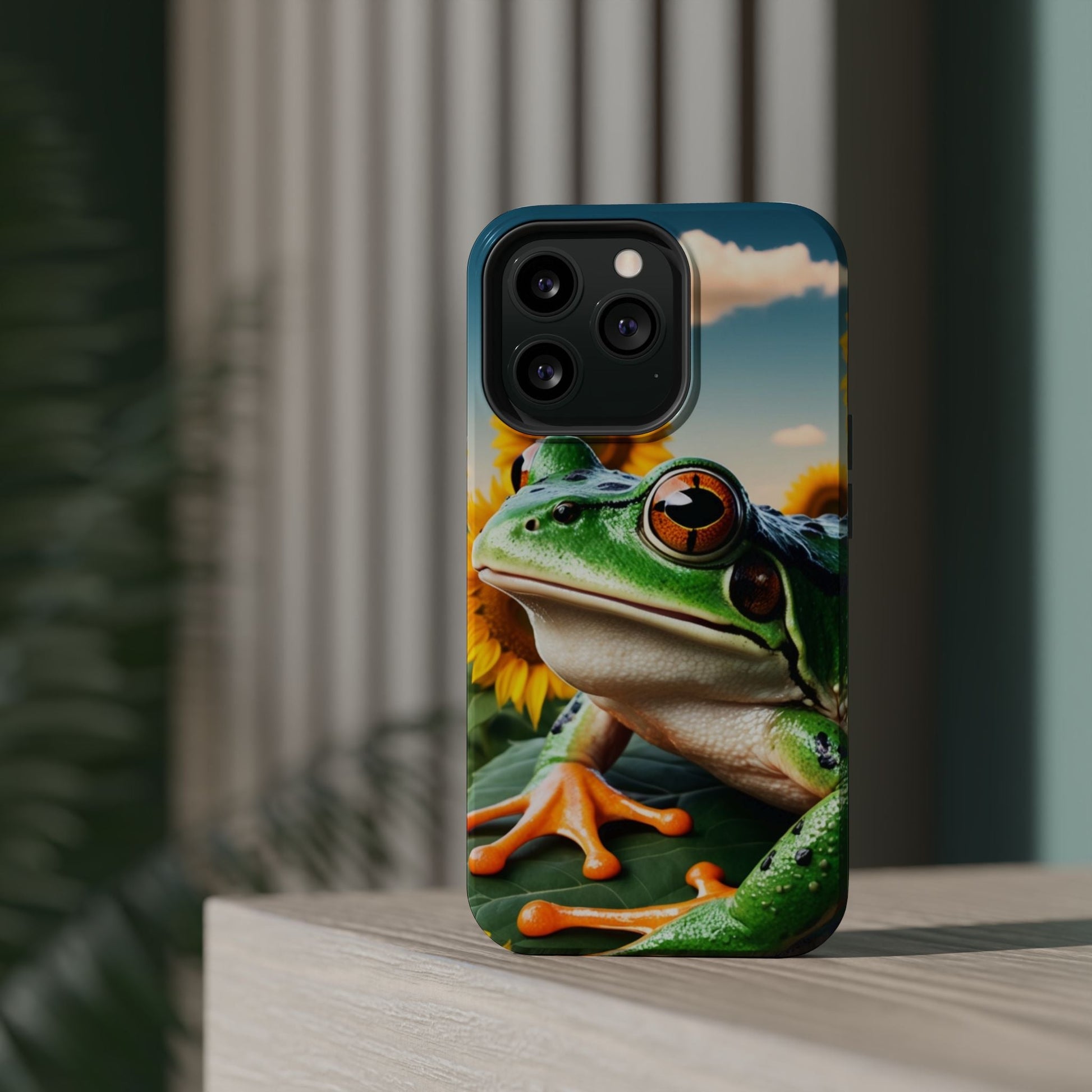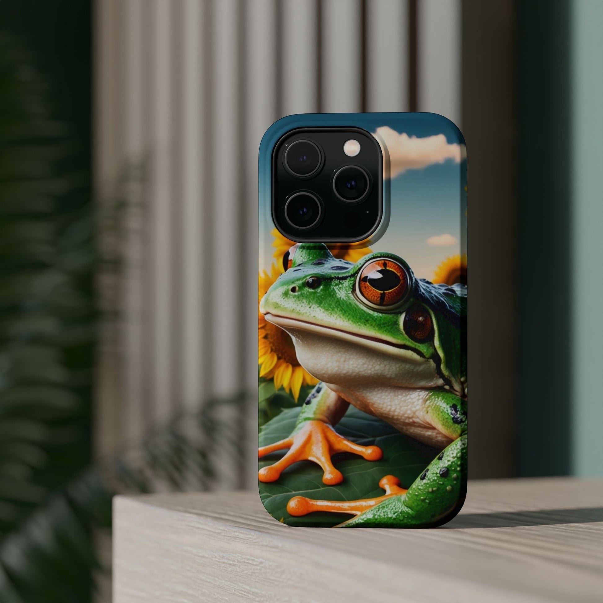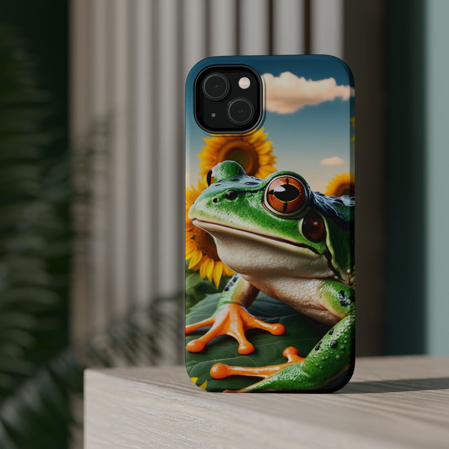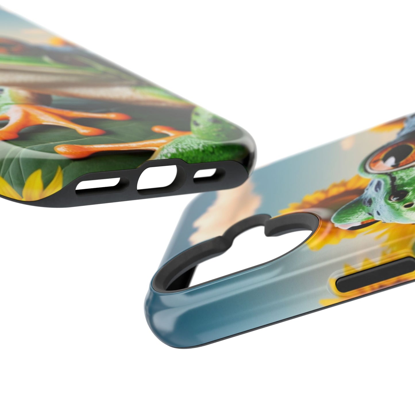 Let nature and sunshine inspire your daily vibe with the Sunflower Frog Aesthetic MagSafe iPhone Case! This beautifully detailed case showcases a lush, golden sunflower field with a realistic tree frog sitting among the leaves, bringing a whimsical yet elegant touch to your phone. Built with MagSafe-compatible magnets, it allows for fast, easy wireless charging while the shock-absorbing TPU bumper and raised edges keep your phone safe from drops and scratches.