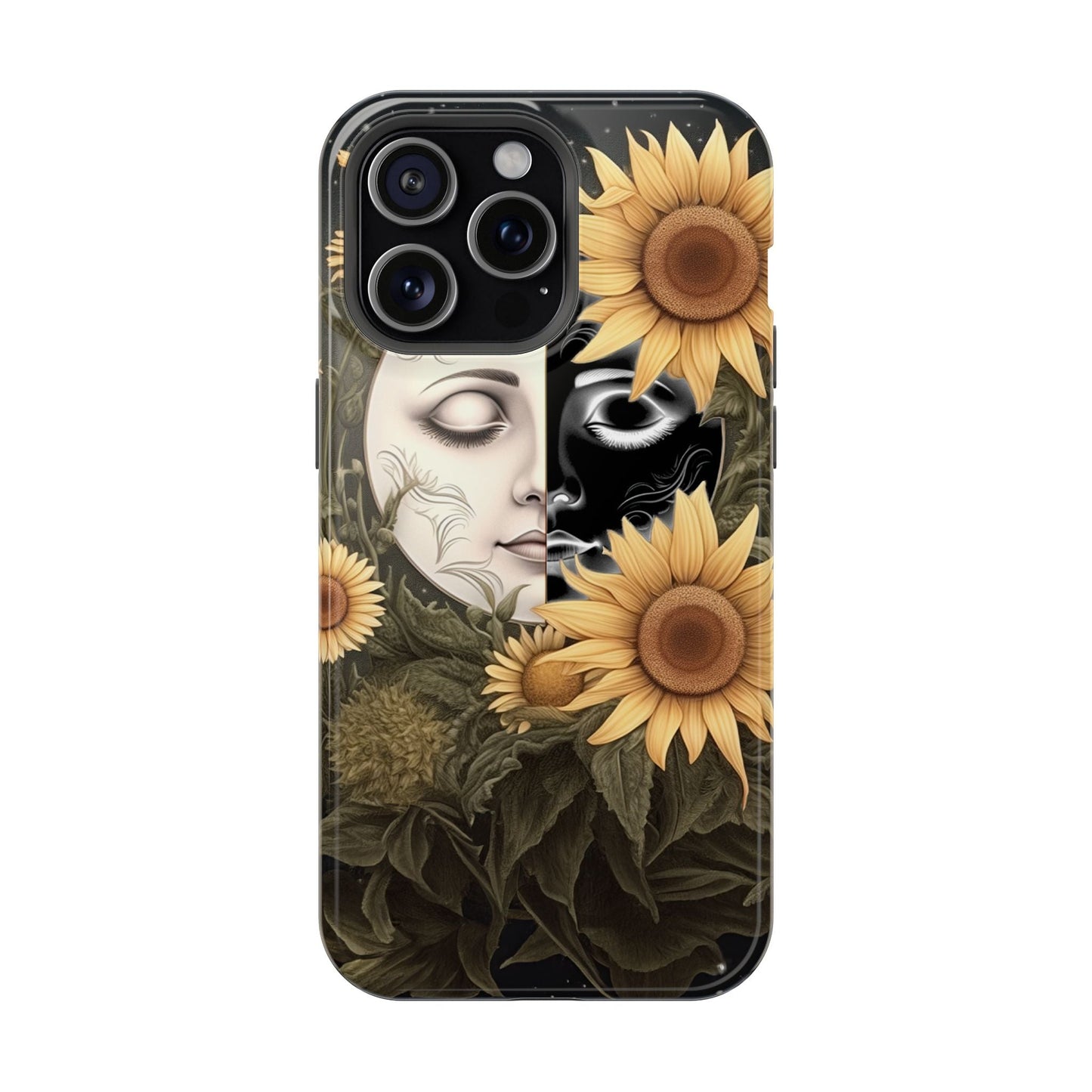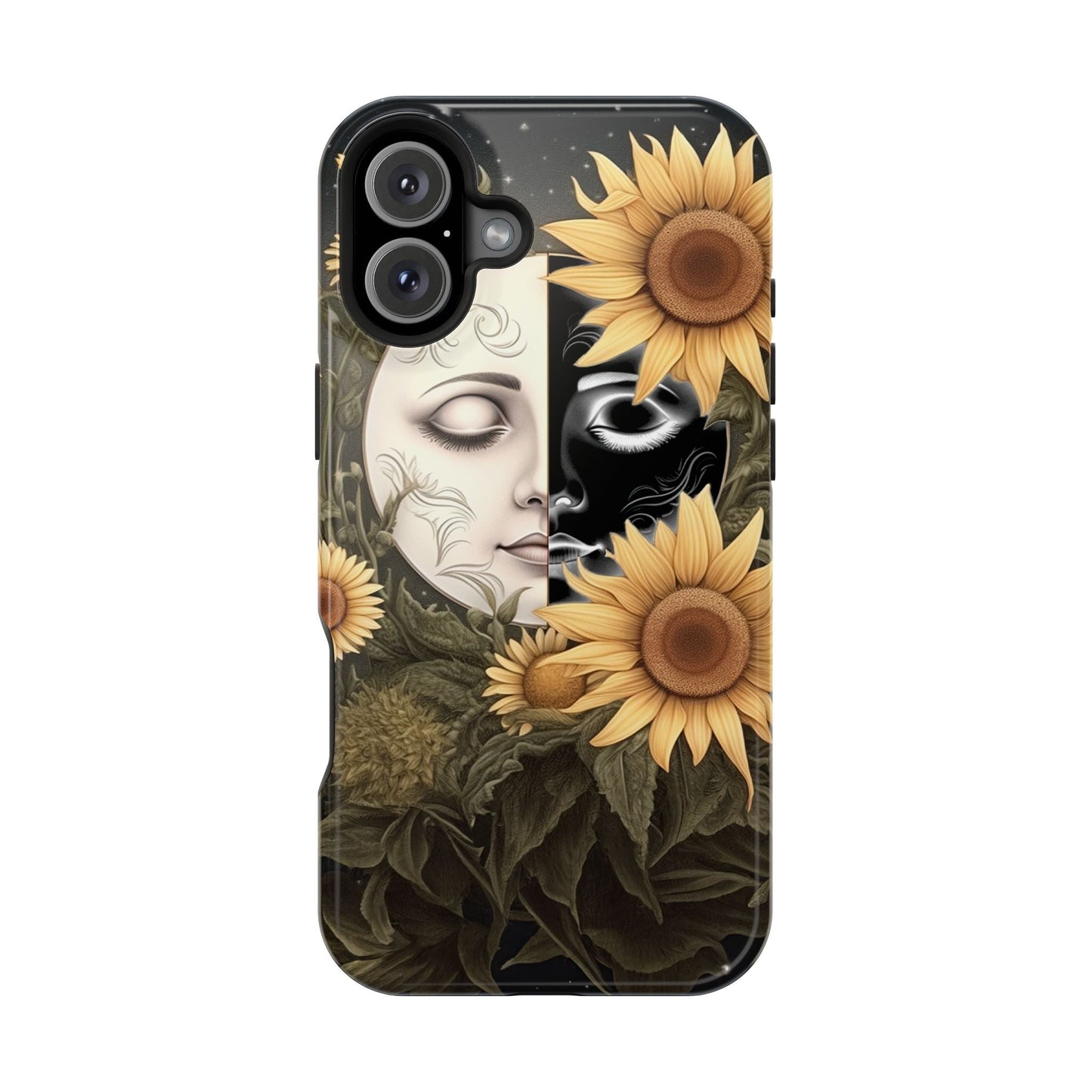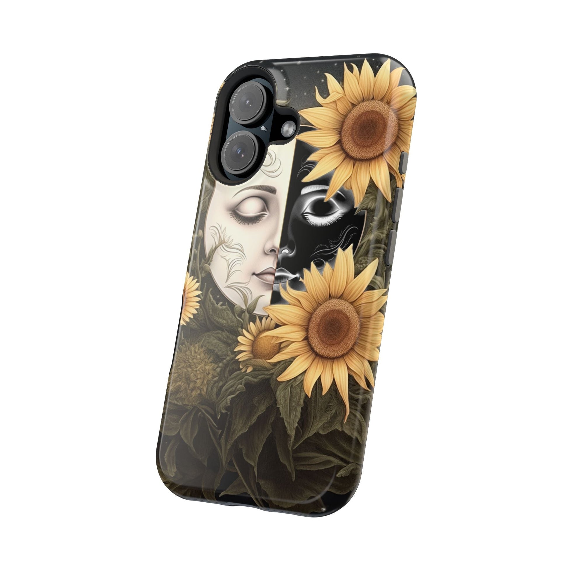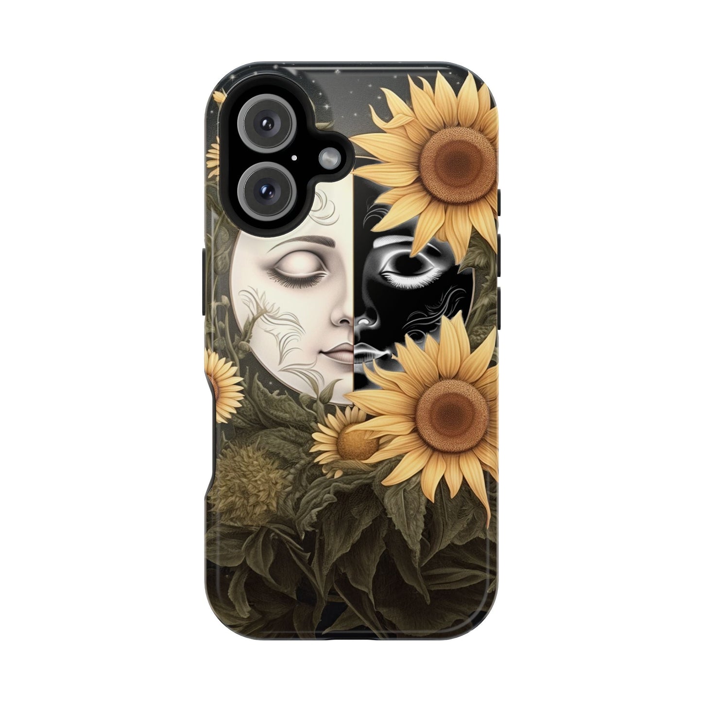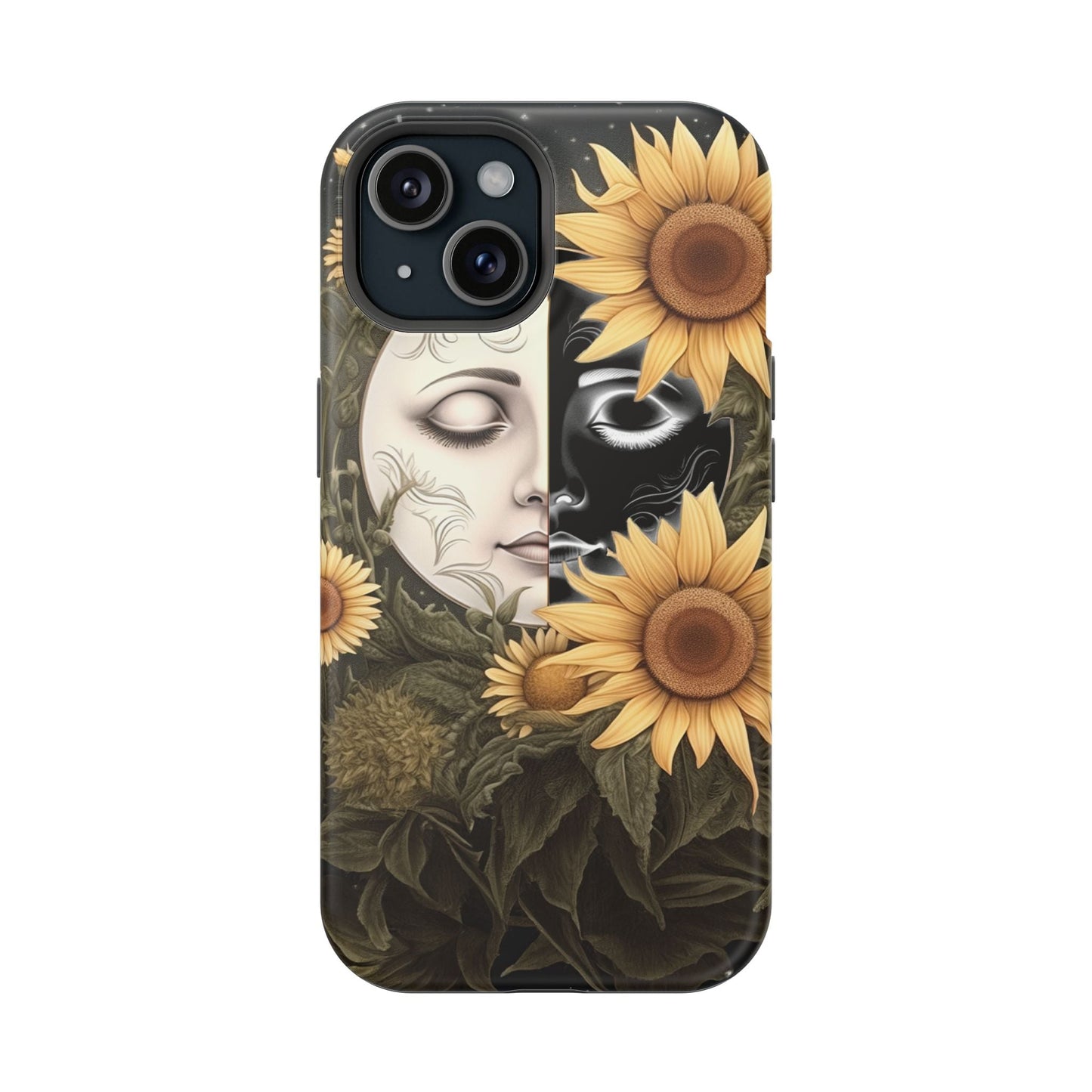 Protect your MagSafe-compatible iPhone with the enchanting Sunflower Moon and Stars Case. Its design showcases a luminous moon encircled by sunflowers, set against a cosmic, starry sky, blending nature and mysticism for a stunning effect.