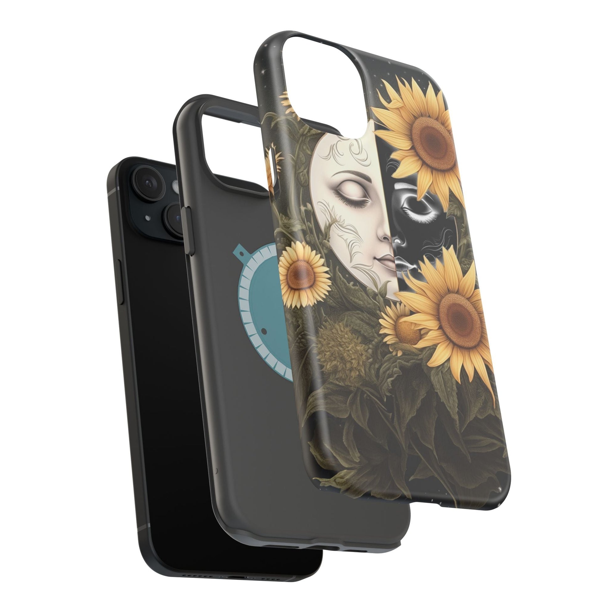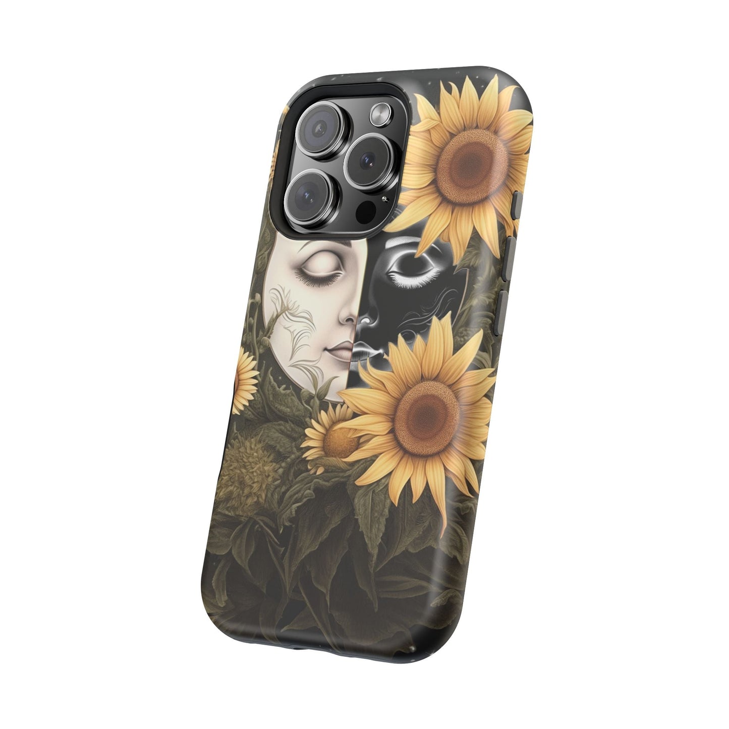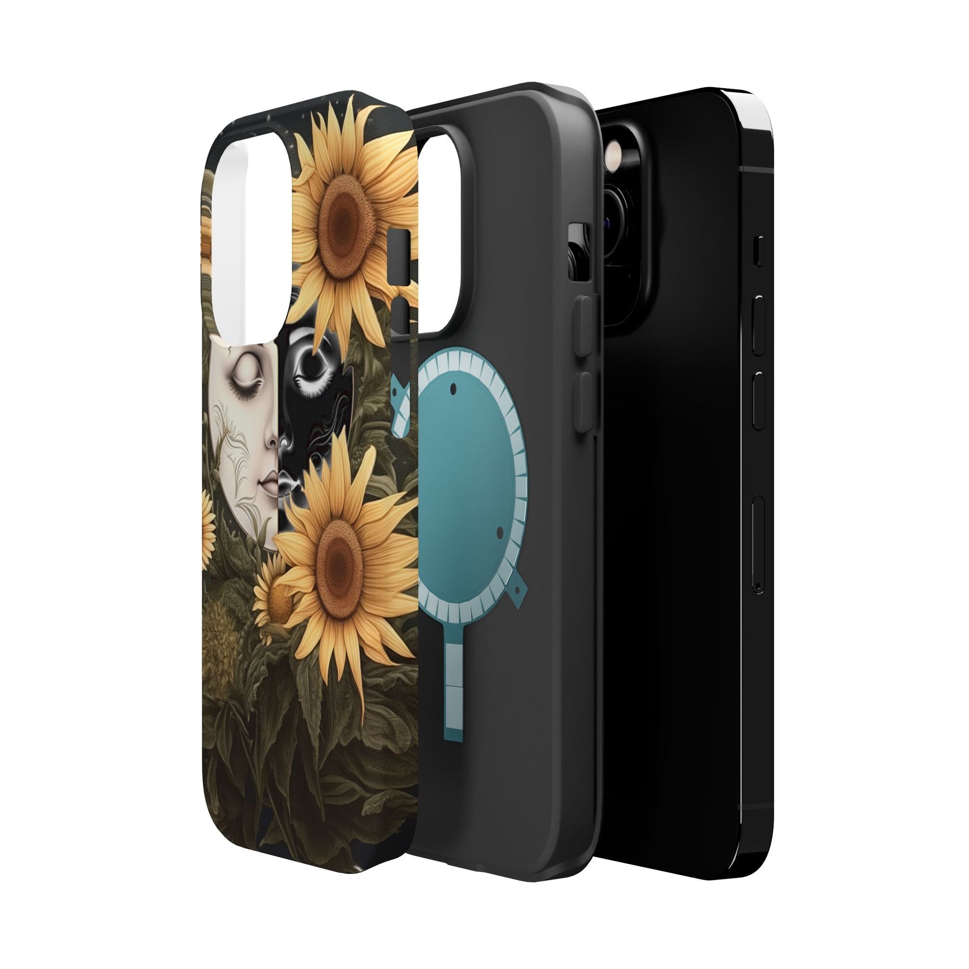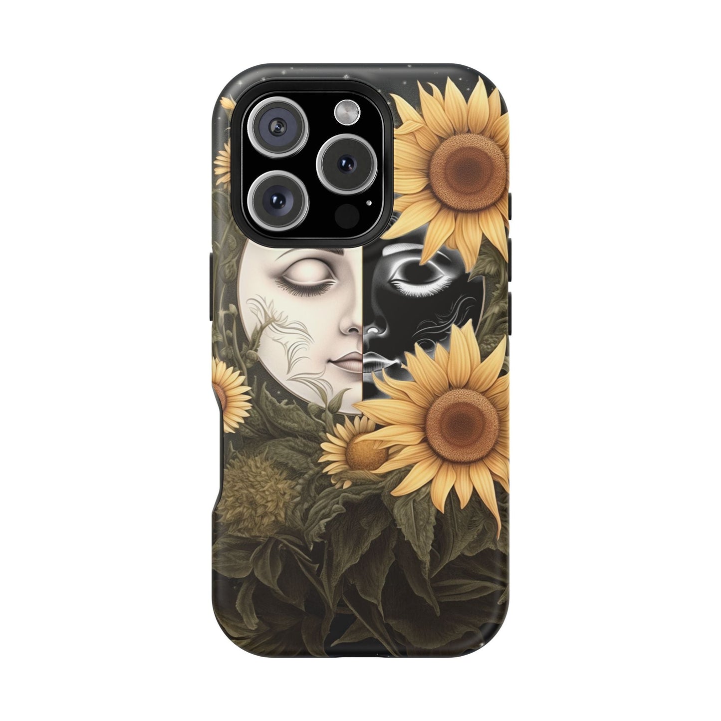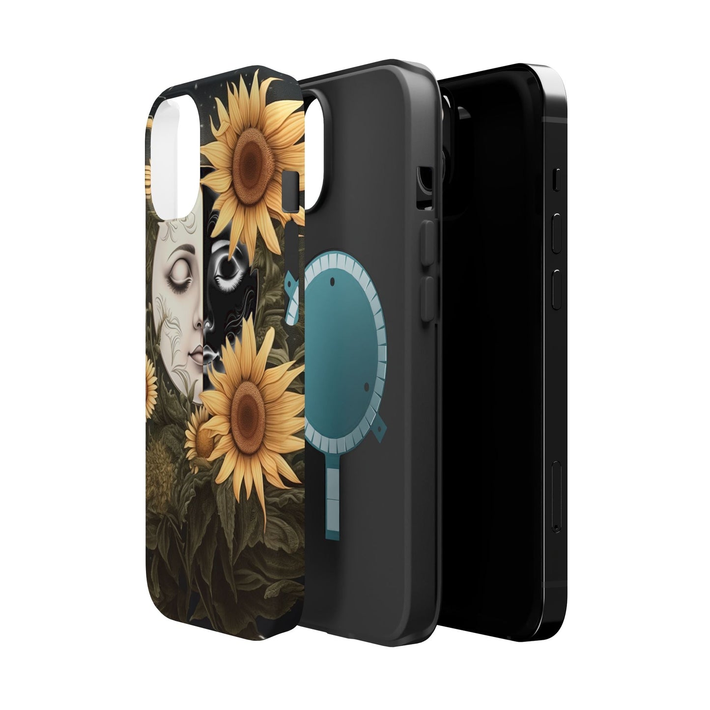 Protect your MagSafe-compatible iPhone with the enchanting Sunflower Moon and Stars Case. Its design showcases a luminous moon encircled by sunflowers, set against a cosmic, starry sky, blending nature and mysticism for a stunning effect.