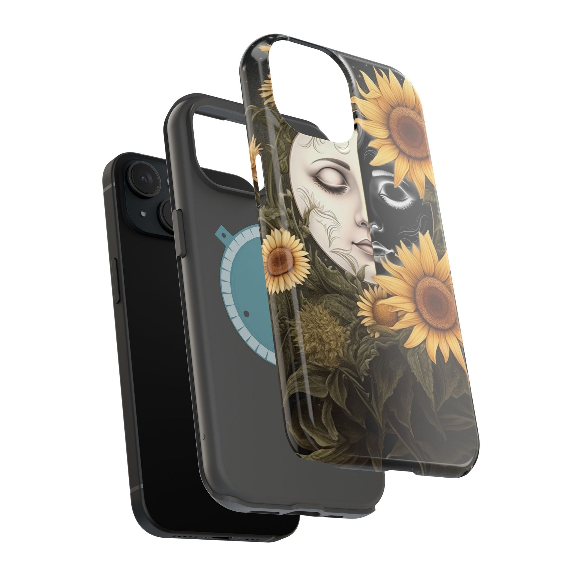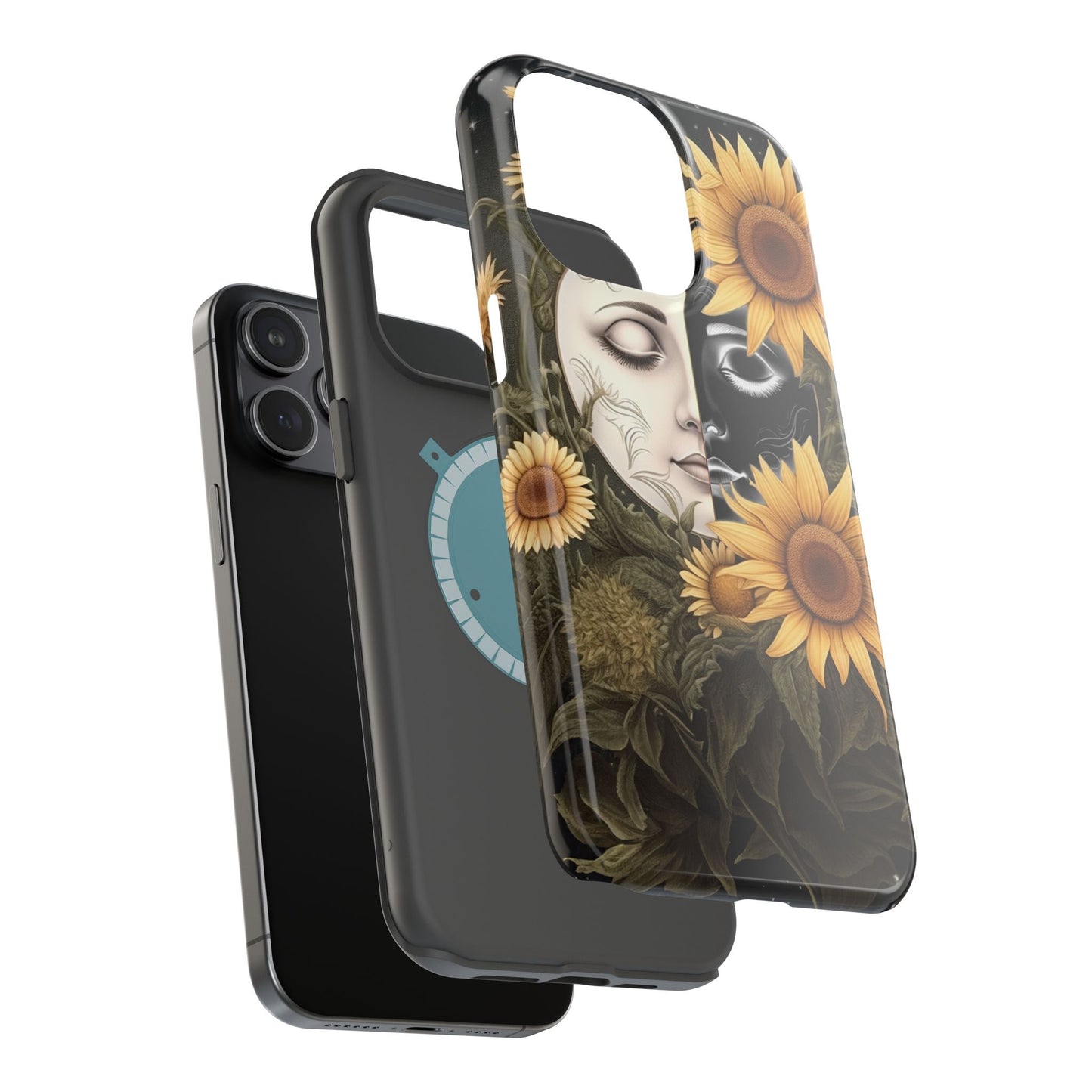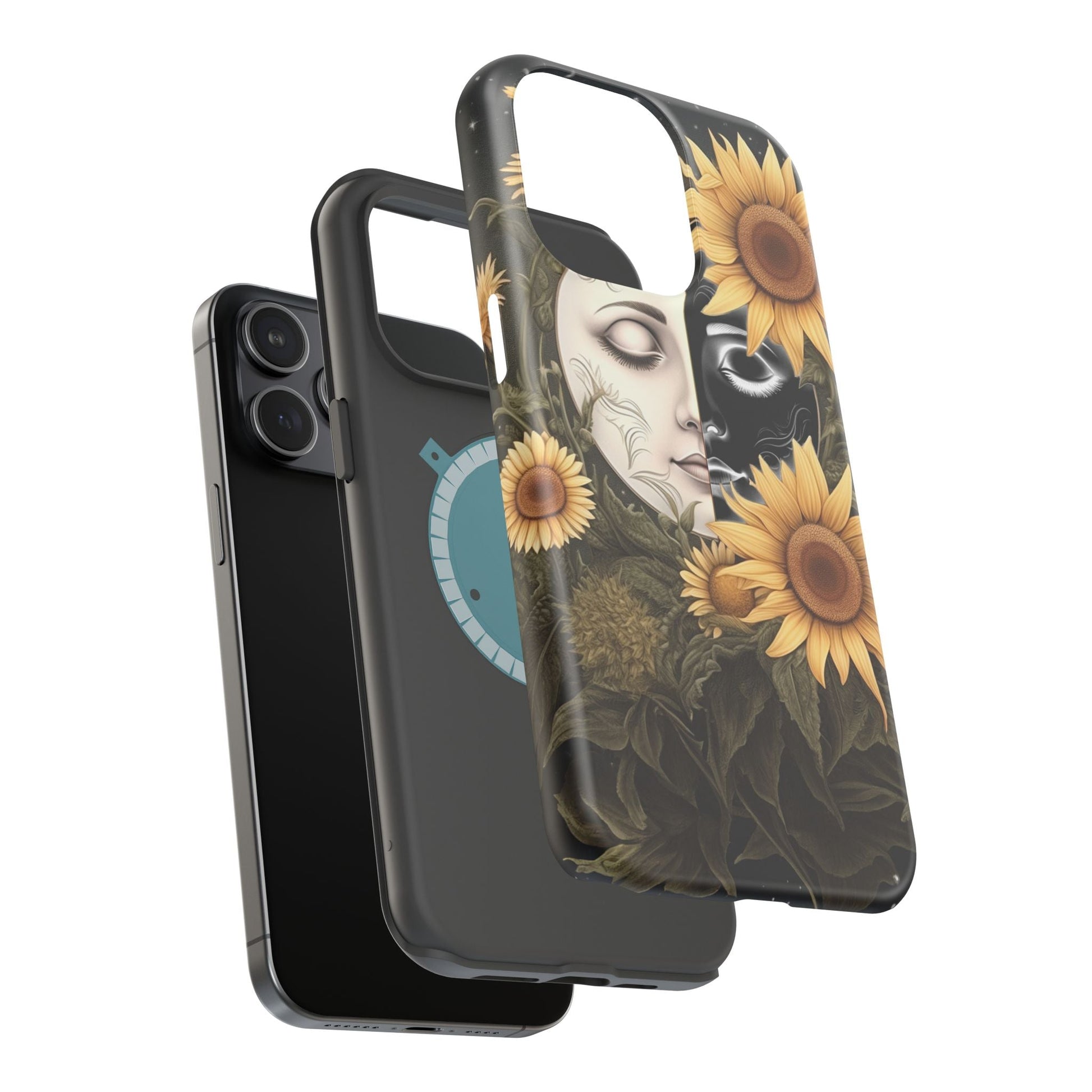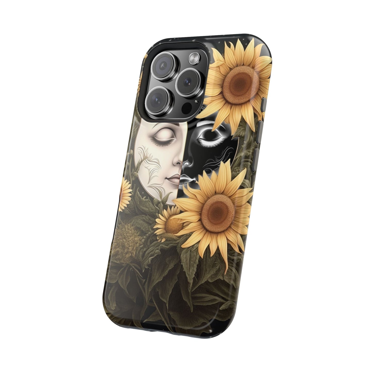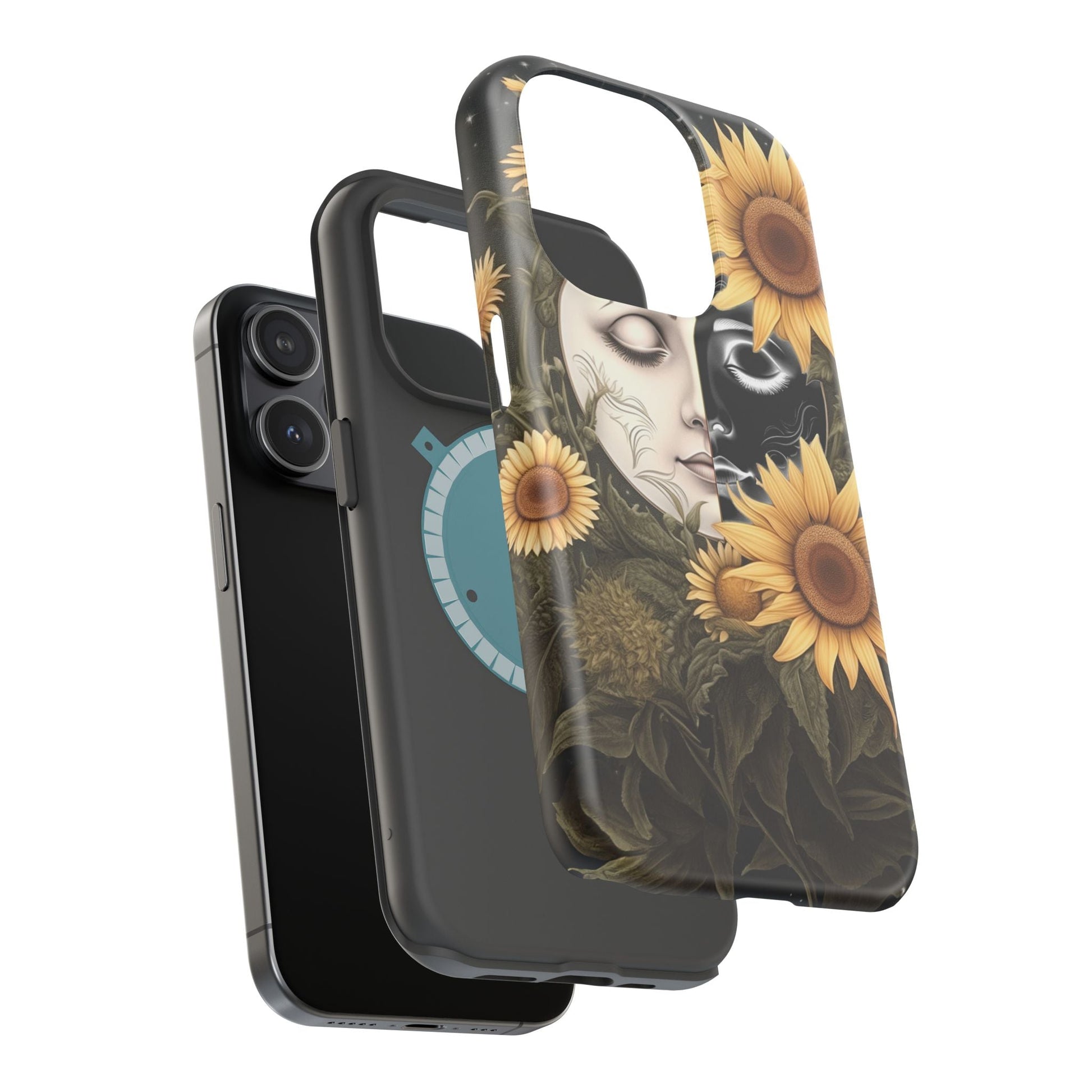 Protect your MagSafe-compatible iPhone with the enchanting Sunflower Moon and Stars Case. Its design showcases a luminous moon encircled by sunflowers, set against a cosmic, starry sky, blending nature and mysticism for a stunning effect.