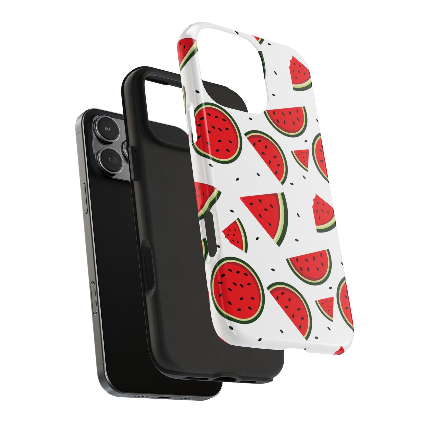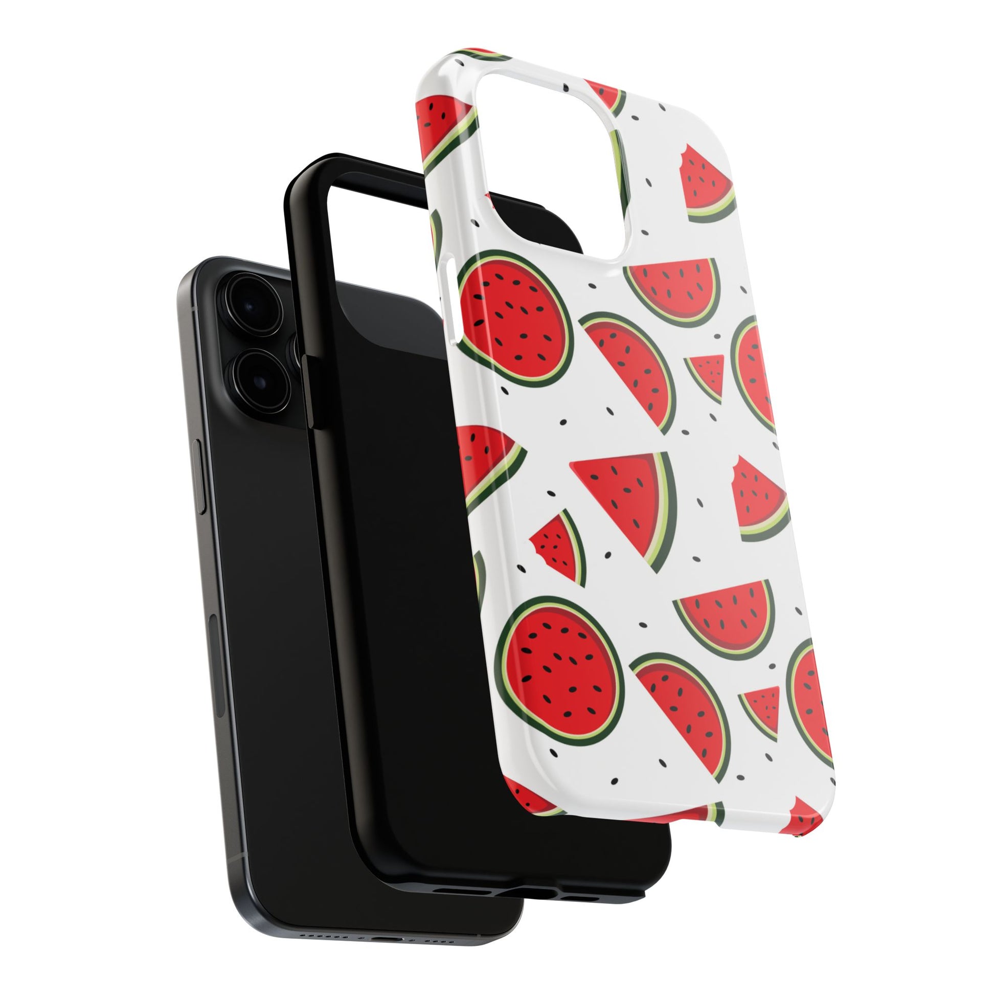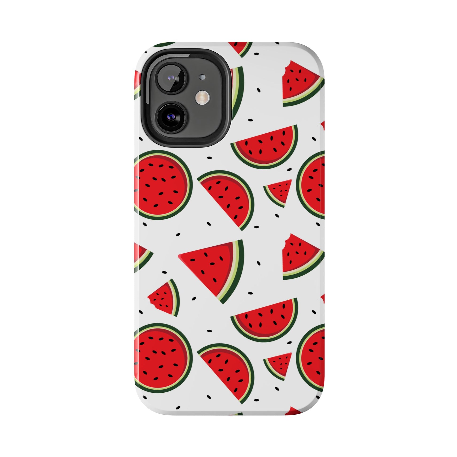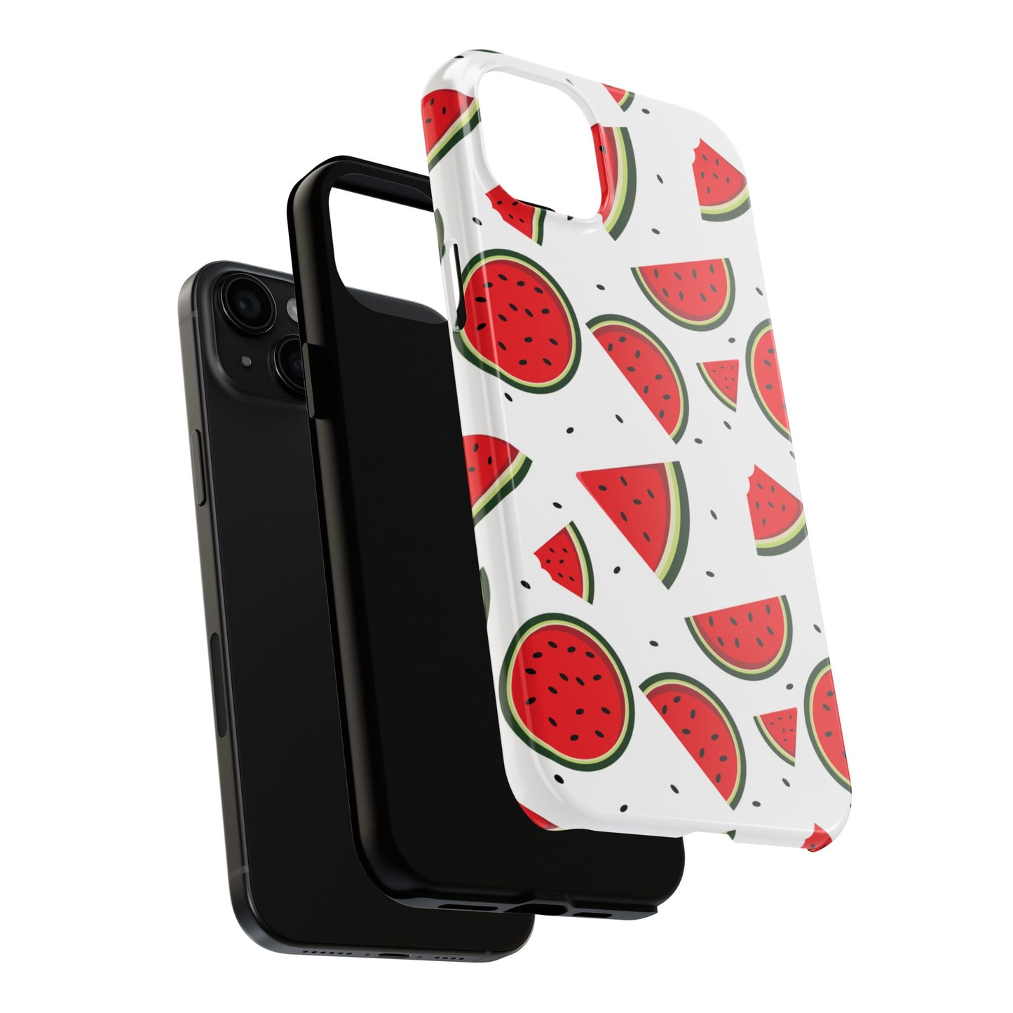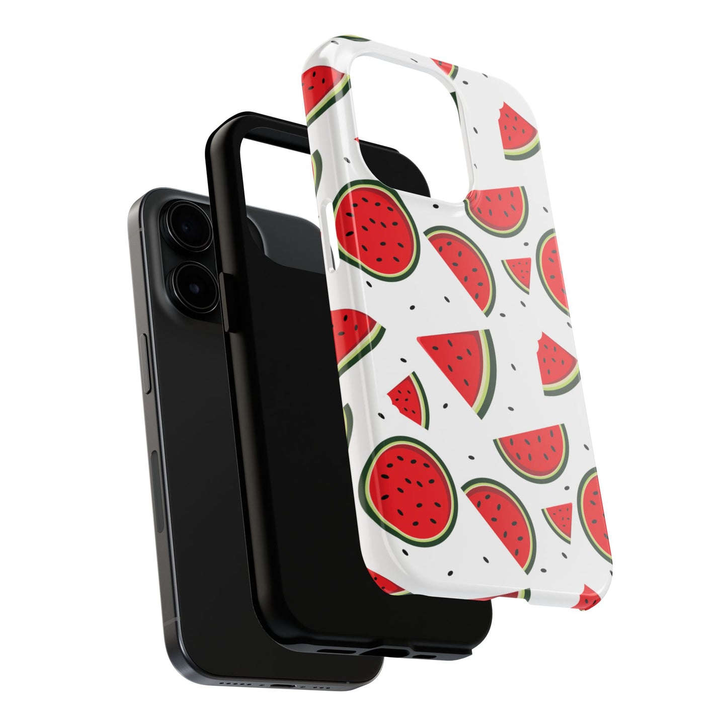 Stay cool and stylish with our Sweet Watermelon iPhone Case! Featuring a cheerful pattern of vibrant watermelon slices and rounds on a crisp white background, this case adds a fresh and playful touch to your phone. Perfect for capturing those summer vibes all year round, the design is fun yet minimal, making it easy to match with any look. Made with a tough polycarbonate shell and a shock-absorbing TPU liner, this case offers top-notch protection while keeping your phone cute and colorful.