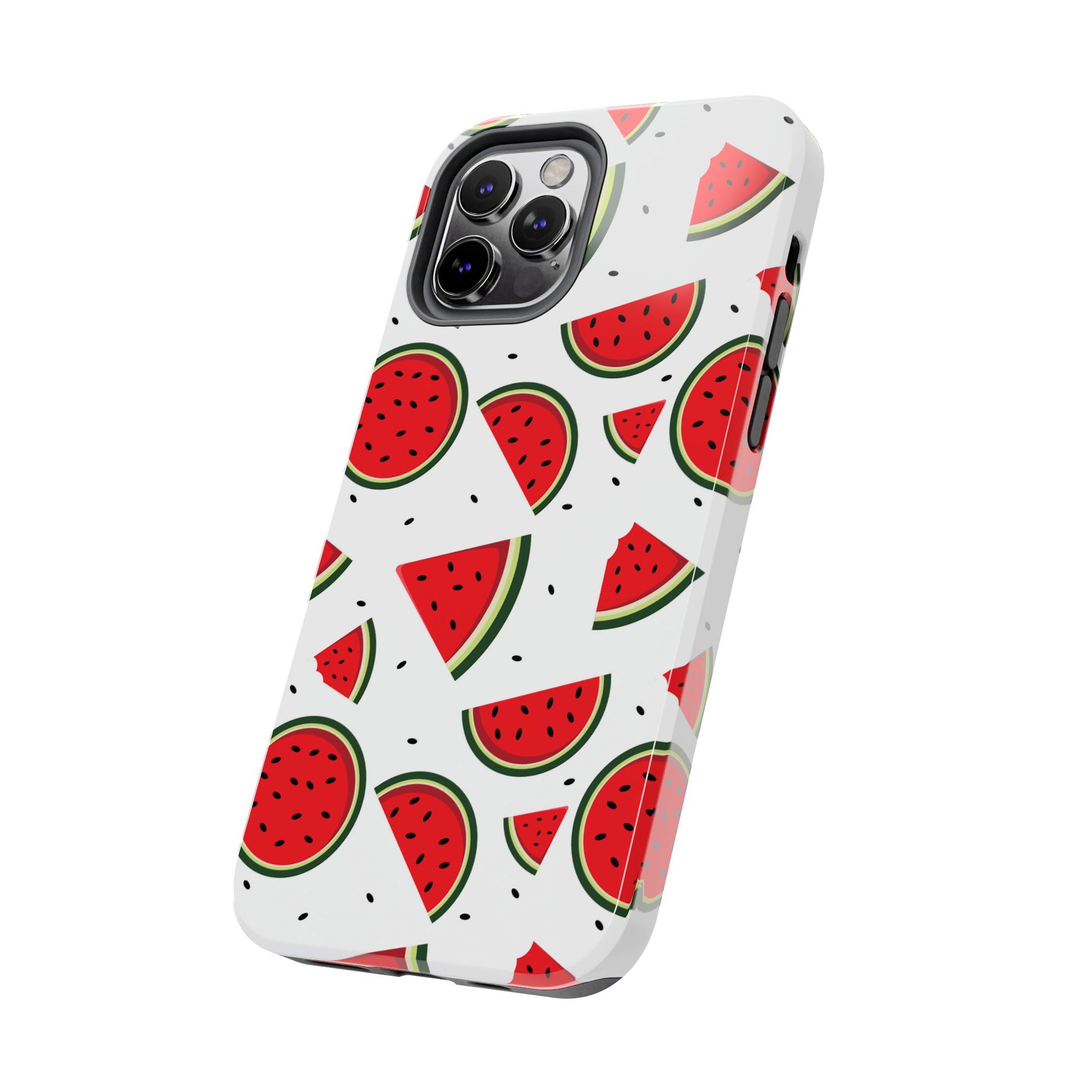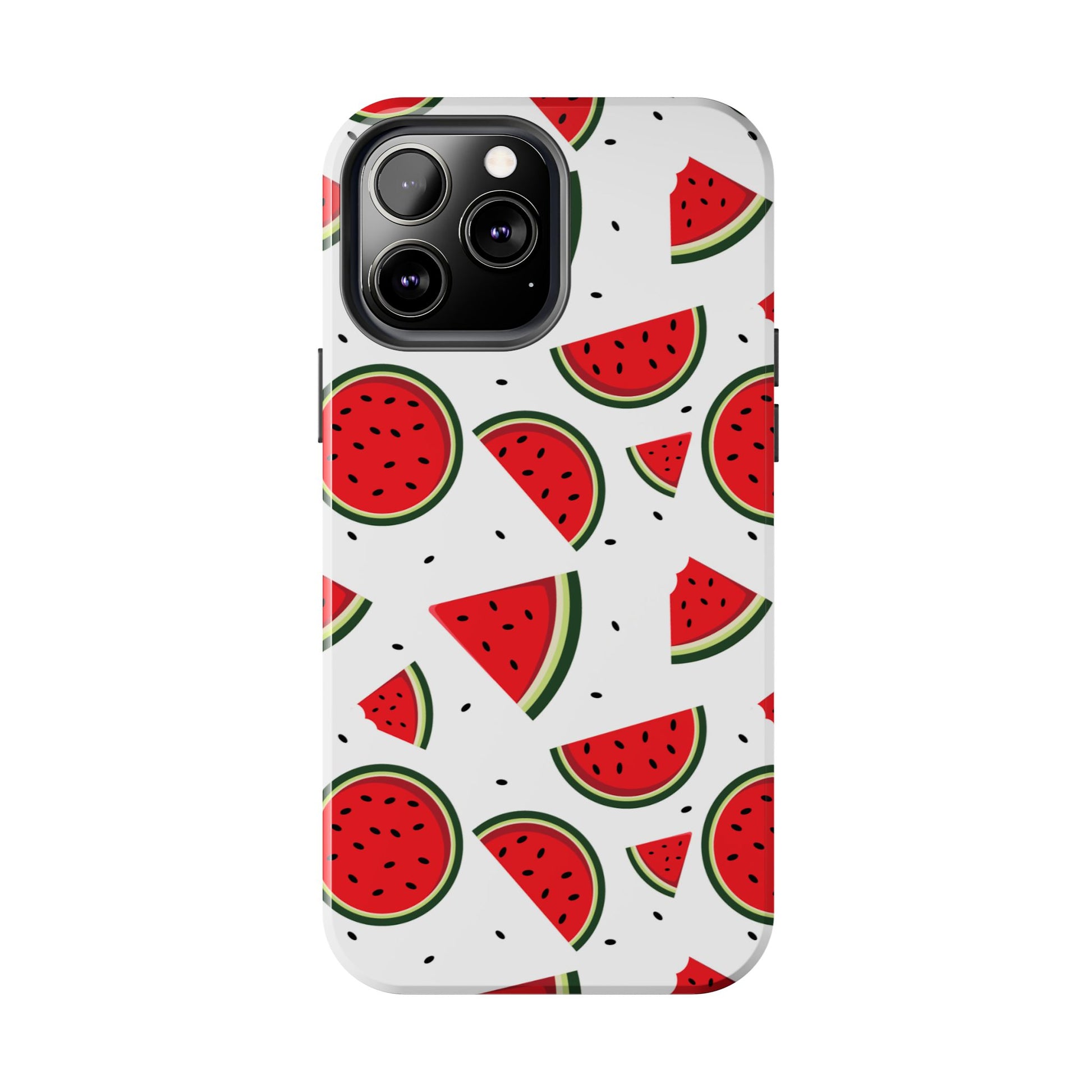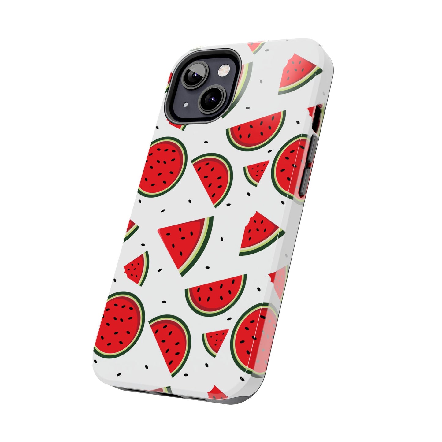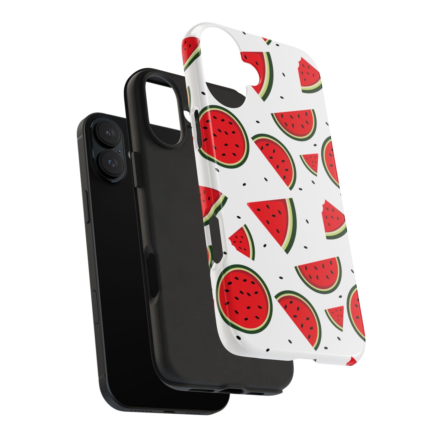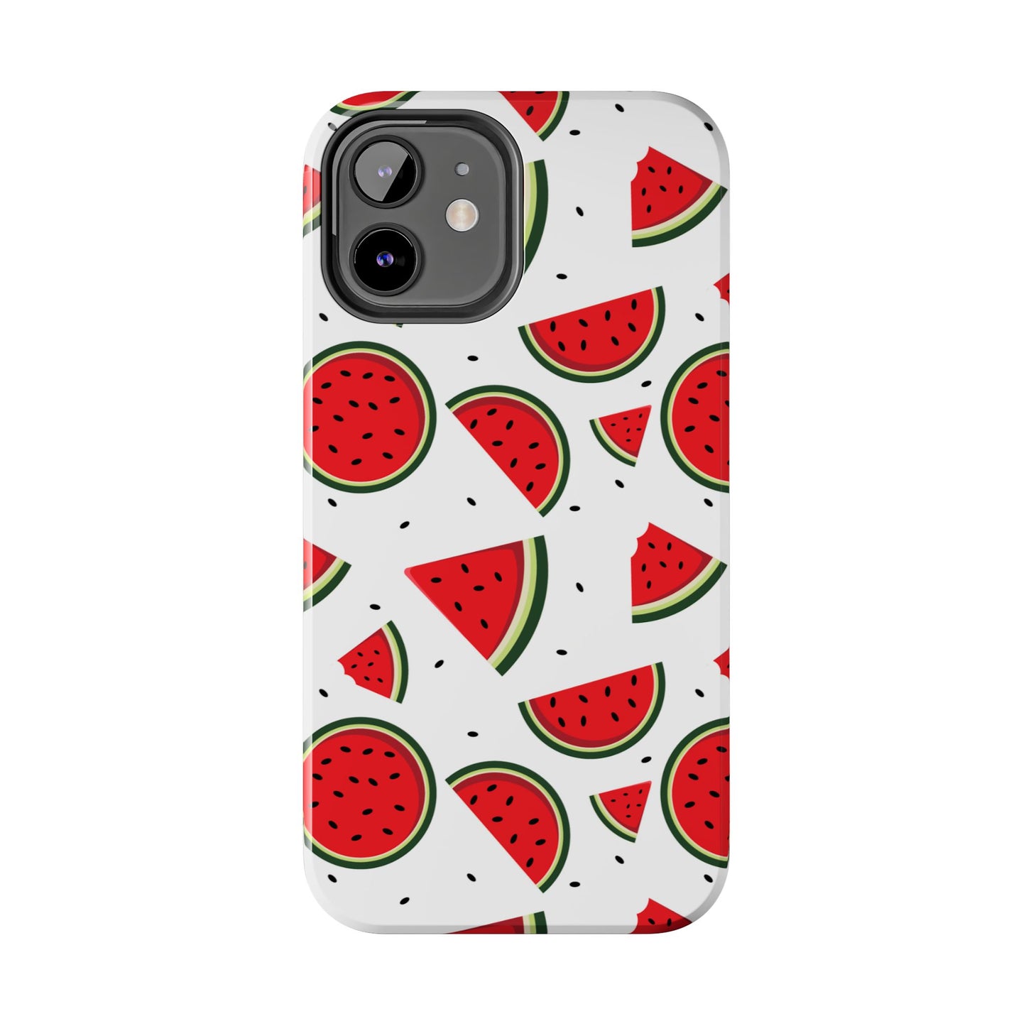 Stay cool and stylish with our Sweet Watermelon iPhone Case! Featuring a cheerful pattern of vibrant watermelon slices and rounds on a crisp white background, this case adds a fresh and playful touch to your phone. Perfect for capturing those summer vibes all year round, the design is fun yet minimal, making it easy to match with any look. Made with a tough polycarbonate shell and a shock-absorbing TPU liner, this case offers top-notch protection while keeping your phone cute and colorful.