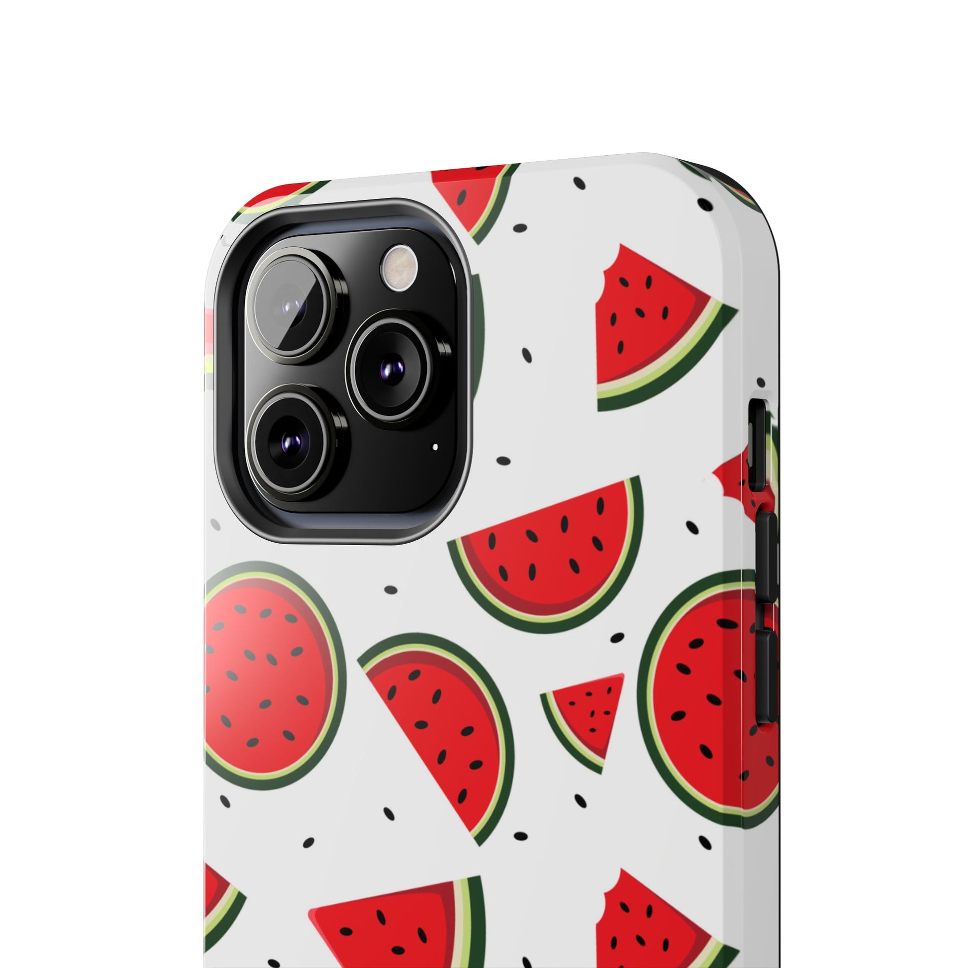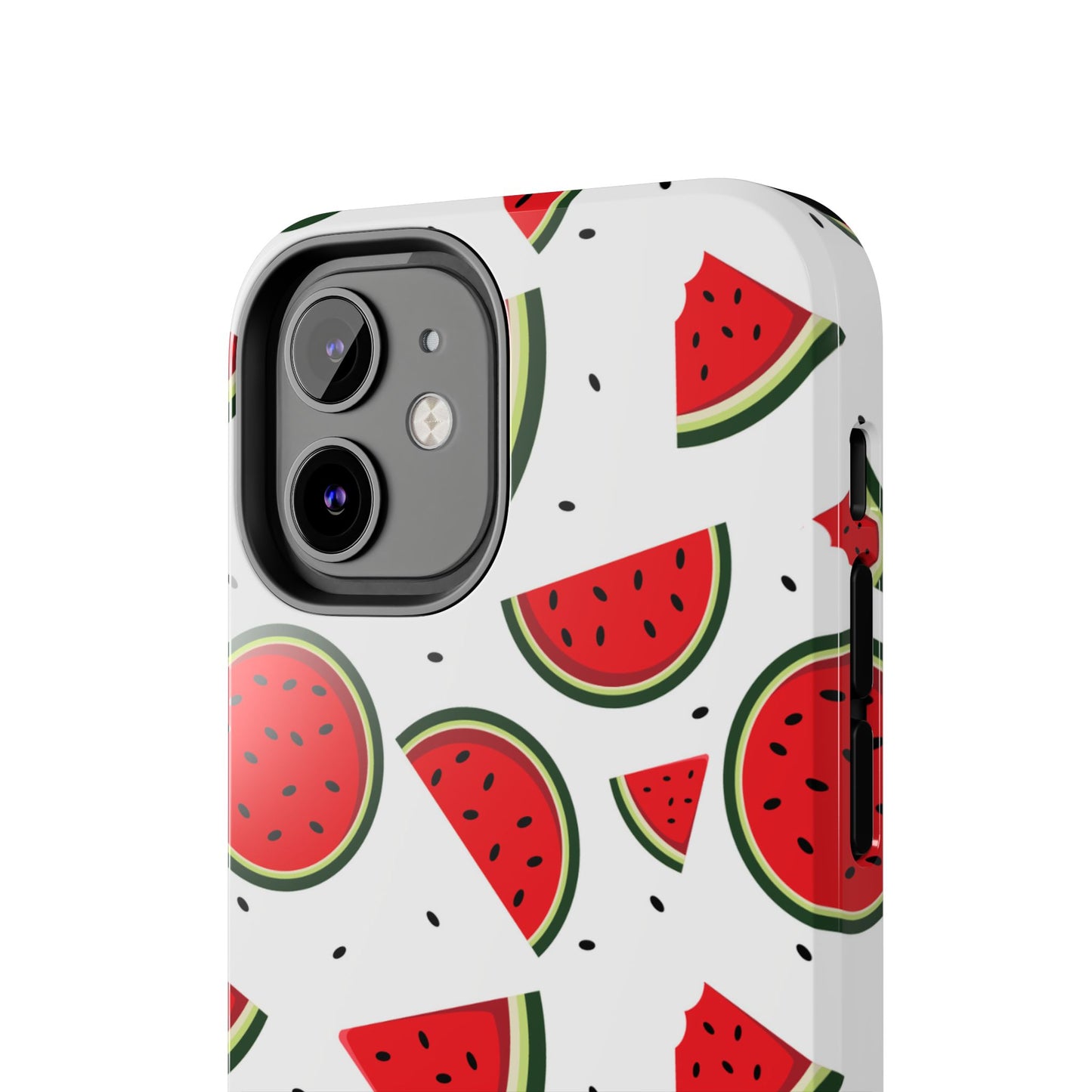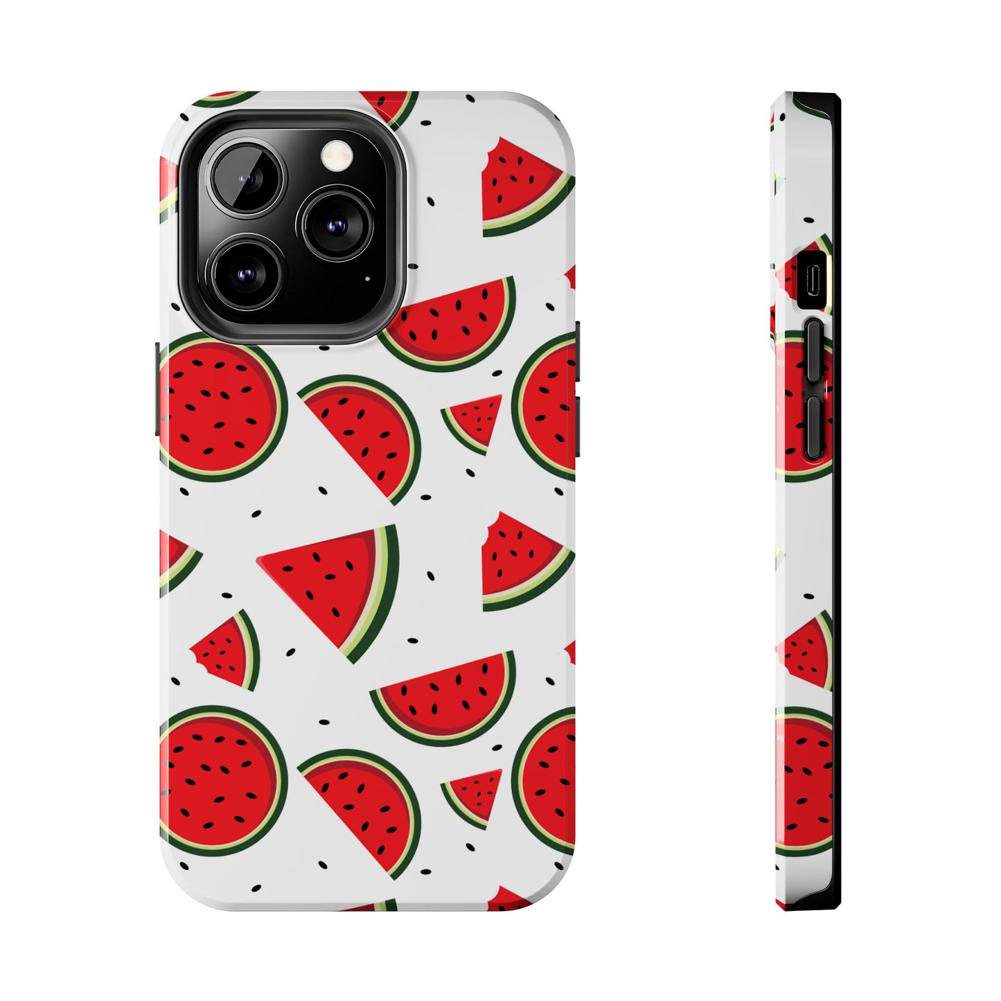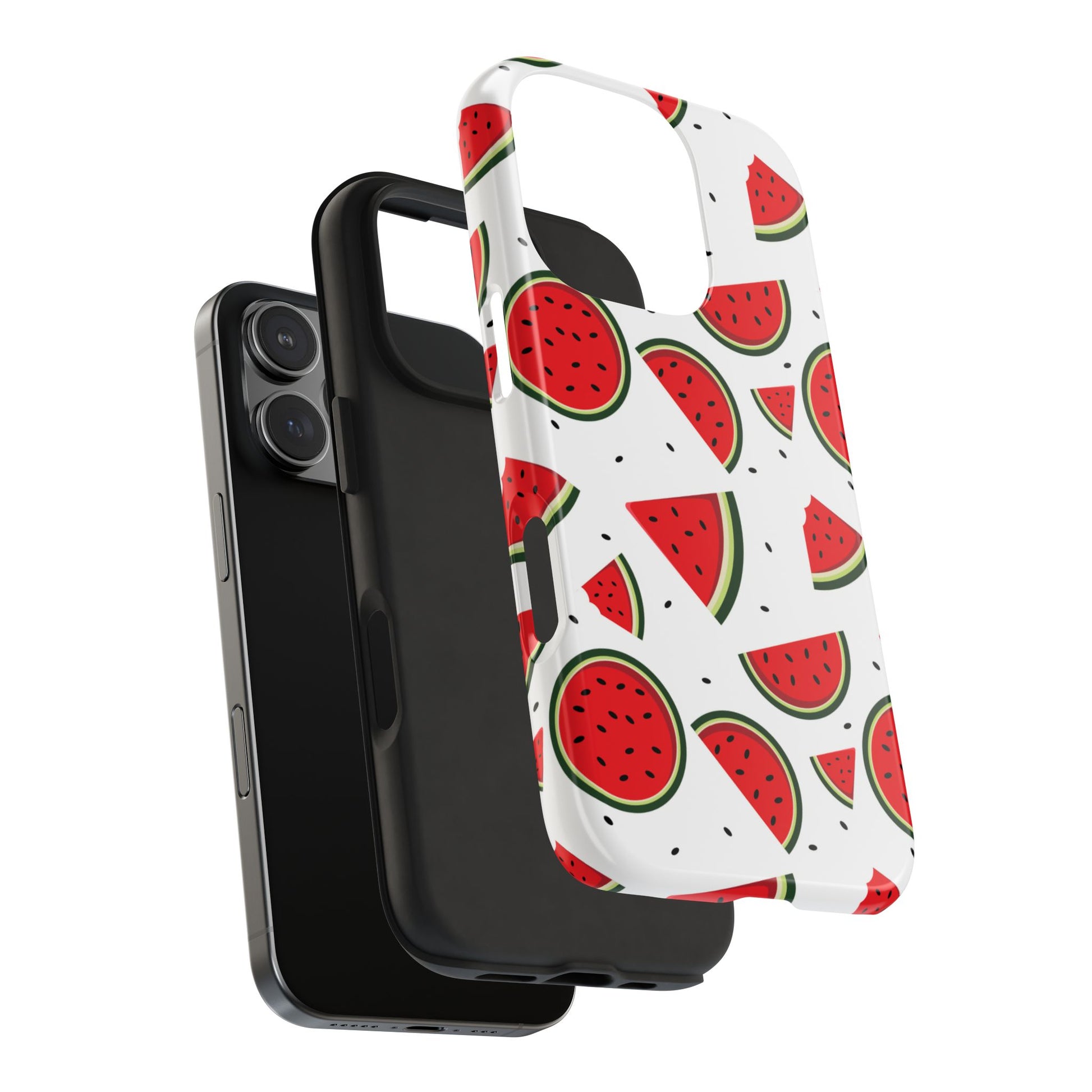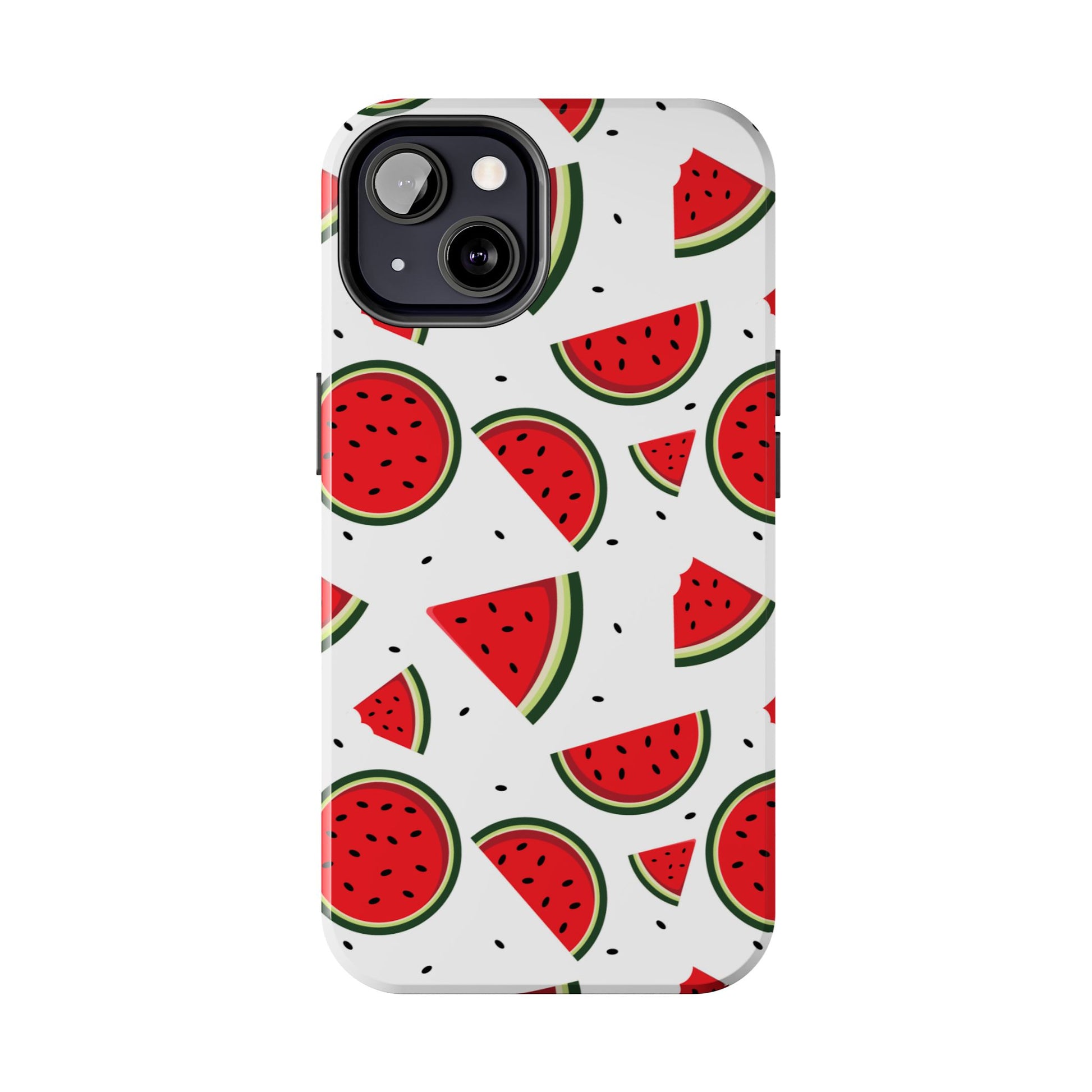Stay cool and stylish with our Sweet Watermelon iPhone Case! Featuring a cheerful pattern of vibrant watermelon slices and rounds on a crisp white background, this case adds a fresh and playful touch to your phone. Perfect for capturing those summer vibes all year round, the design is fun yet minimal, making it easy to match with any look. Made with a tough polycarbonate shell and a shock-absorbing TPU liner, this case offers top-notch protection while keeping your phone cute and colorful.