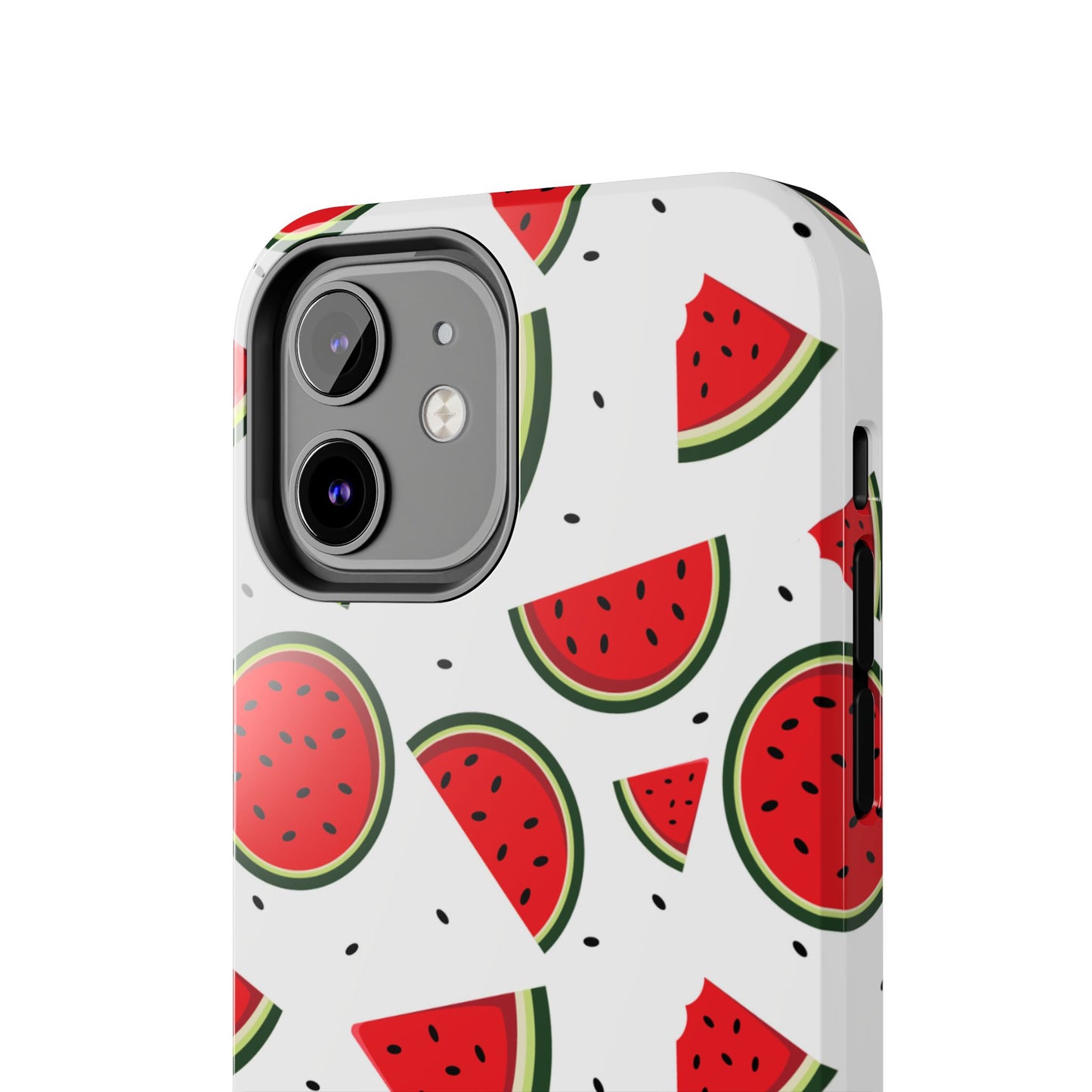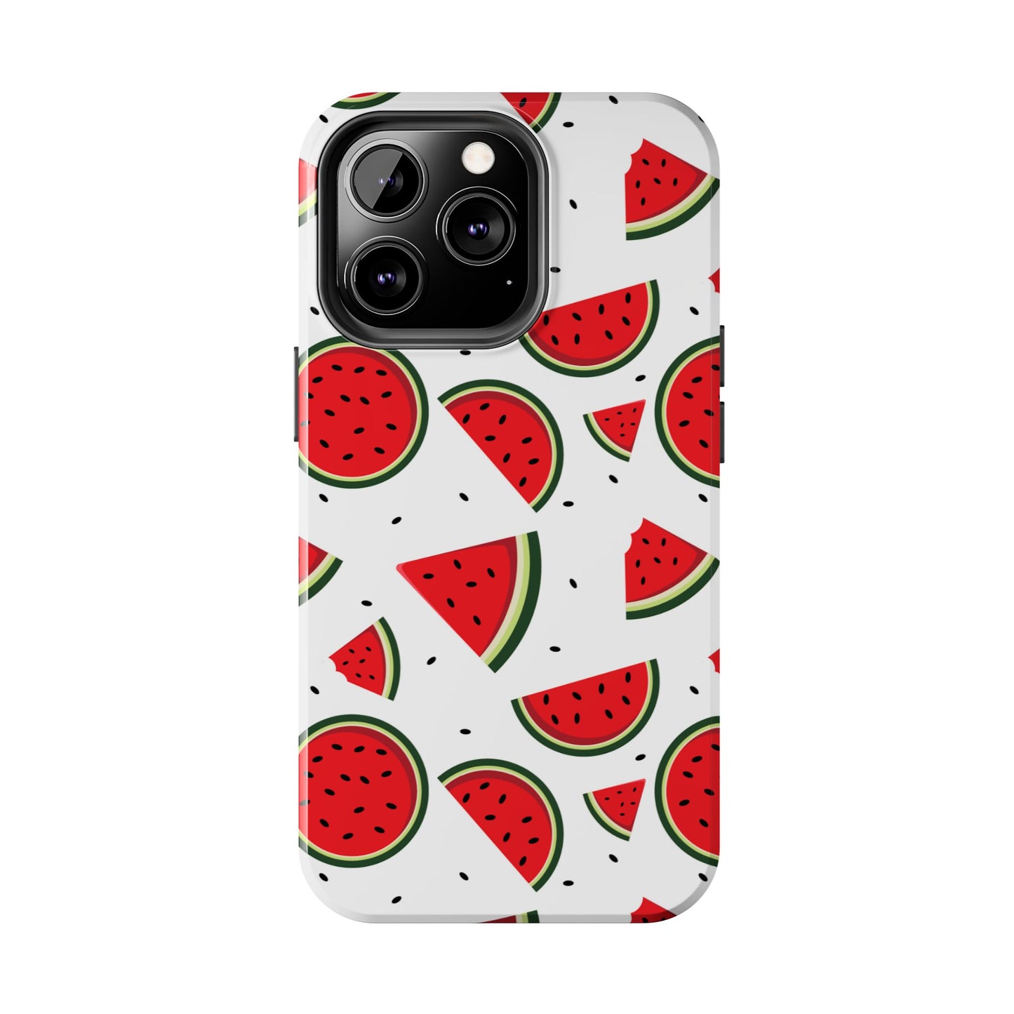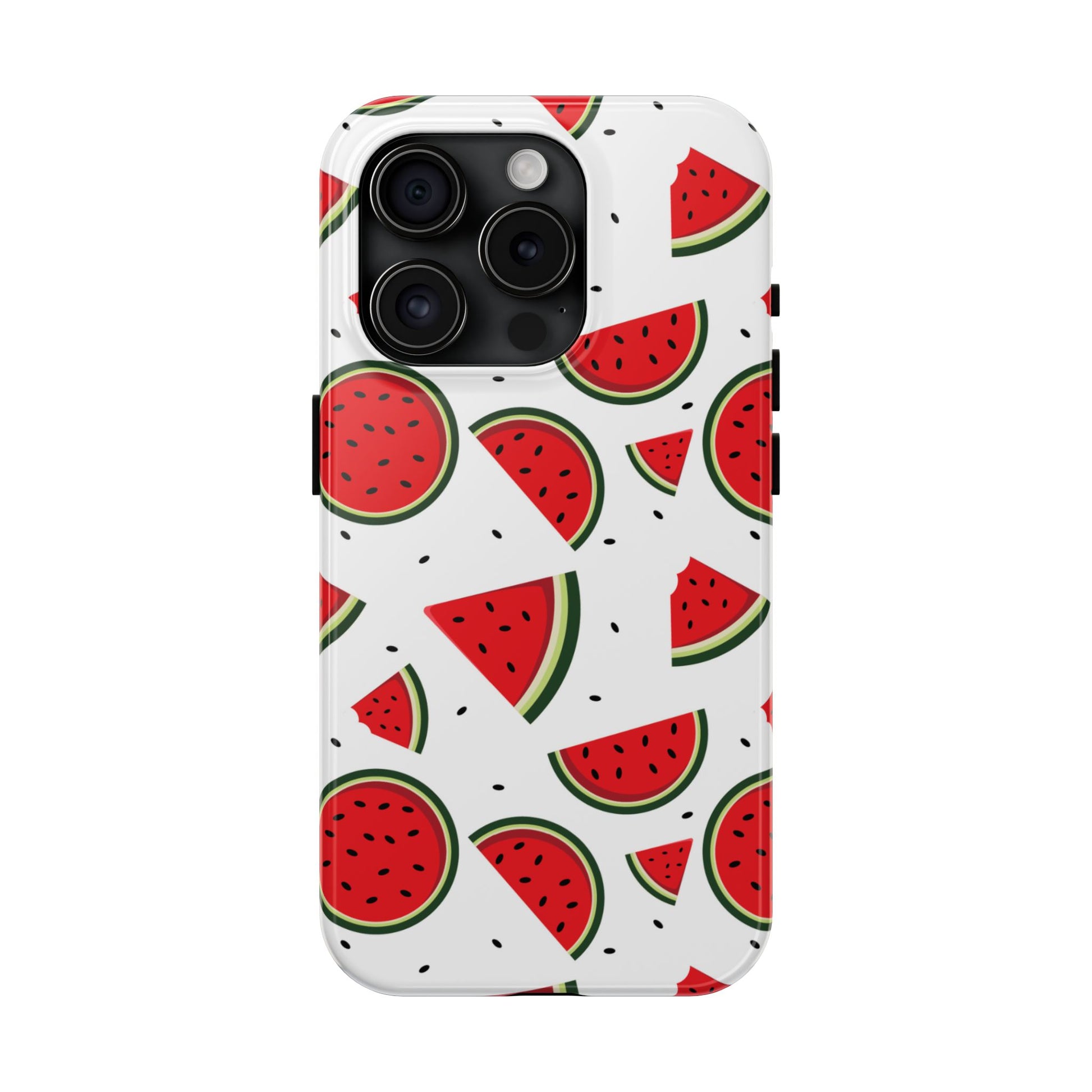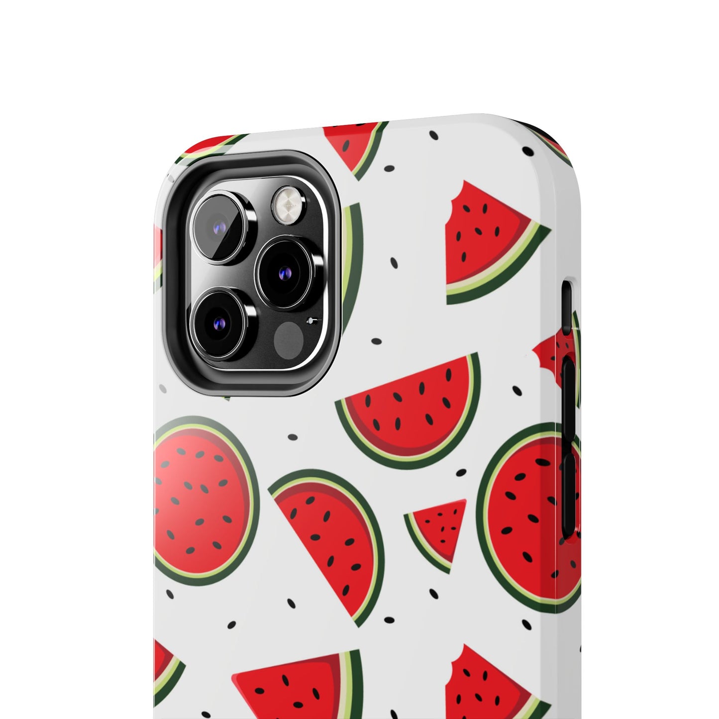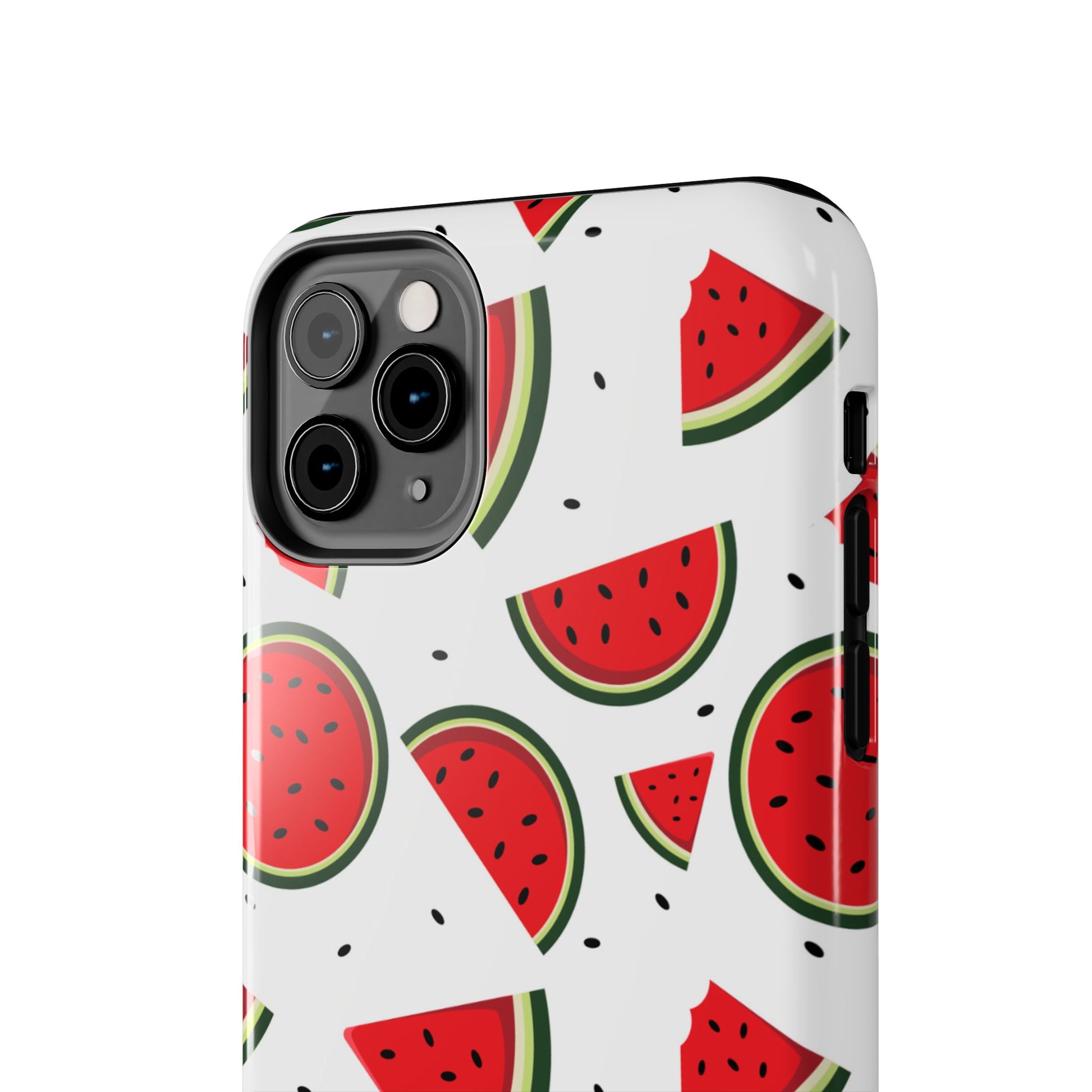 Stay cool and stylish with our Sweet Watermelon iPhone Case! Featuring a cheerful pattern of vibrant watermelon slices and rounds on a crisp white background, this case adds a fresh and playful touch to your phone. Perfect for capturing those summer vibes all year round, the design is fun yet minimal, making it easy to match with any look. Made with a tough polycarbonate shell and a shock-absorbing TPU liner, this case offers top-notch protection while keeping your phone cute and colorful.