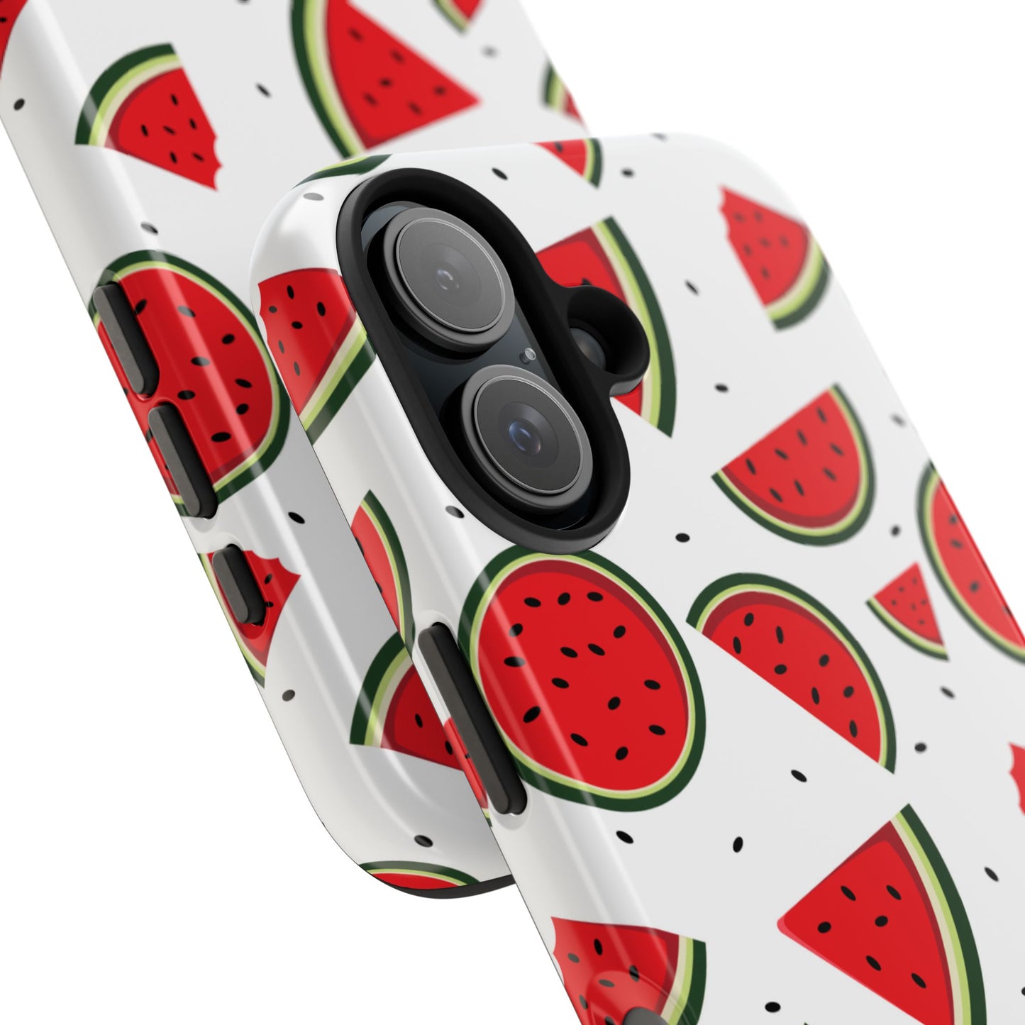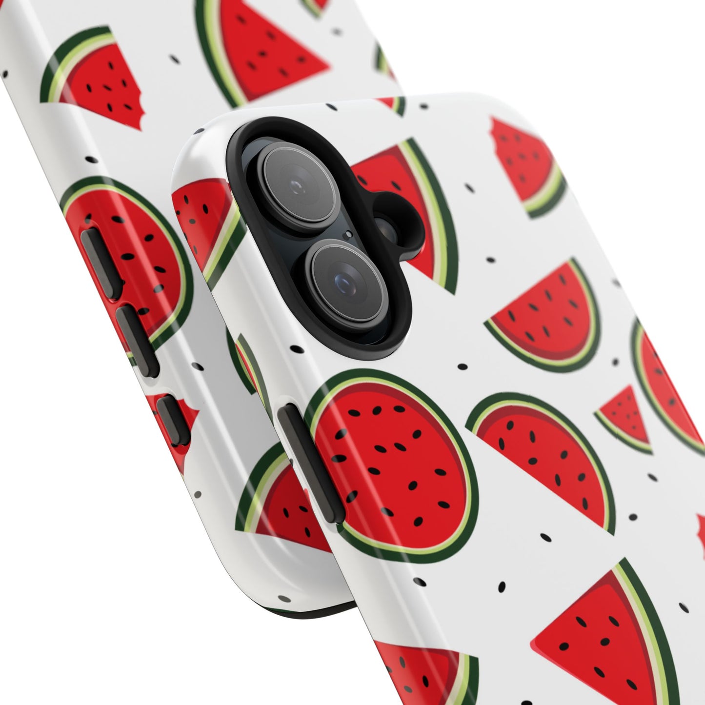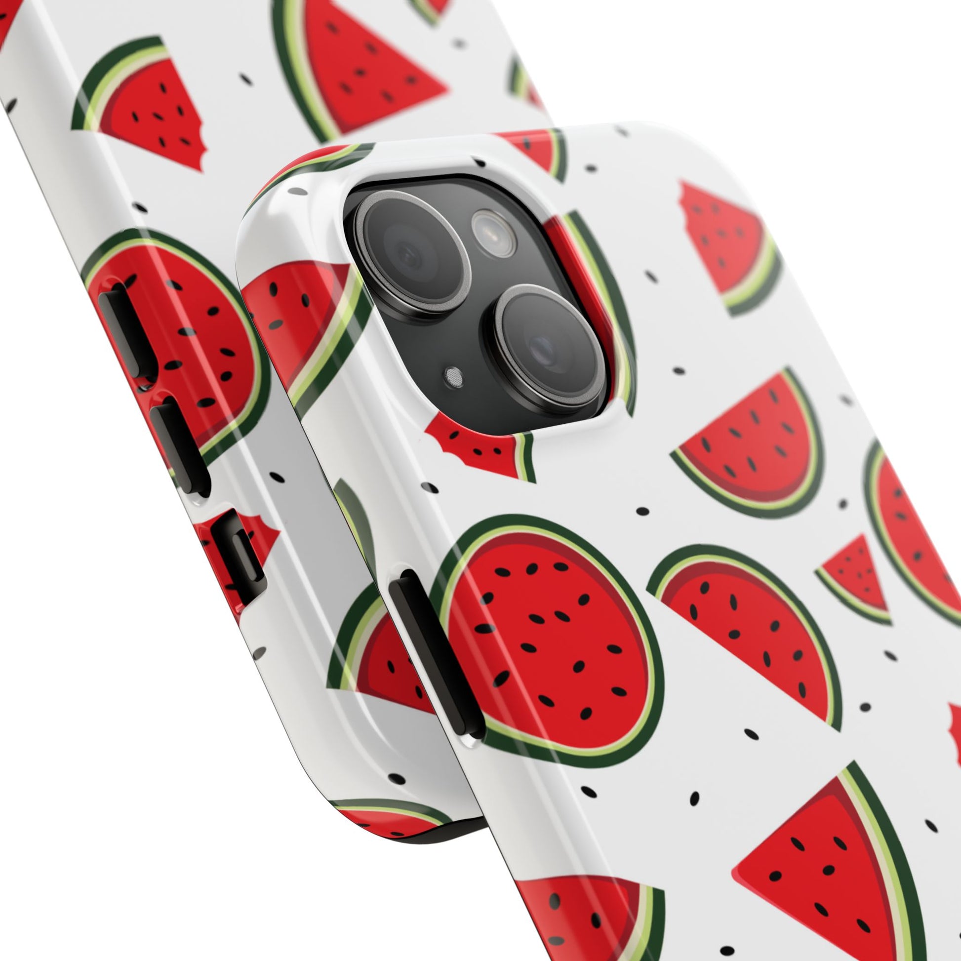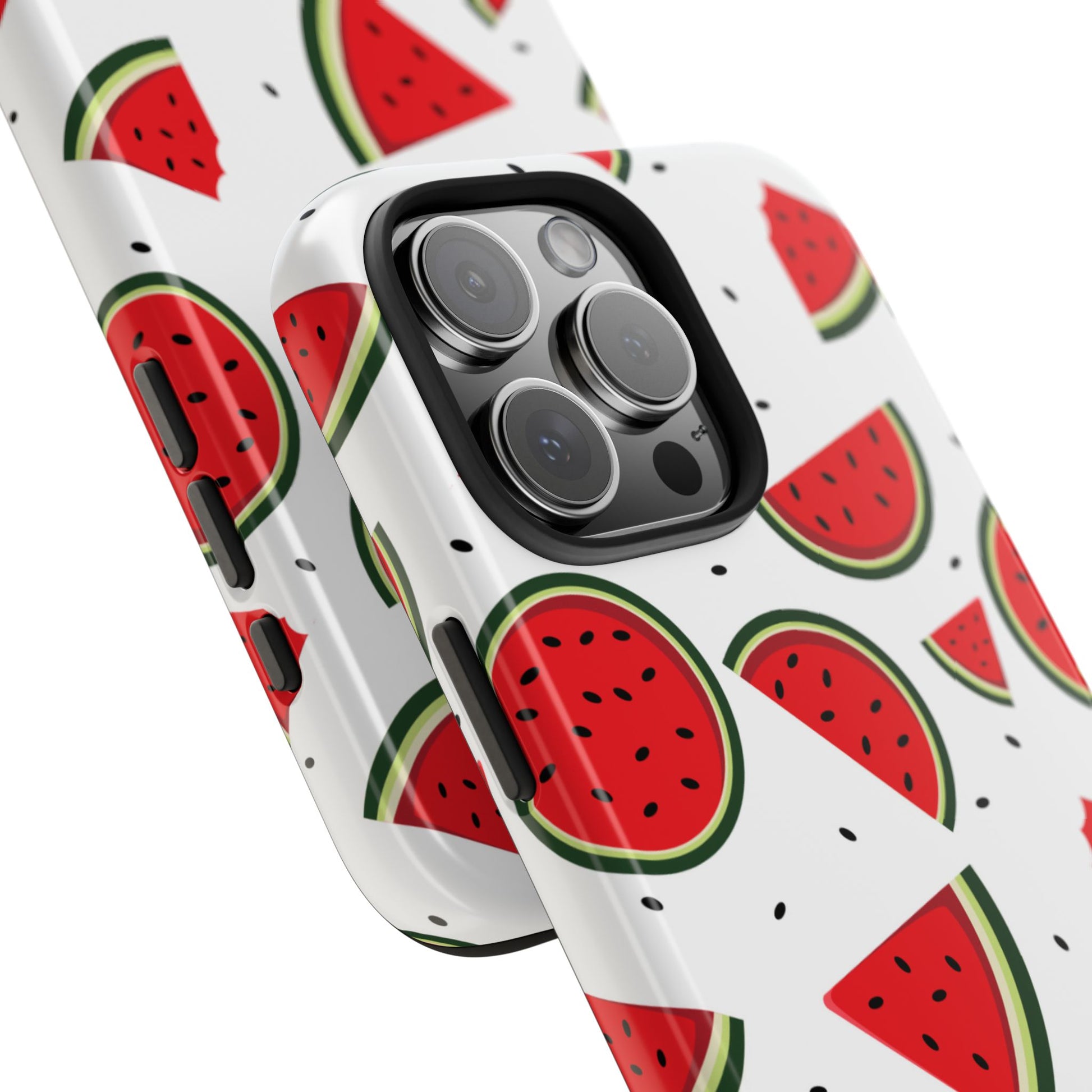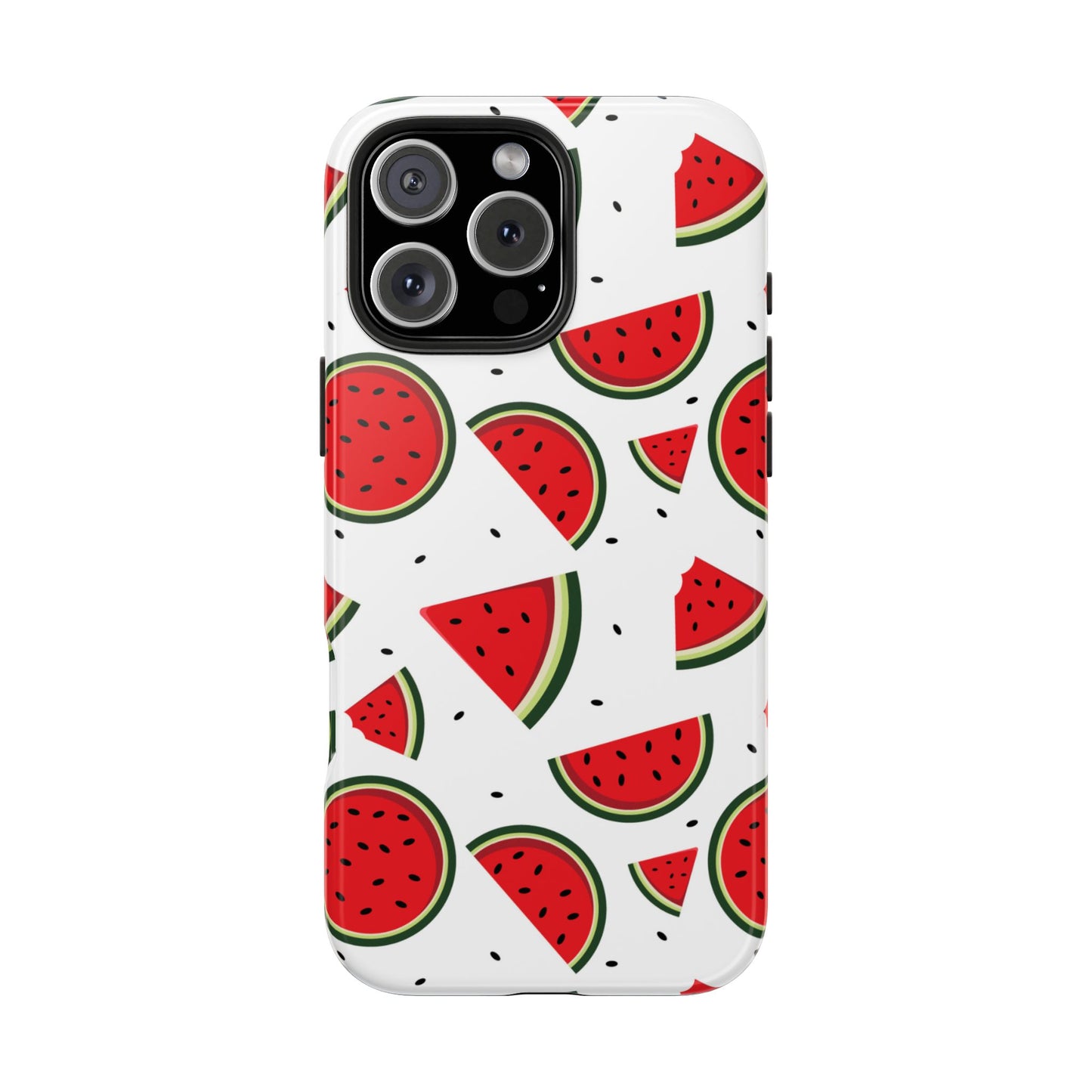 Stay cool and stylish with our Sweet Watermelon iPhone Case! Featuring a cheerful pattern of vibrant watermelon slices and rounds on a crisp white background, this case adds a fresh and playful touch to your phone. Perfect for capturing those summer vibes all year round, the design is fun yet minimal, making it easy to match with any look. Made with a tough polycarbonate shell and a shock-absorbing TPU liner, this case offers top-notch protection while keeping your phone cute and colorful.