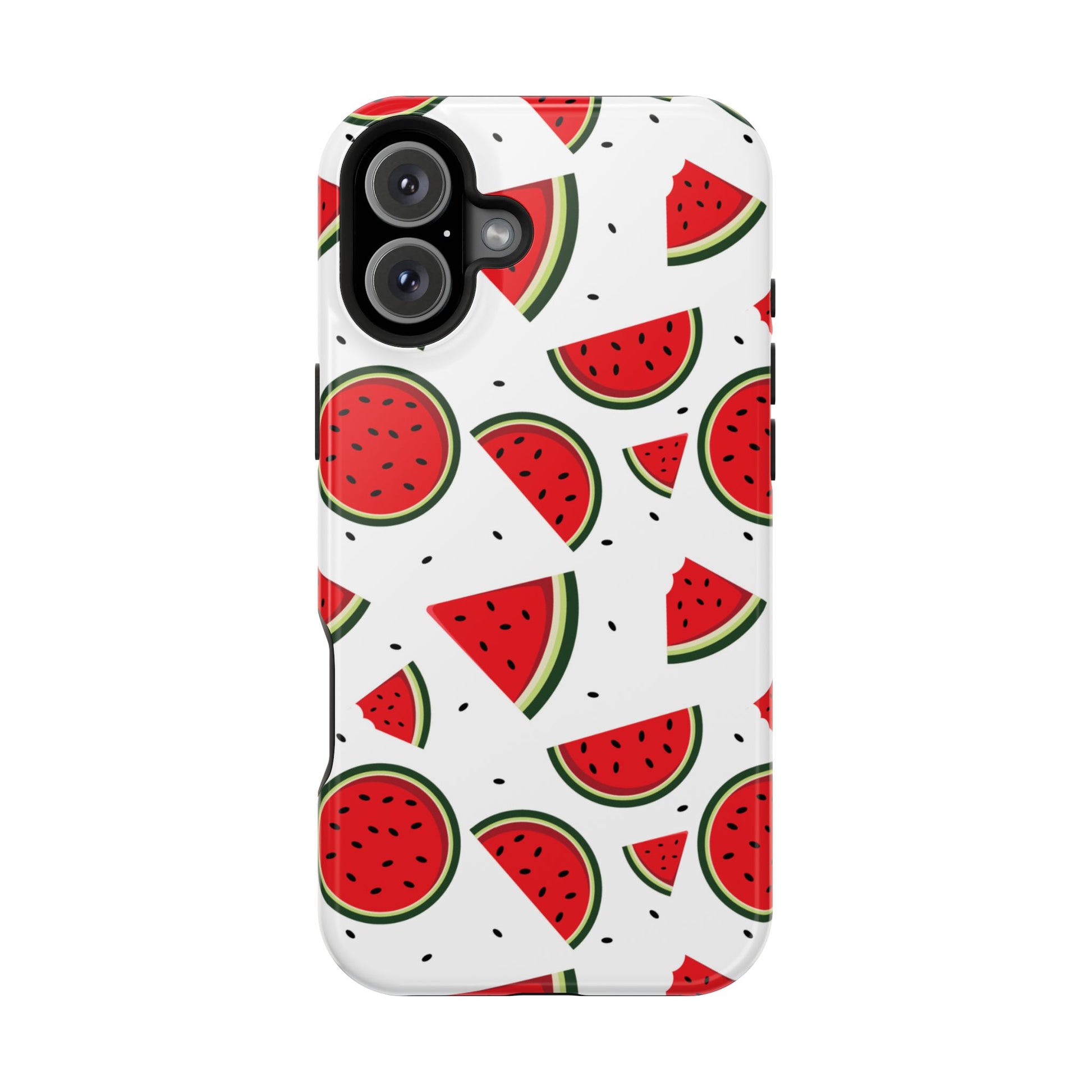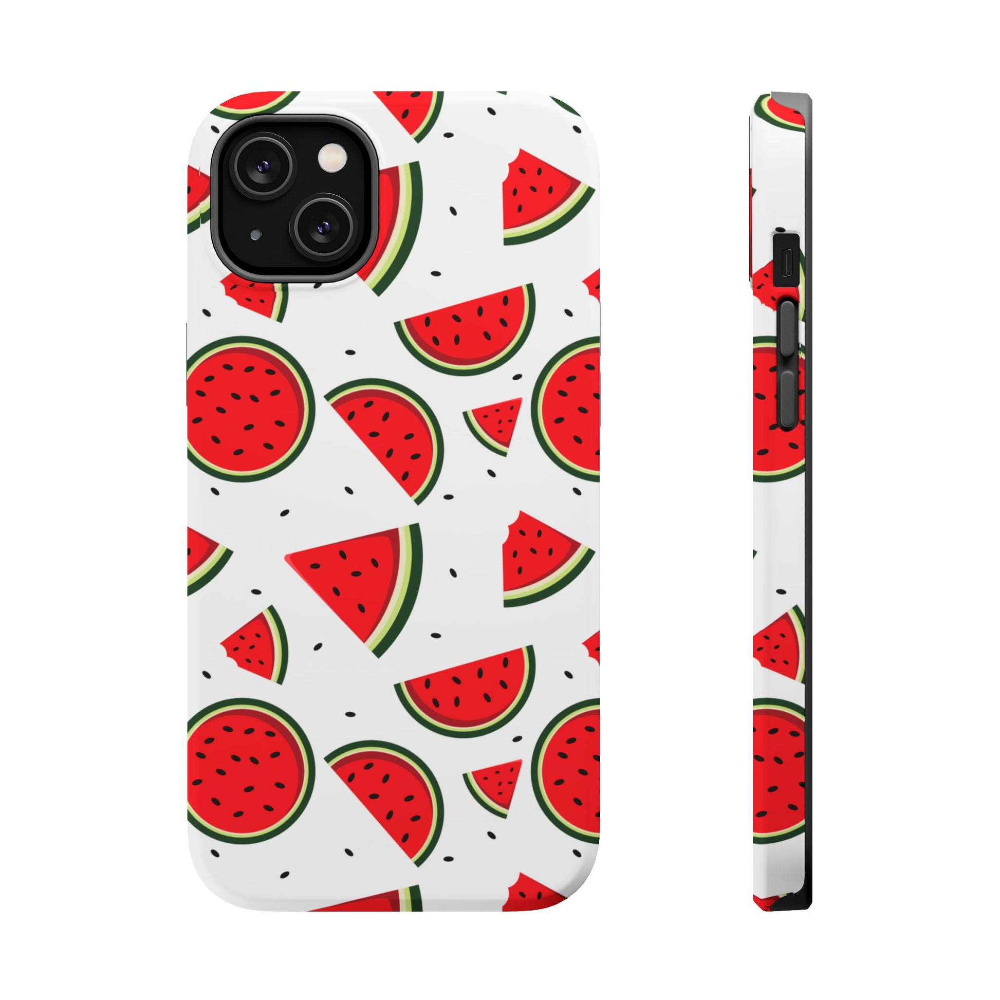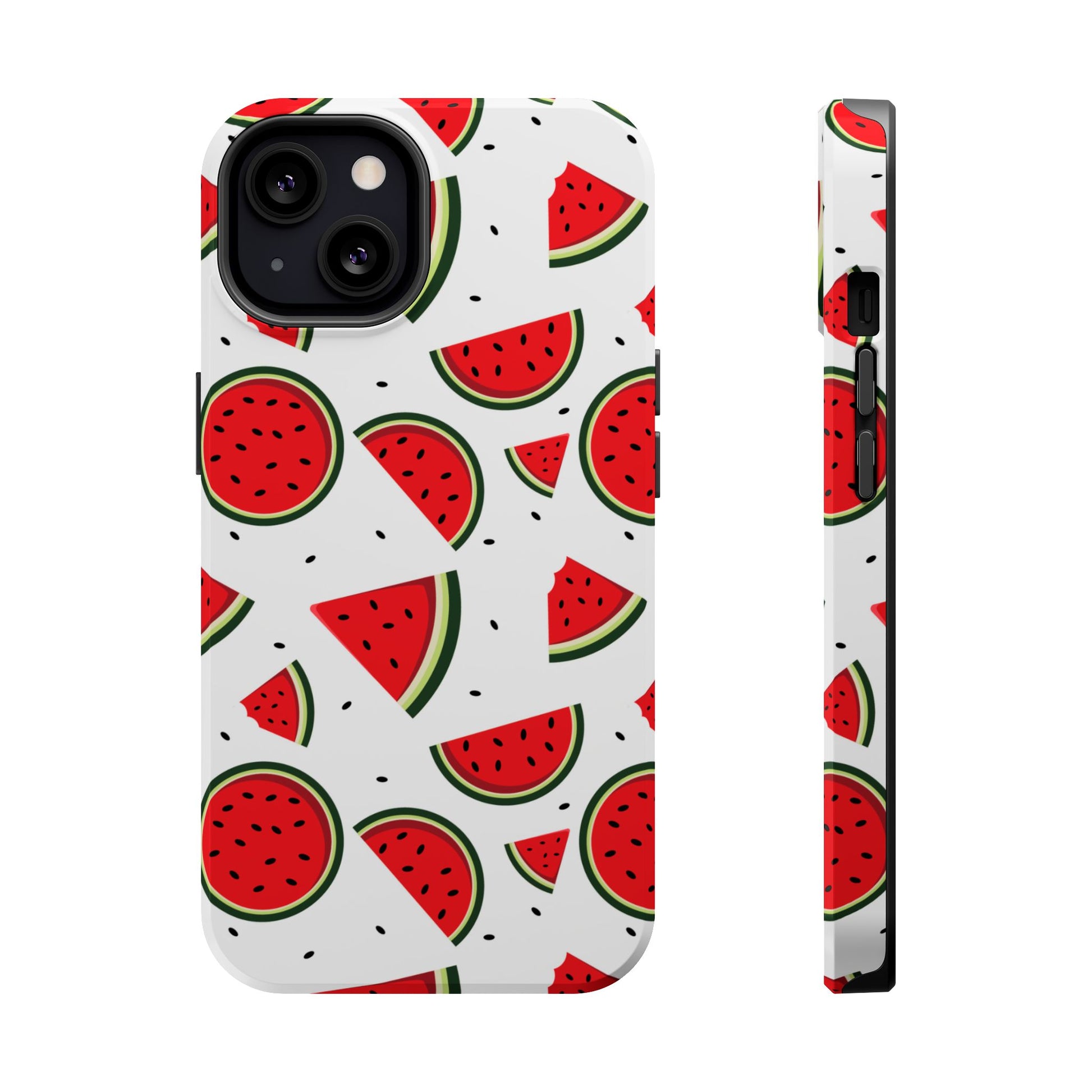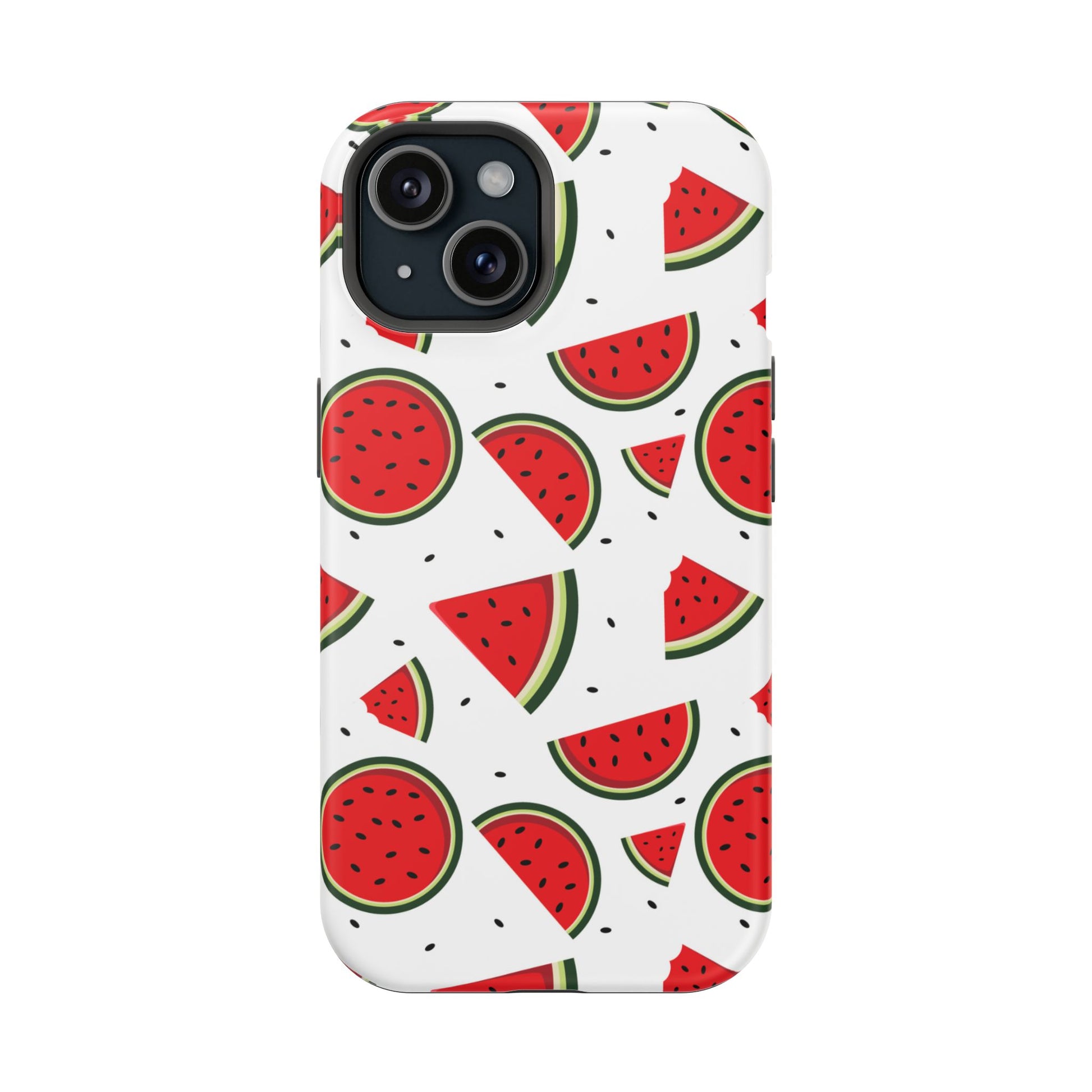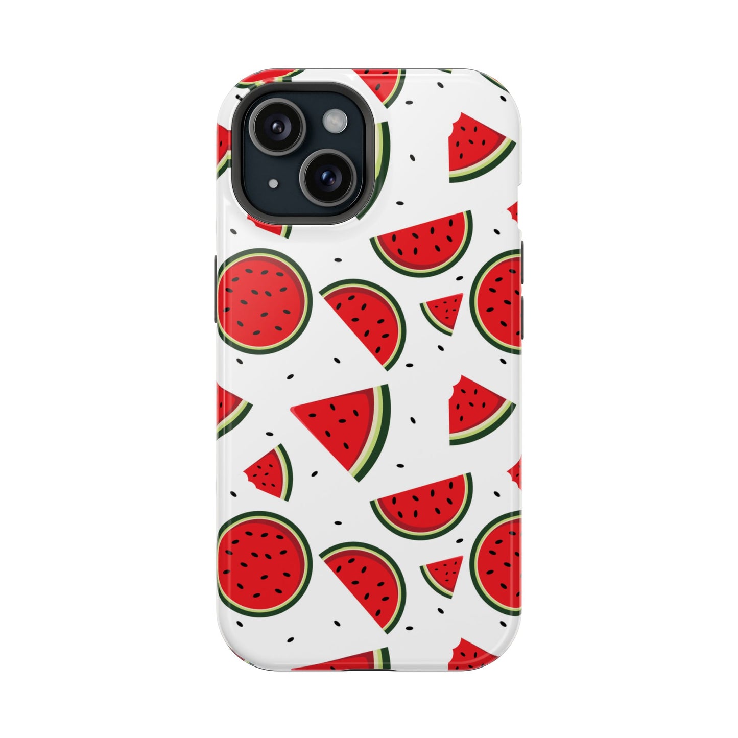 Stay cool and stylish with our Sweet Watermelon MagSafe iPhone Case! Featuring a cheerful pattern of vibrant watermelon slices and rounds on a crisp white background, this case adds a fresh and playful touch to your phone. Perfect for capturing those summer vibes all year round, the design is fun yet minimal, making it easy to match with any look. Made with a tough polycarbonate shell and a shock-absorbing TPU liner, this case offers top-notch protection while keeping your phone cute and colorful.