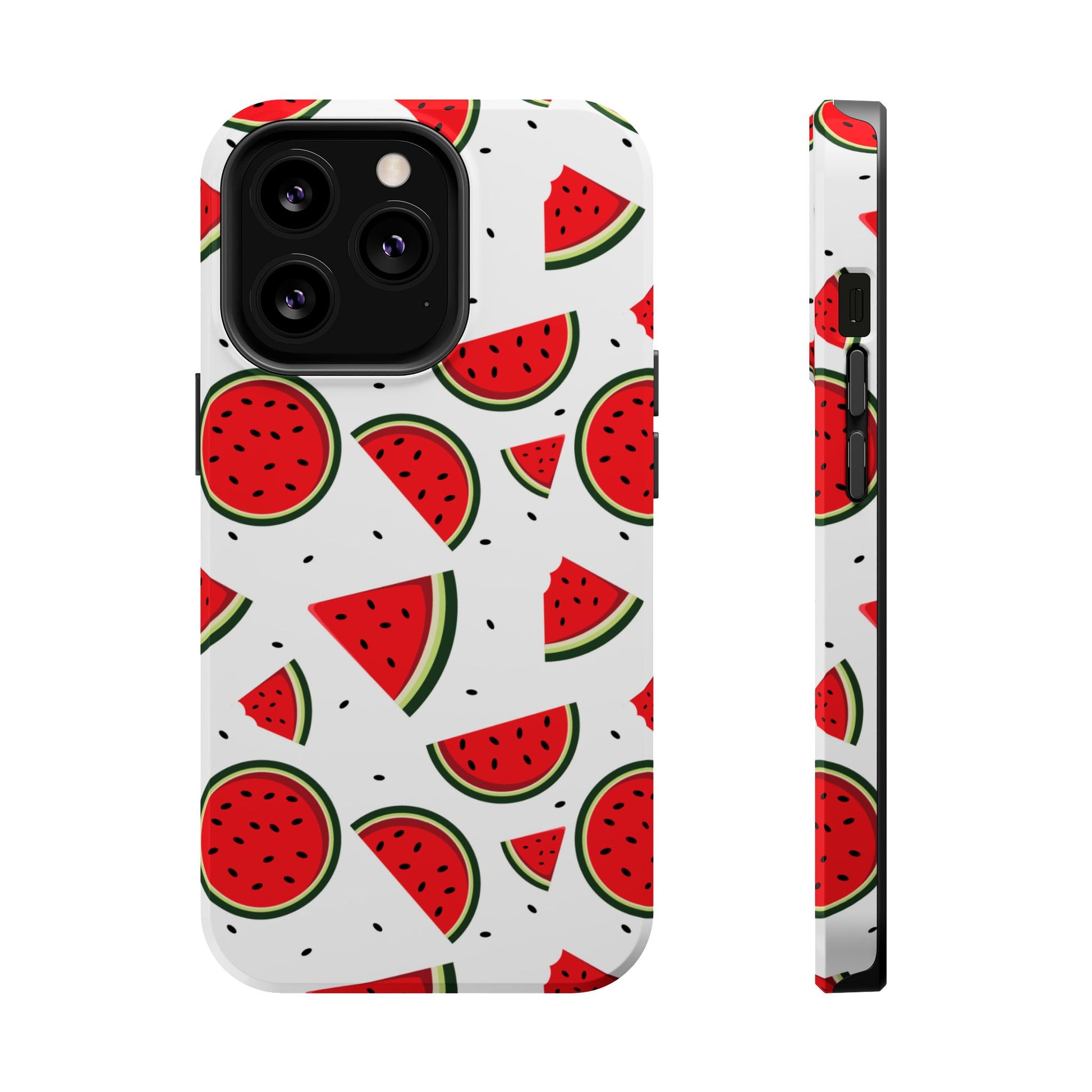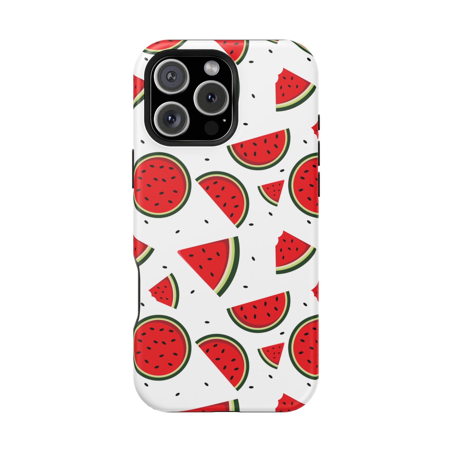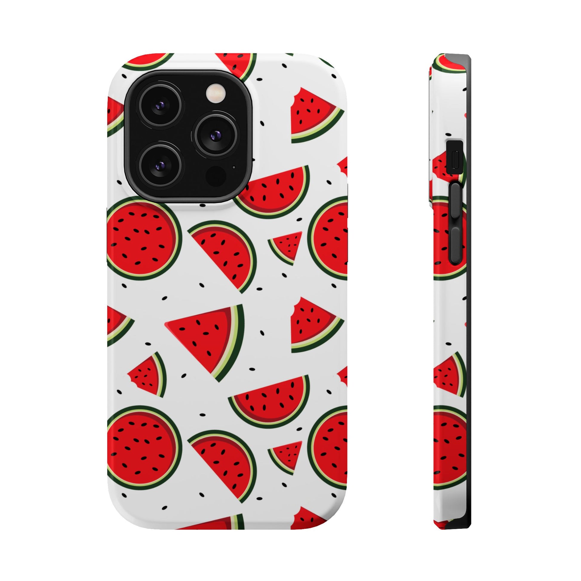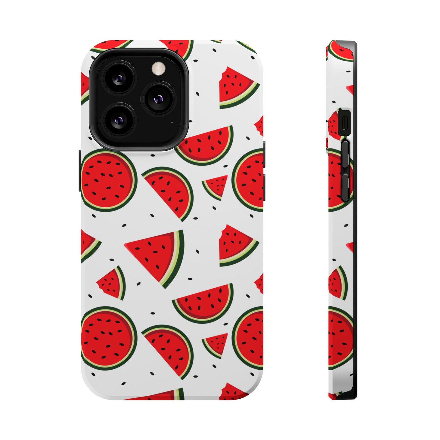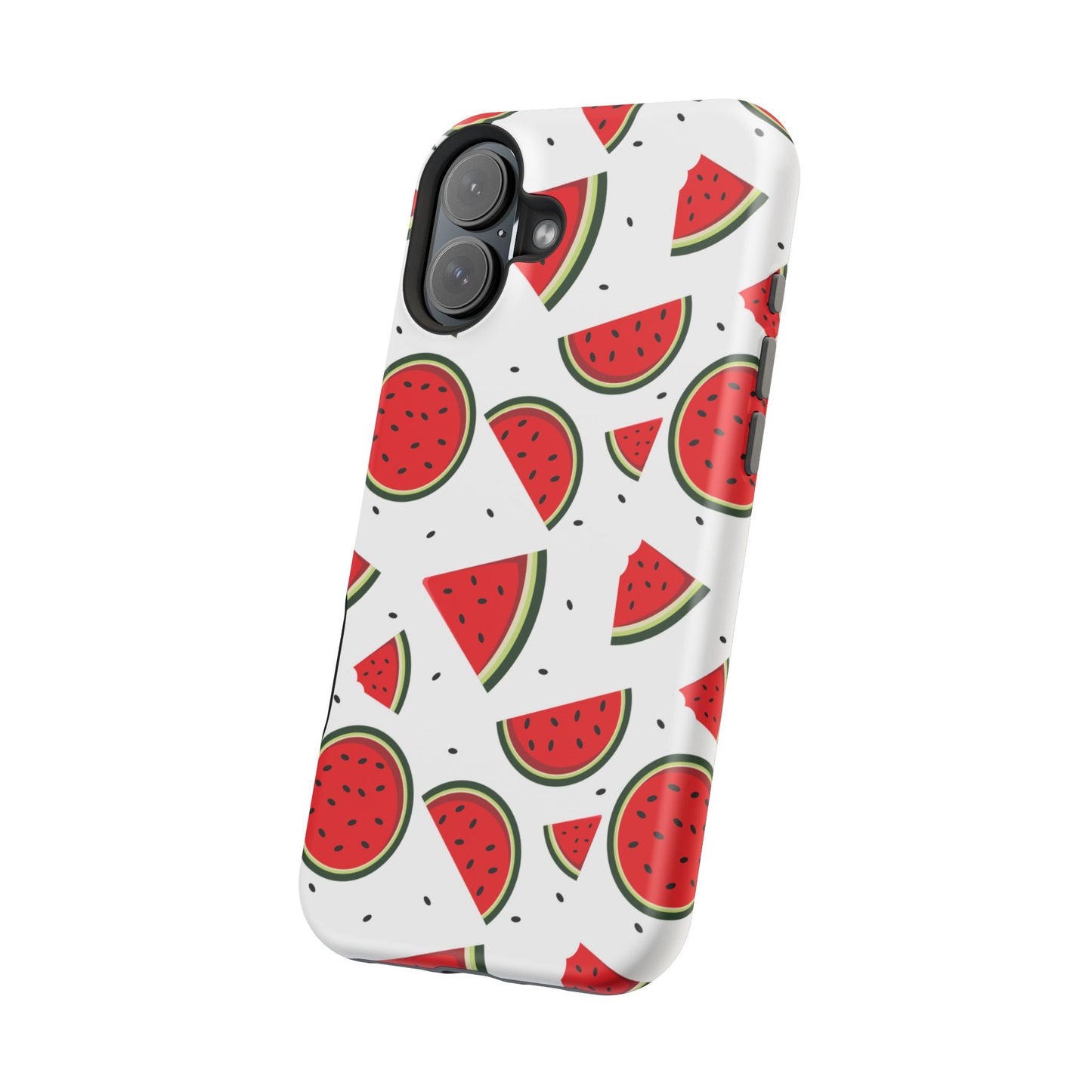 Stay cool and stylish with our Sweet Watermelon MagSafe iPhone Case! Featuring a cheerful pattern of vibrant watermelon slices and rounds on a crisp white background, this case adds a fresh and playful touch to your phone. Perfect for capturing those summer vibes all year round, the design is fun yet minimal, making it easy to match with any look. Made with a tough polycarbonate shell and a shock-absorbing TPU liner, this case offers top-notch protection while keeping your phone cute and colorful.