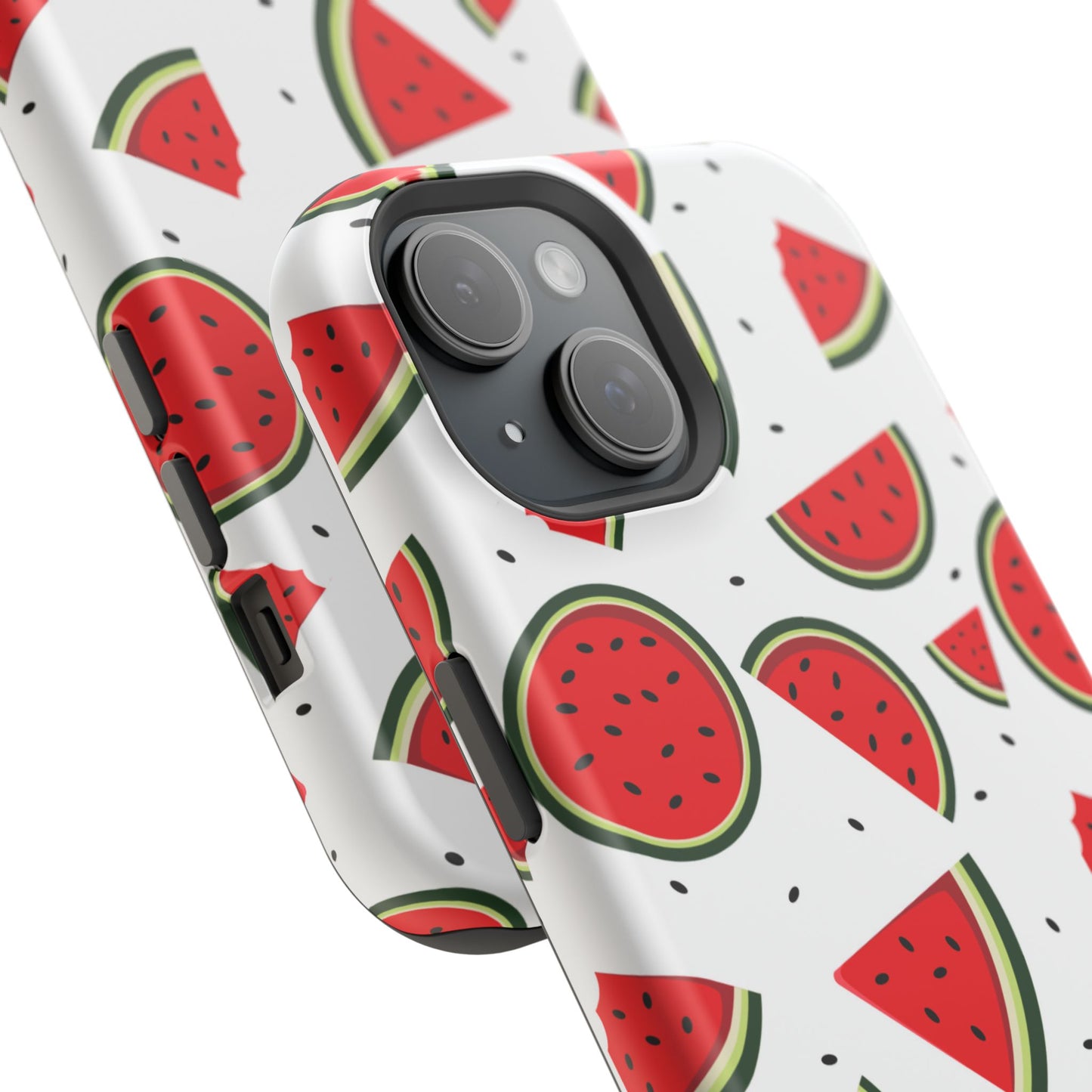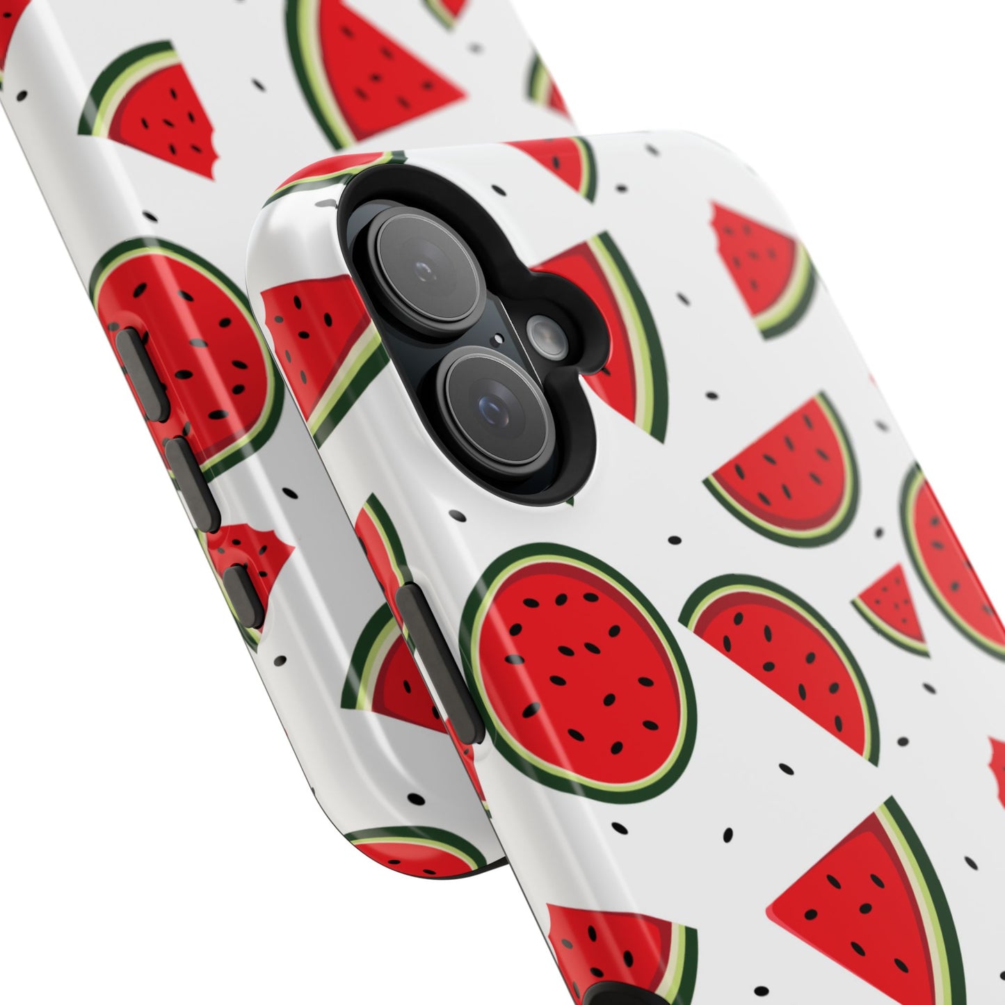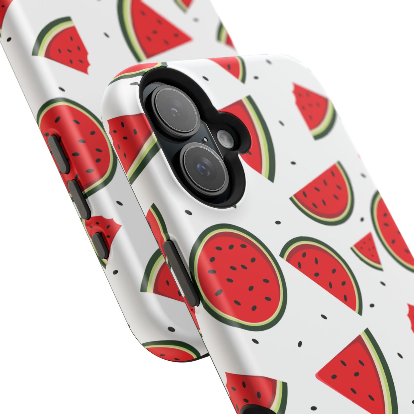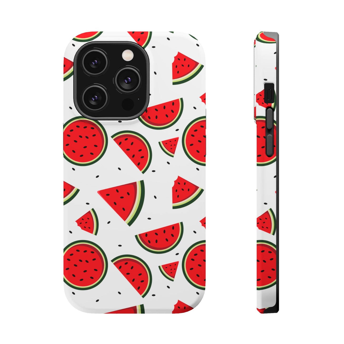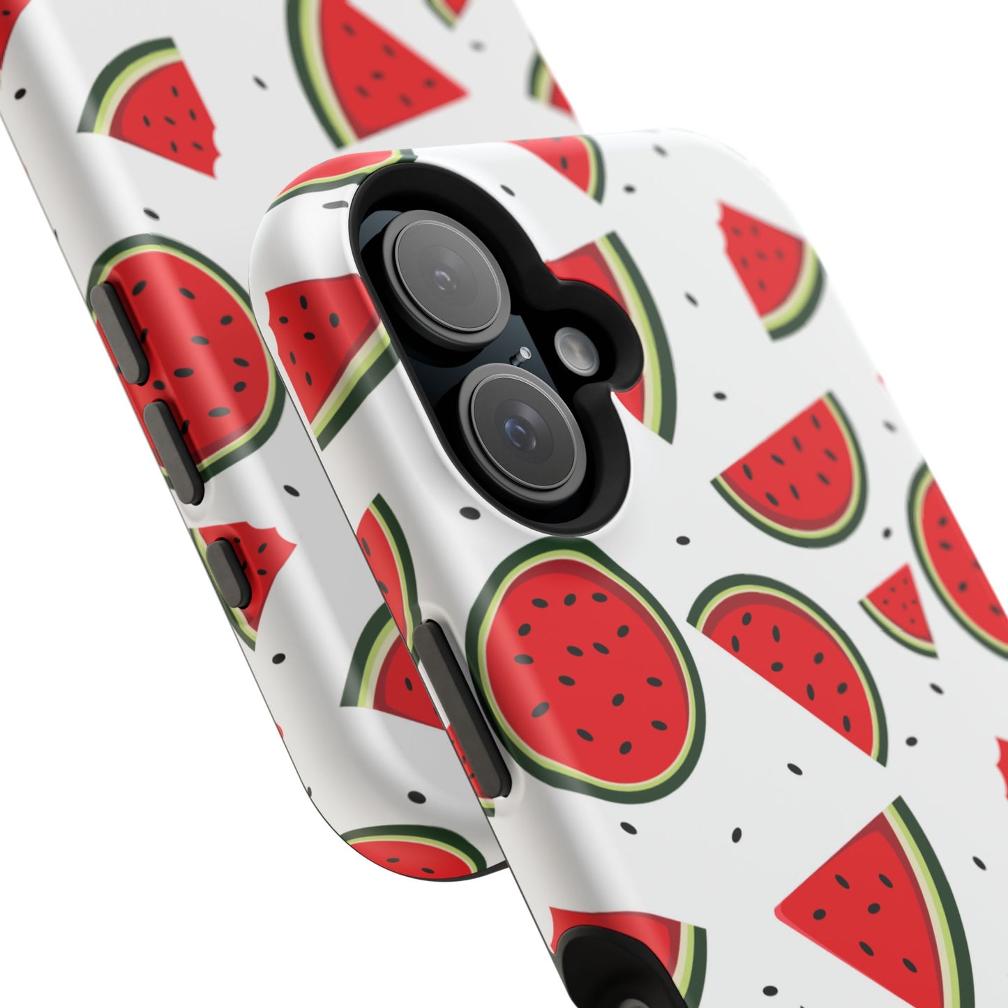 Stay cool and stylish with our Sweet Watermelon MagSafe iPhone Case! Featuring a cheerful pattern of vibrant watermelon slices and rounds on a crisp white background, this case adds a fresh and playful touch to your phone. Perfect for capturing those summer vibes all year round, the design is fun yet minimal, making it easy to match with any look. Made with a tough polycarbonate shell and a shock-absorbing TPU liner, this case offers top-notch protection while keeping your phone cute and colorful.