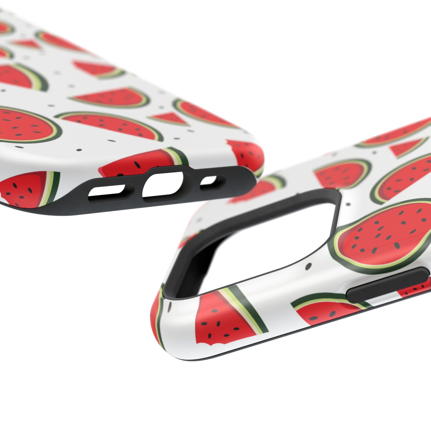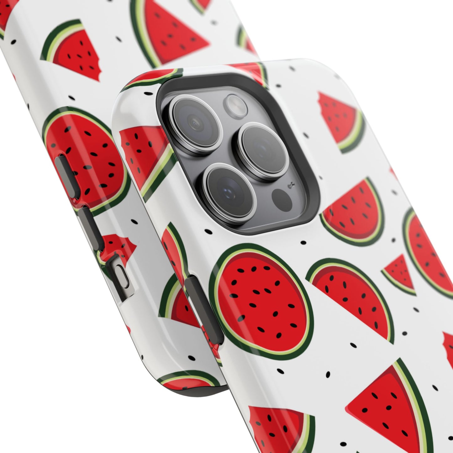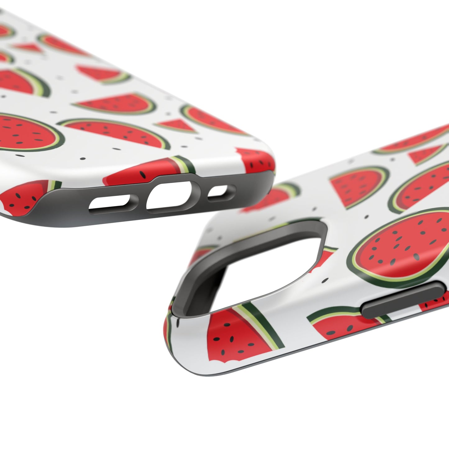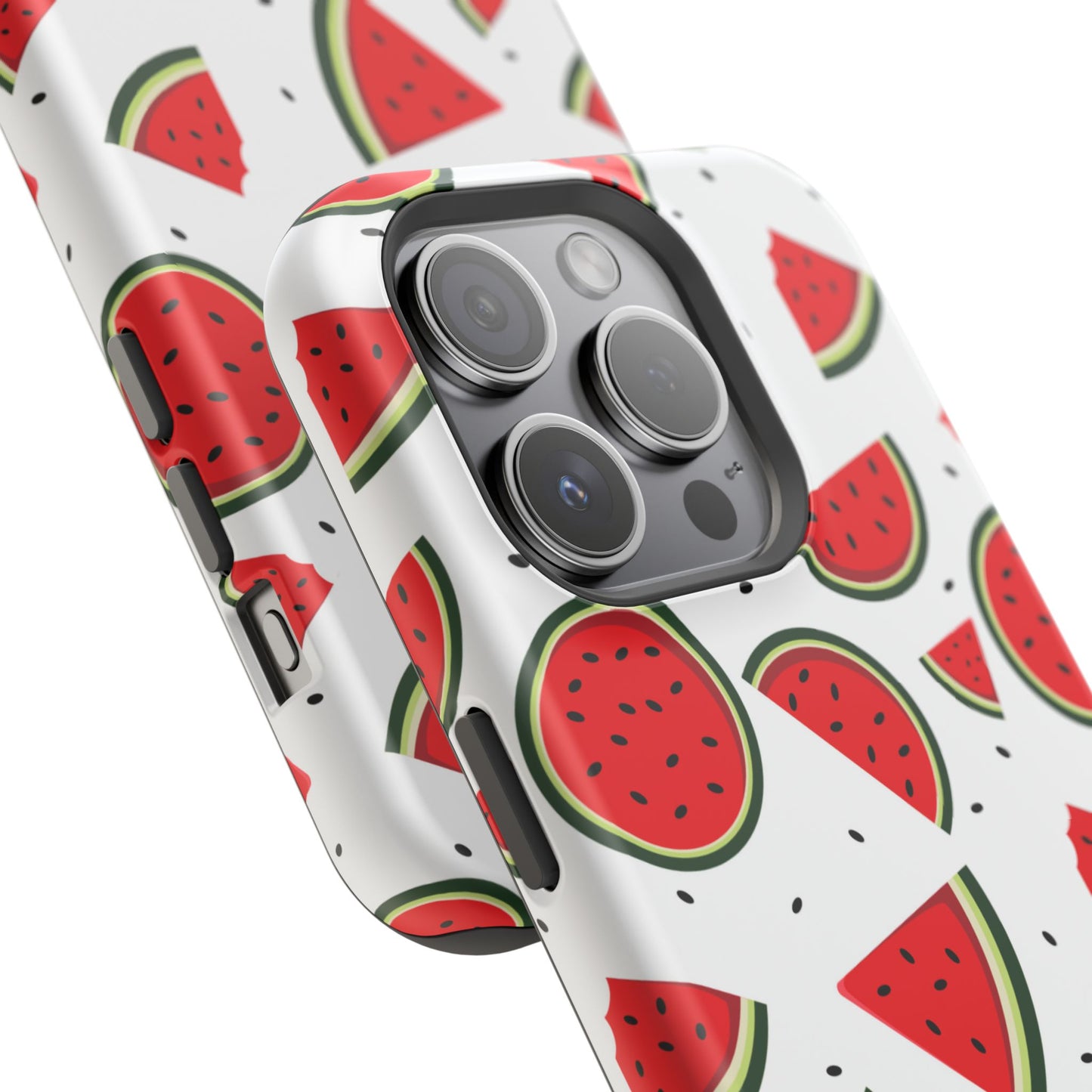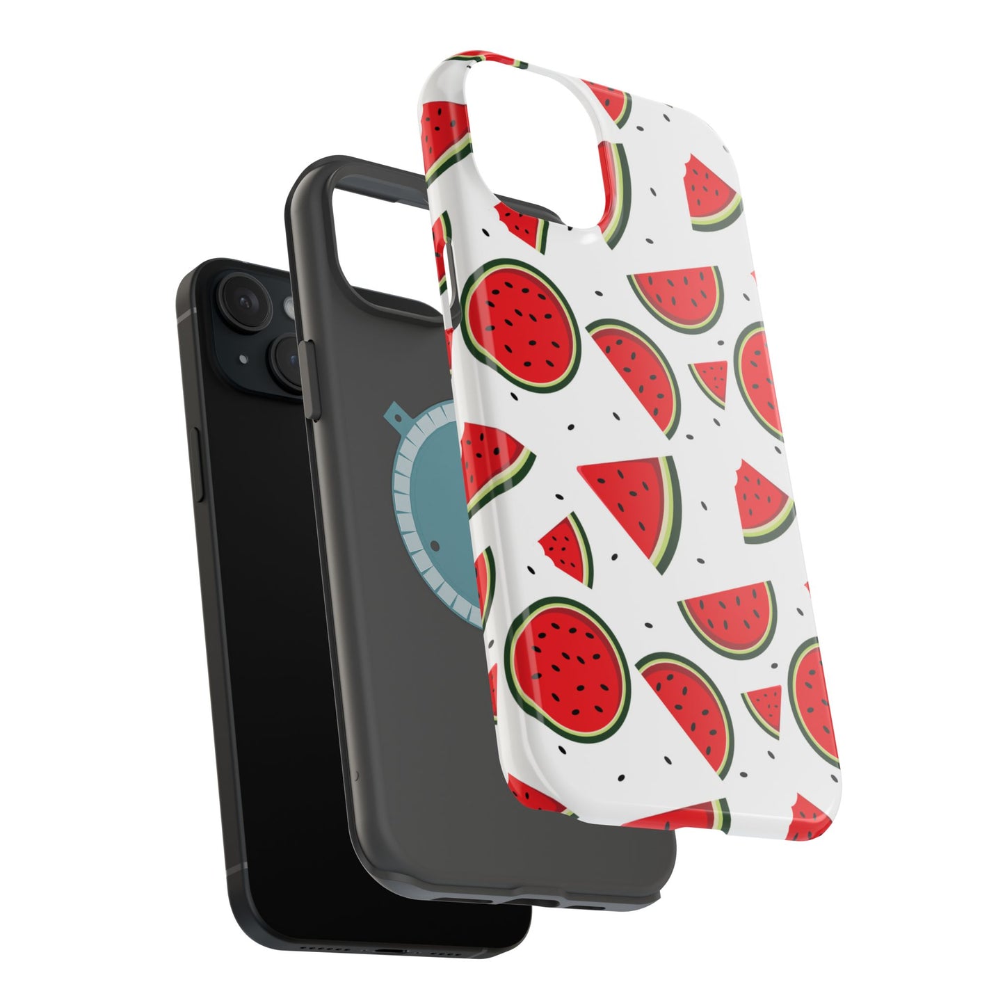 Stay cool and stylish with our Sweet Watermelon MagSafe iPhone Case! Featuring a cheerful pattern of vibrant watermelon slices and rounds on a crisp white background, this case adds a fresh and playful touch to your phone. Perfect for capturing those summer vibes all year round, the design is fun yet minimal, making it easy to match with any look. Made with a tough polycarbonate shell and a shock-absorbing TPU liner, this case offers top-notch protection while keeping your phone cute and colorful.