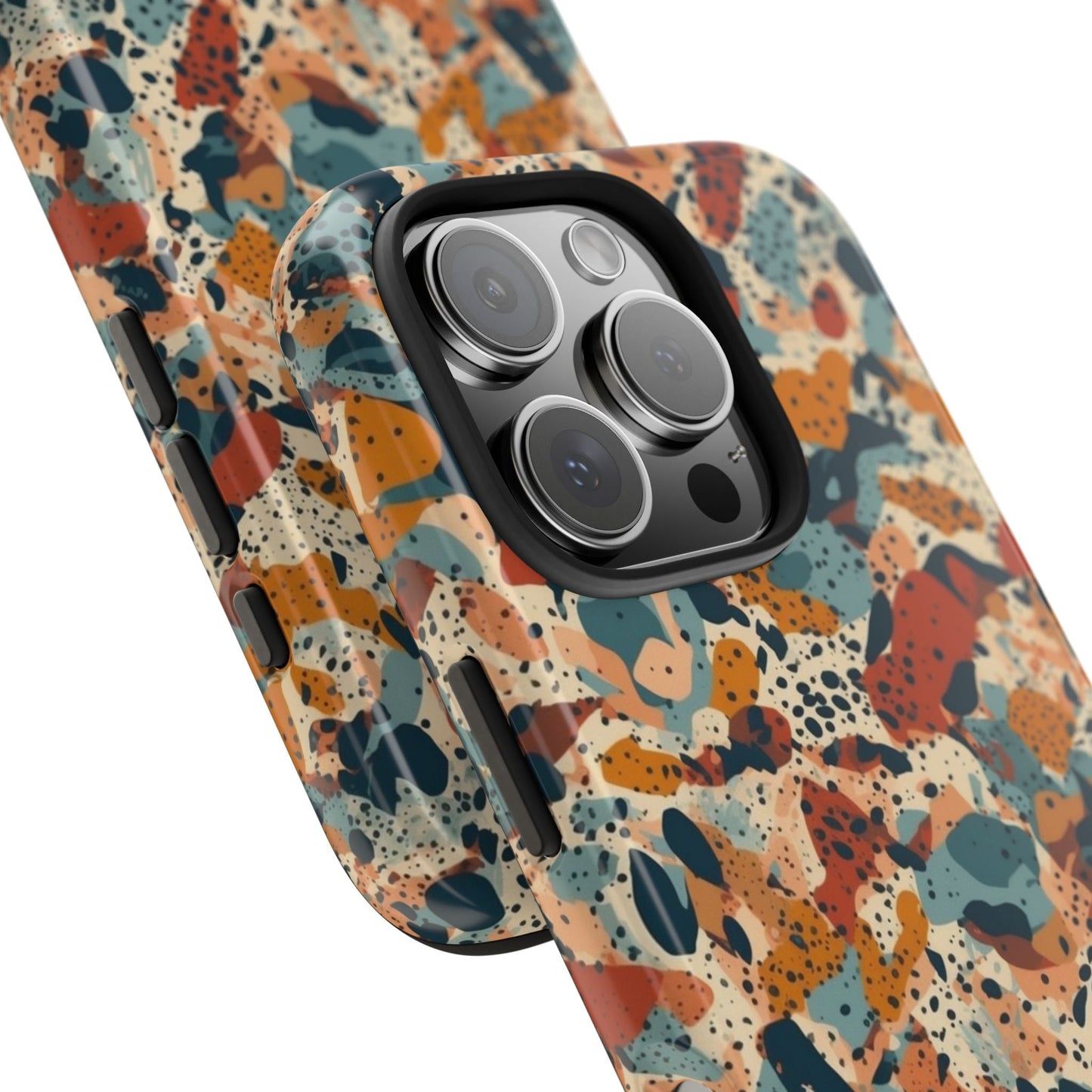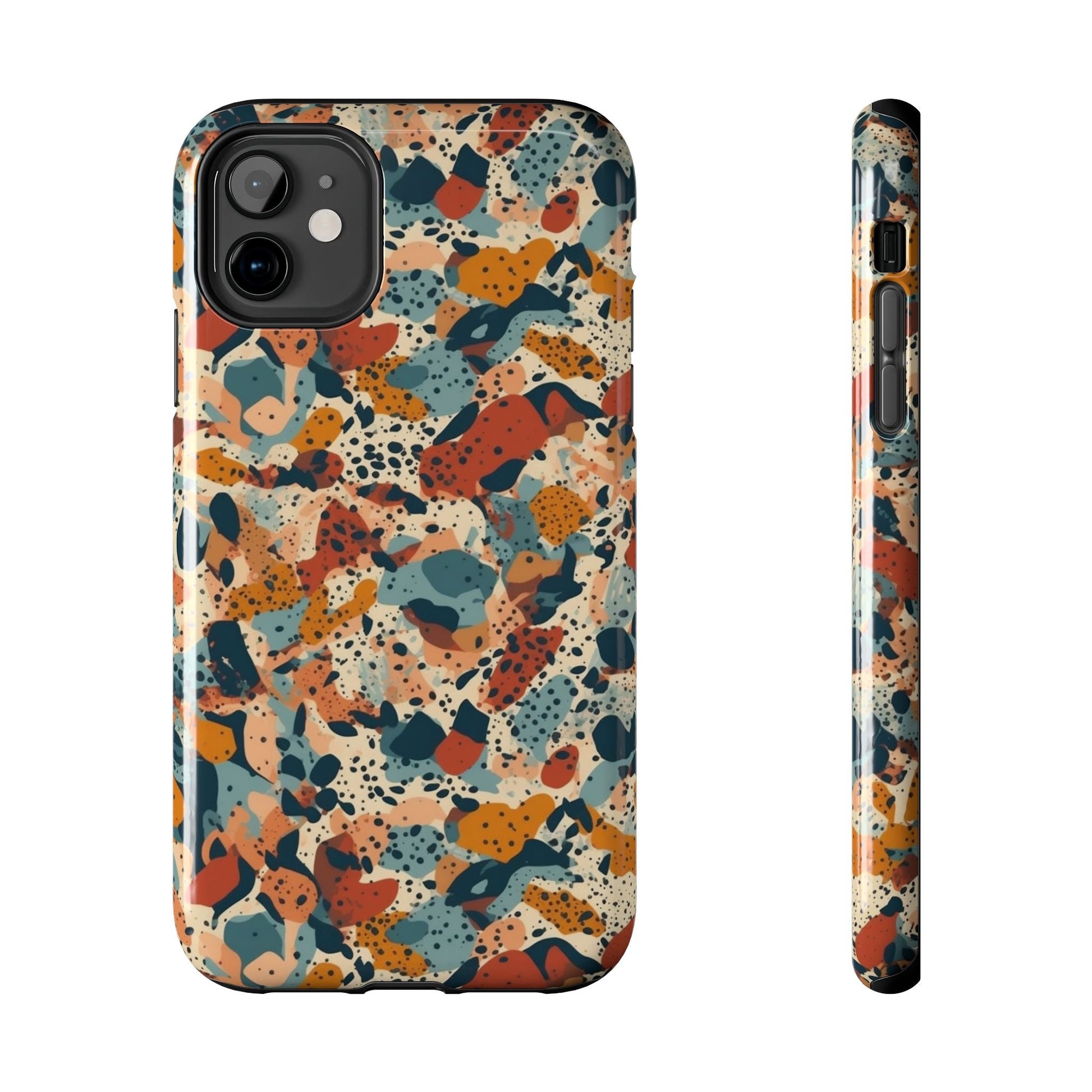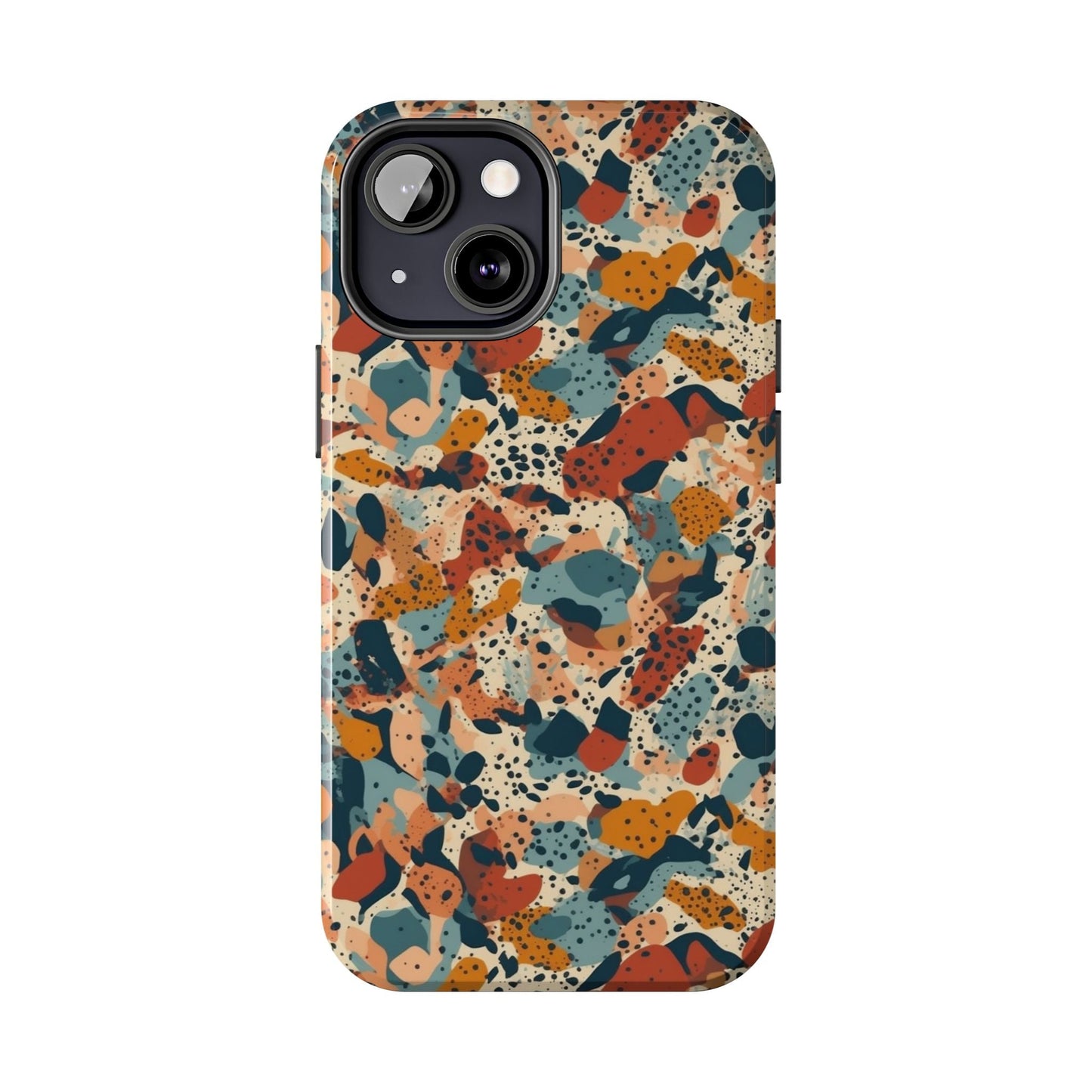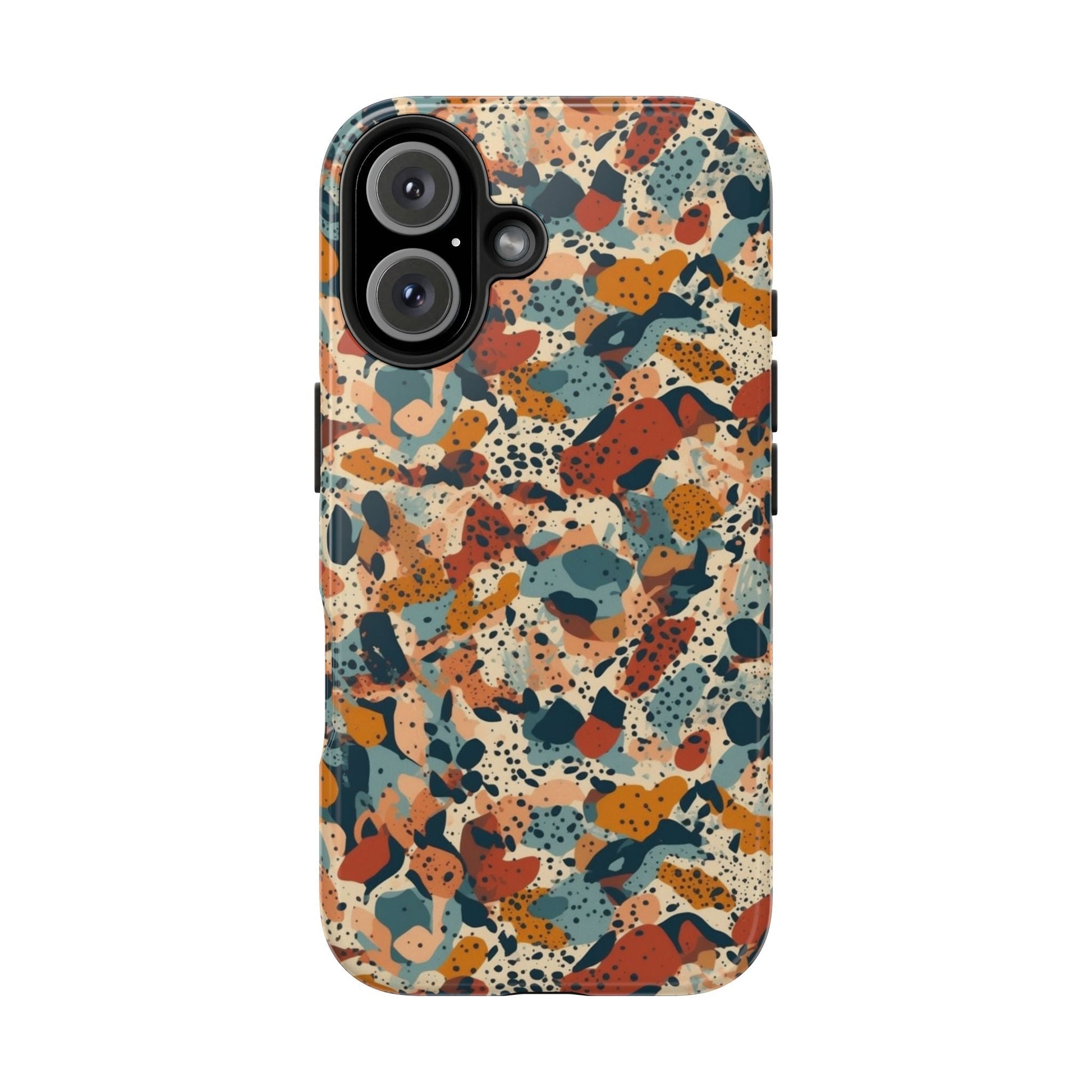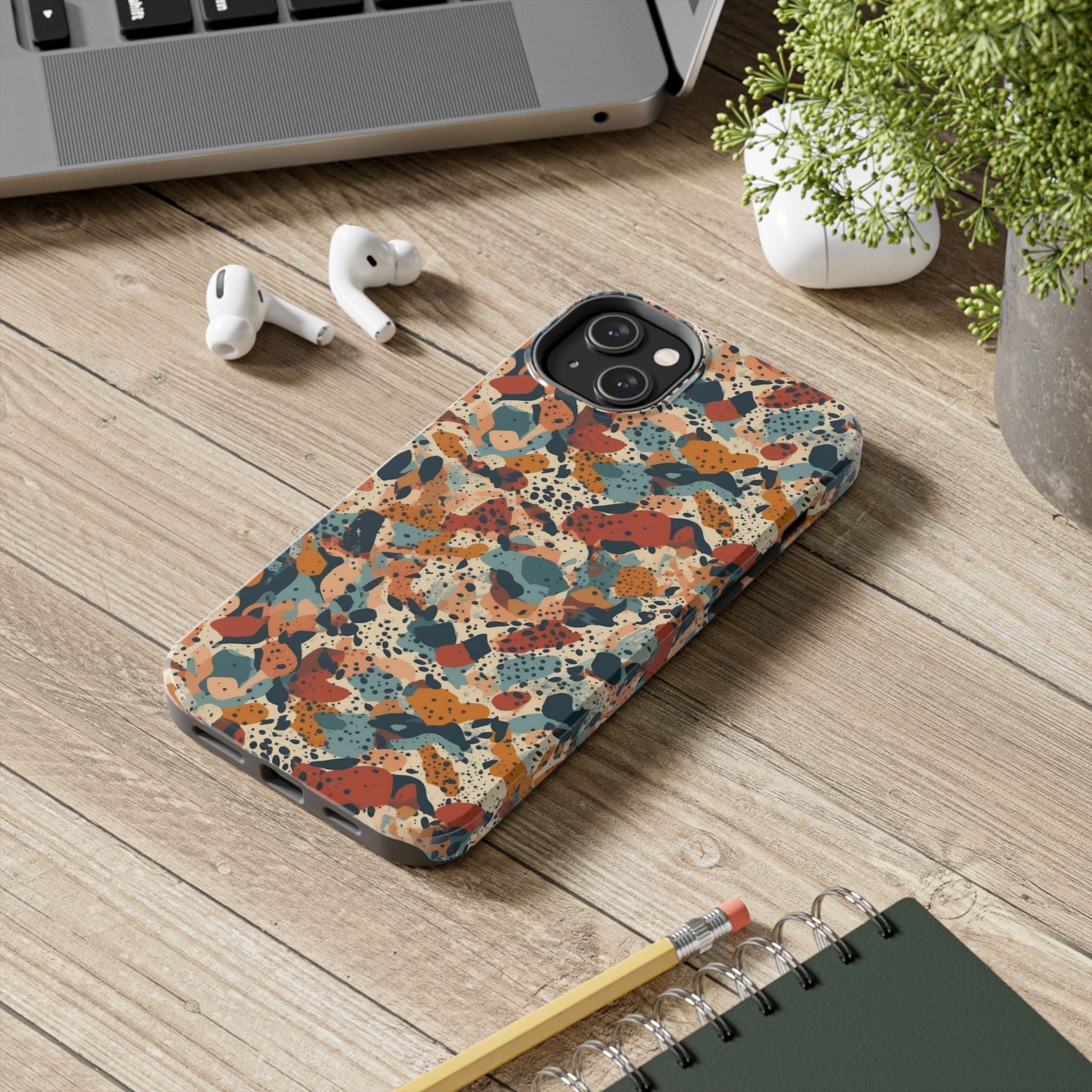 Make a bold style statement with this Terra Chic Abstract iPhone Case! Showcasing a playful collage of warm earth tones, muted teals, and pops of coral, this design evokes a modern terrazzo vibe. The fluid shapes and speckled patterns bring an artistic flair to your device, while the sturdy construction ensures all-around protection. Crafted with a durable polycarbonate shell and shock-absorbing TPU bumper, this case seamlessly blends fashion and function.