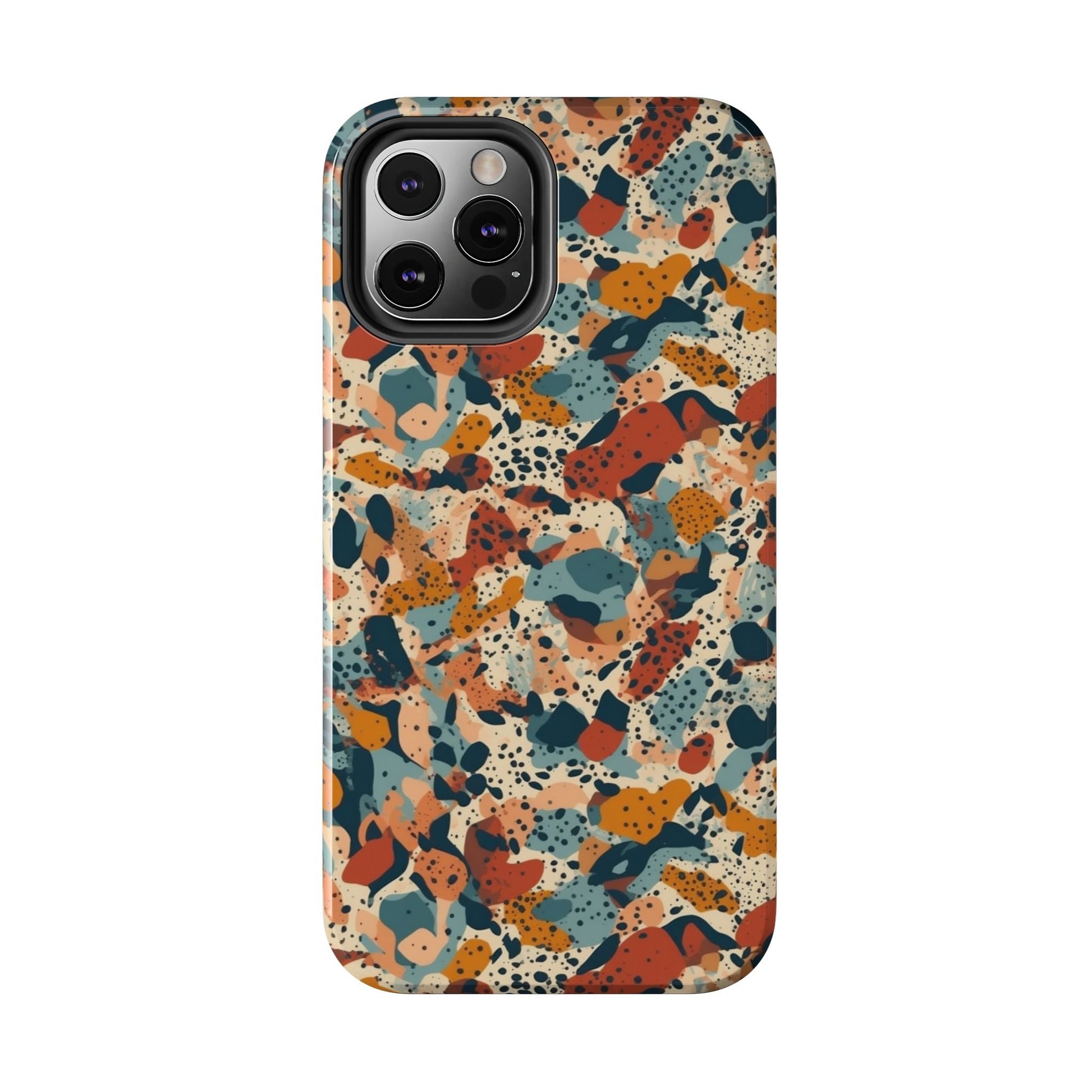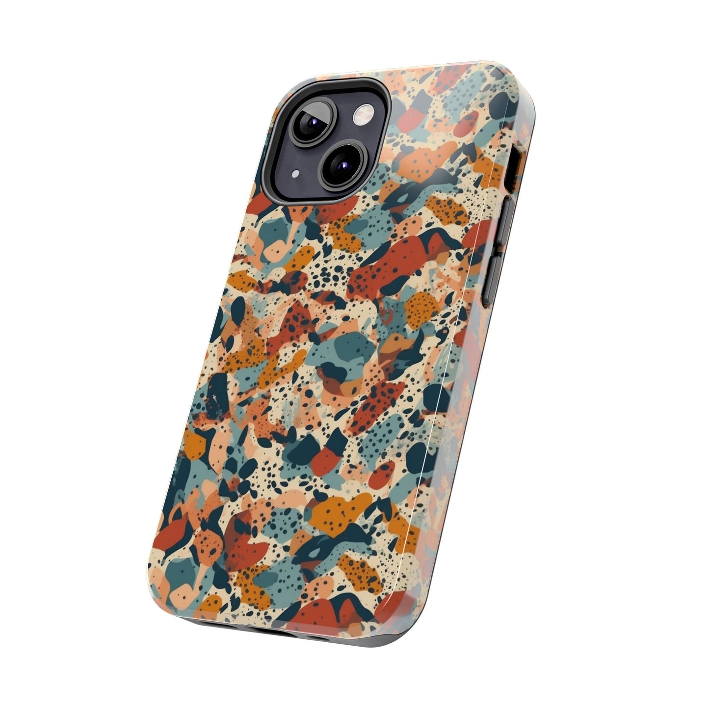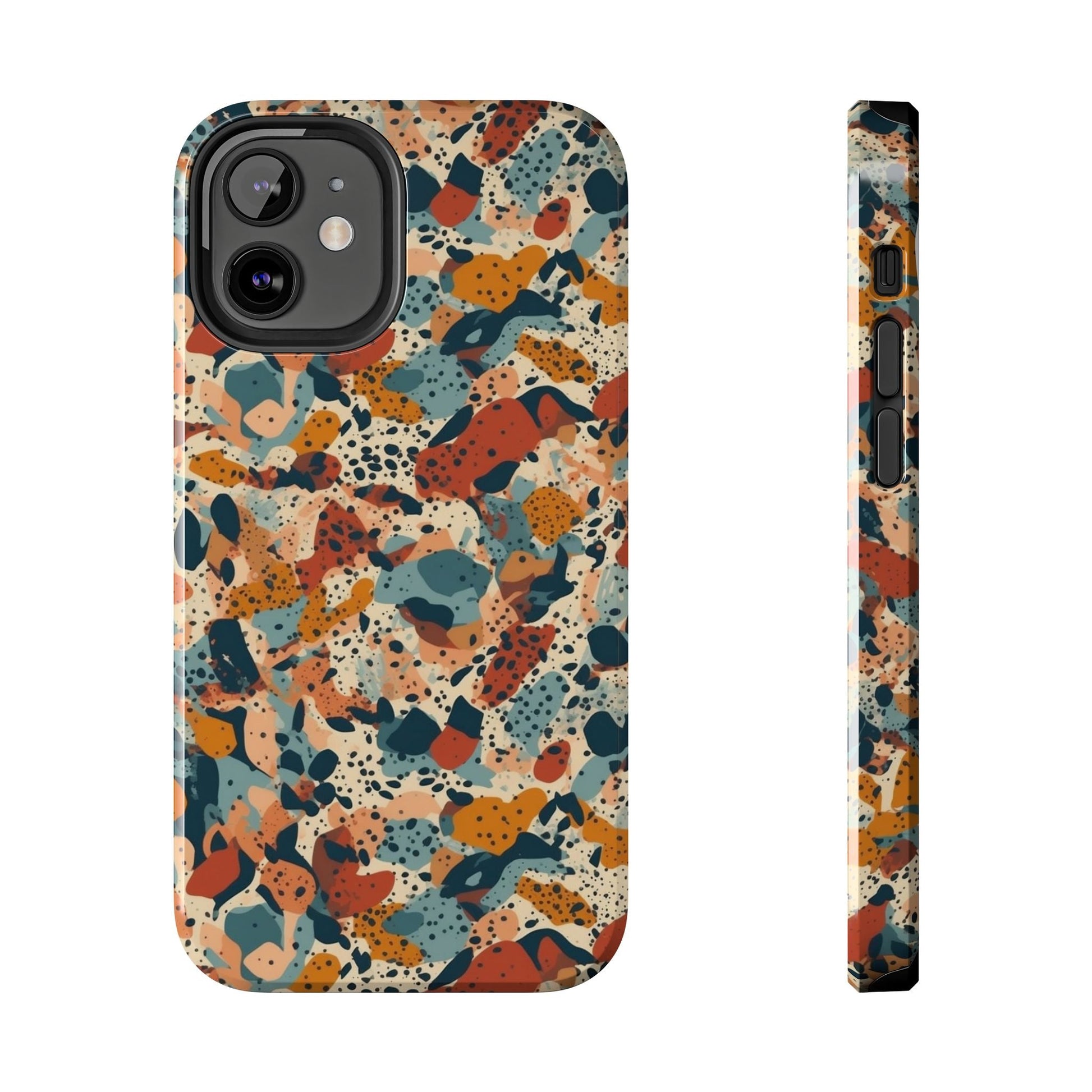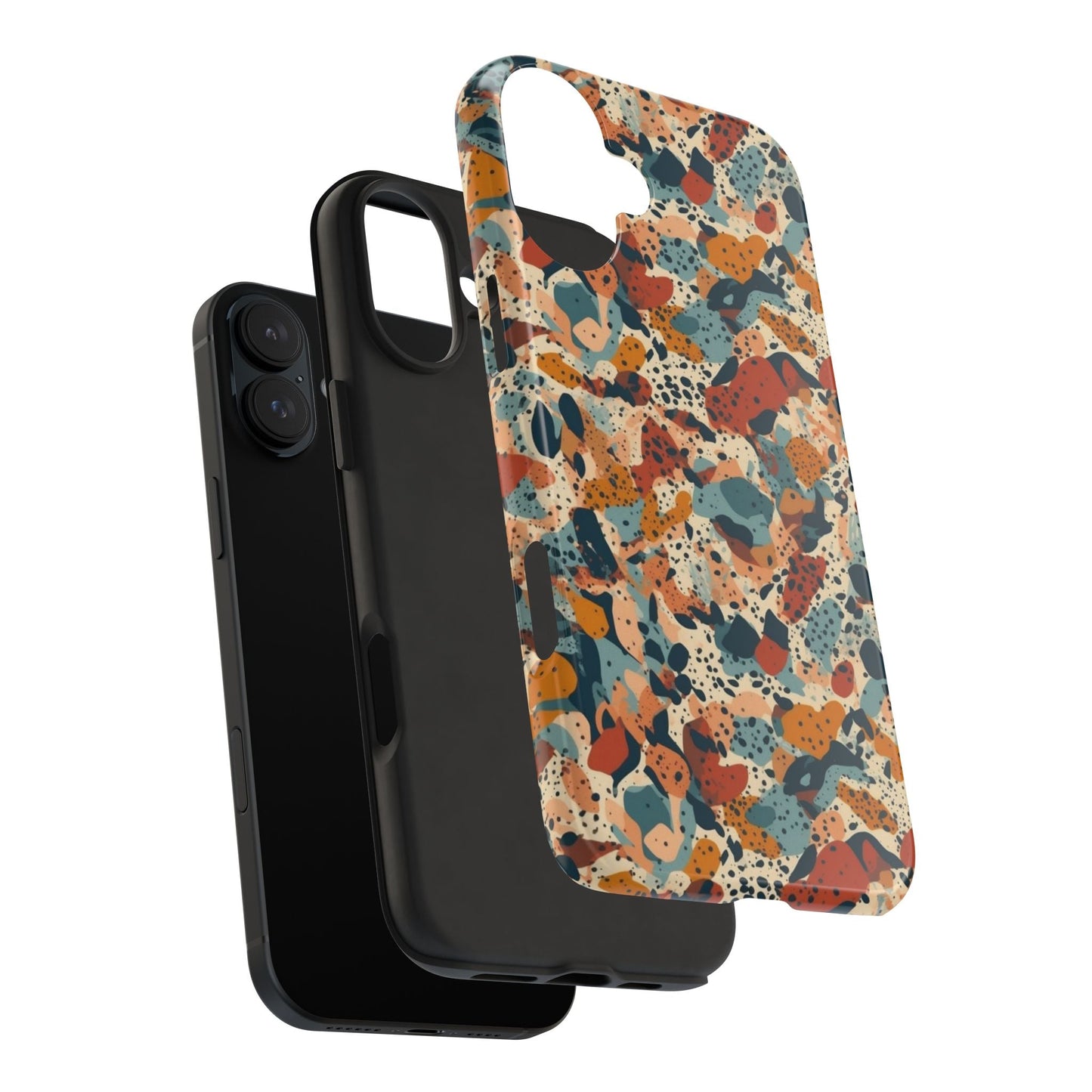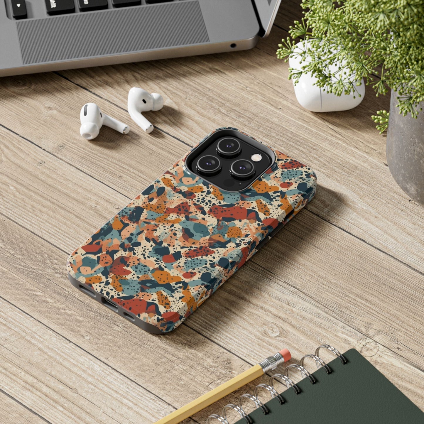 Make a bold style statement with this Terra Chic Abstract iPhone Case! Showcasing a playful collage of warm earth tones, muted teals, and pops of coral, this design evokes a modern terrazzo vibe. The fluid shapes and speckled patterns bring an artistic flair to your device, while the sturdy construction ensures all-around protection. Crafted with a durable polycarbonate shell and shock-absorbing TPU bumper, this case seamlessly blends fashion and function.