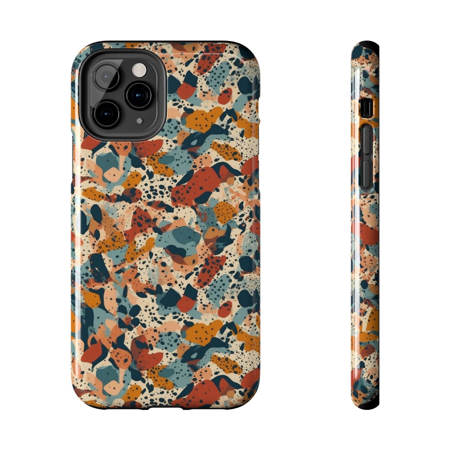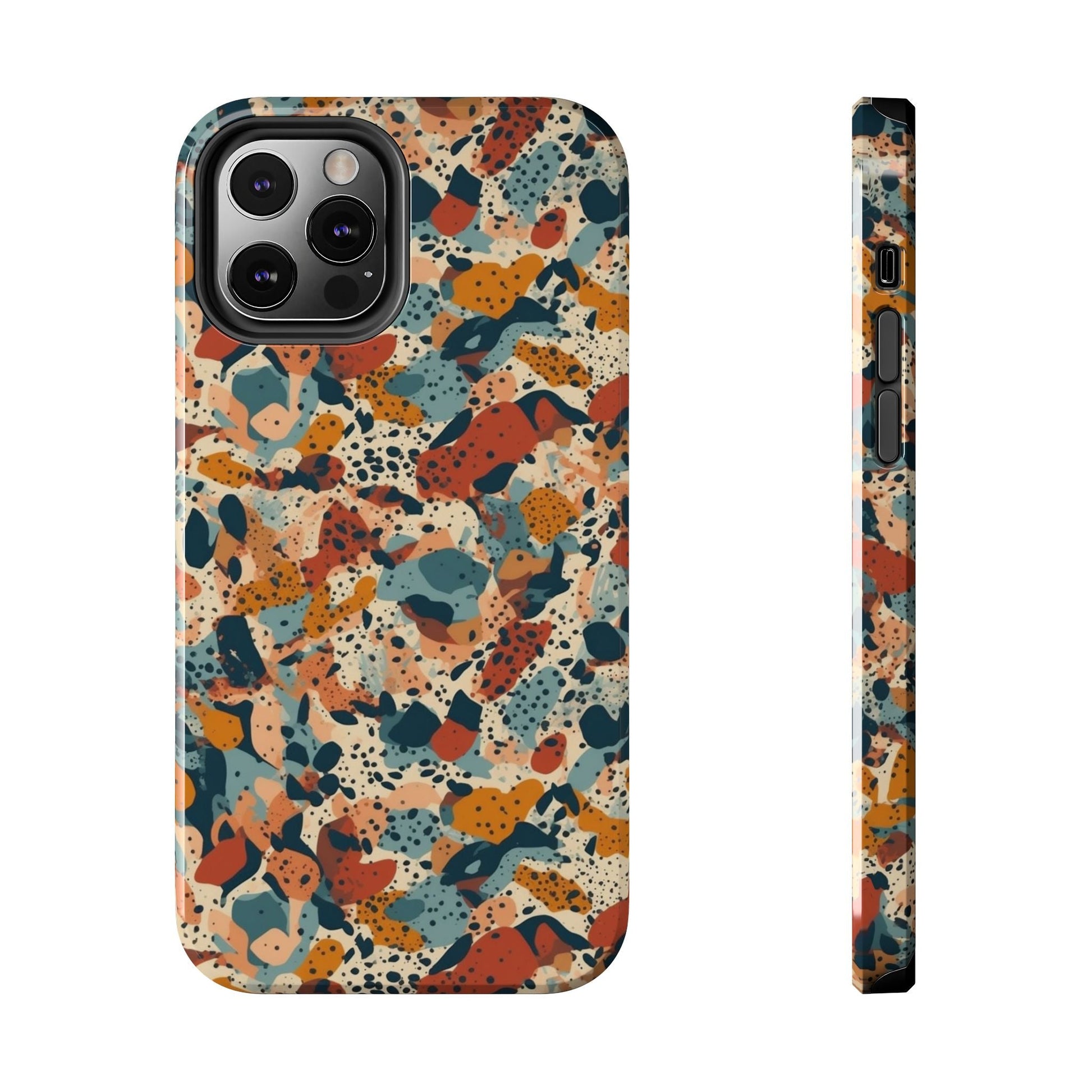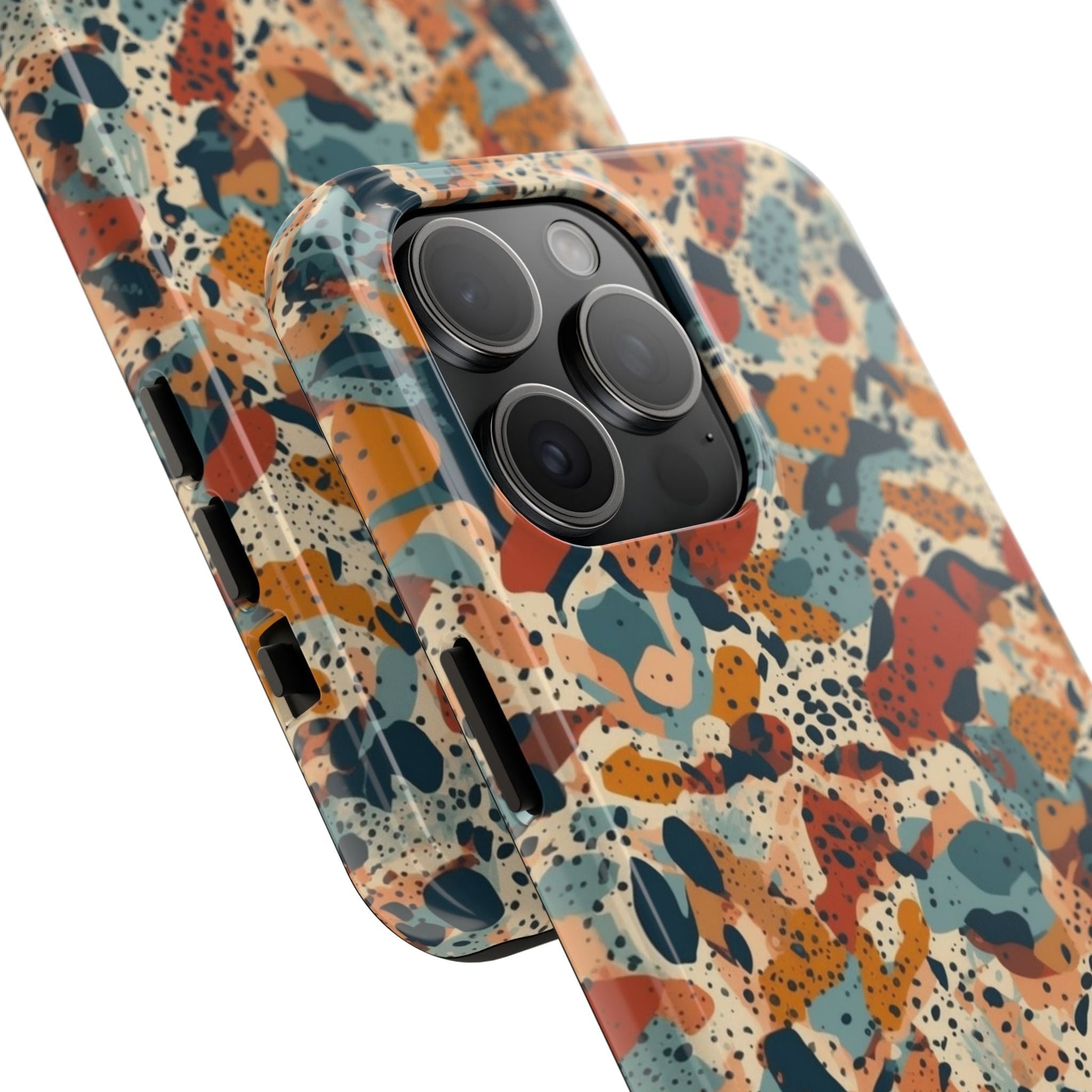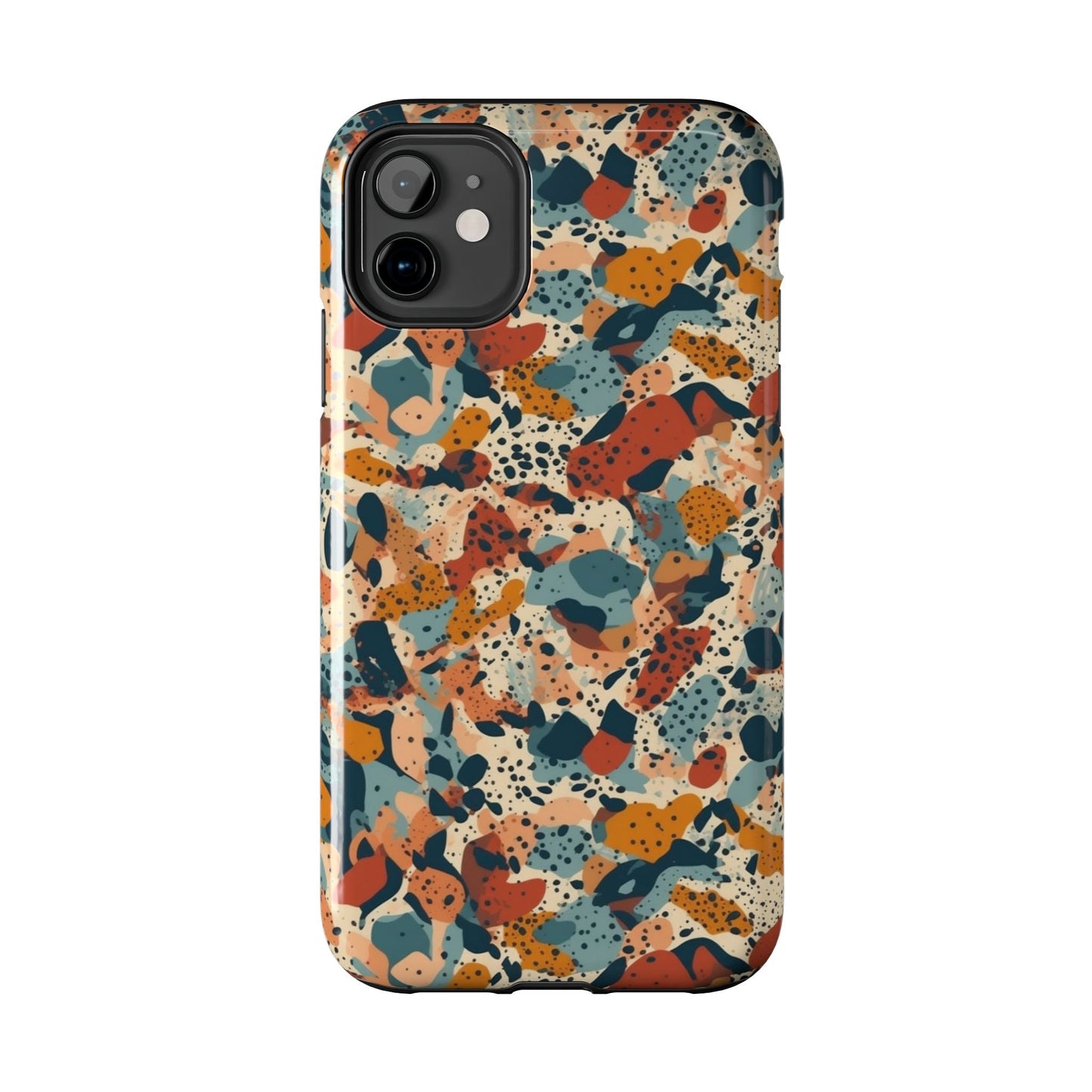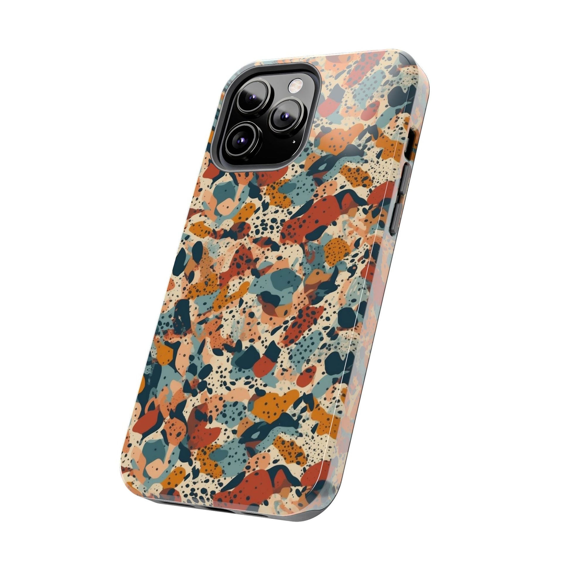 Make a bold style statement with this Terra Chic Abstract iPhone Case! Showcasing a playful collage of warm earth tones, muted teals, and pops of coral, this design evokes a modern terrazzo vibe. The fluid shapes and speckled patterns bring an artistic flair to your device, while the sturdy construction ensures all-around protection. Crafted with a durable polycarbonate shell and shock-absorbing TPU bumper, this case seamlessly blends fashion and function.