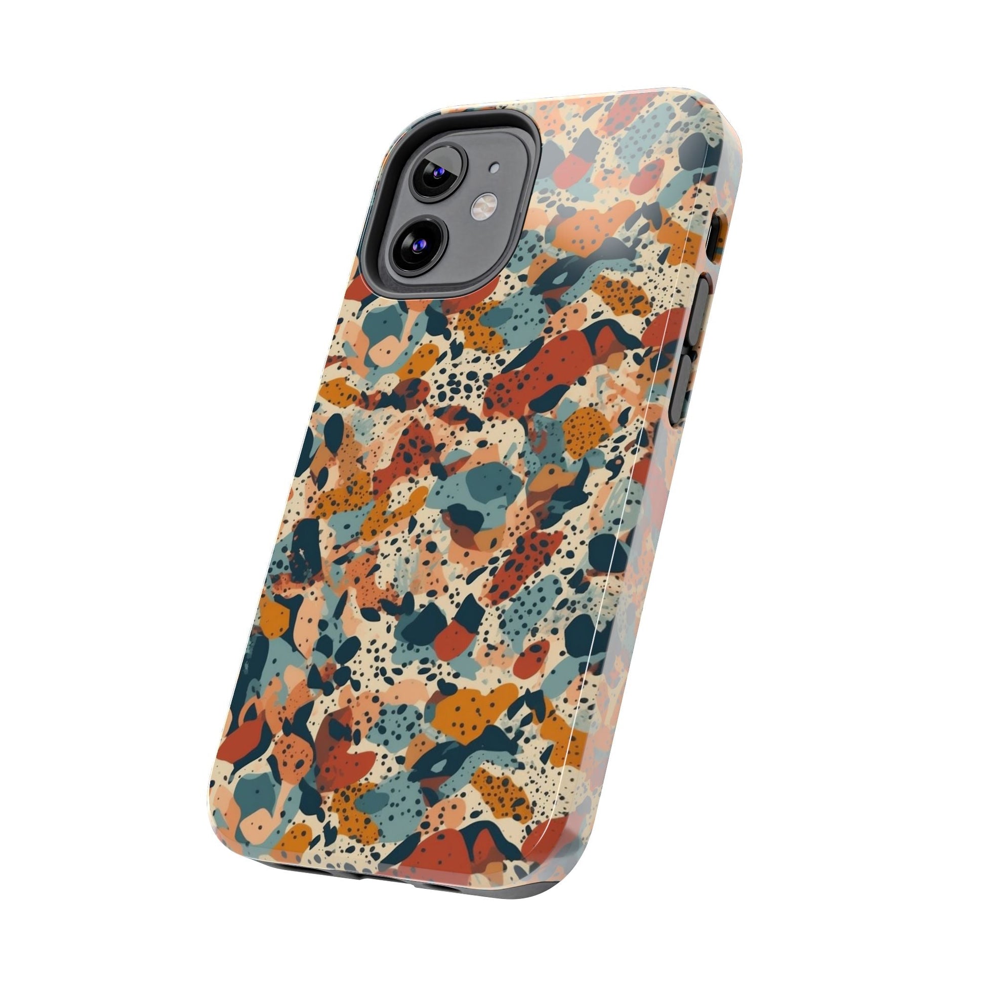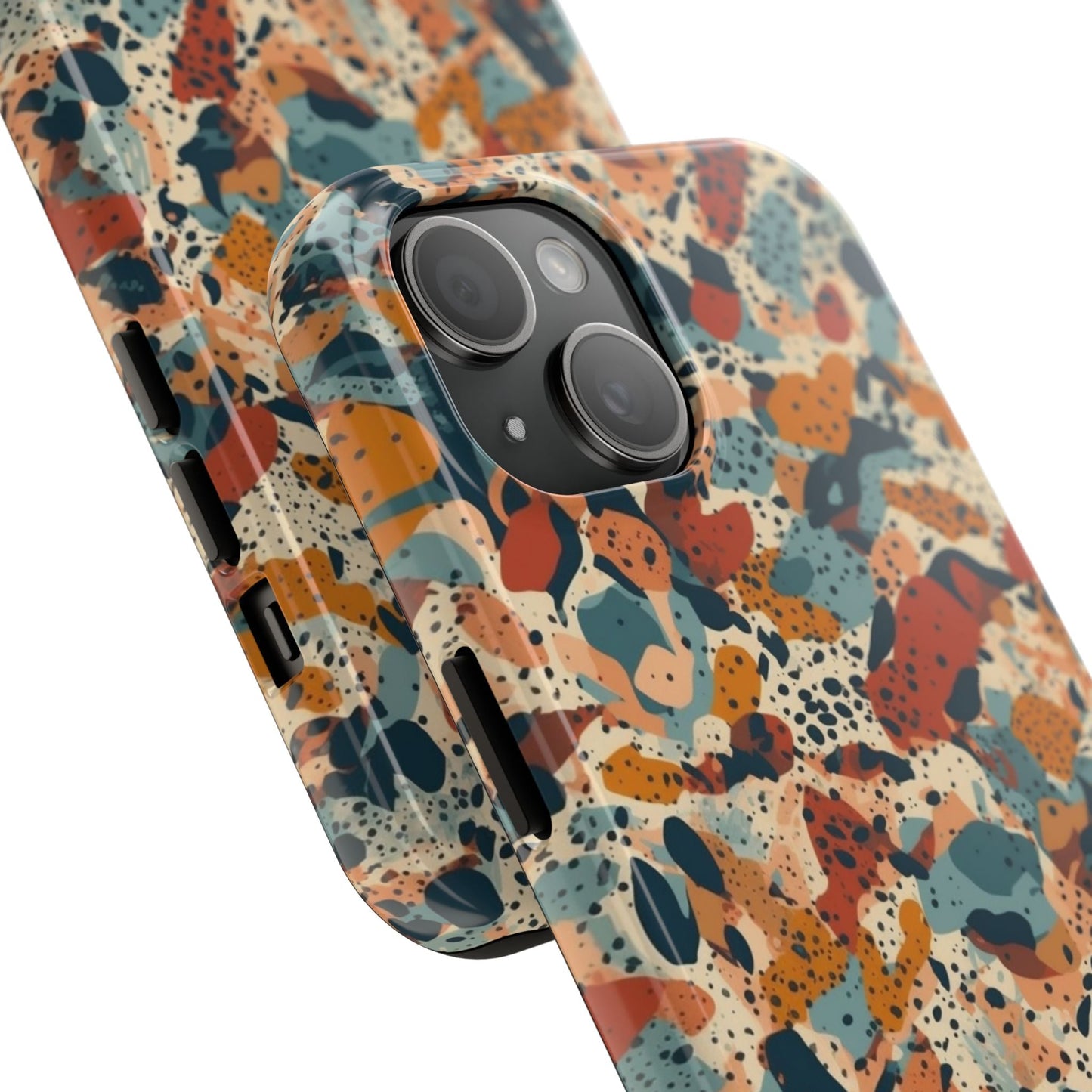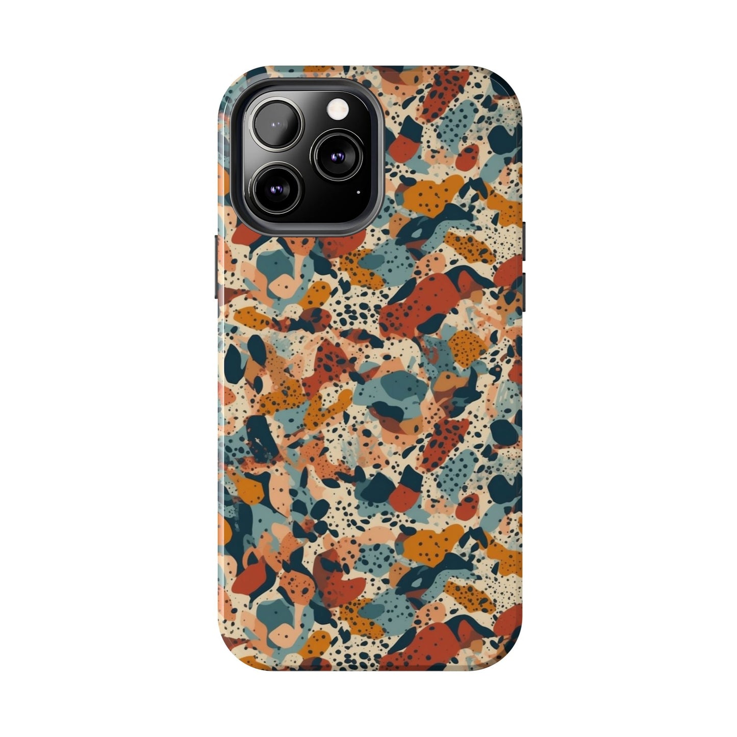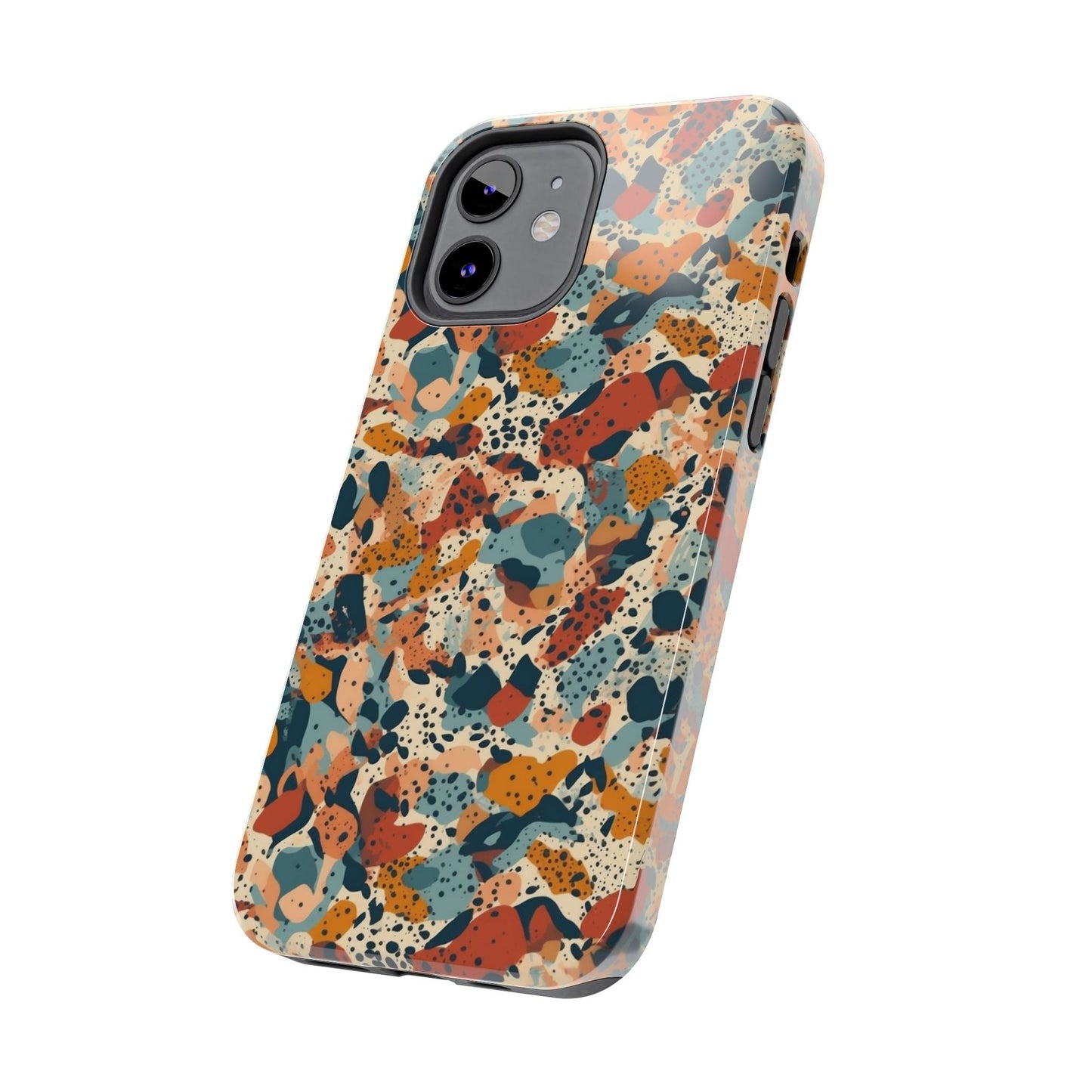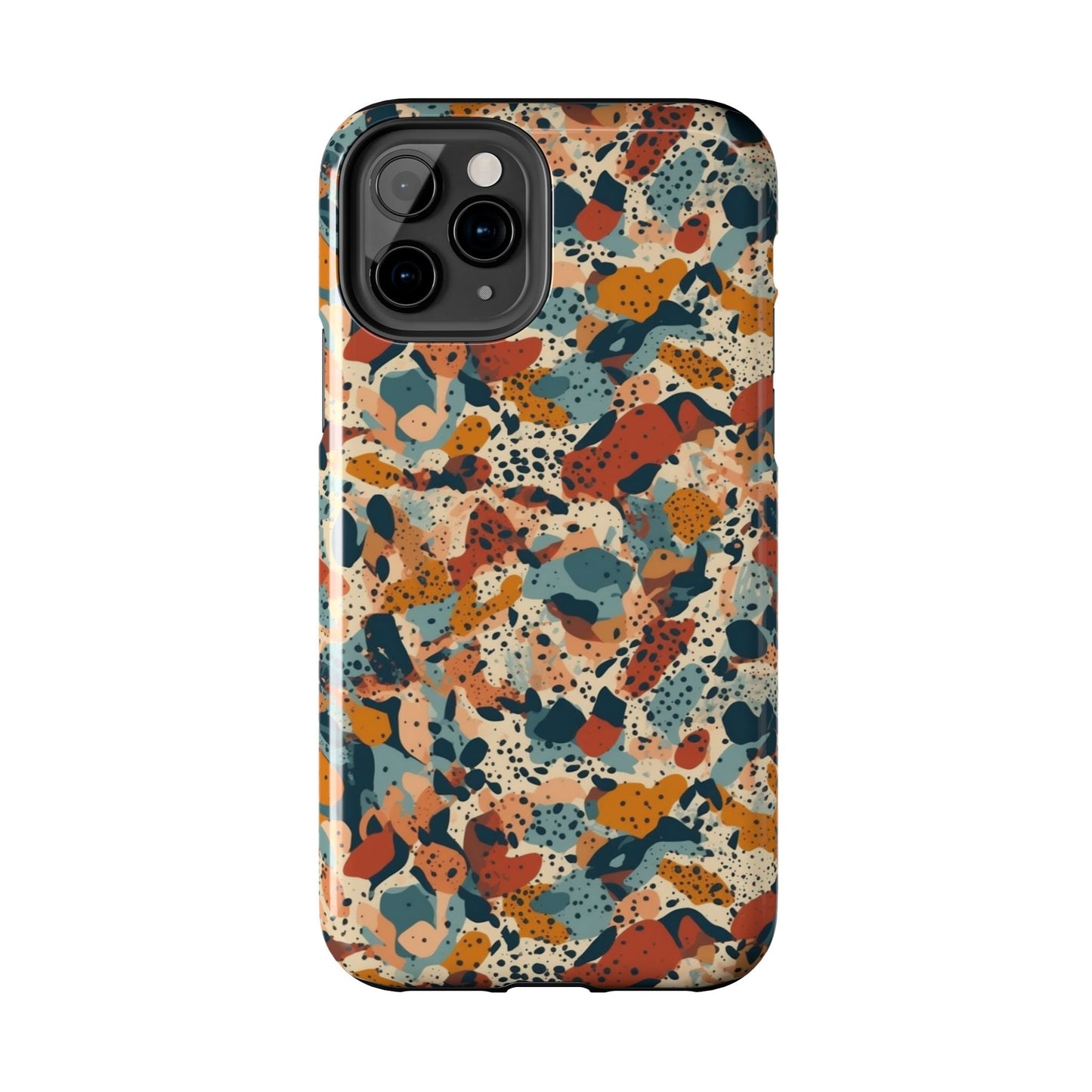 Make a bold style statement with this Terra Chic Abstract iPhone Case! Showcasing a playful collage of warm earth tones, muted teals, and pops of coral, this design evokes a modern terrazzo vibe. The fluid shapes and speckled patterns bring an artistic flair to your device, while the sturdy construction ensures all-around protection. Crafted with a durable polycarbonate shell and shock-absorbing TPU bumper, this case seamlessly blends fashion and function.