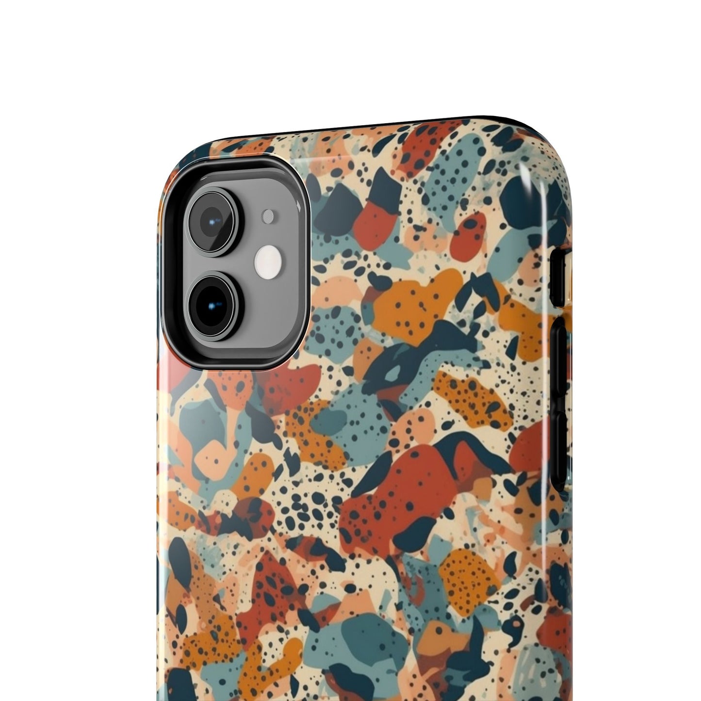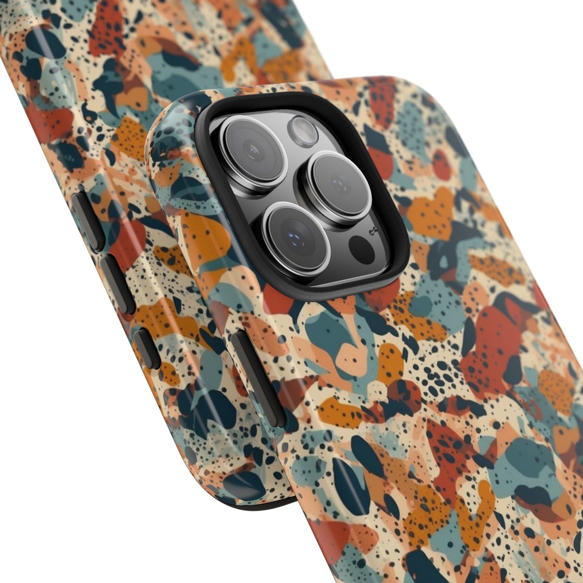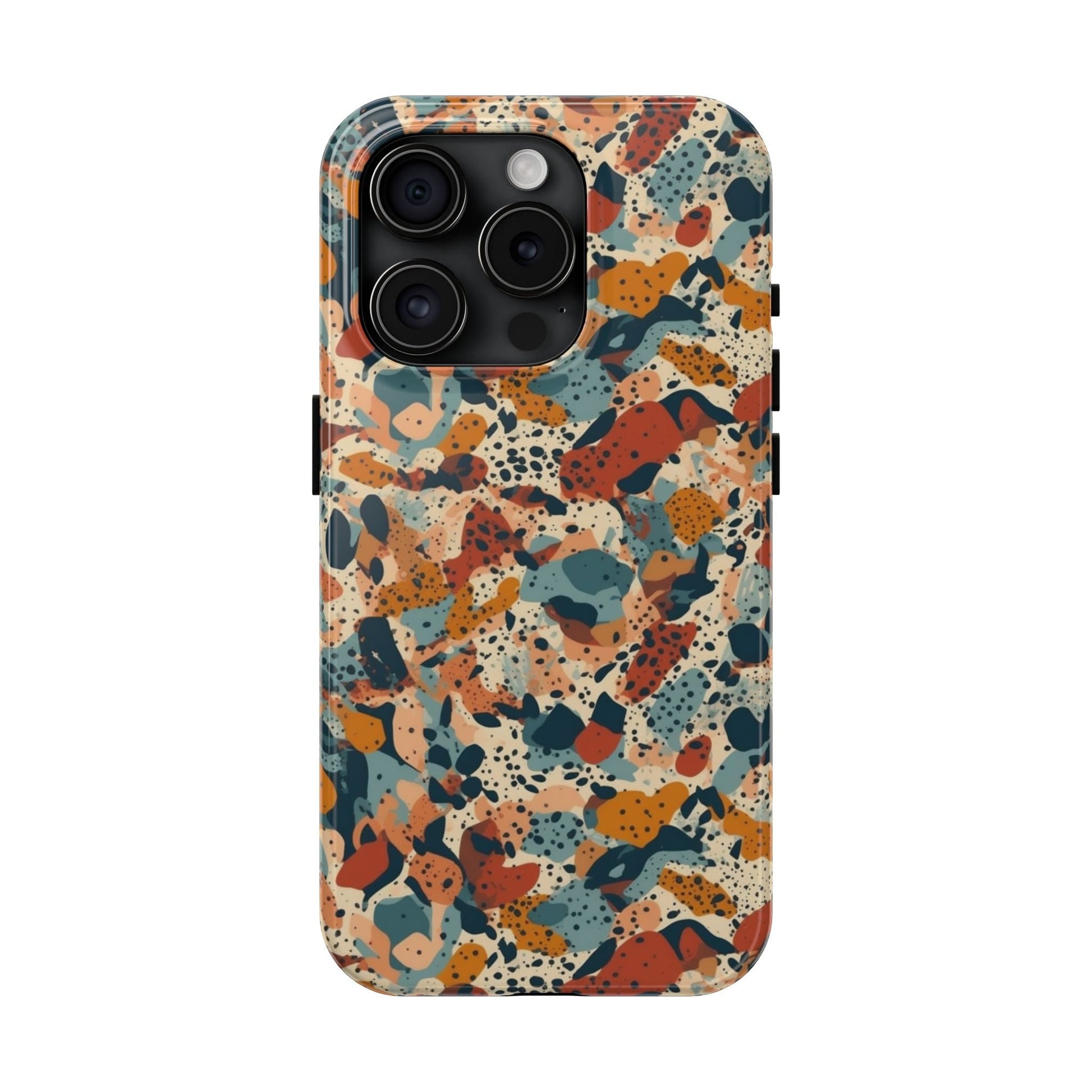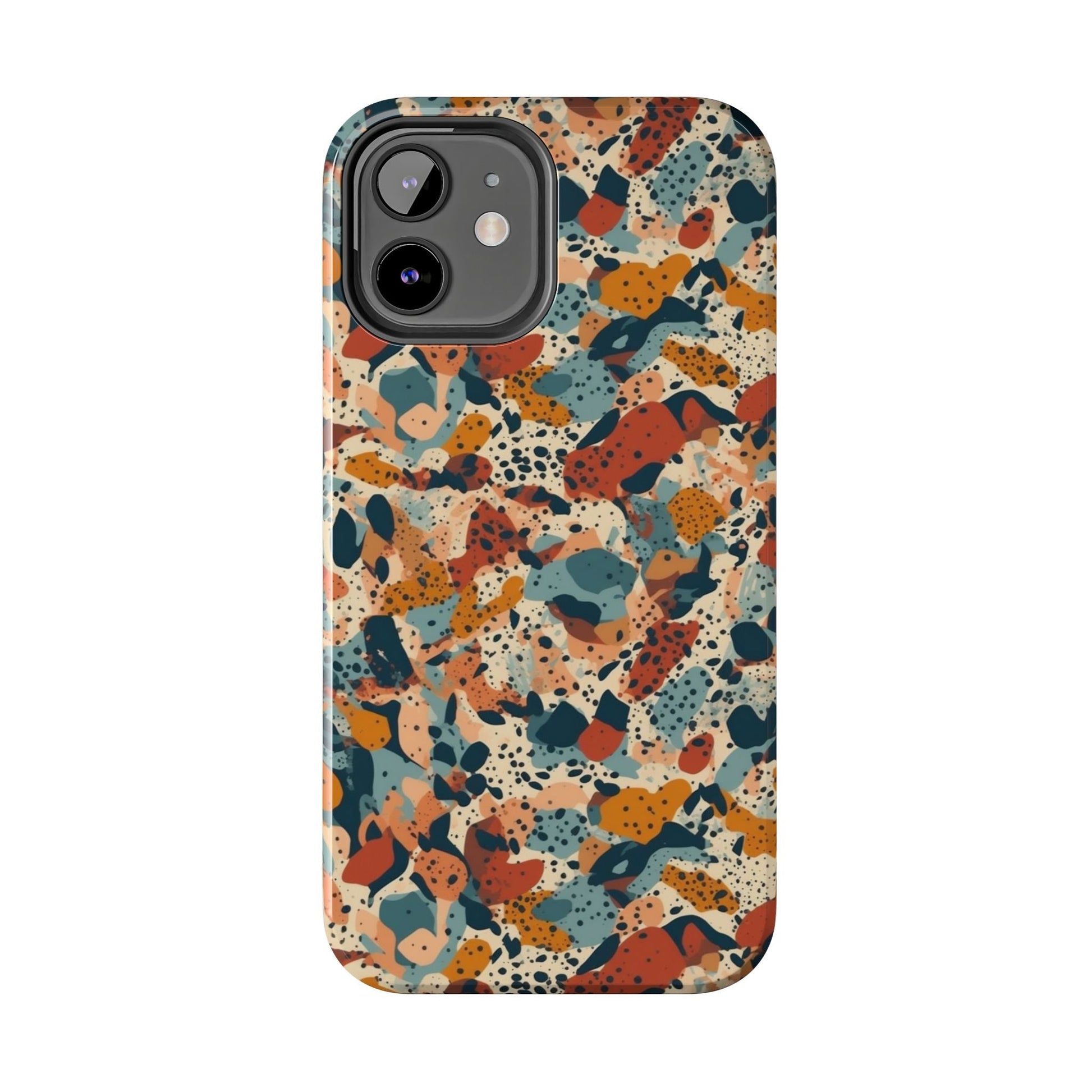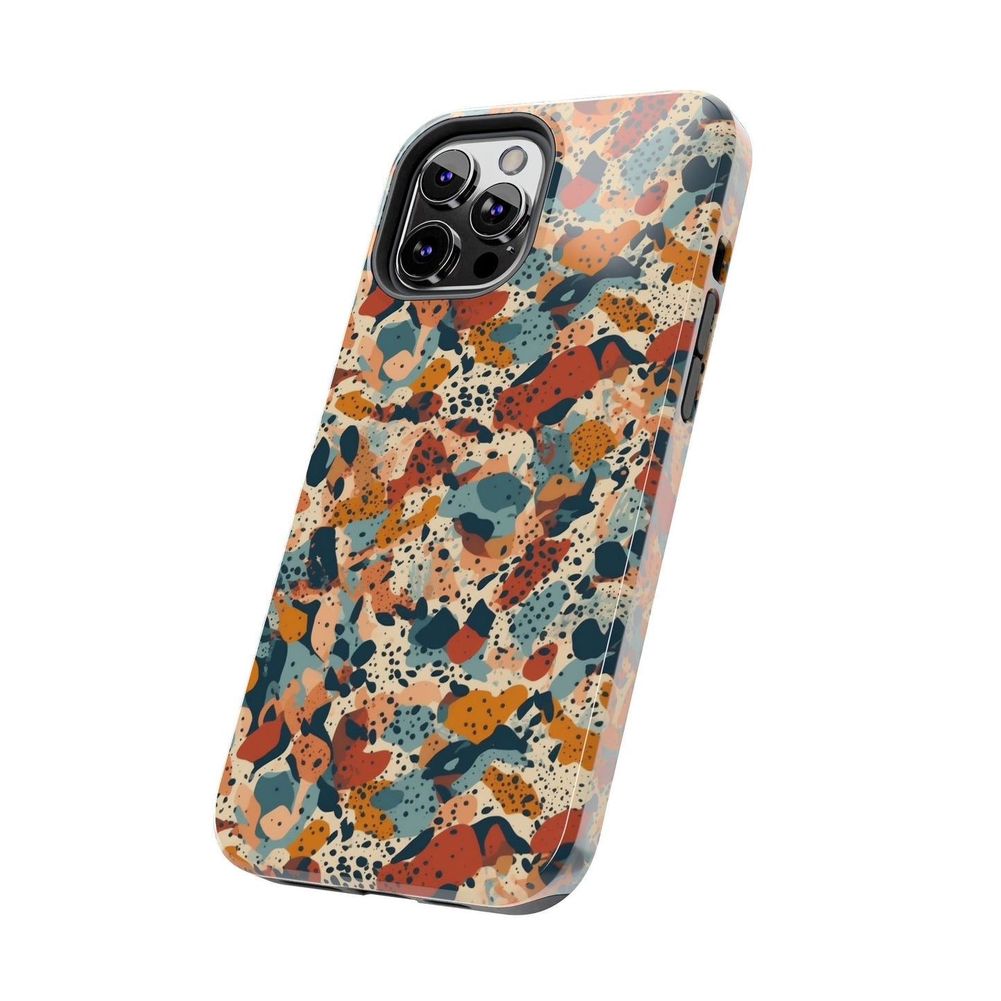 Make a bold style statement with this Terra Chic Abstract iPhone Case! Showcasing a playful collage of warm earth tones, muted teals, and pops of coral, this design evokes a modern terrazzo vibe. The fluid shapes and speckled patterns bring an artistic flair to your device, while the sturdy construction ensures all-around protection. Crafted with a durable polycarbonate shell and shock-absorbing TPU bumper, this case seamlessly blends fashion and function.
