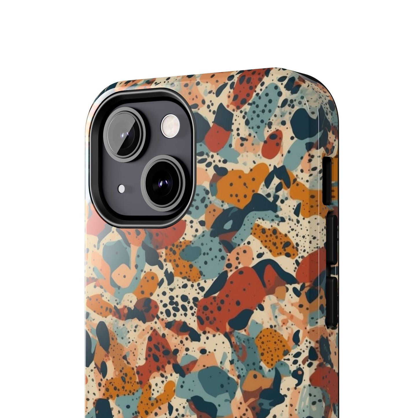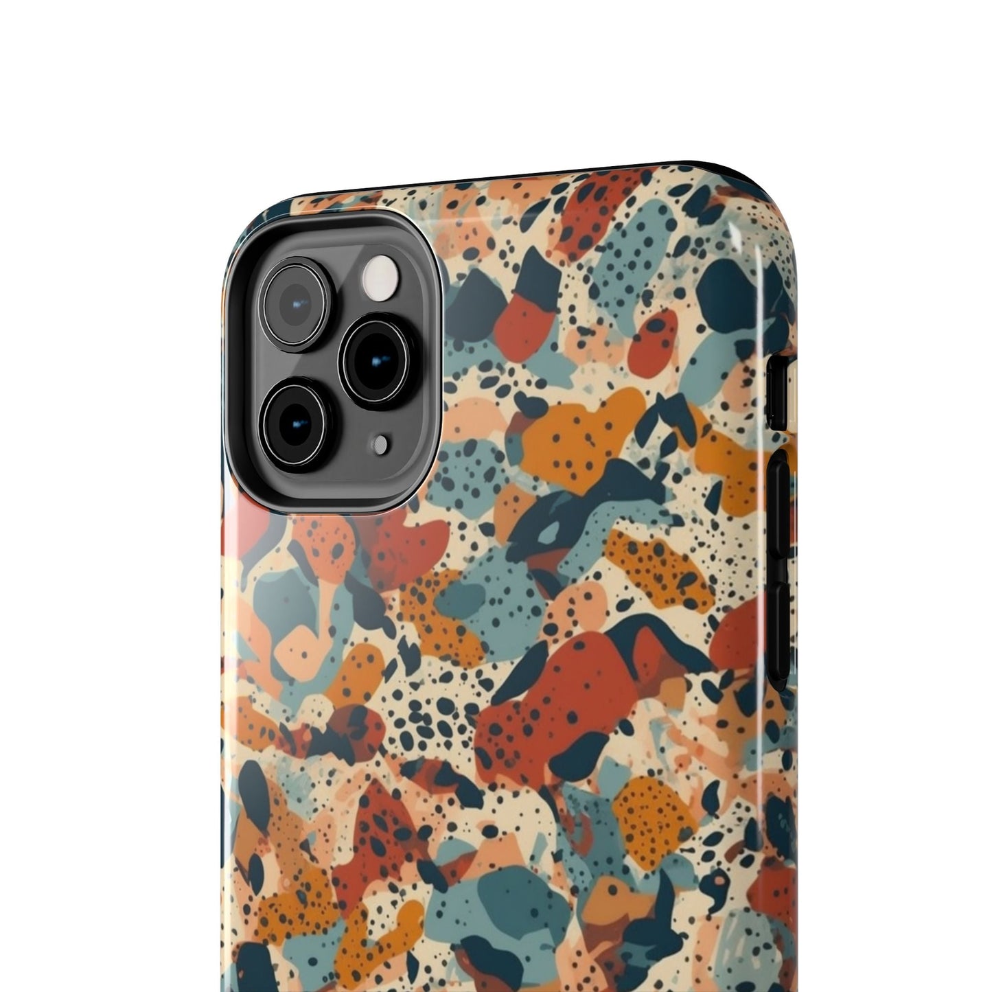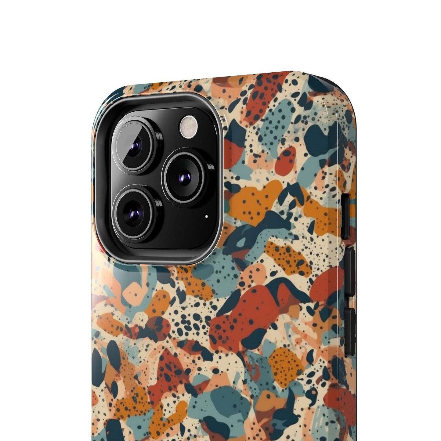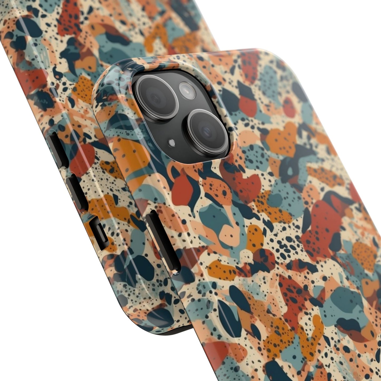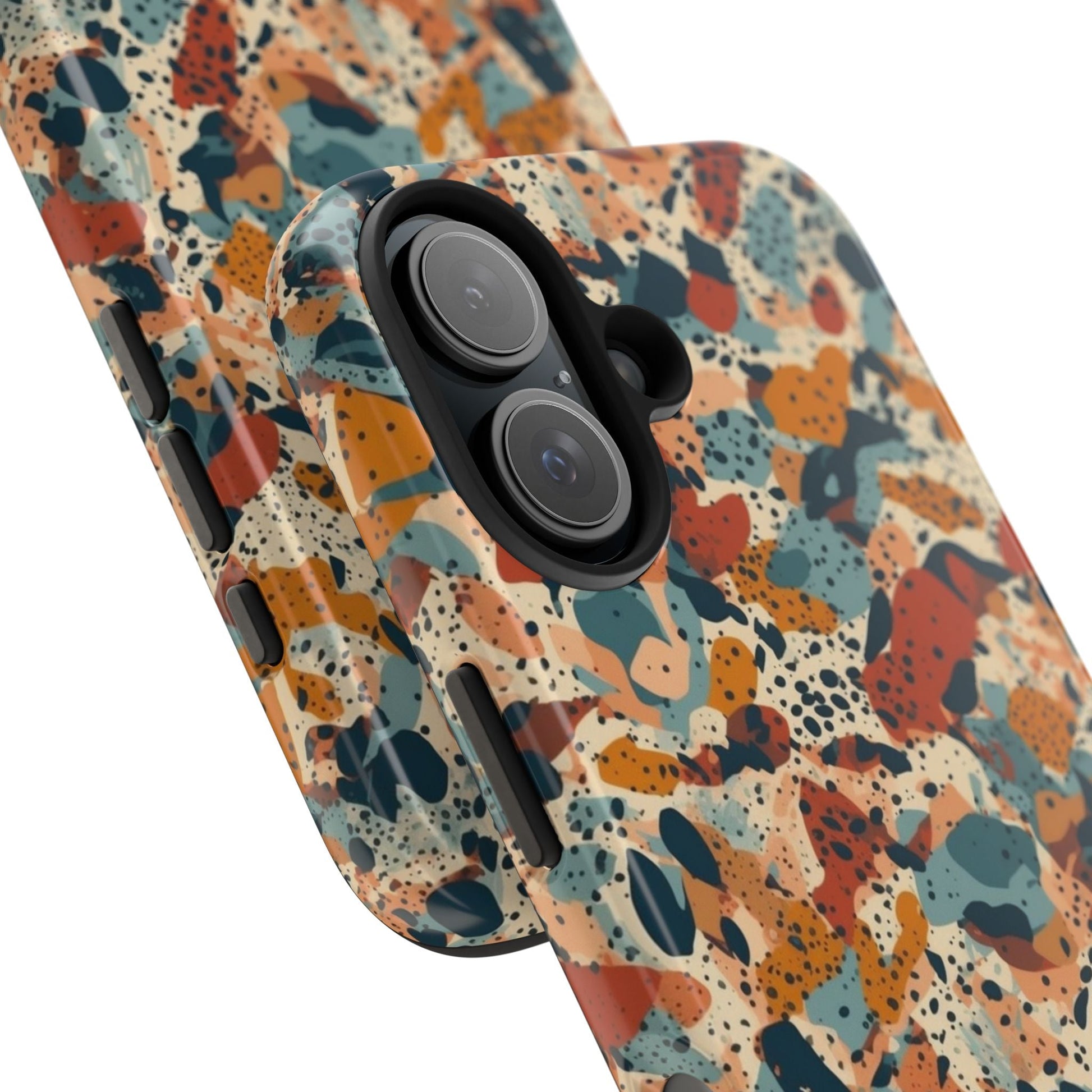 Make a bold style statement with this Terra Chic Abstract iPhone Case! Showcasing a playful collage of warm earth tones, muted teals, and pops of coral, this design evokes a modern terrazzo vibe. The fluid shapes and speckled patterns bring an artistic flair to your device, while the sturdy construction ensures all-around protection. Crafted with a durable polycarbonate shell and shock-absorbing TPU bumper, this case seamlessly blends fashion and function.
