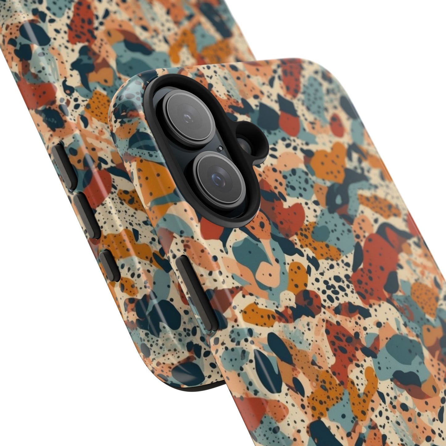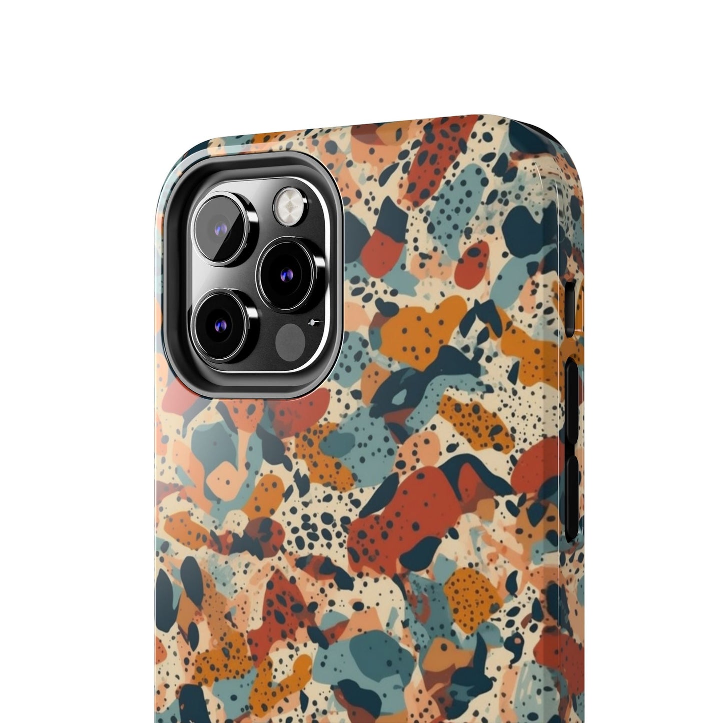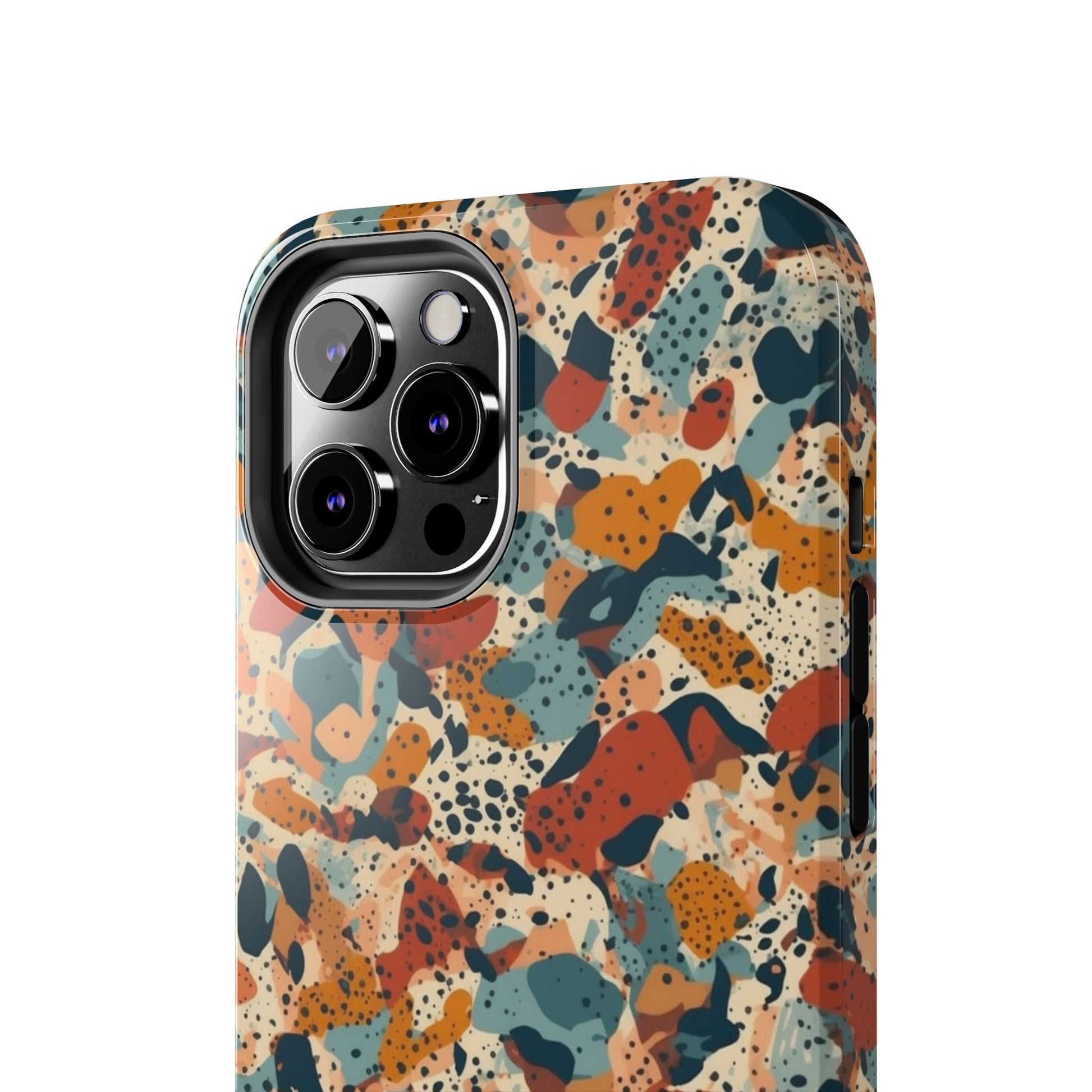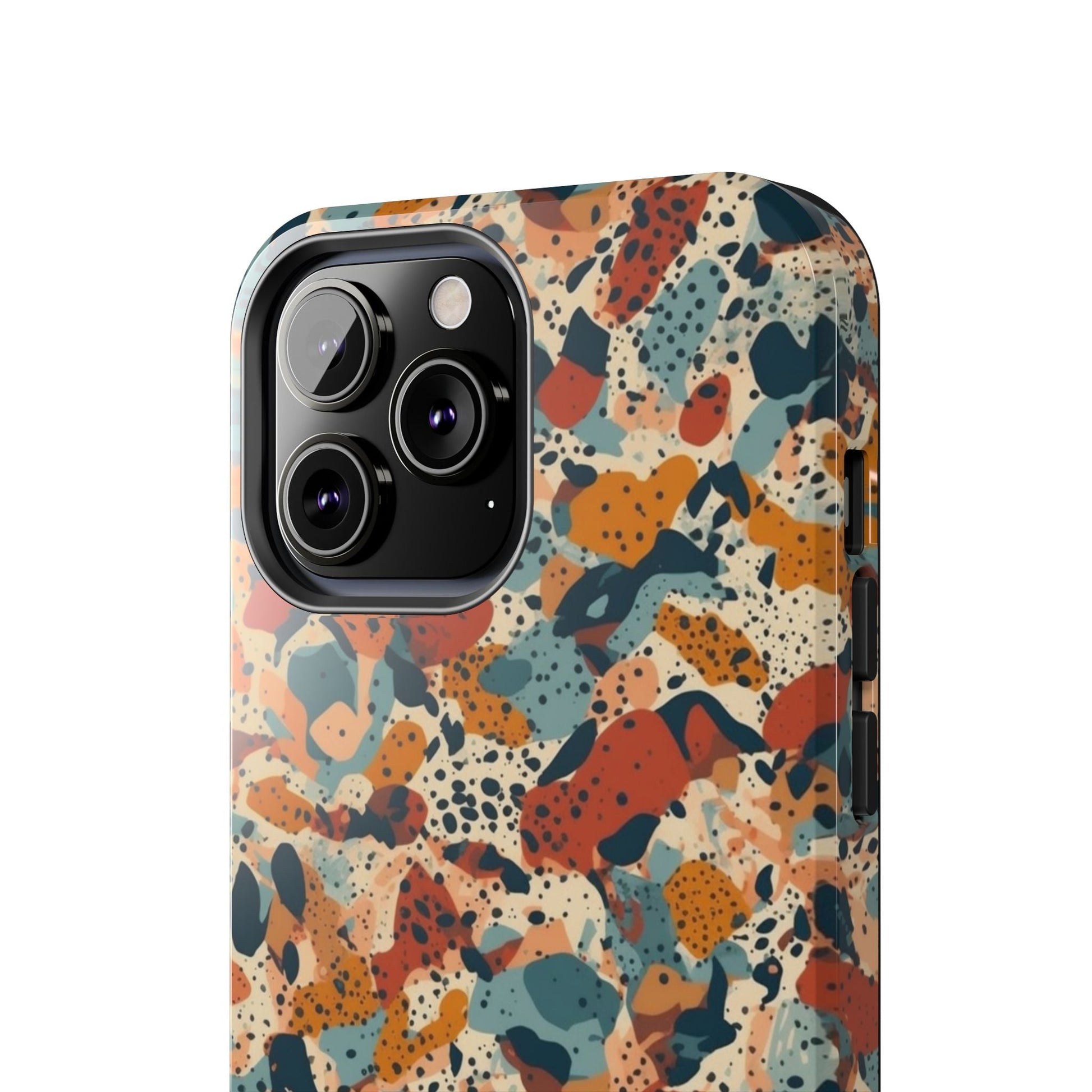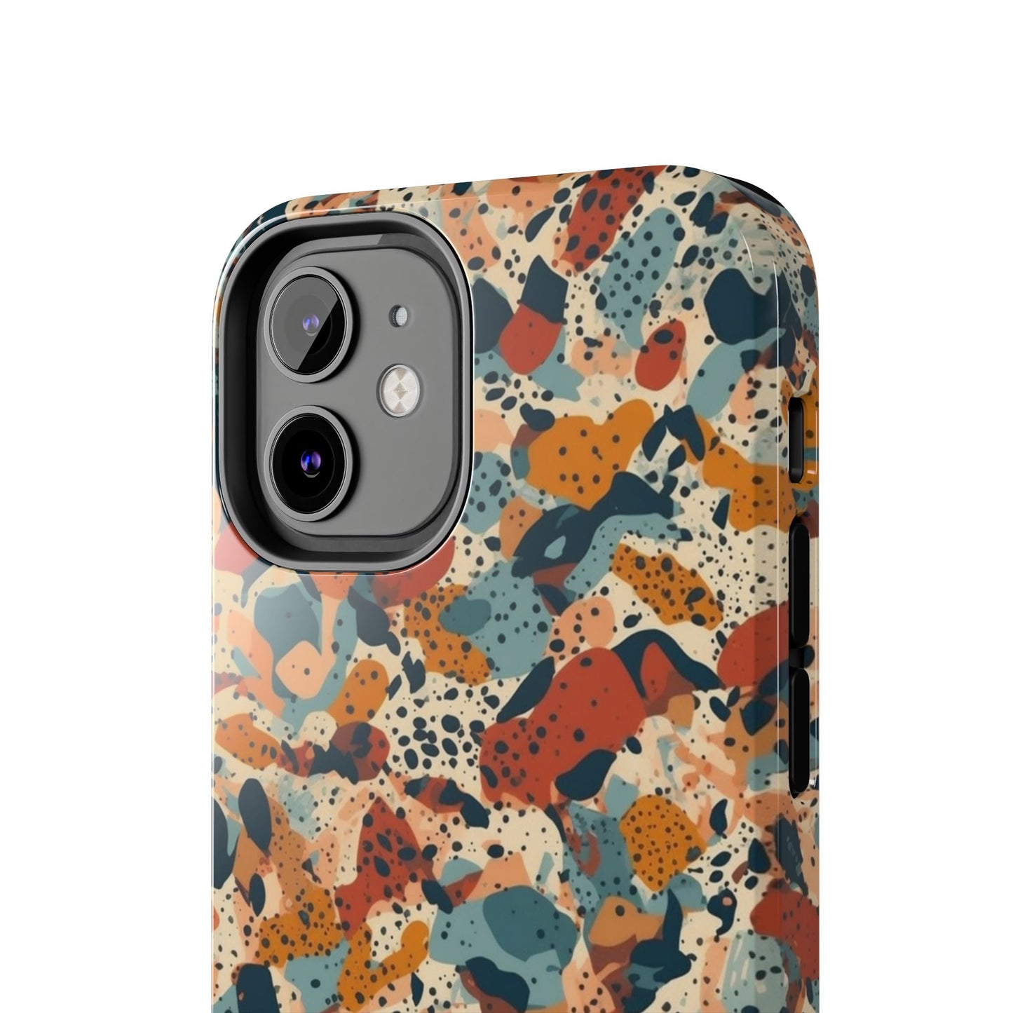 Make a bold style statement with this Terra Chic Abstract iPhone Case! Showcasing a playful collage of warm earth tones, muted teals, and pops of coral, this design evokes a modern terrazzo vibe. The fluid shapes and speckled patterns bring an artistic flair to your device, while the sturdy construction ensures all-around protection. Crafted with a durable polycarbonate shell and shock-absorbing TPU bumper, this case seamlessly blends fashion and function.