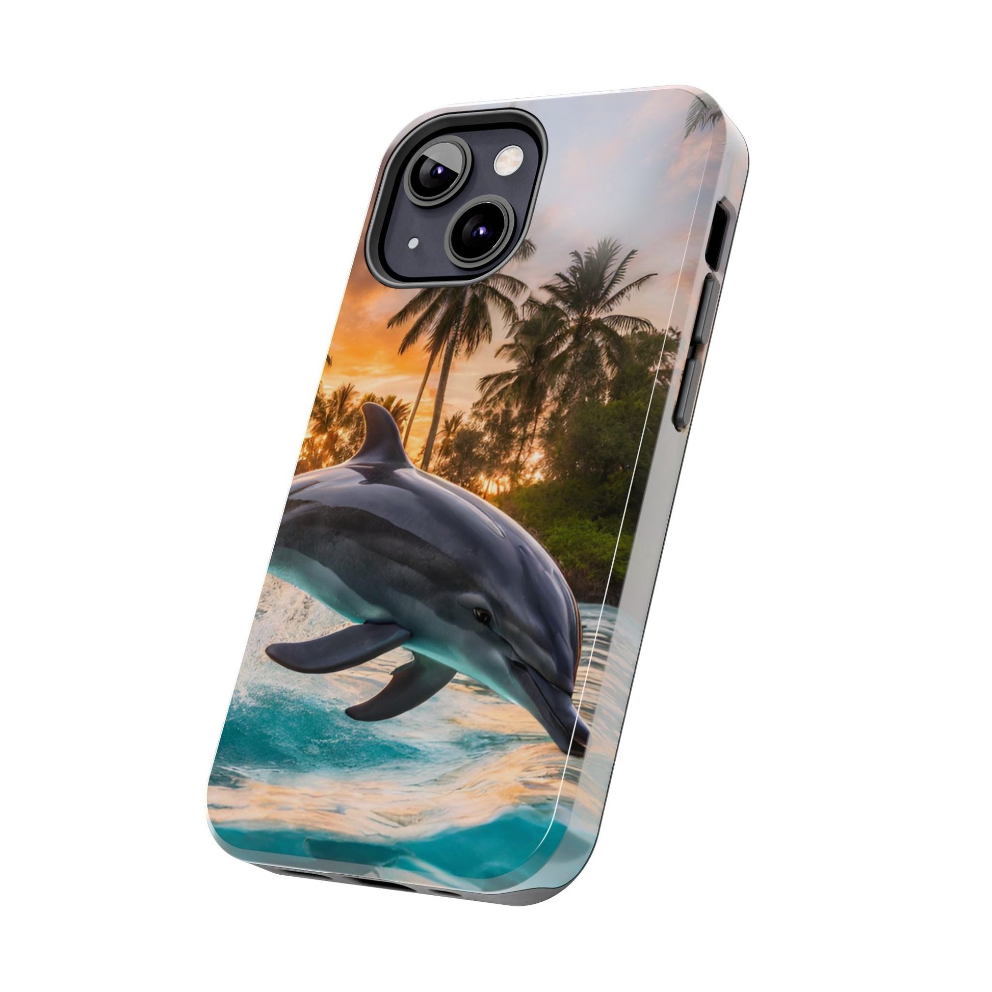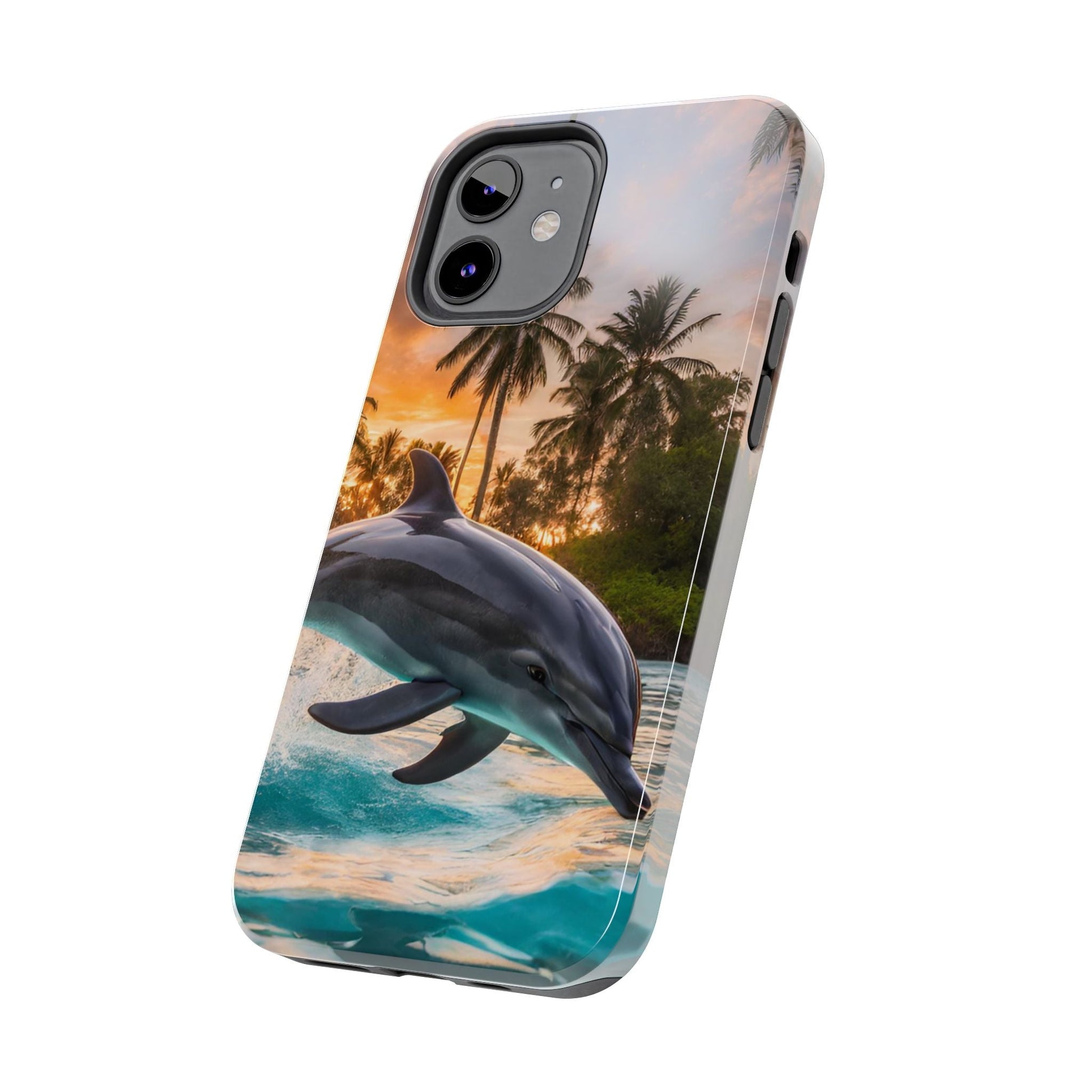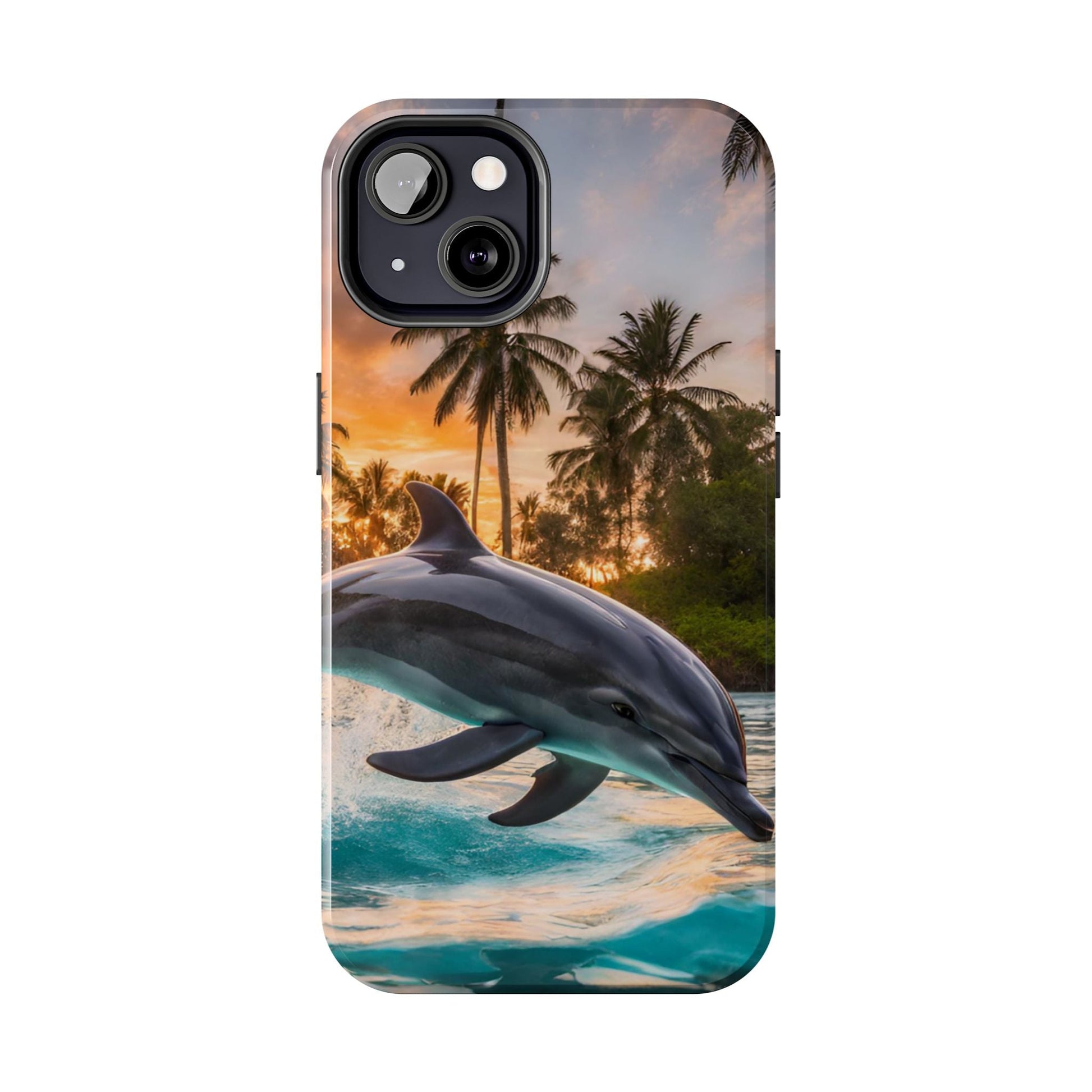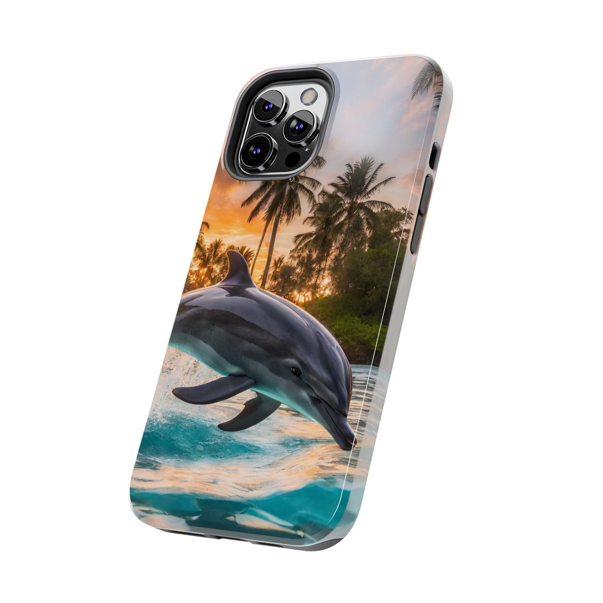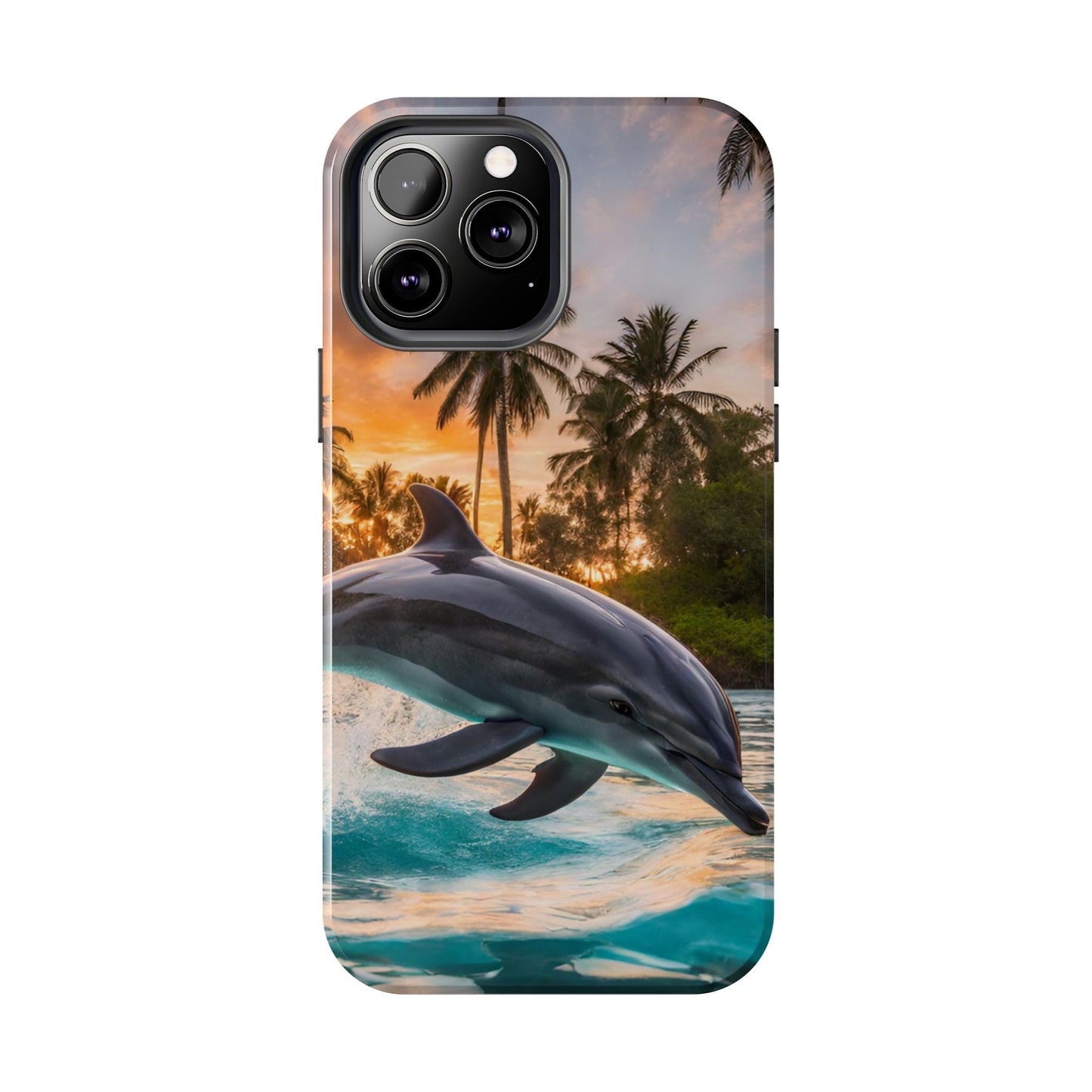 Escape to the tropics with this Tropical Paradise Dolphin iPhone Case! Featuring a majestic dolphin leaping through crystal-clear turquoise waters, surrounded by lush palm trees and a golden sunset, this case is a dream for ocean lovers. The high-resolution print captures every detail, while the shockproof TPU bumper and durable polycarbonate shell keep your phone safe from drops and scratches—so you can bring paradise with you everywhere!