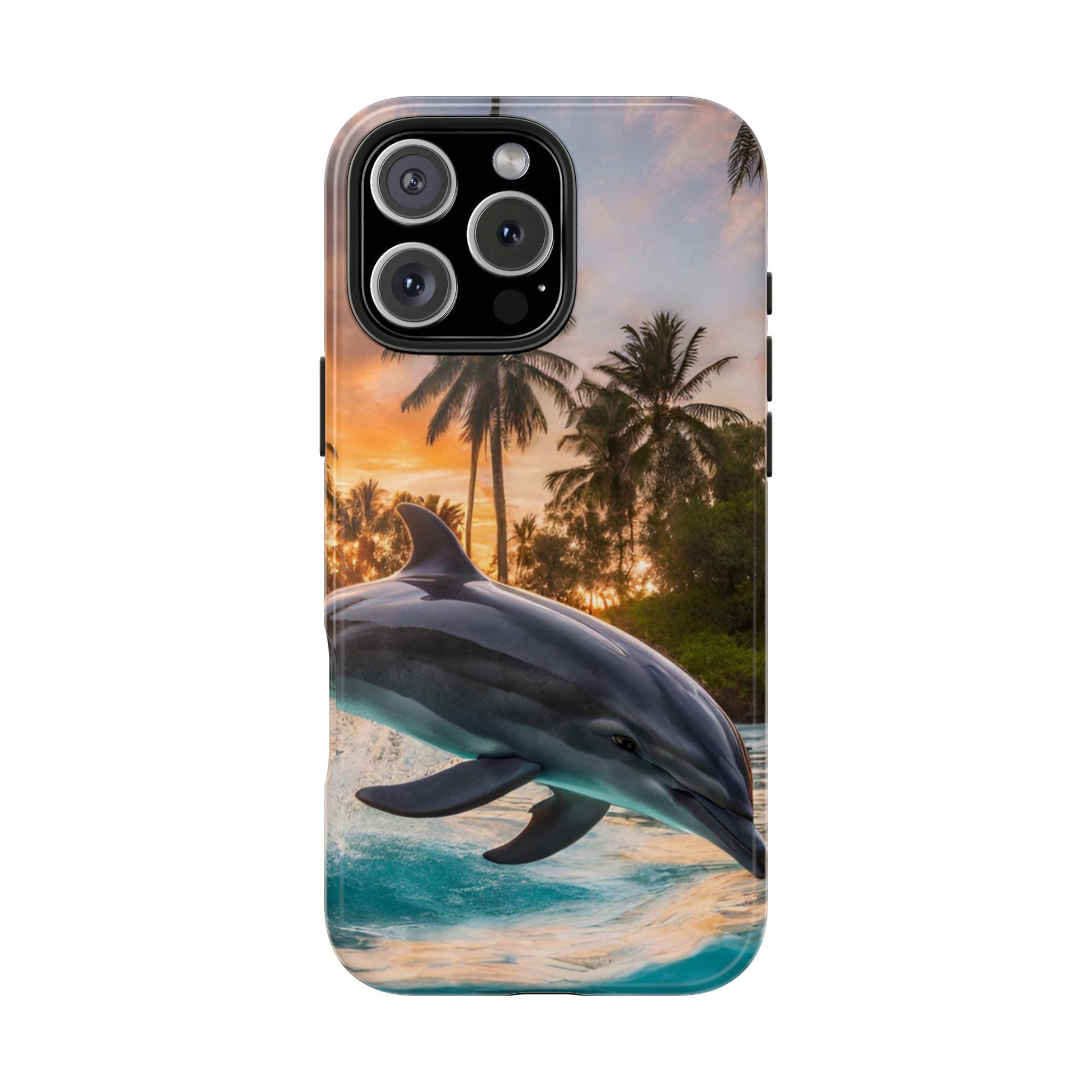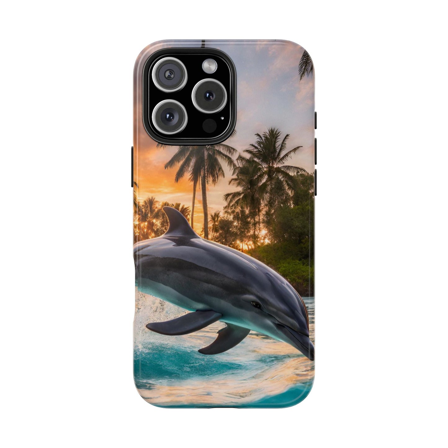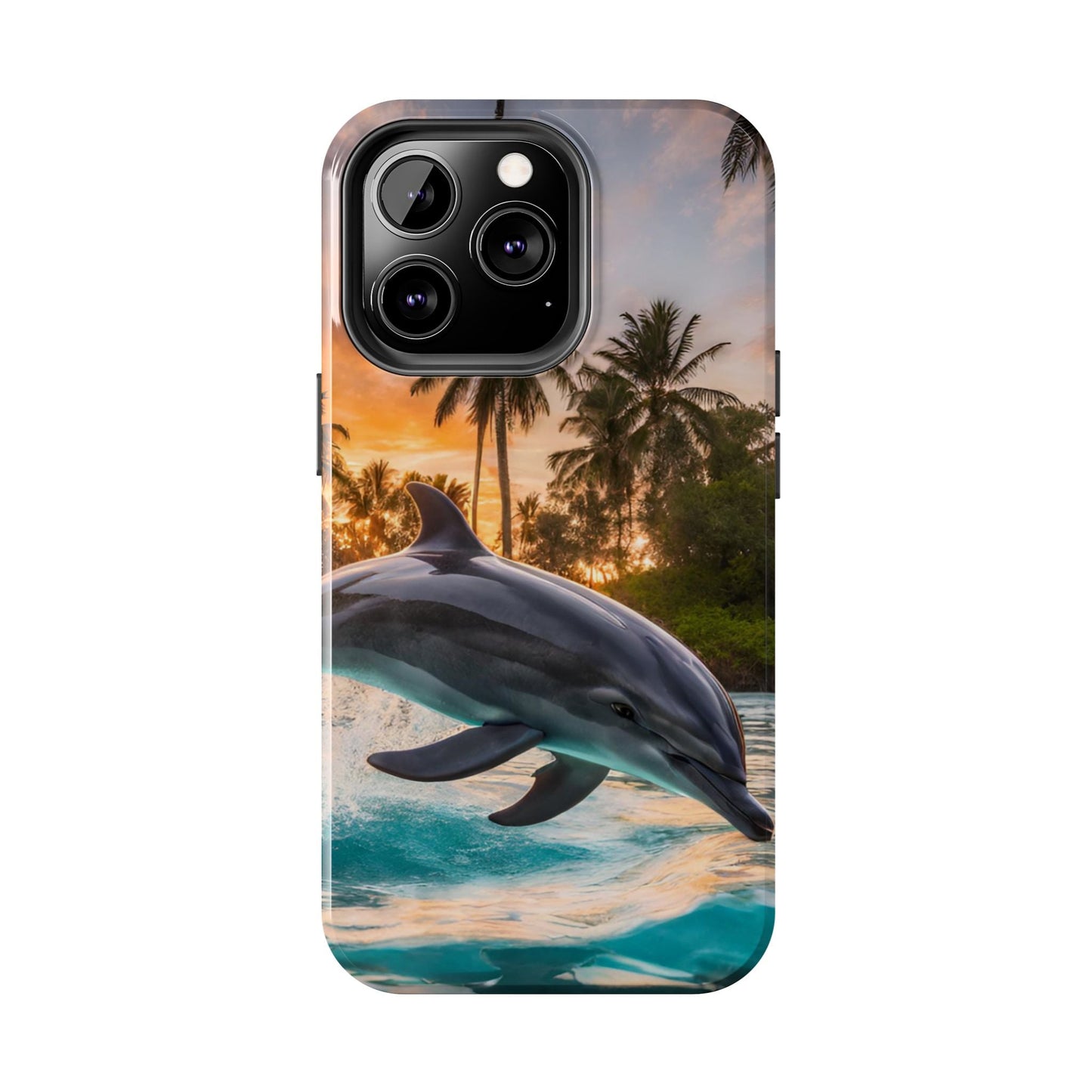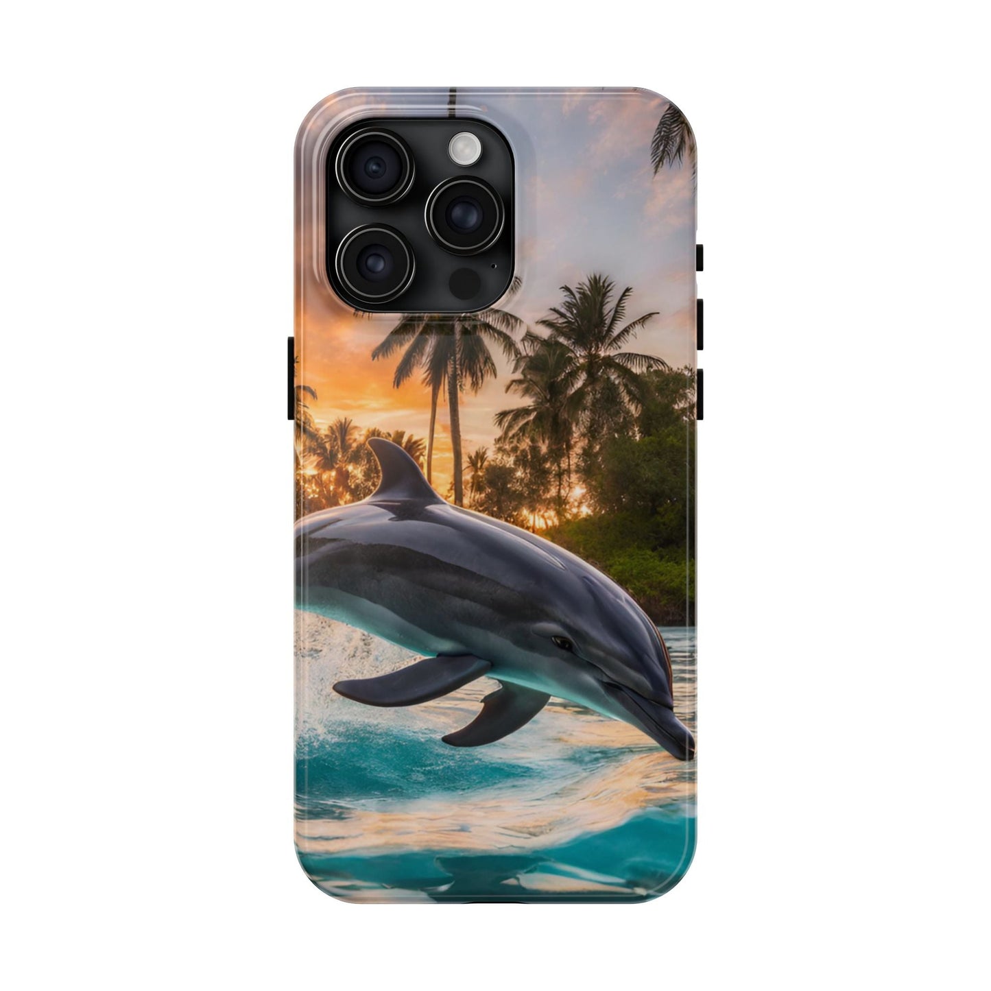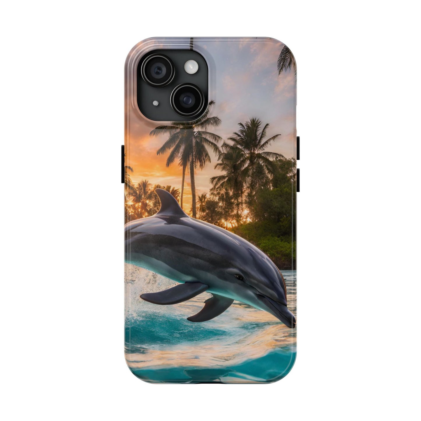 Escape to the tropics with this Tropical Paradise Dolphin iPhone Case! Featuring a majestic dolphin leaping through crystal-clear turquoise waters, surrounded by lush palm trees and a golden sunset, this case is a dream for ocean lovers. The high-resolution print captures every detail, while the shockproof TPU bumper and durable polycarbonate shell keep your phone safe from drops and scratches—so you can bring paradise with you everywhere!