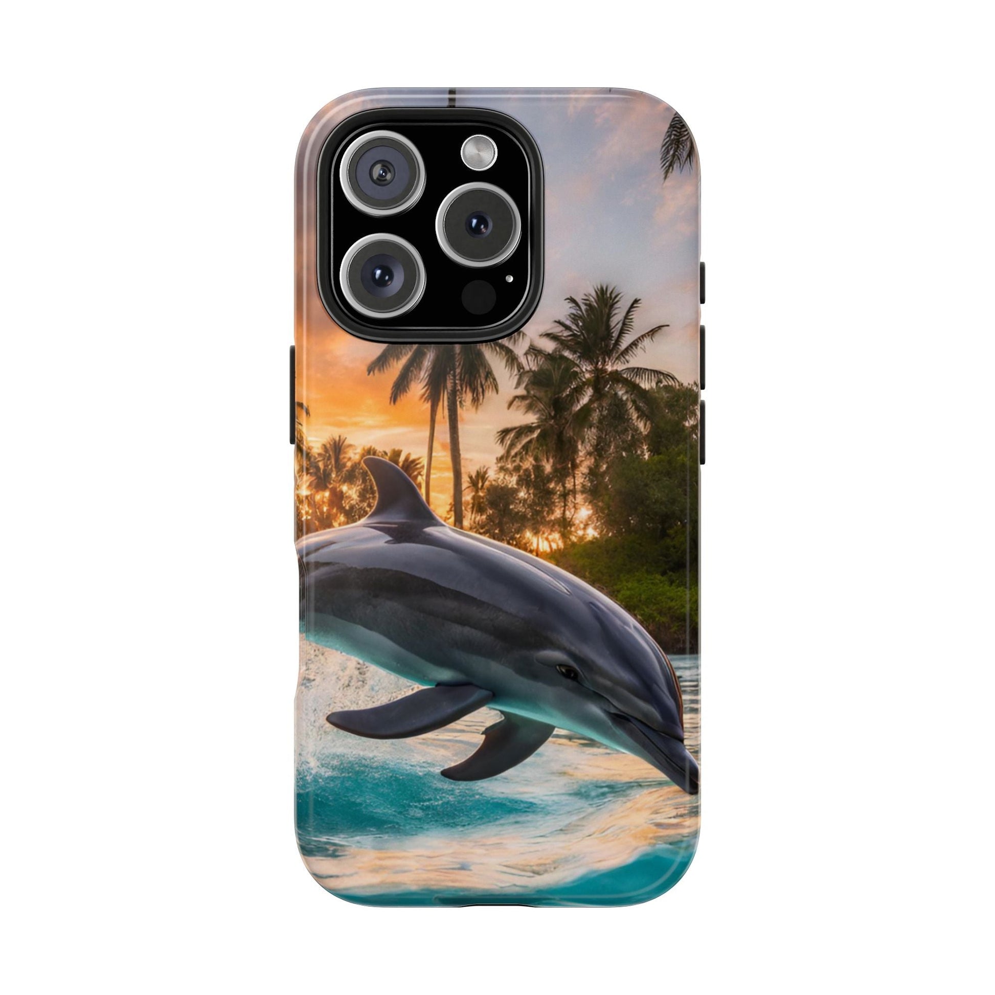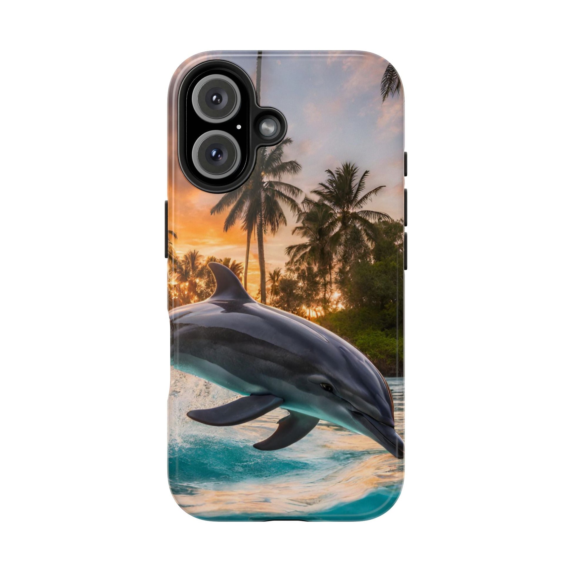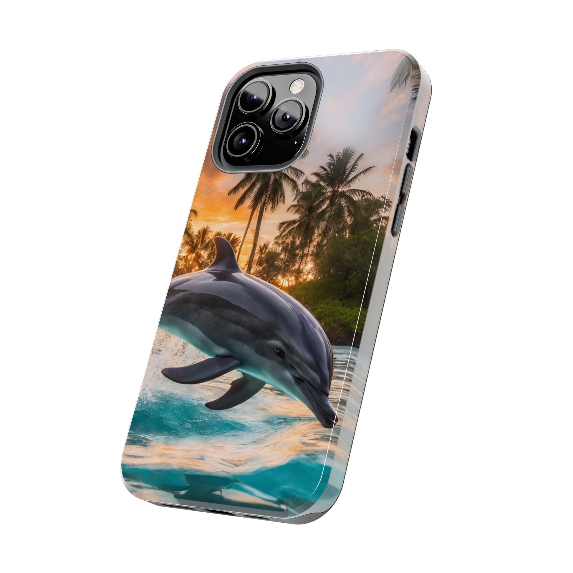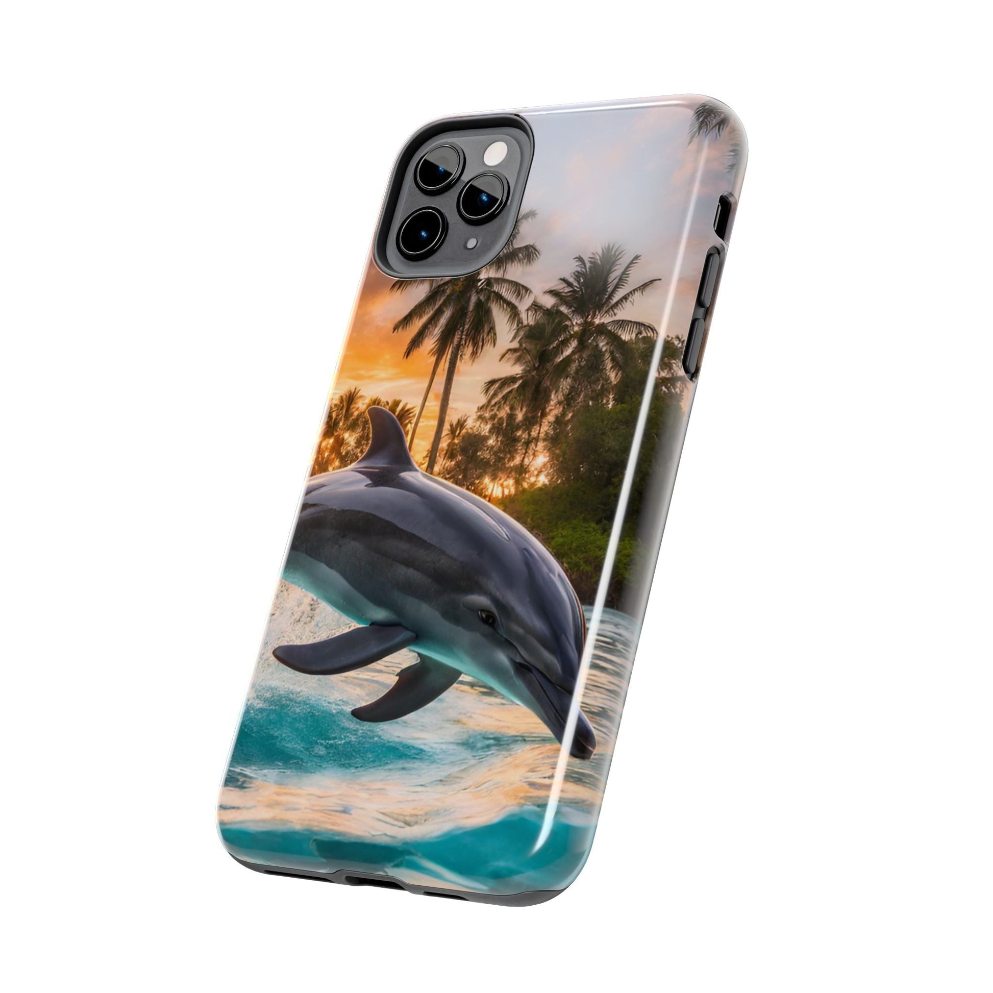 Escape to the tropics with this Tropical Paradise Dolphin iPhone Case! Featuring a majestic dolphin leaping through crystal-clear turquoise waters, surrounded by lush palm trees and a golden sunset, this case is a dream for ocean lovers. The high-resolution print captures every detail, while the shockproof TPU bumper and durable polycarbonate shell keep your phone safe from drops and scratches—so you can bring paradise with you everywhere!