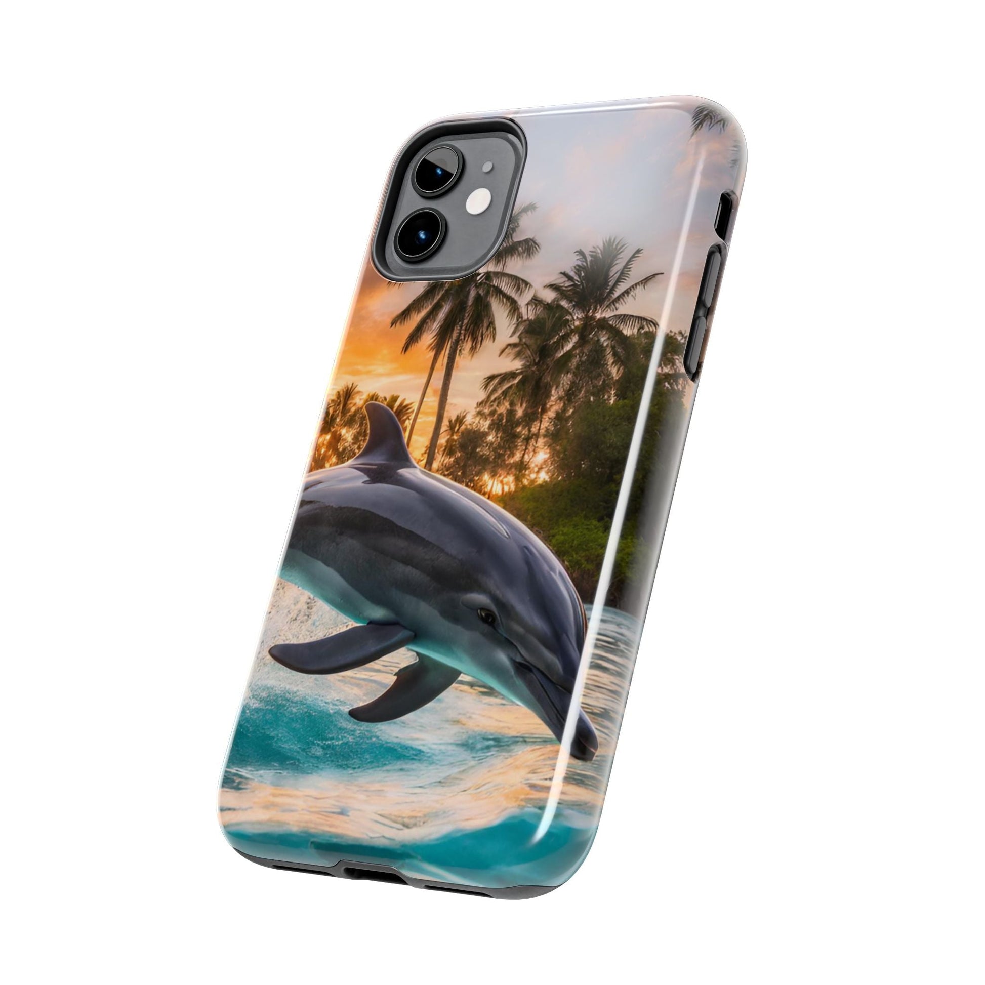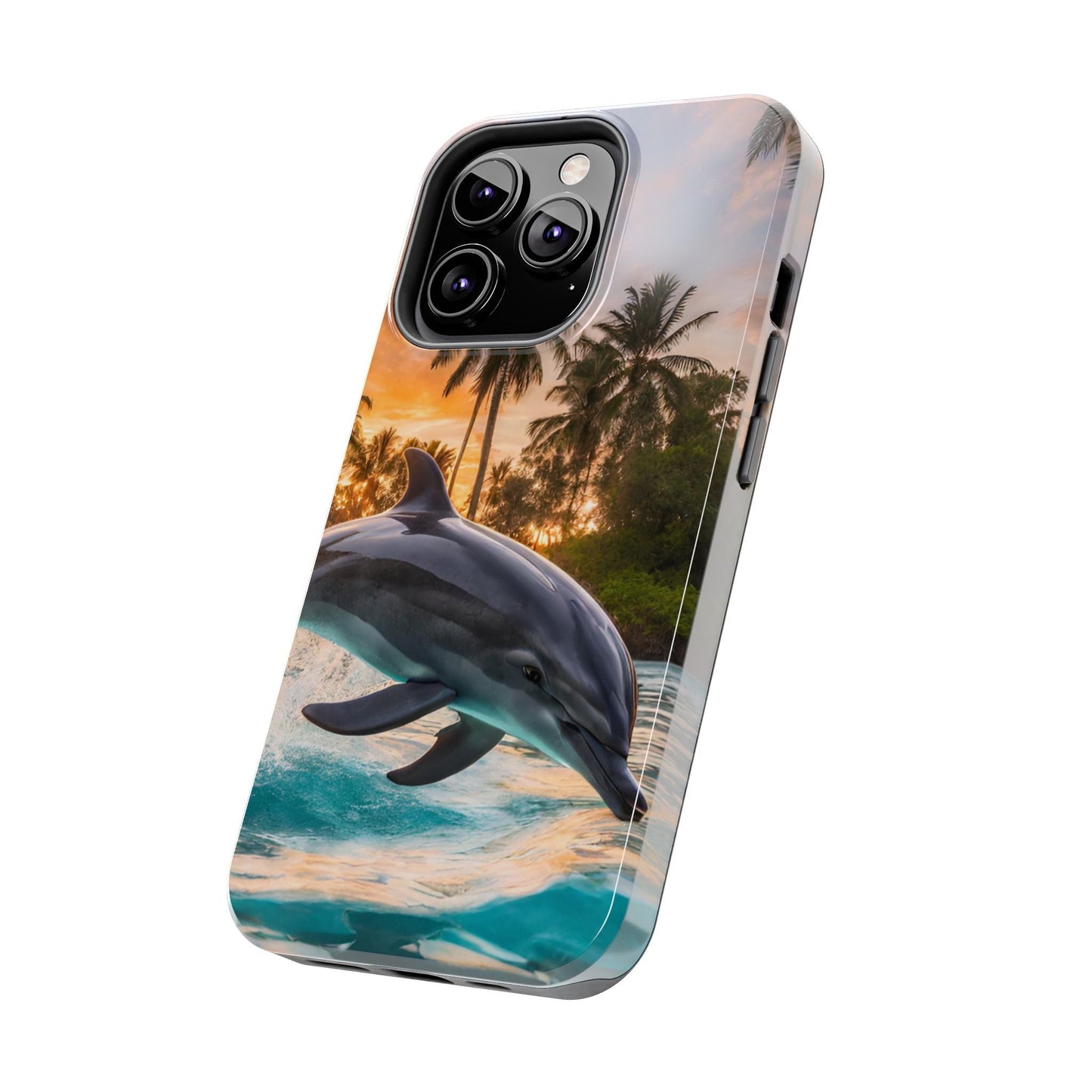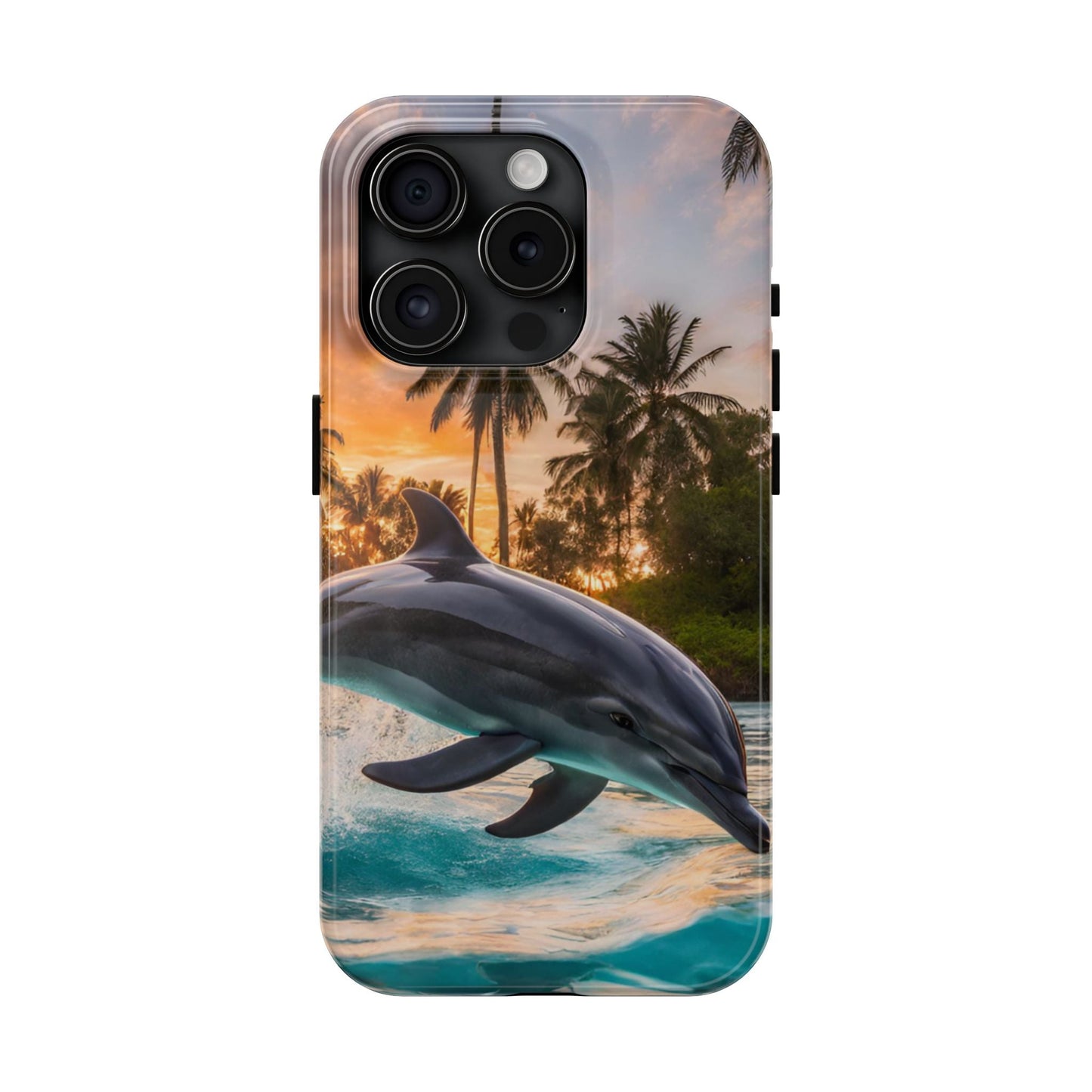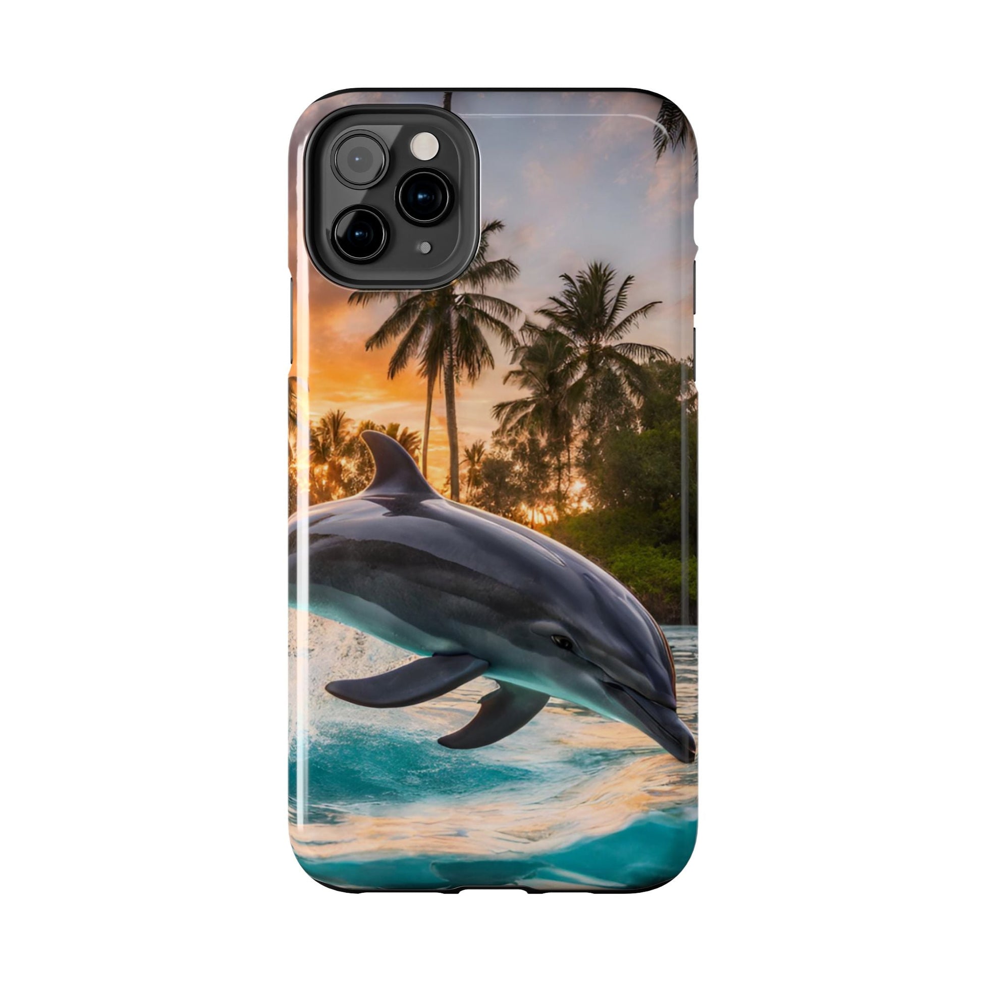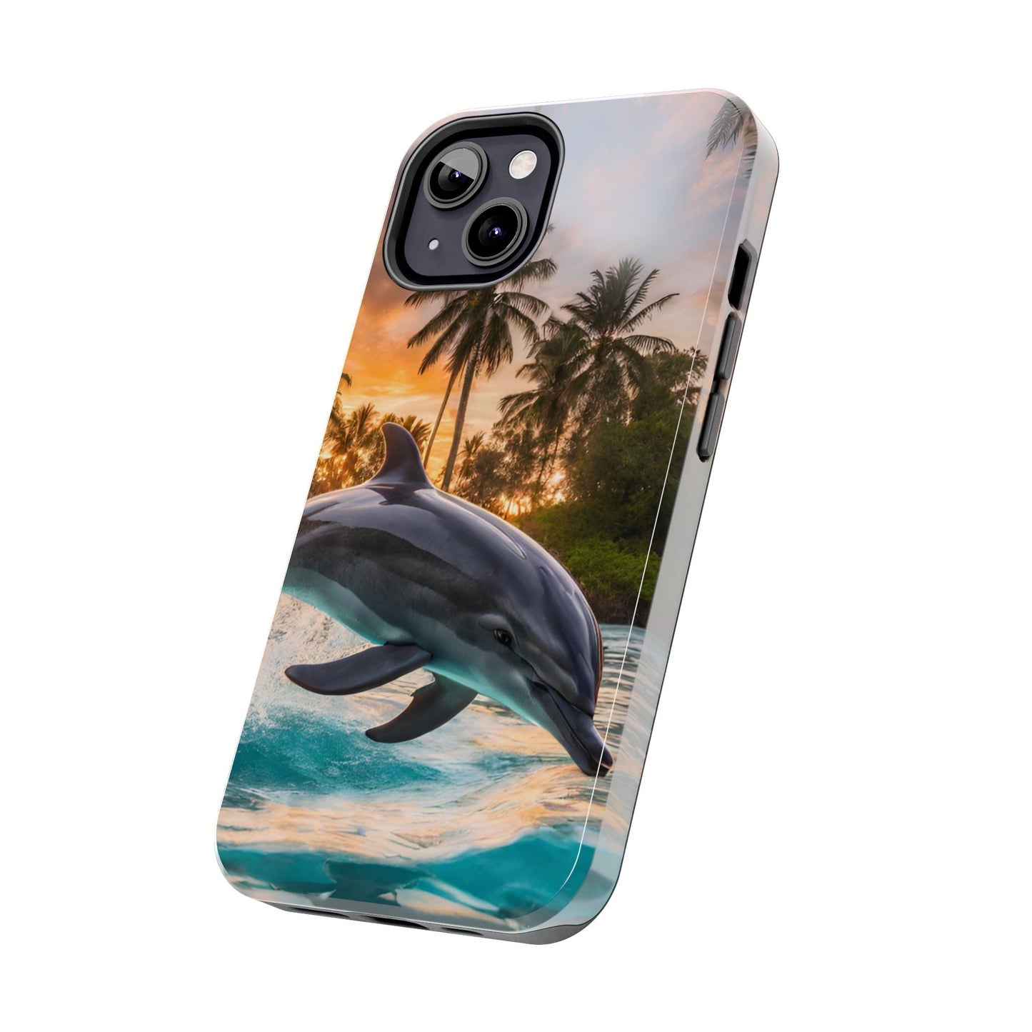 Escape to the tropics with this Tropical Paradise Dolphin iPhone Case! Featuring a majestic dolphin leaping through crystal-clear turquoise waters, surrounded by lush palm trees and a golden sunset, this case is a dream for ocean lovers. The high-resolution print captures every detail, while the shockproof TPU bumper and durable polycarbonate shell keep your phone safe from drops and scratches—so you can bring paradise with you everywhere!