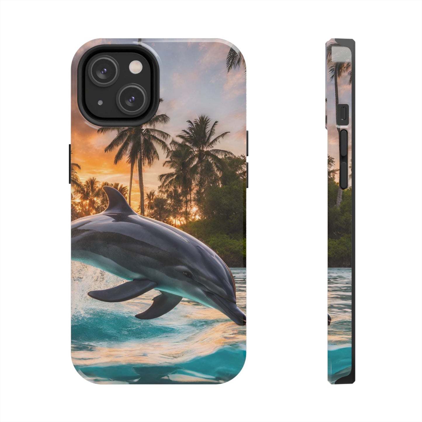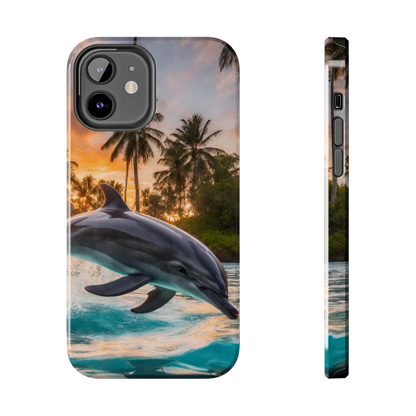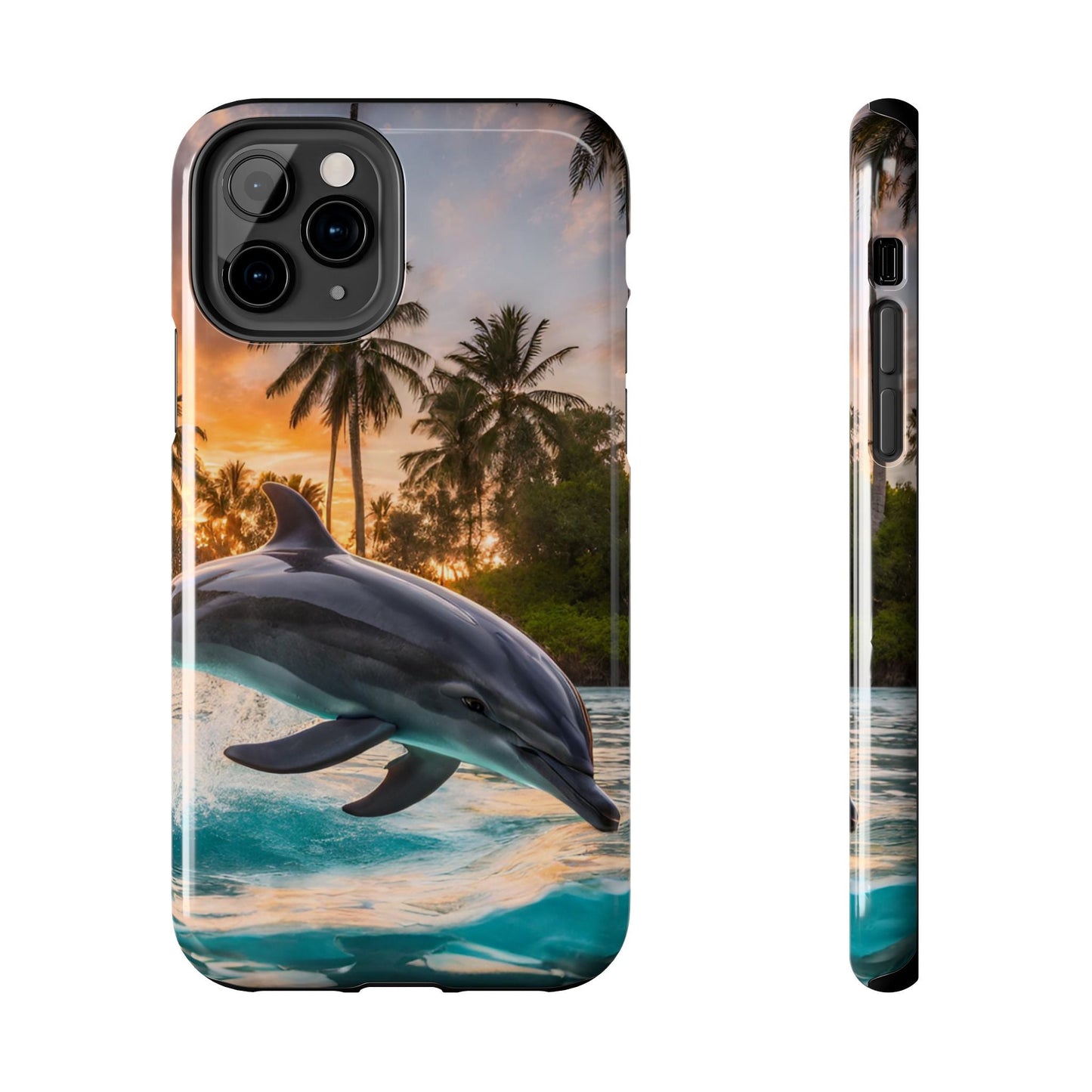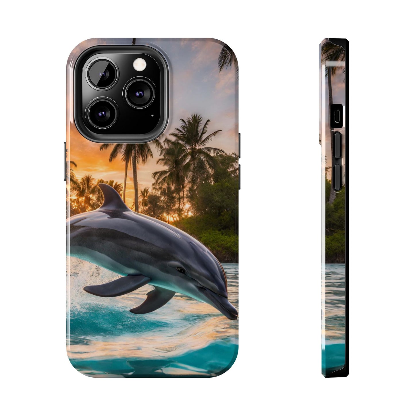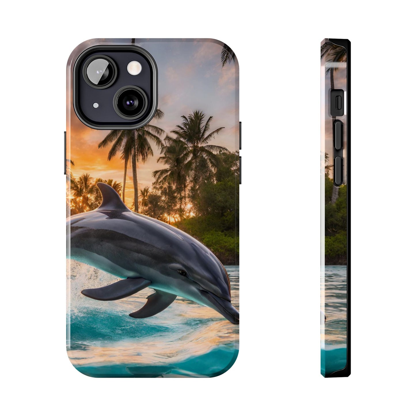 Escape to the tropics with this Tropical Paradise Dolphin iPhone Case! Featuring a majestic dolphin leaping through crystal-clear turquoise waters, surrounded by lush palm trees and a golden sunset, this case is a dream for ocean lovers. The high-resolution print captures every detail, while the shockproof TPU bumper and durable polycarbonate shell keep your phone safe from drops and scratches—so you can bring paradise with you everywhere!