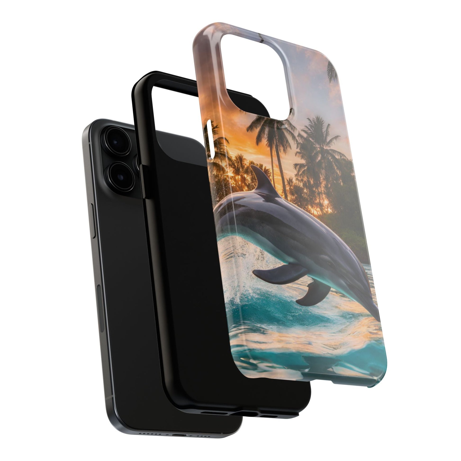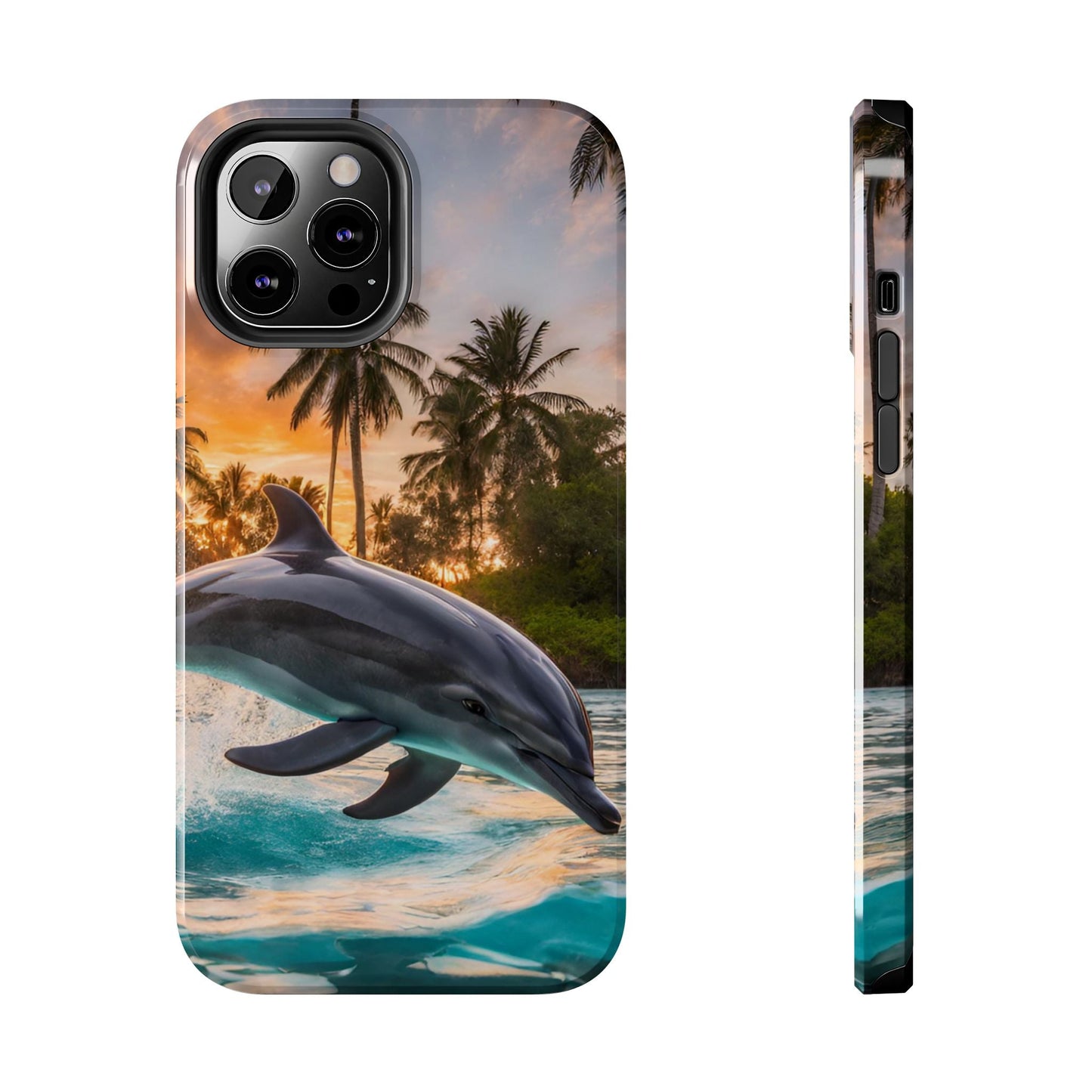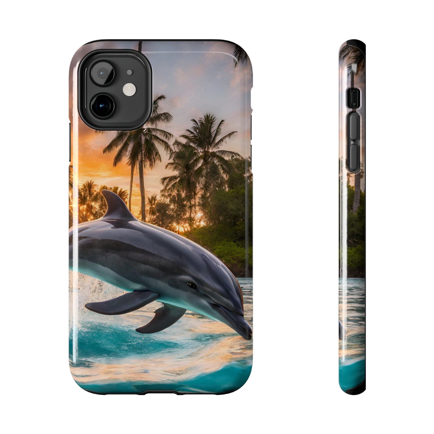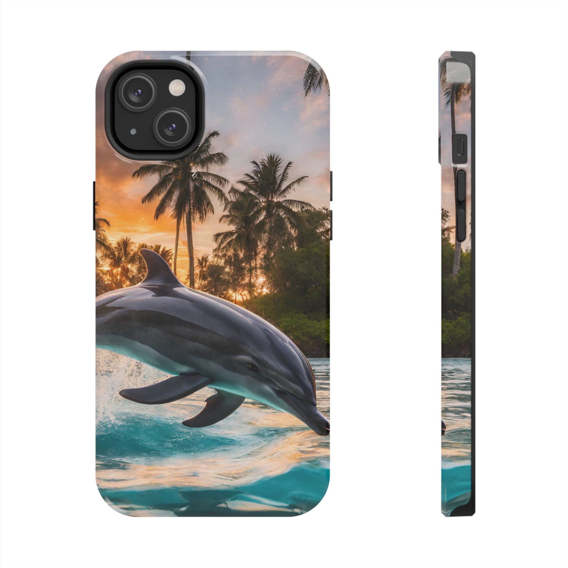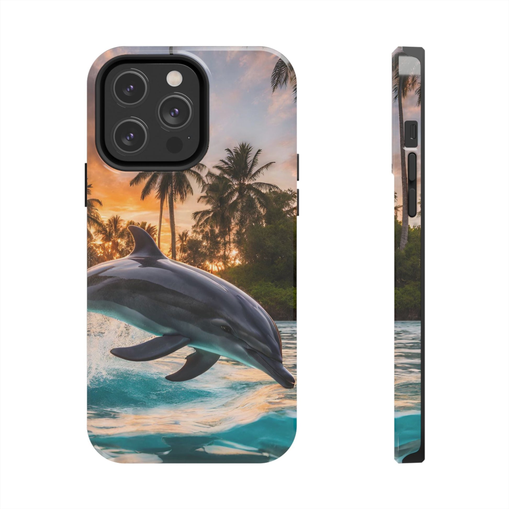 Escape to the tropics with this Tropical Paradise Dolphin iPhone Case! Featuring a majestic dolphin leaping through crystal-clear turquoise waters, surrounded by lush palm trees and a golden sunset, this case is a dream for ocean lovers. The high-resolution print captures every detail, while the shockproof TPU bumper and durable polycarbonate shell keep your phone safe from drops and scratches—so you can bring paradise with you everywhere!