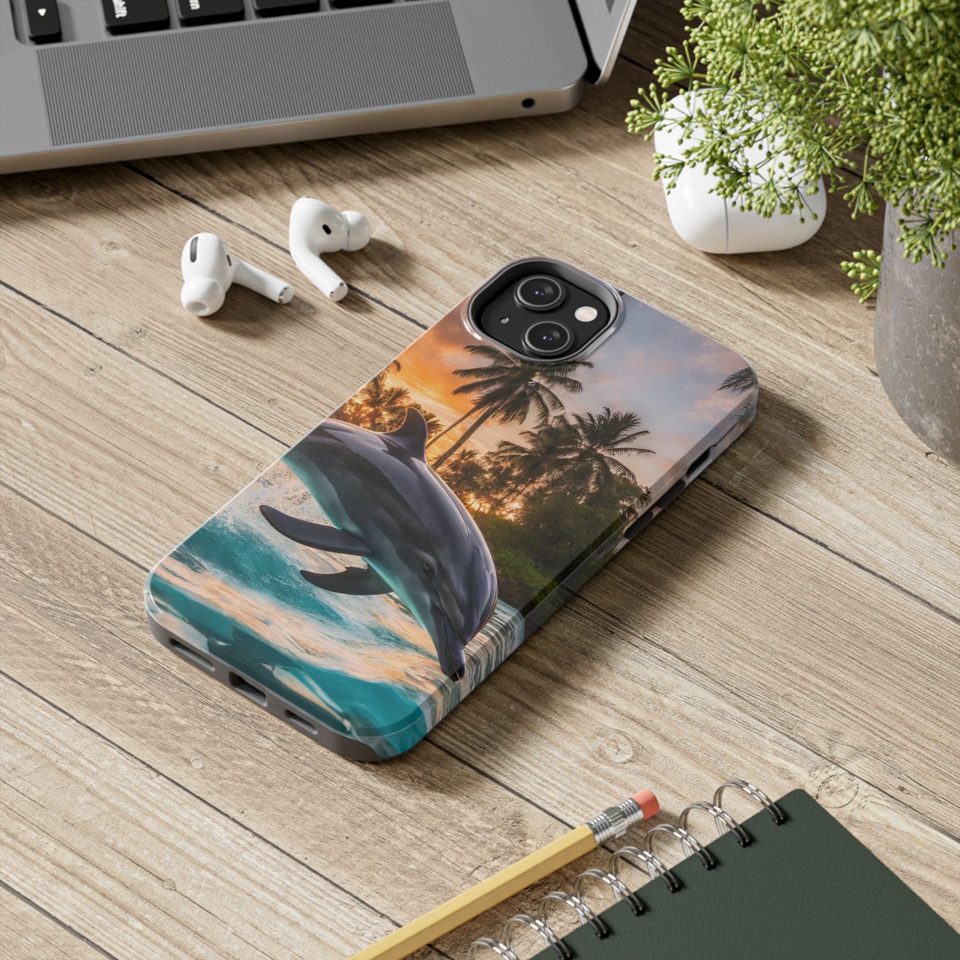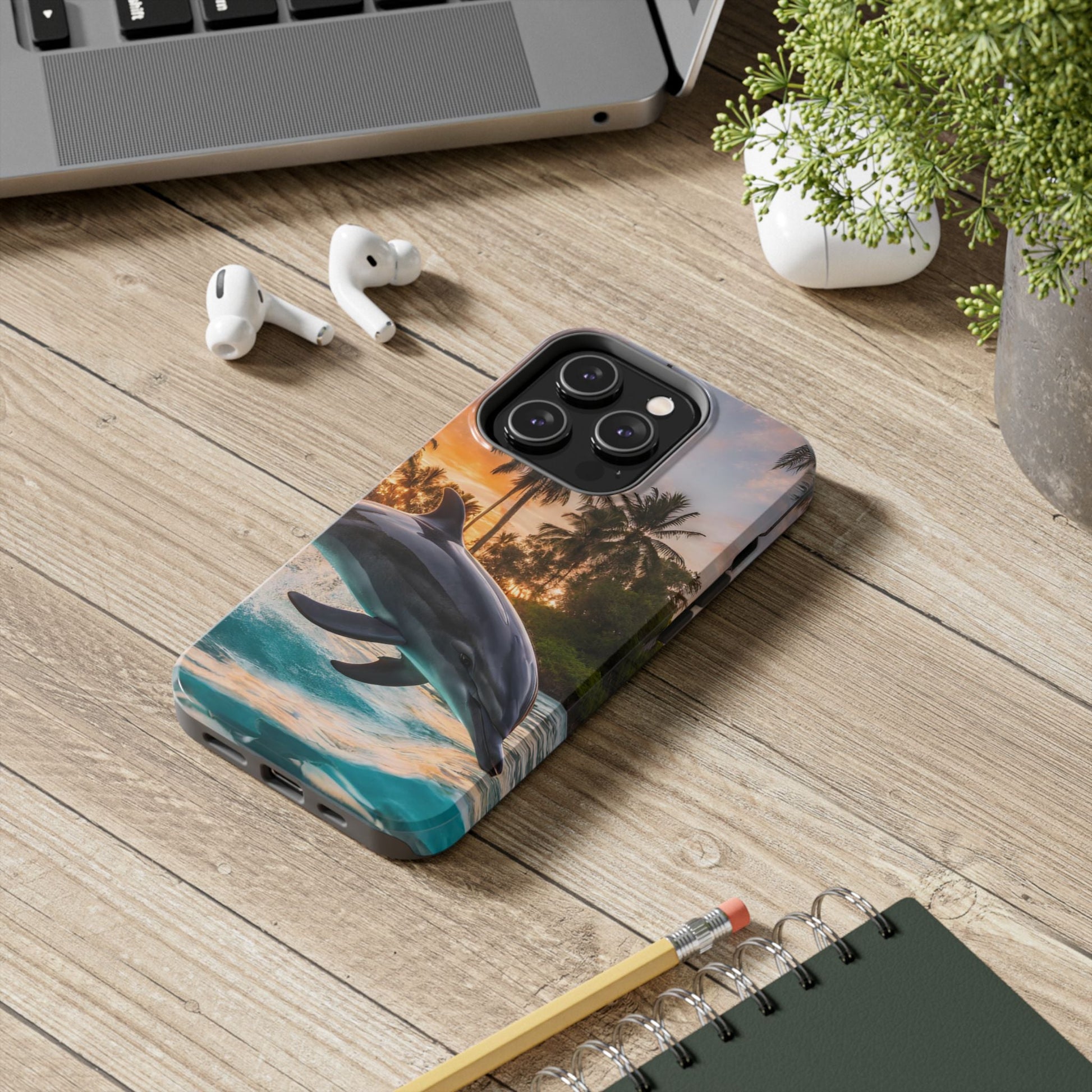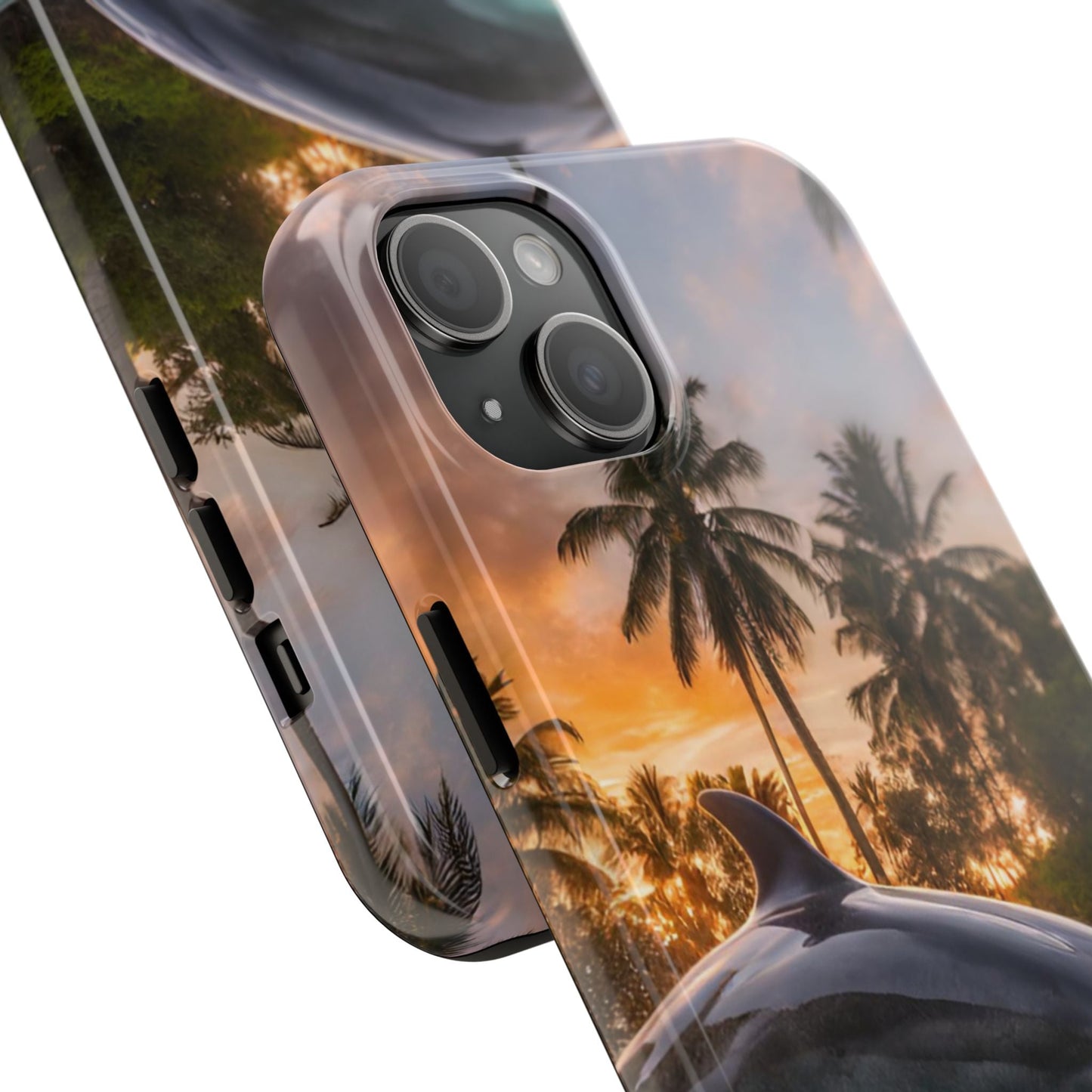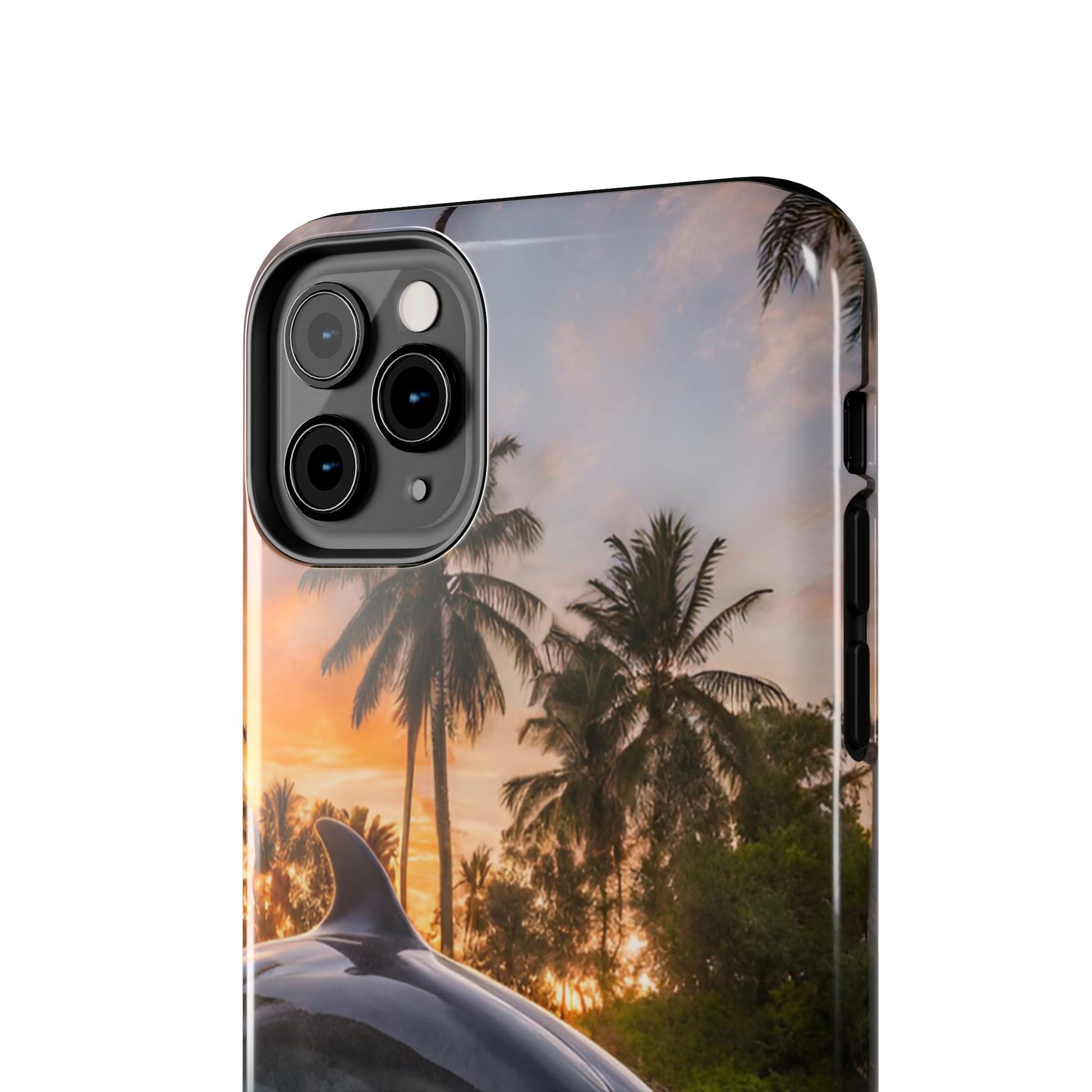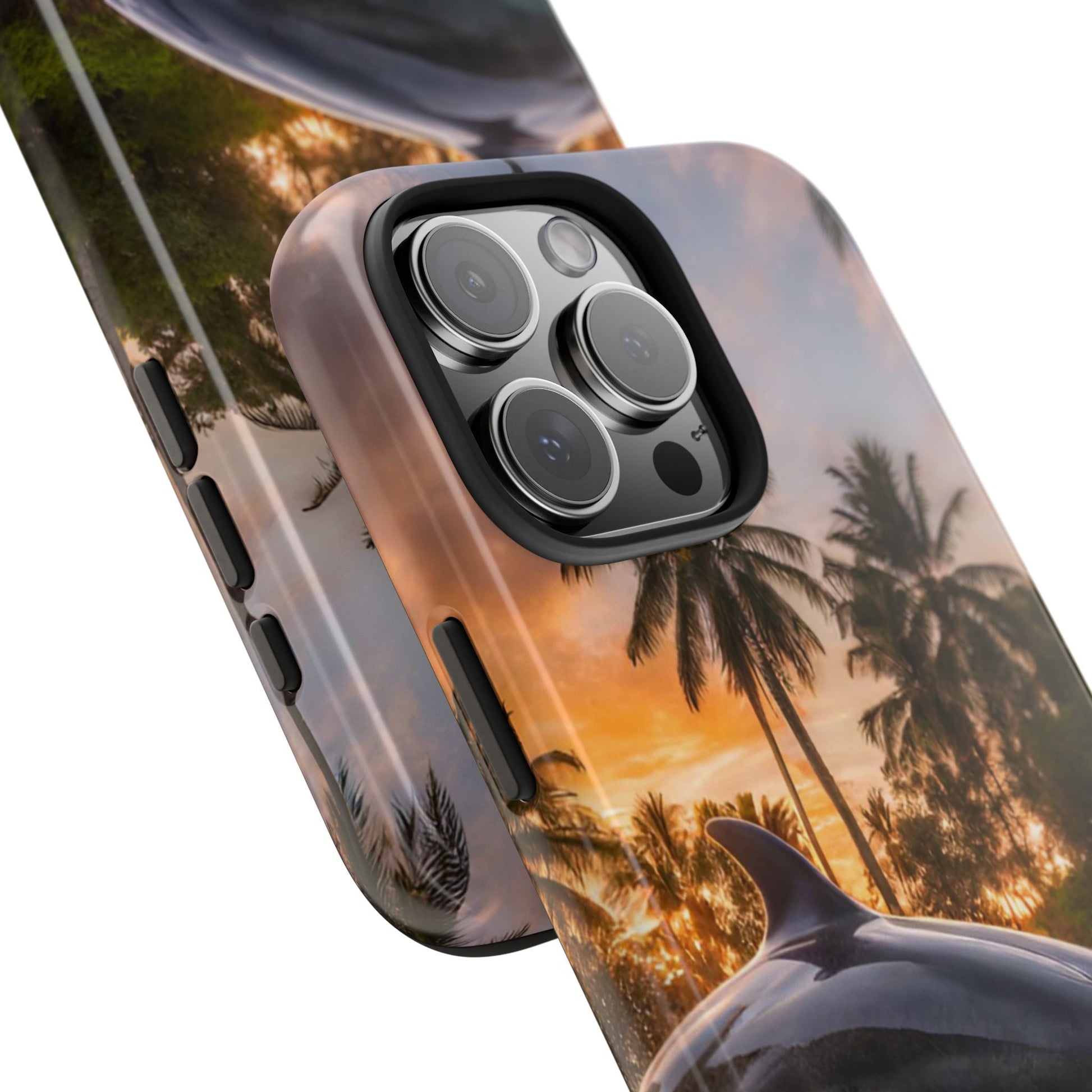 Escape to the tropics with this Tropical Paradise Dolphin iPhone Case! Featuring a majestic dolphin leaping through crystal-clear turquoise waters, surrounded by lush palm trees and a golden sunset, this case is a dream for ocean lovers. The high-resolution print captures every detail, while the shockproof TPU bumper and durable polycarbonate shell keep your phone safe from drops and scratches—so you can bring paradise with you everywhere!