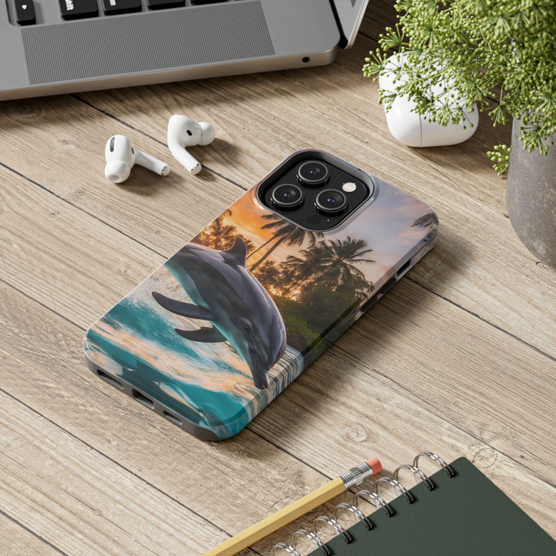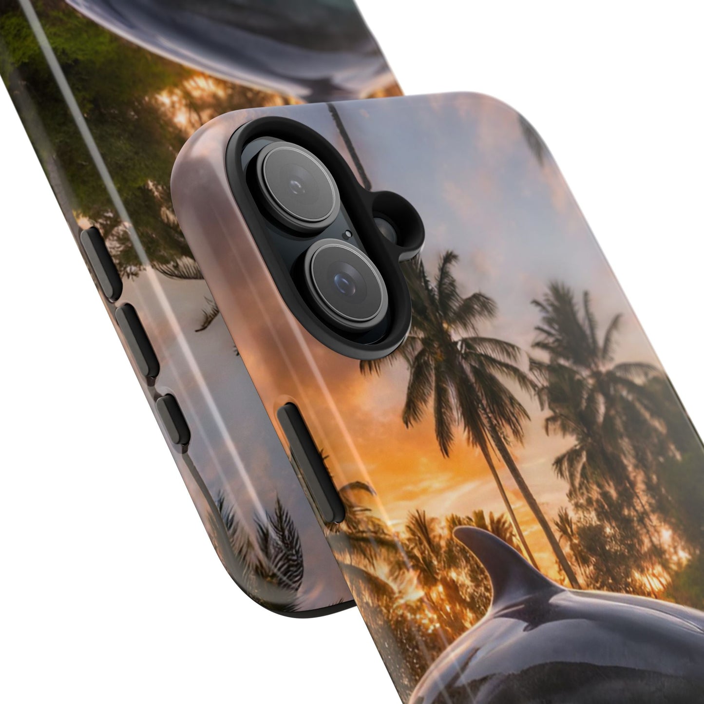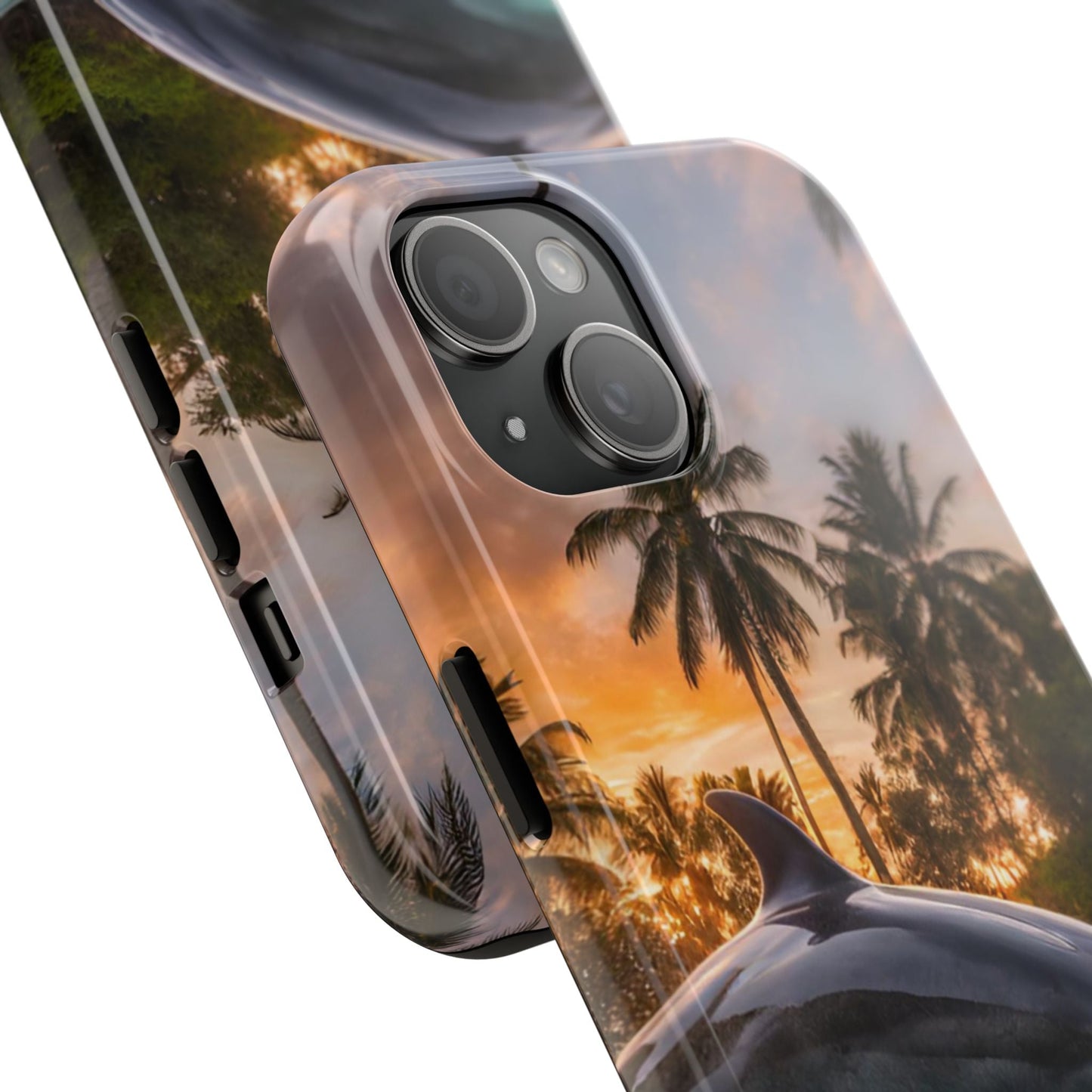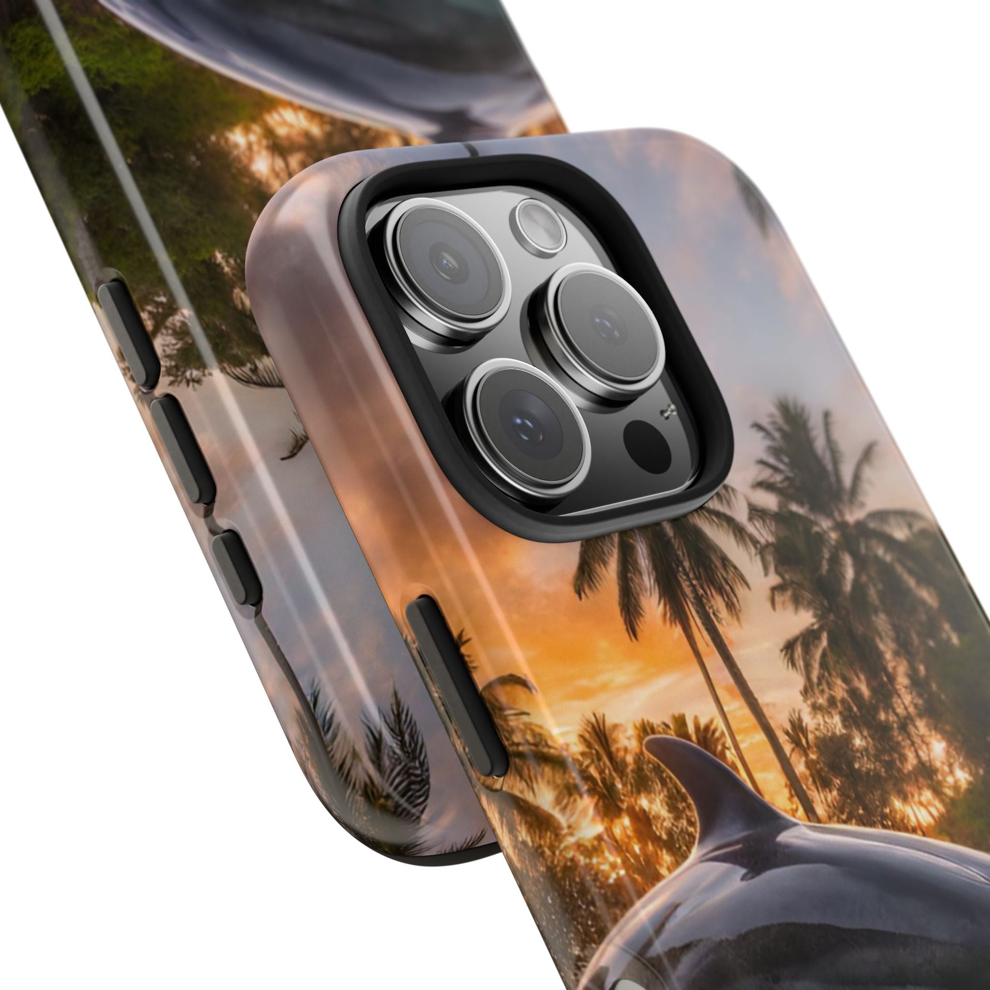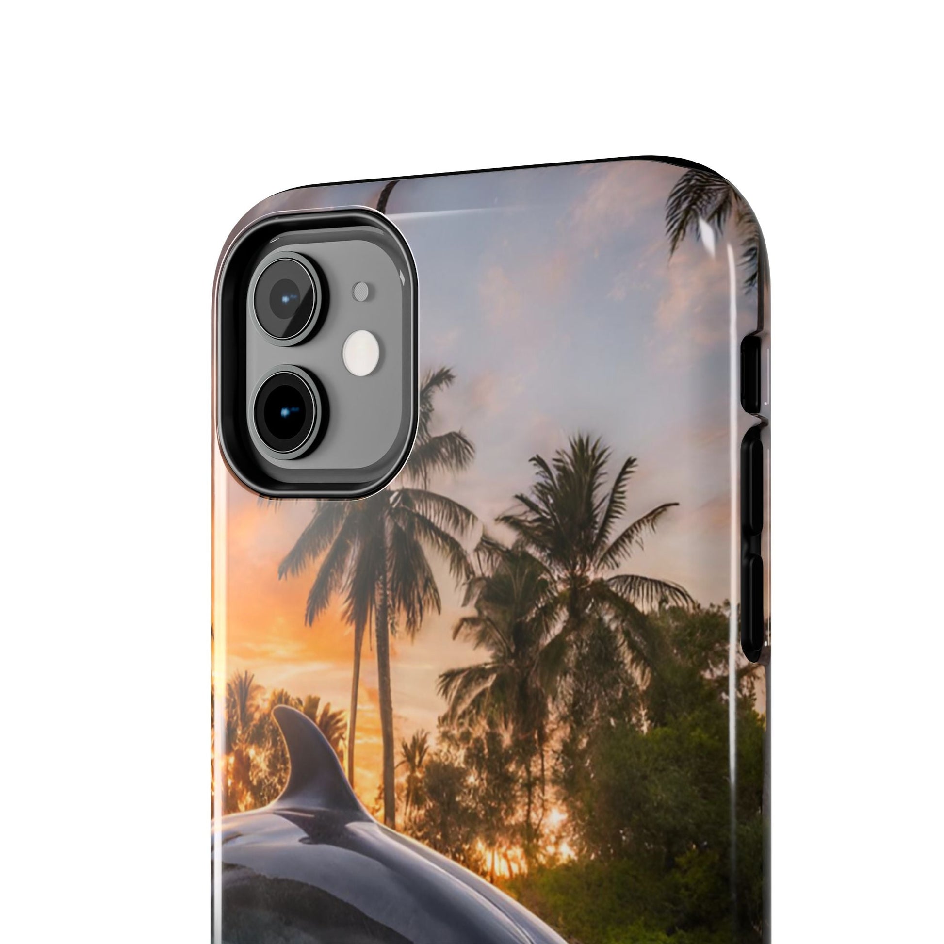 Escape to the tropics with this Tropical Paradise Dolphin iPhone Case! Featuring a majestic dolphin leaping through crystal-clear turquoise waters, surrounded by lush palm trees and a golden sunset, this case is a dream for ocean lovers. The high-resolution print captures every detail, while the shockproof TPU bumper and durable polycarbonate shell keep your phone safe from drops and scratches—so you can bring paradise with you everywhere!