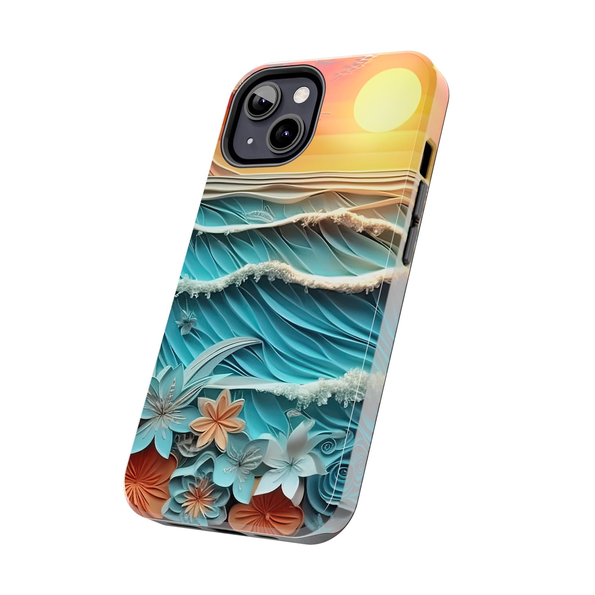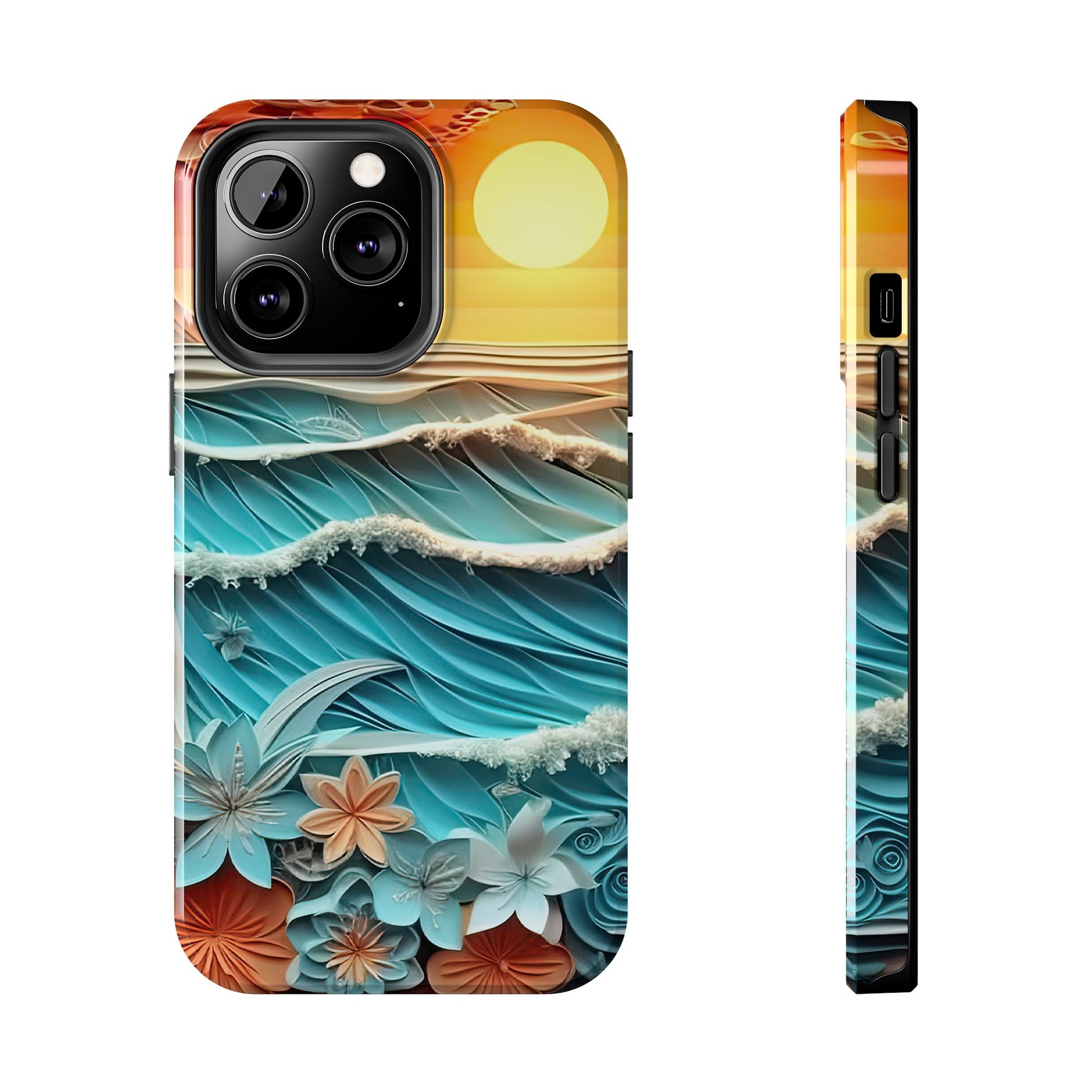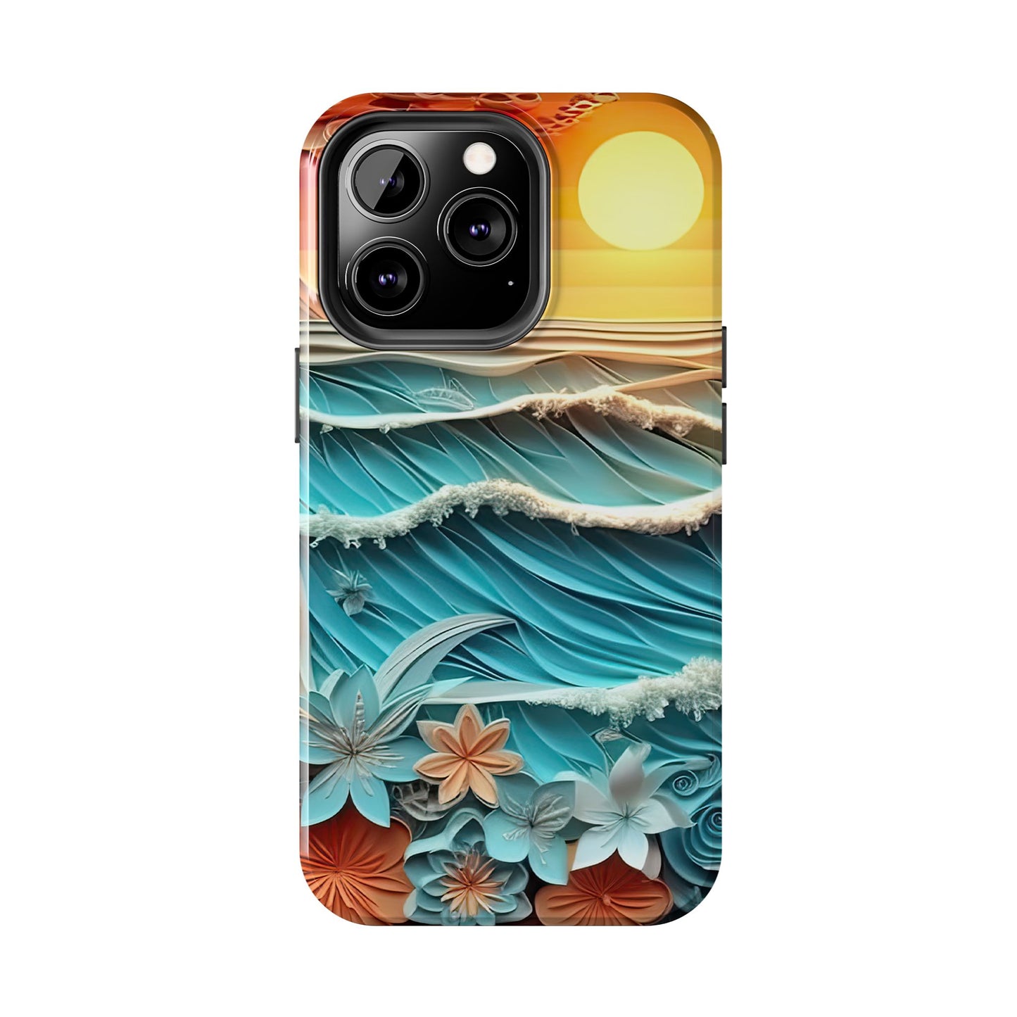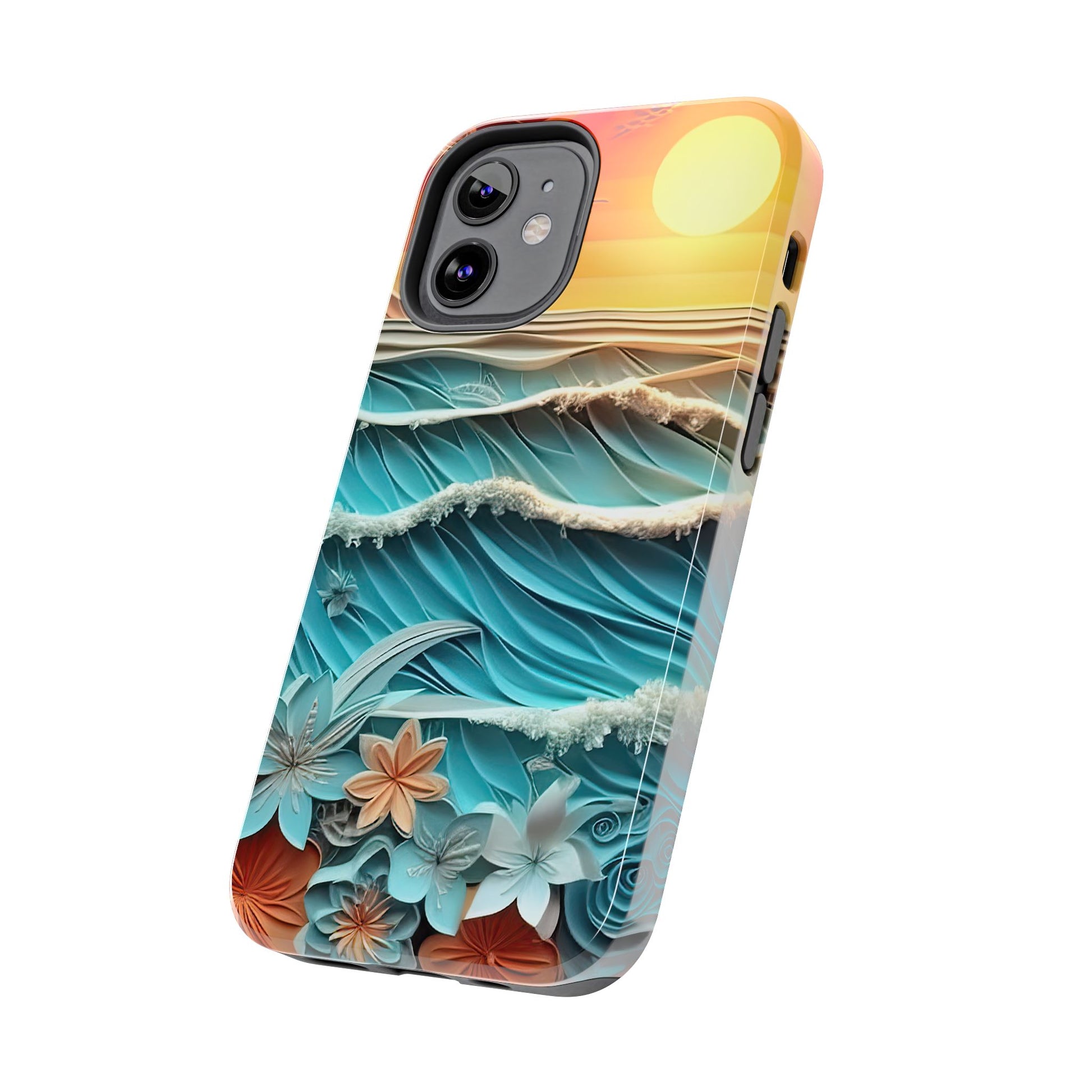 Add a touch of artistry to your phone with our Tropical Sunset Paper Art Ocean iPhone Case, perfect for beach lovers and art enthusiasts alike. This unique design features a beautifully layered paper art scene of a serene ocean with rolling waves, pastel flowers, and a warm sunset glowing over the horizon. The intricate details in soft blue, coral, and sandy beige hues bring a peaceful coastal vibe that’s both elegant and eye-catching. Crafted from premium, impact-resistant materials, this case offers reliable protection while showcasing an exquisite art piece in your hand.