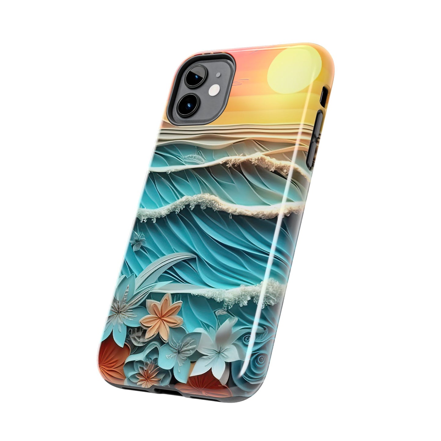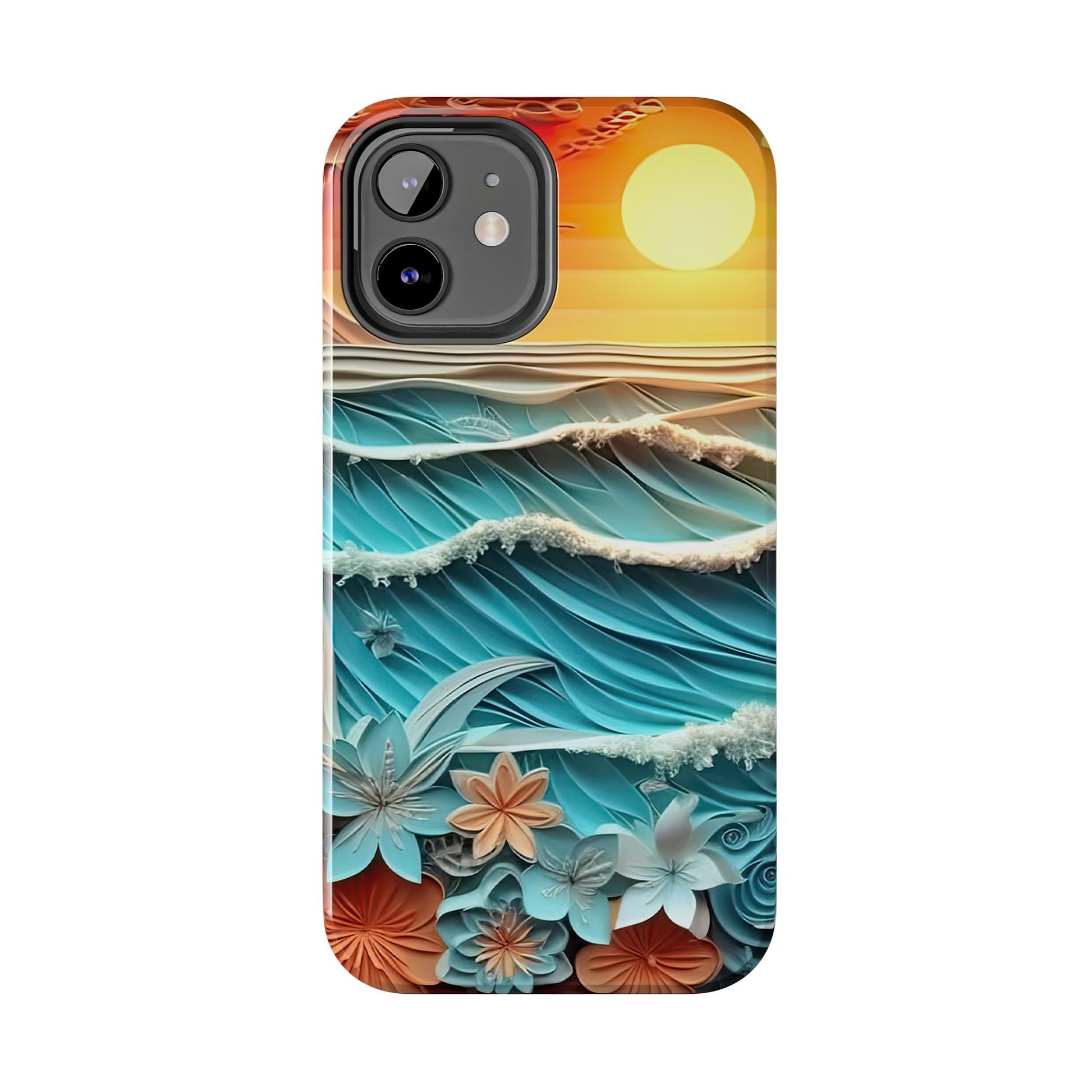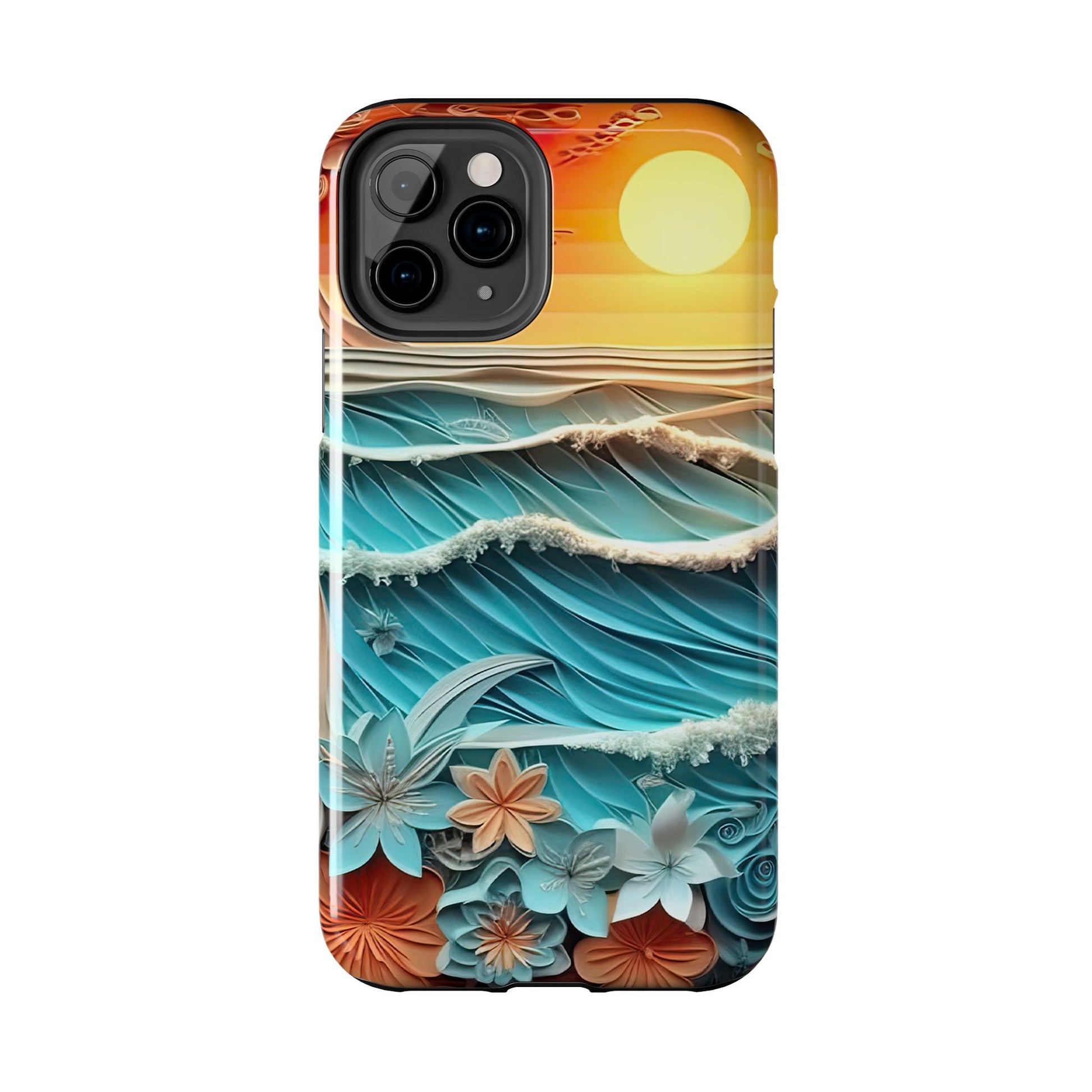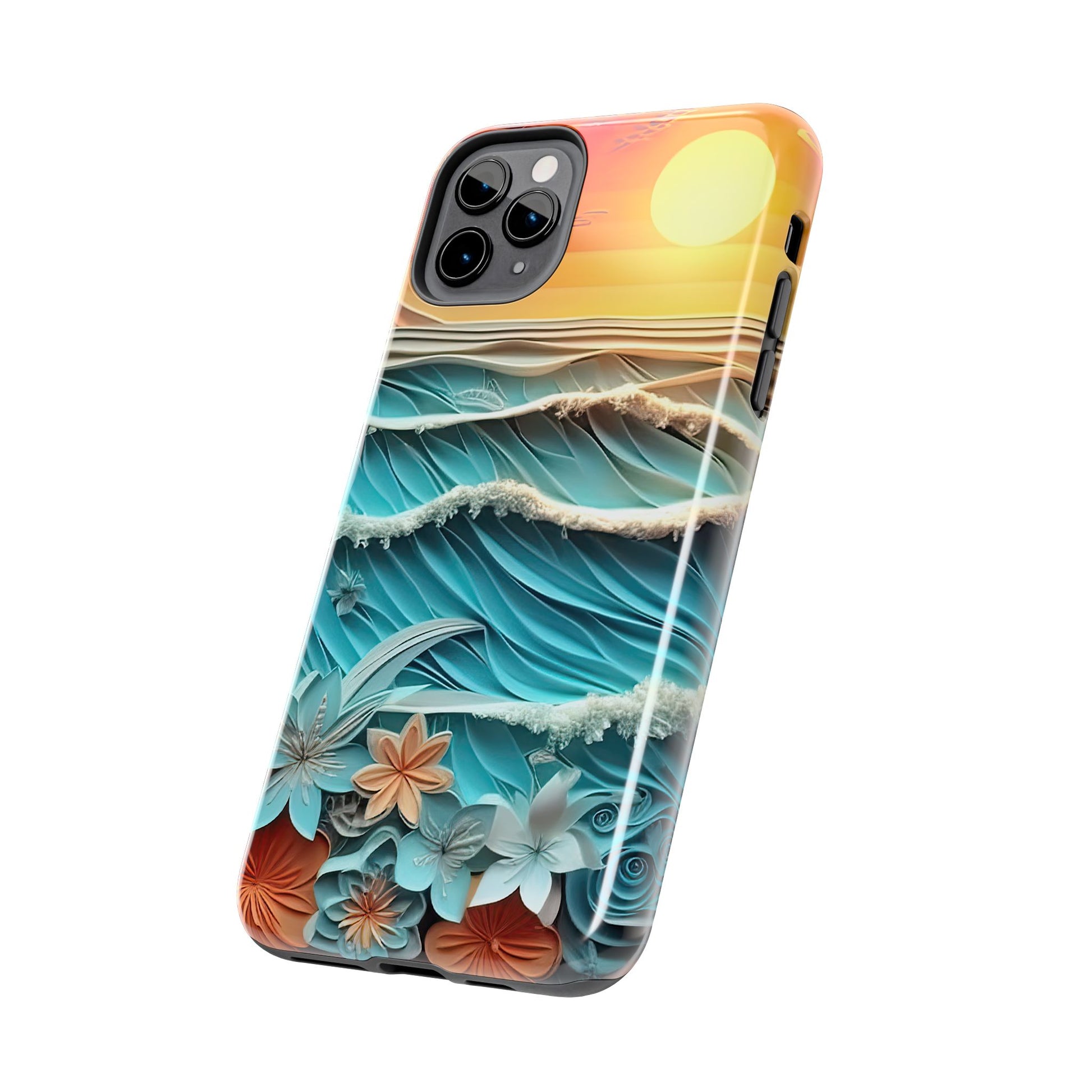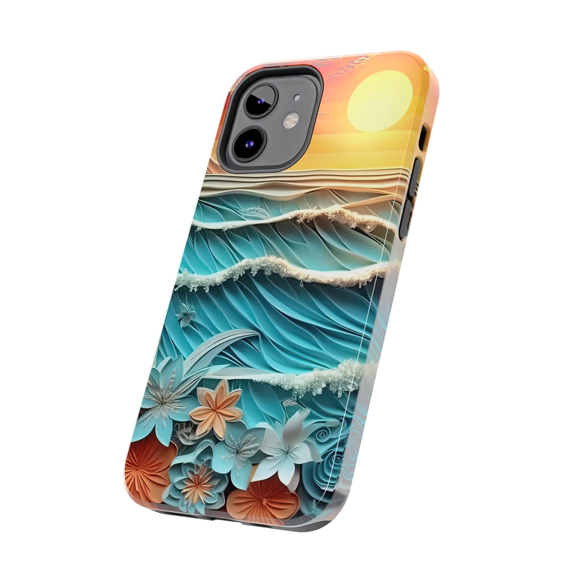 Add a touch of artistry to your phone with our Tropical Sunset Paper Art Ocean iPhone Case, perfect for beach lovers and art enthusiasts alike. This unique design features a beautifully layered paper art scene of a serene ocean with rolling waves, pastel flowers, and a warm sunset glowing over the horizon. The intricate details in soft blue, coral, and sandy beige hues bring a peaceful coastal vibe that’s both elegant and eye-catching. Crafted from premium, impact-resistant materials, this case offers reliable protection while showcasing an exquisite art piece in your hand.