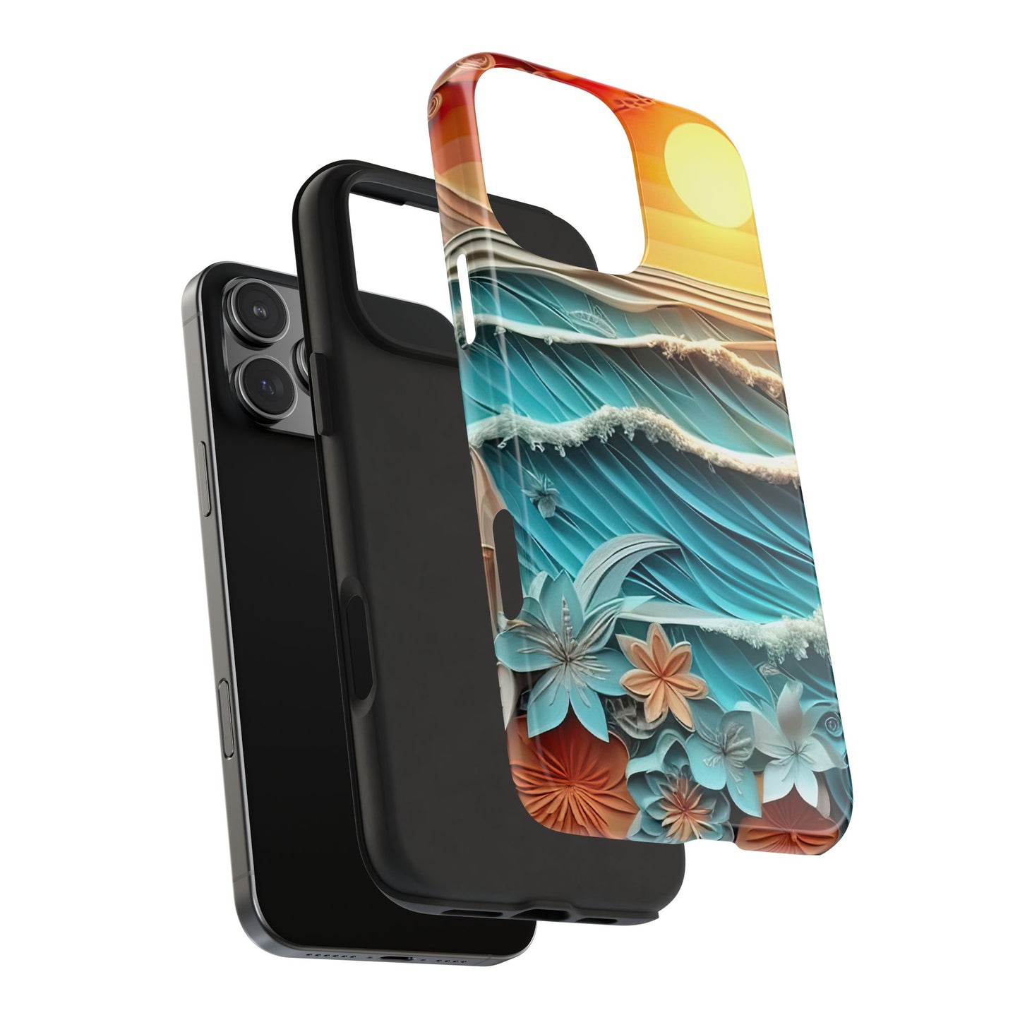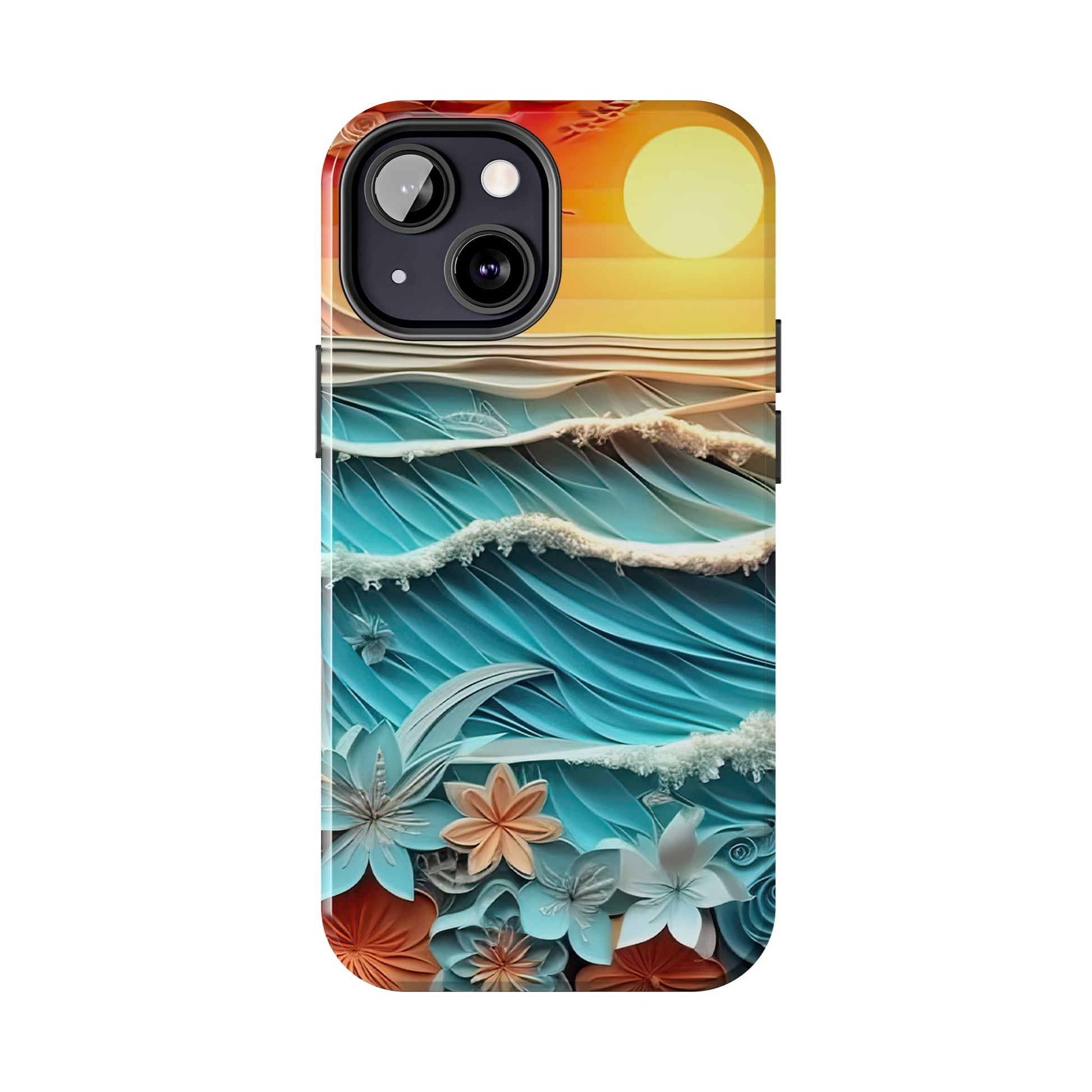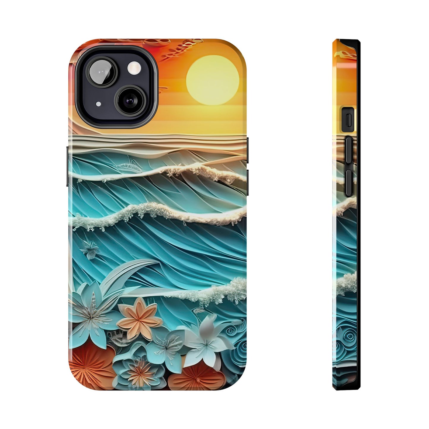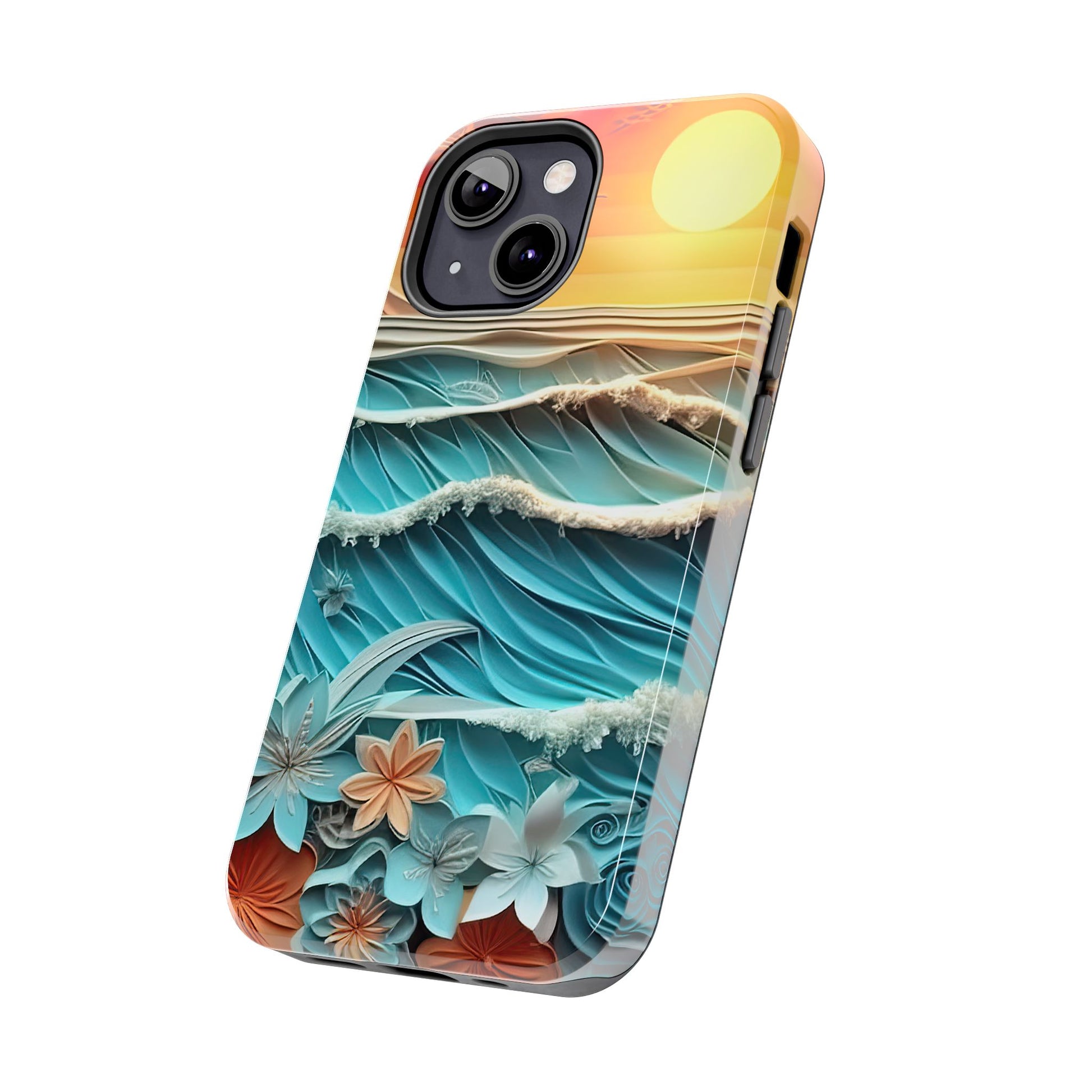 Add a touch of artistry to your phone with our Tropical Sunset Paper Art Ocean iPhone Case, perfect for beach lovers and art enthusiasts alike. This unique design features a beautifully layered paper art scene of a serene ocean with rolling waves, pastel flowers, and a warm sunset glowing over the horizon. The intricate details in soft blue, coral, and sandy beige hues bring a peaceful coastal vibe that’s both elegant and eye-catching. Crafted from premium, impact-resistant materials, this case offers reliable protection while showcasing an exquisite art piece in your hand.