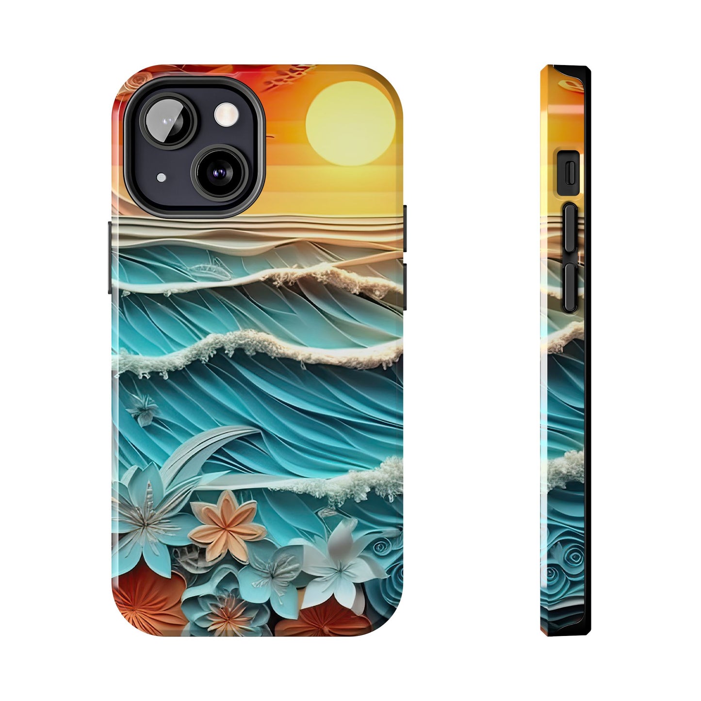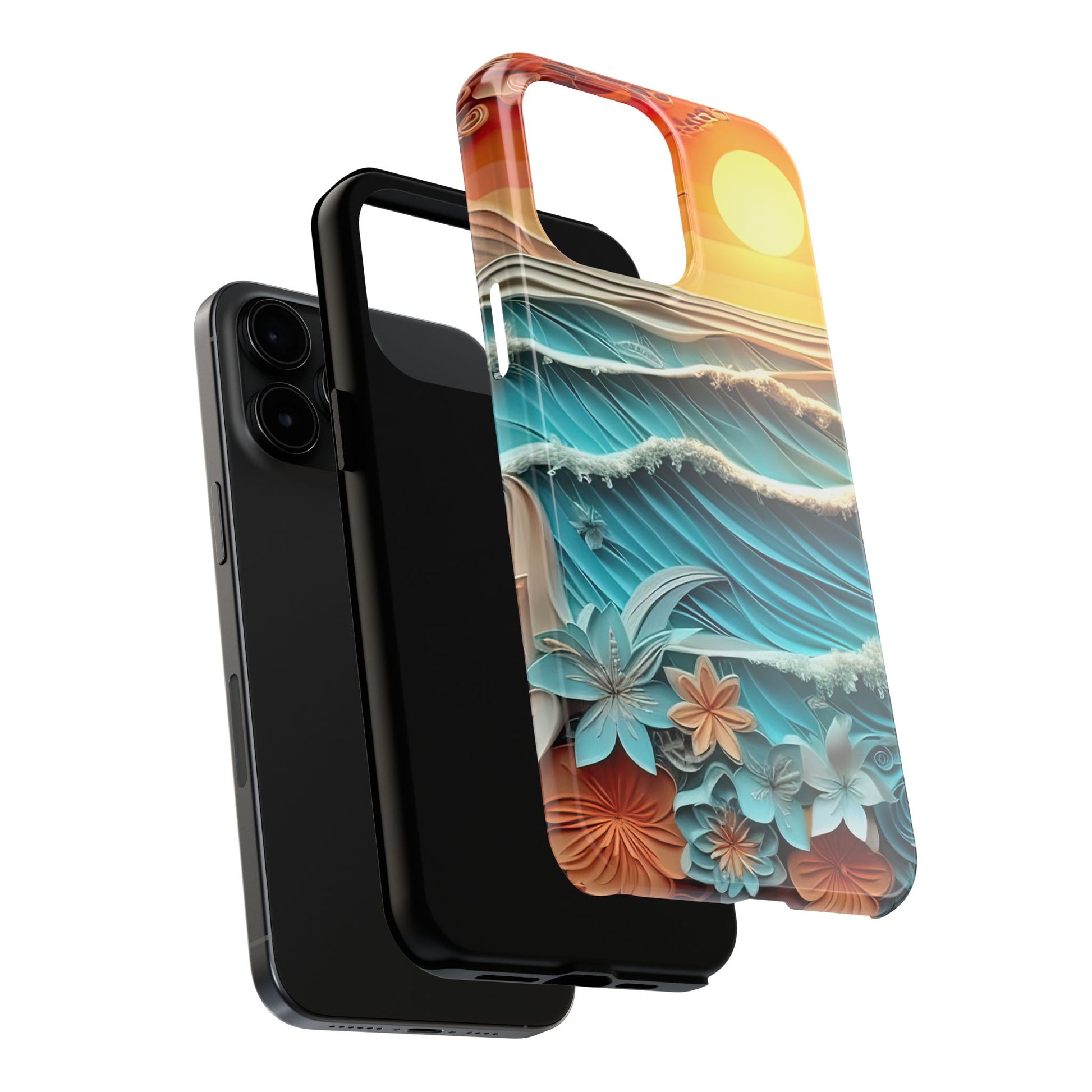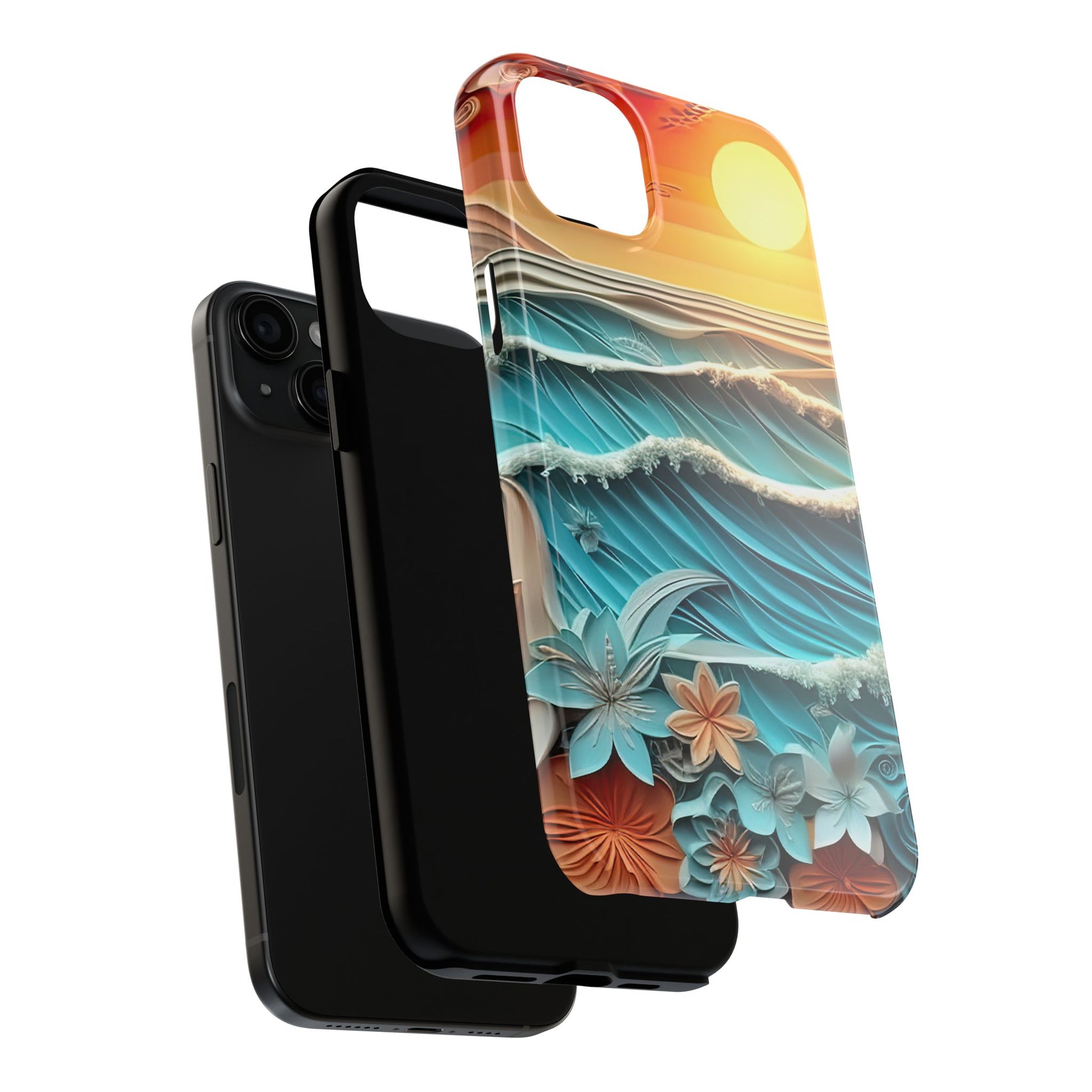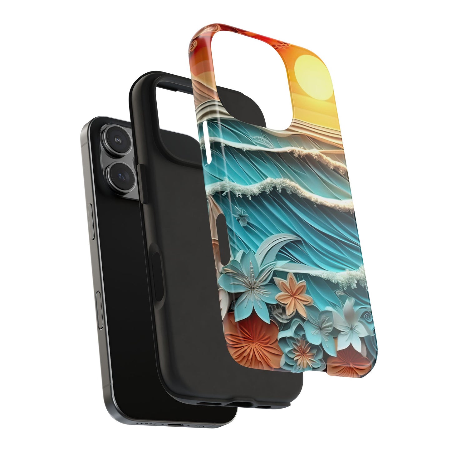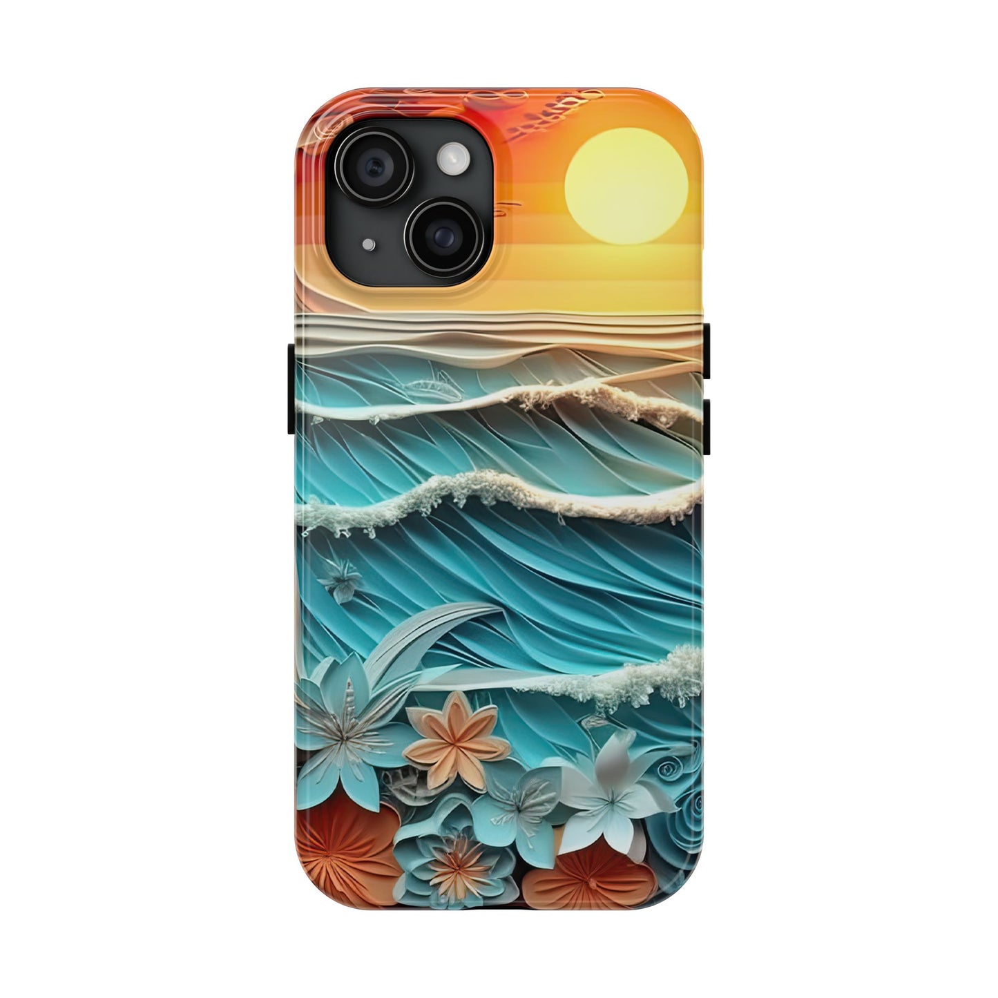 Add a touch of artistry to your phone with our Tropical Sunset Paper Art Ocean iPhone Case, perfect for beach lovers and art enthusiasts alike. This unique design features a beautifully layered paper art scene of a serene ocean with rolling waves, pastel flowers, and a warm sunset glowing over the horizon. The intricate details in soft blue, coral, and sandy beige hues bring a peaceful coastal vibe that’s both elegant and eye-catching. Crafted from premium, impact-resistant materials, this case offers reliable protection while showcasing an exquisite art piece in your hand.