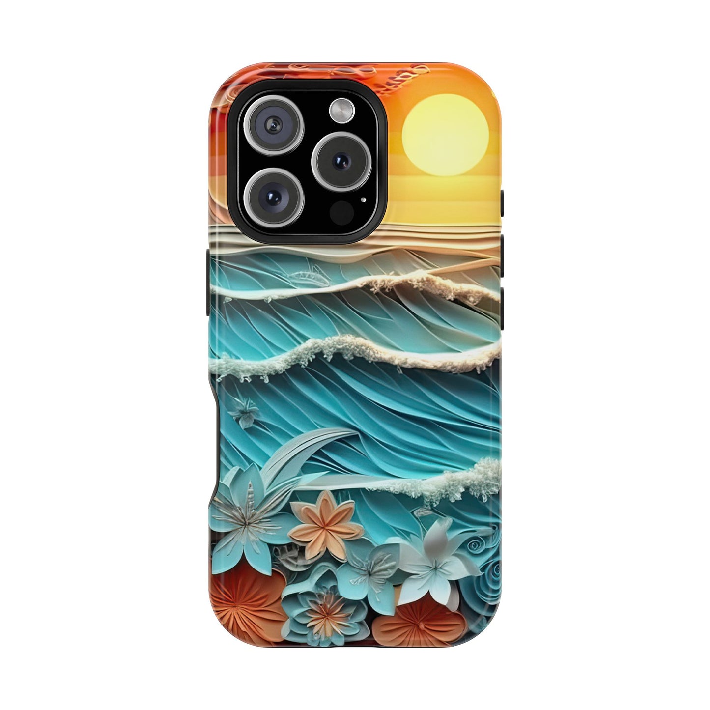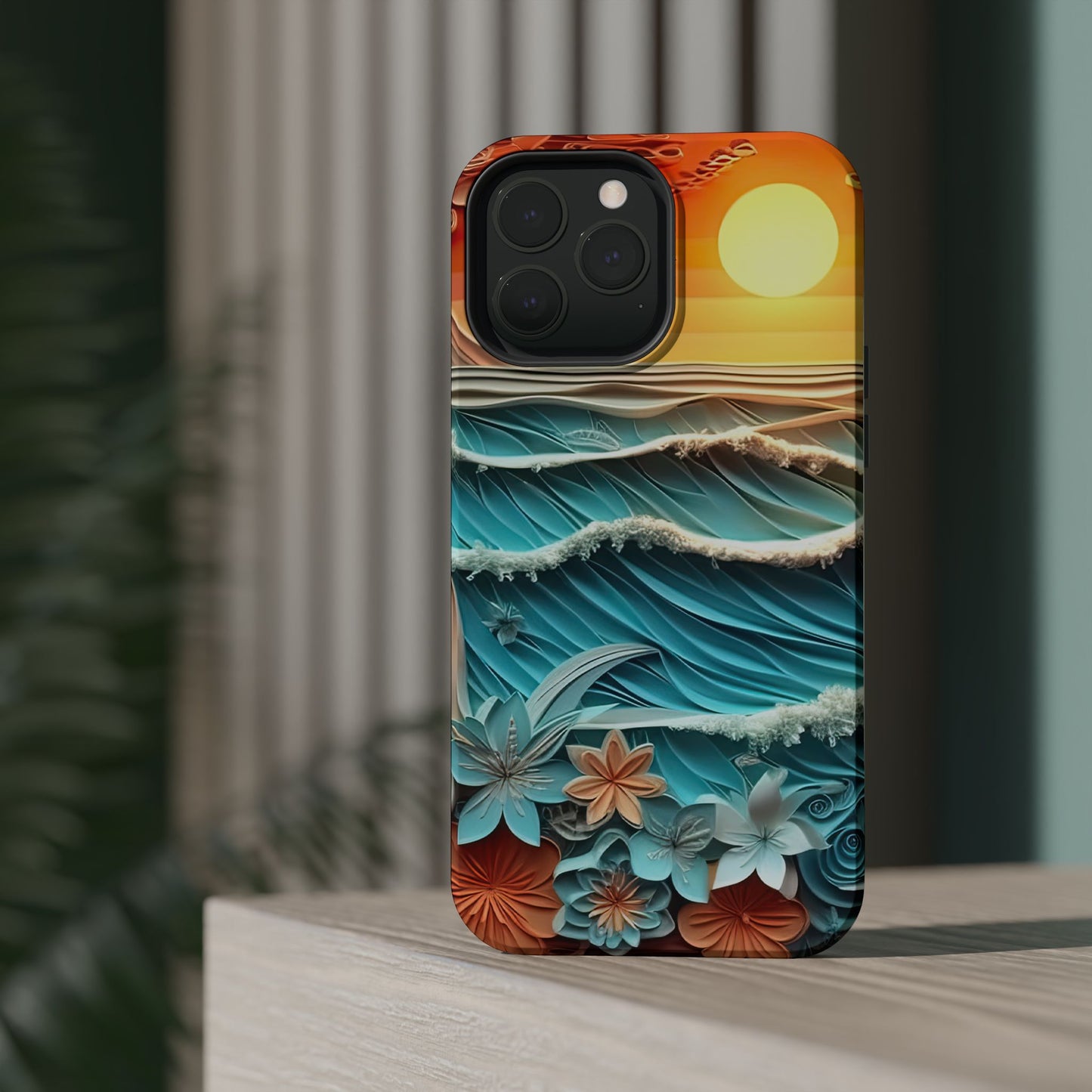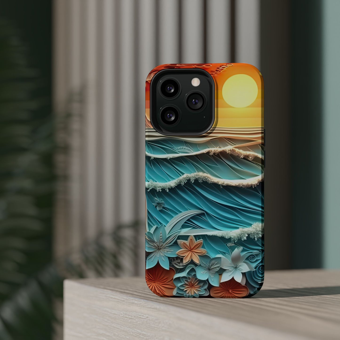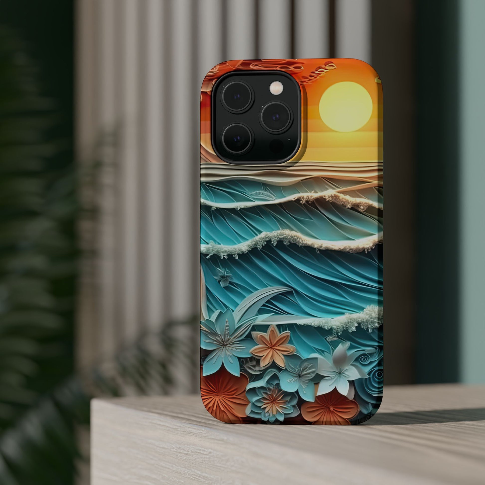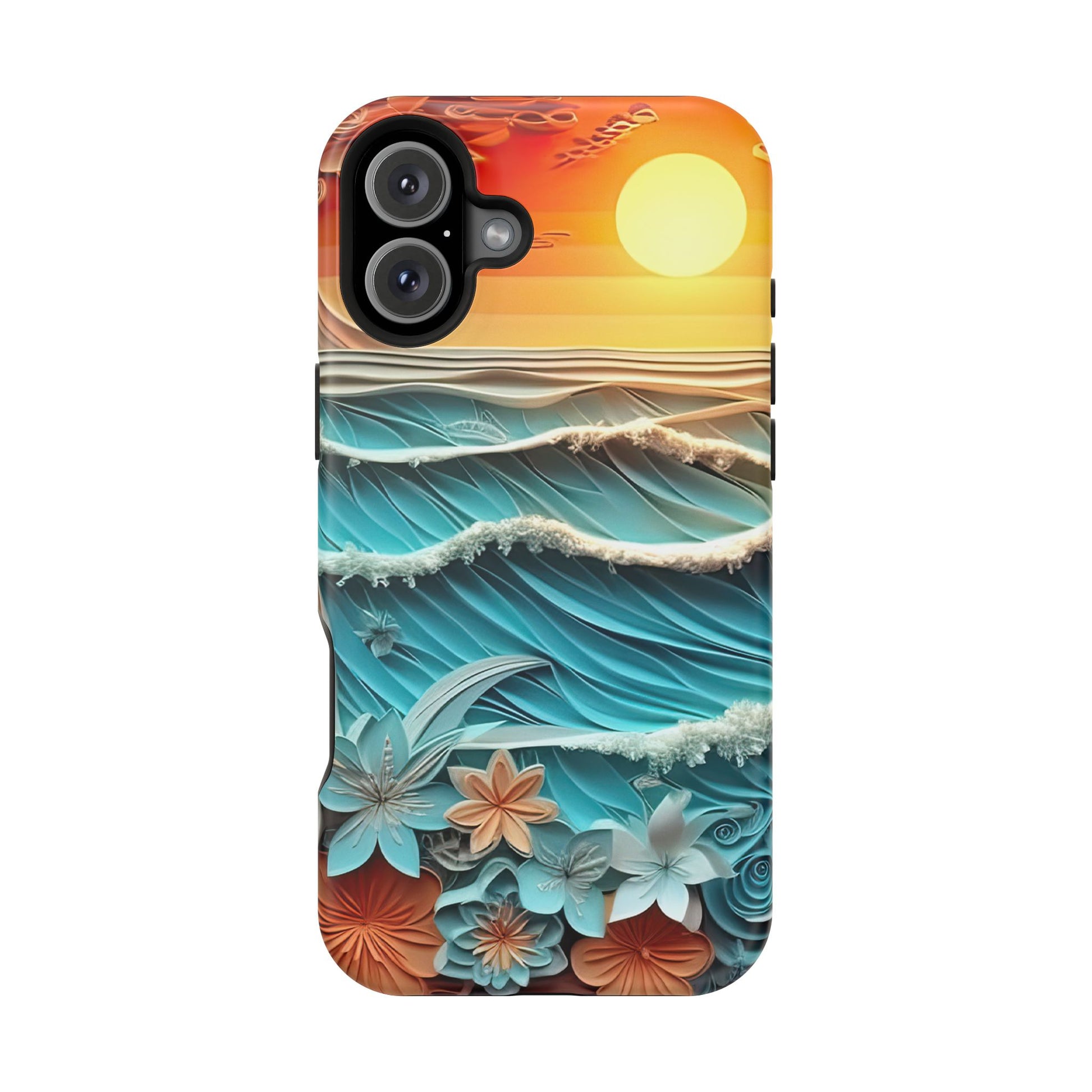 Add a touch of artistry to your phone with our Tropical Sunset Paper Art Ocean iPhone Case, perfect for beach lovers and art enthusiasts alike. This unique design features a beautifully layered paper art scene of a serene ocean with rolling waves, pastel flowers, and a warm sunset glowing over the horizon. The intricate details in soft blue, coral, and sandy beige hues bring a peaceful coastal vibe that’s both elegant and eye-catching. Crafted from premium, impact-resistant materials, this case offers reliable protection while showcasing an exquisite art piece in your hand.