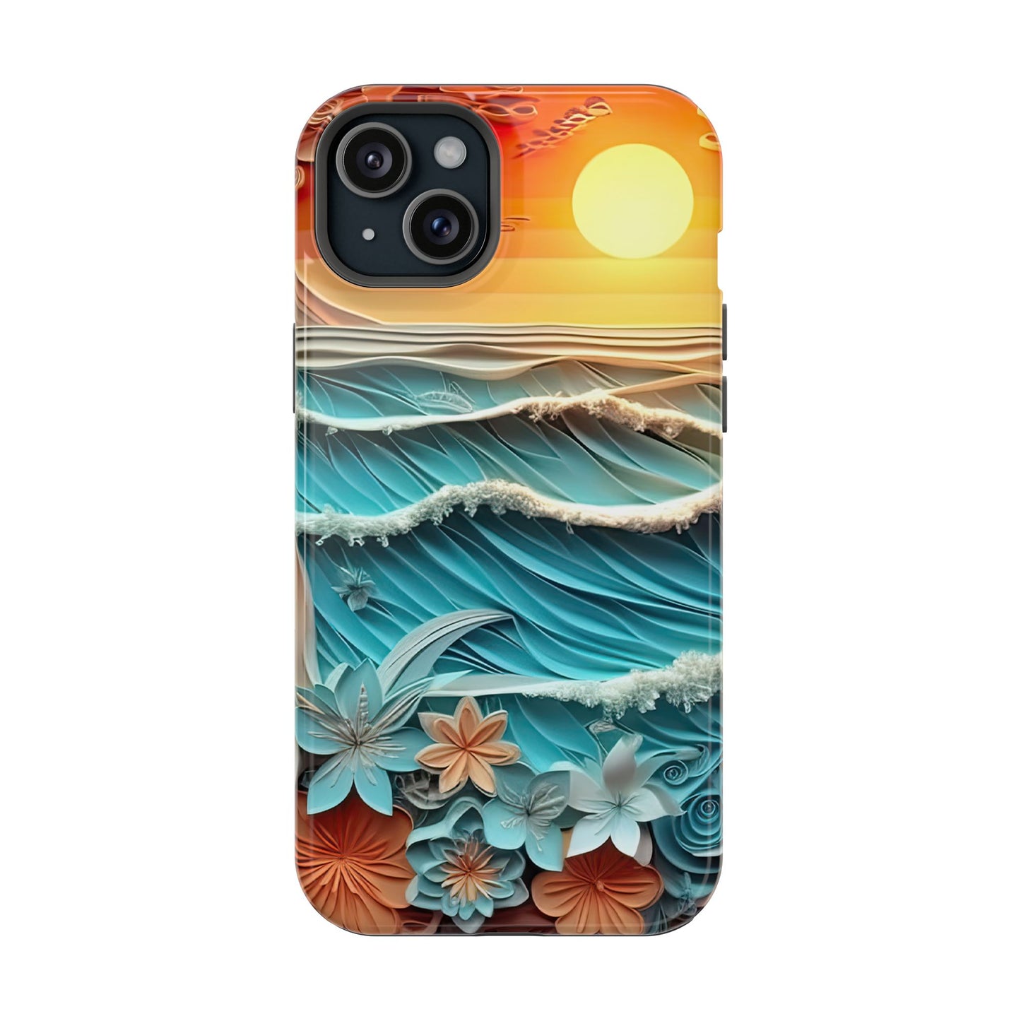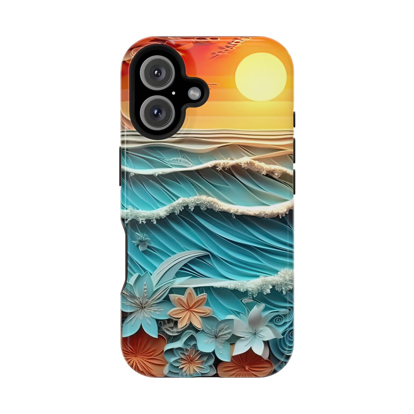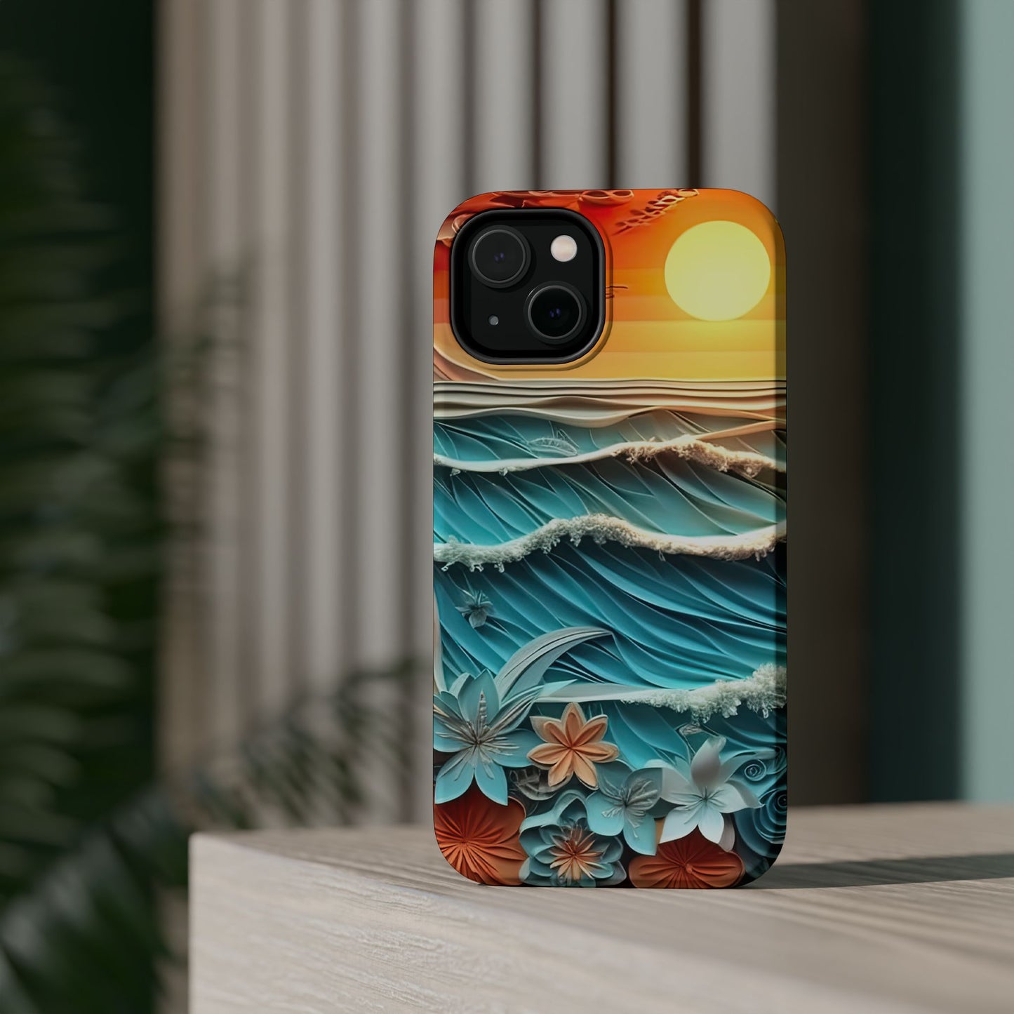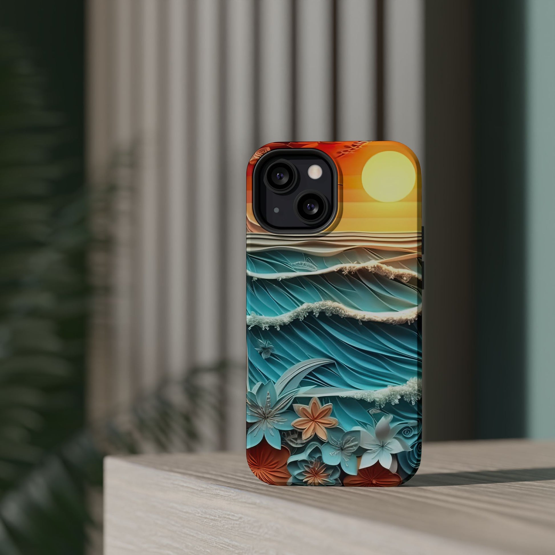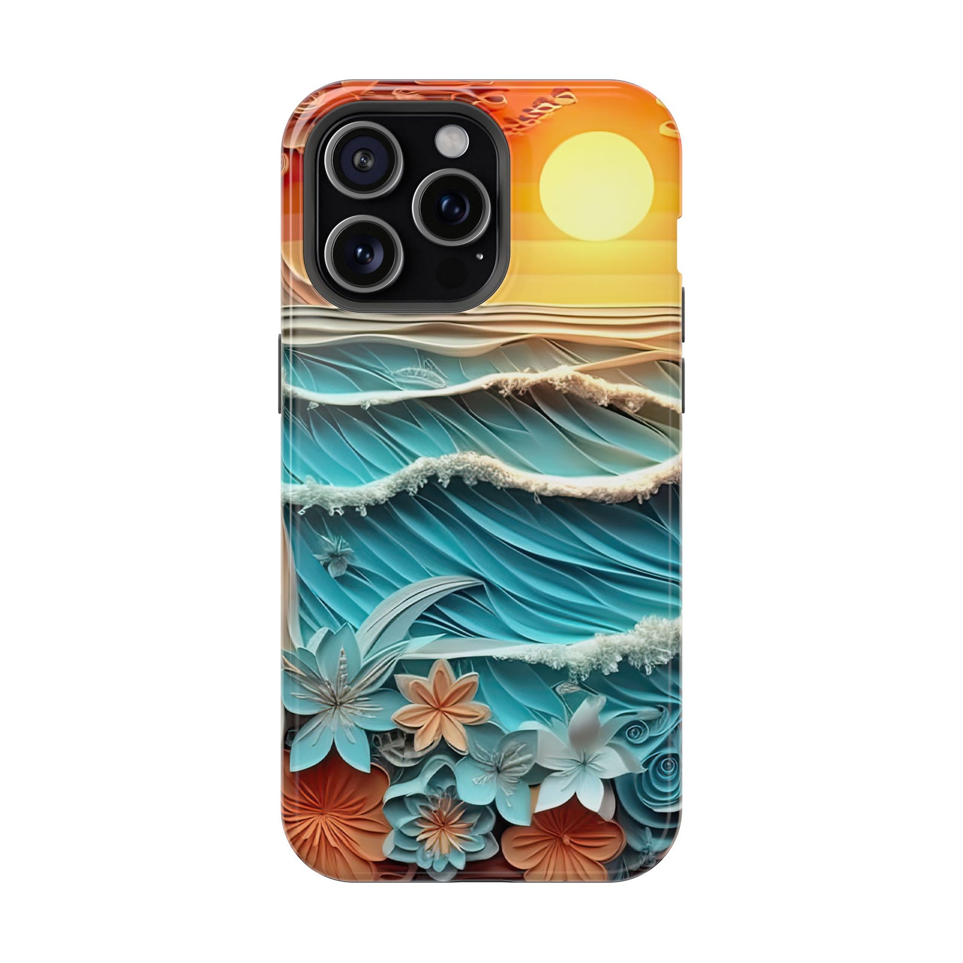 Add a touch of artistry to your phone with our Tropical Sunset Paper Art Ocean iPhone Case, perfect for beach lovers and art enthusiasts alike. This unique design features a beautifully layered paper art scene of a serene ocean with rolling waves, pastel flowers, and a warm sunset glowing over the horizon. The intricate details in soft blue, coral, and sandy beige hues bring a peaceful coastal vibe that’s both elegant and eye-catching. Crafted from premium, impact-resistant materials, this case offers reliable protection while showcasing an exquisite art piece in your hand.
