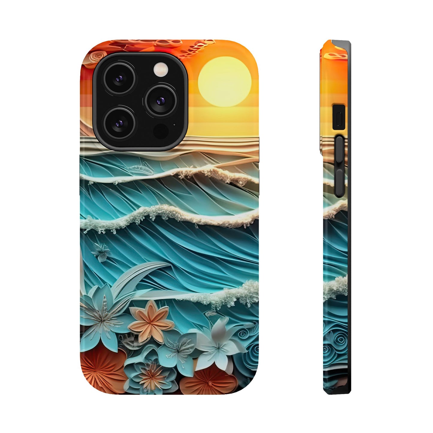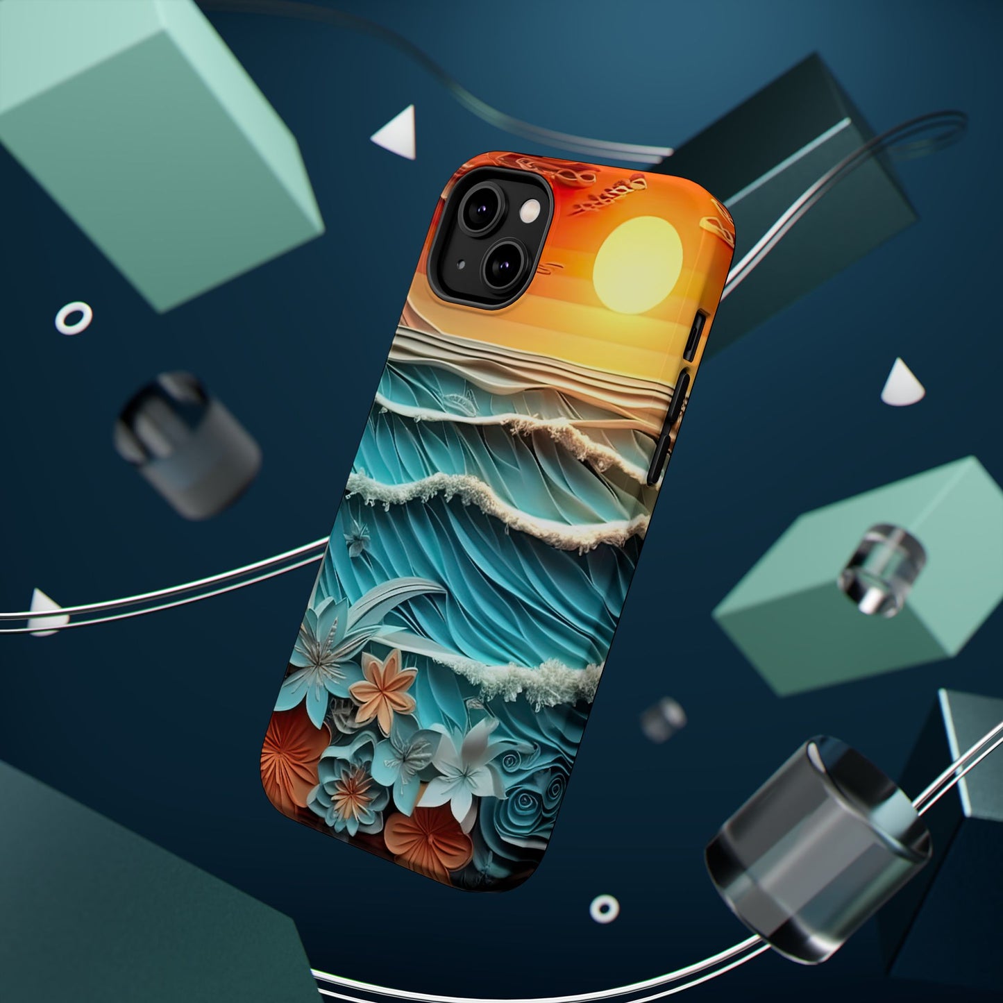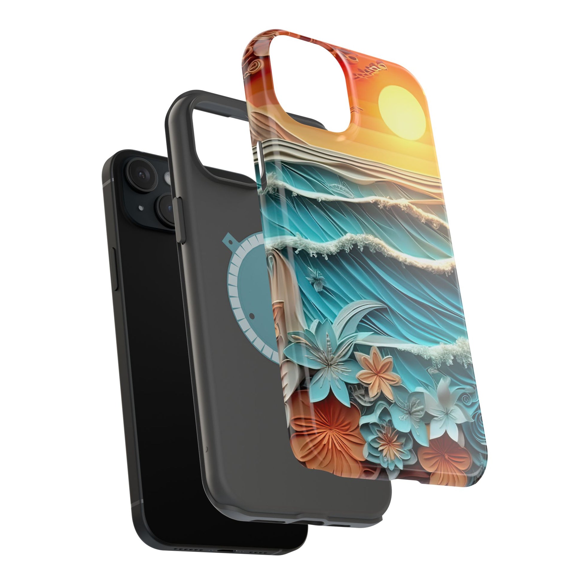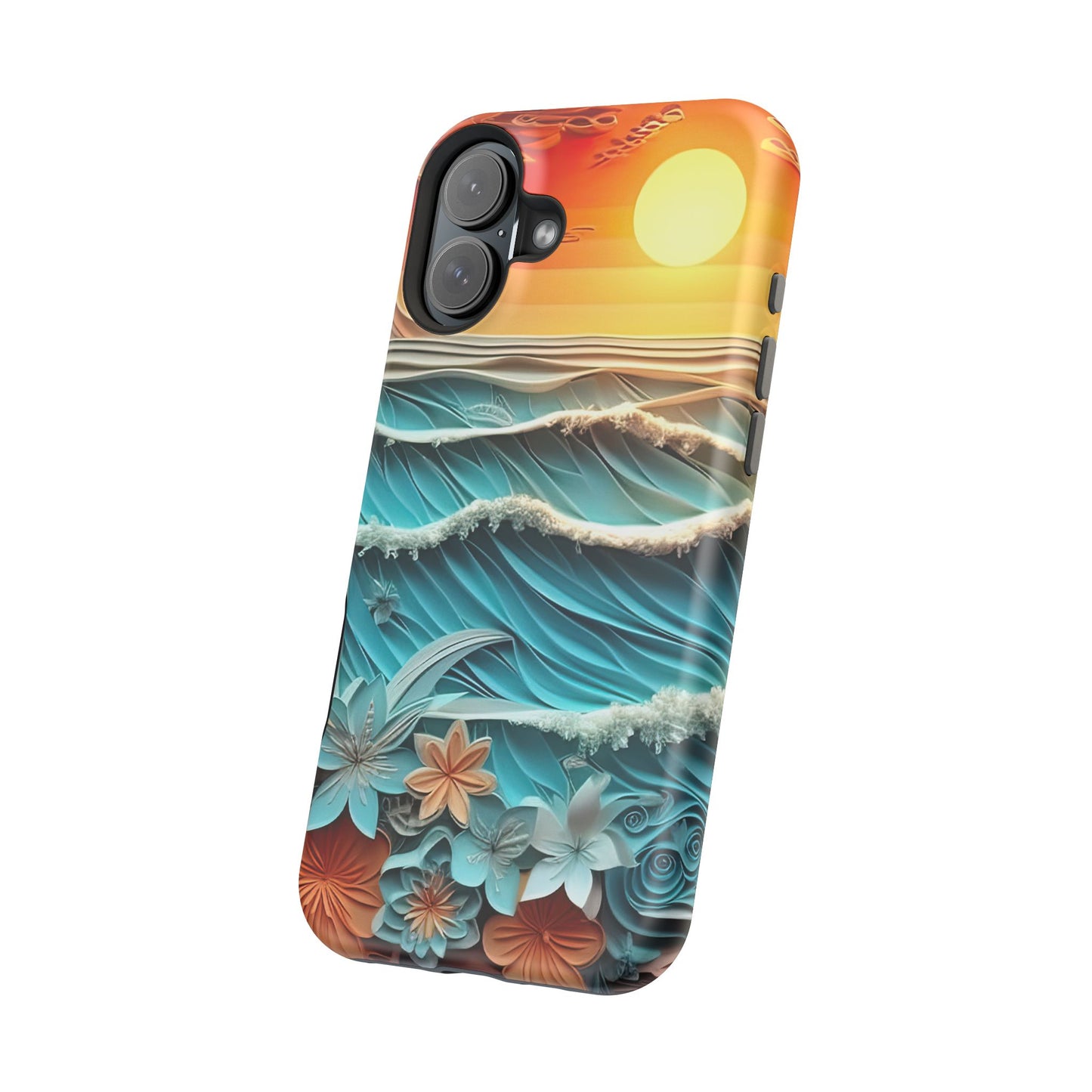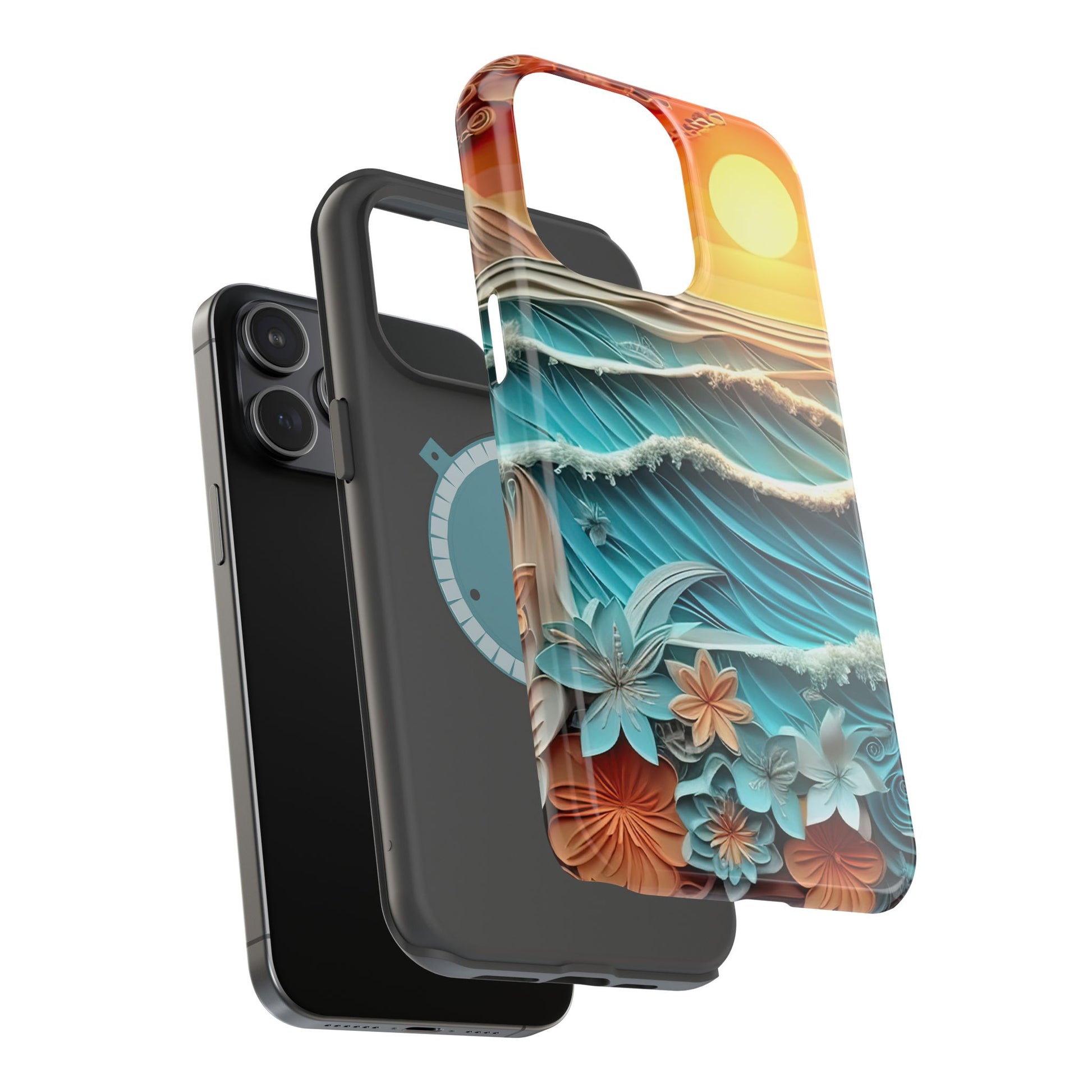 Add a touch of artistry to your phone with our Tropical Sunset Paper Art Ocean iPhone Case, perfect for beach lovers and art enthusiasts alike. This unique design features a beautifully layered paper art scene of a serene ocean with rolling waves, pastel flowers, and a warm sunset glowing over the horizon. The intricate details in soft blue, coral, and sandy beige hues bring a peaceful coastal vibe that’s both elegant and eye-catching. Crafted from premium, impact-resistant materials, this case offers reliable protection while showcasing an exquisite art piece in your hand.