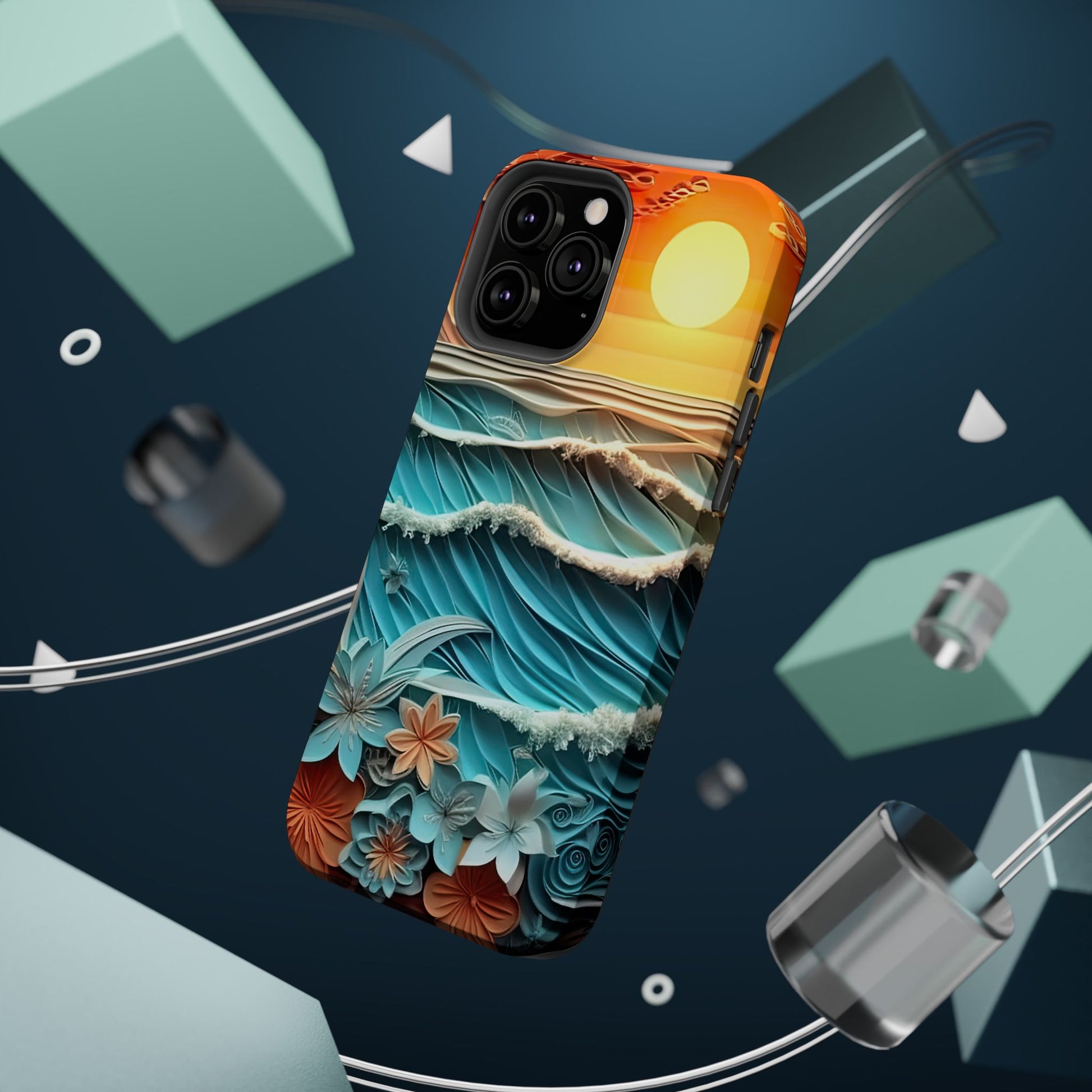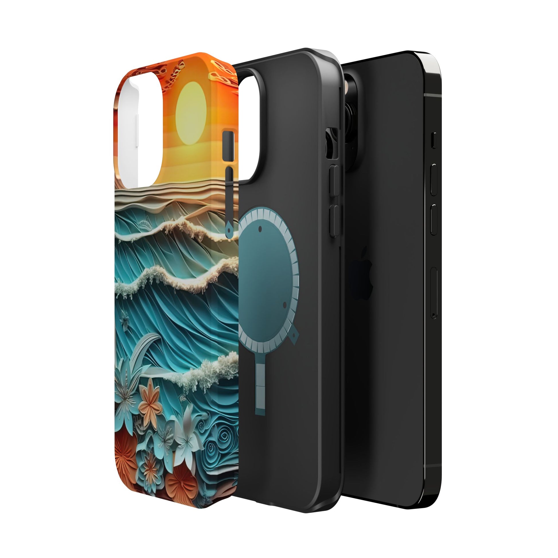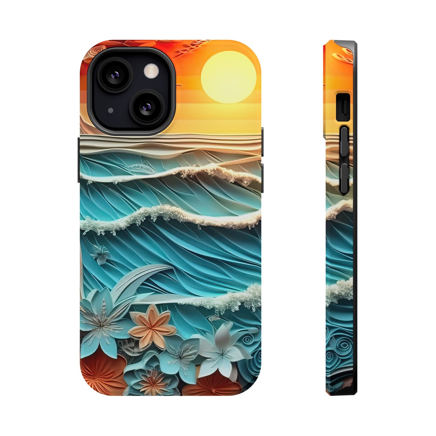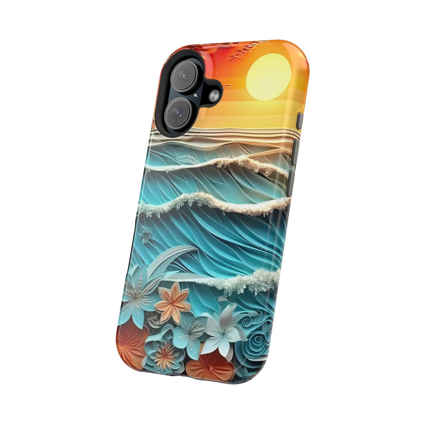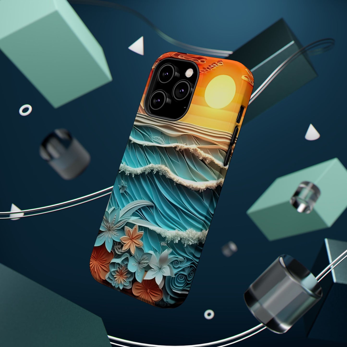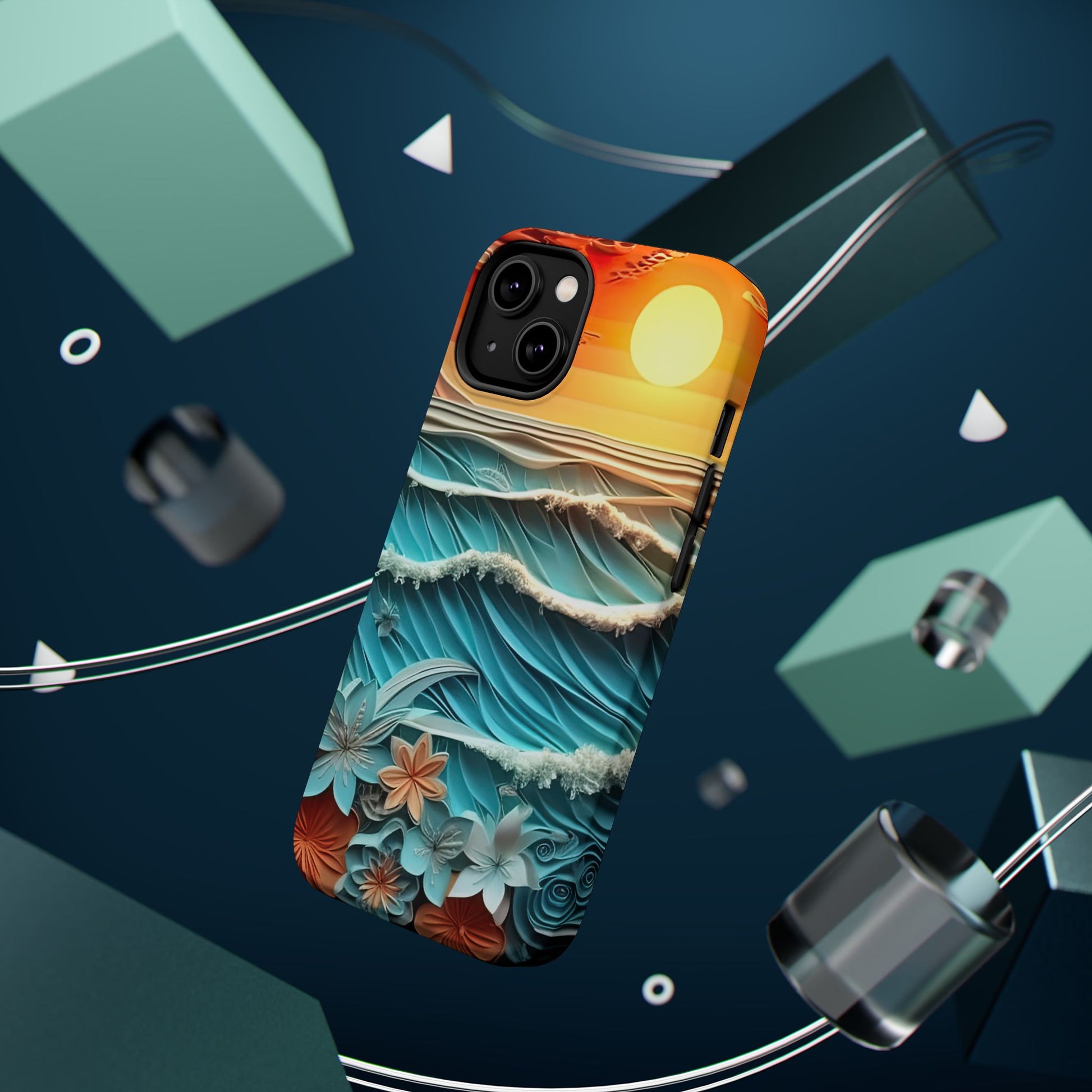 Add a touch of artistry to your phone with our Tropical Sunset Paper Art Ocean iPhone Case, perfect for beach lovers and art enthusiasts alike. This unique design features a beautifully layered paper art scene of a serene ocean with rolling waves, pastel flowers, and a warm sunset glowing over the horizon. The intricate details in soft blue, coral, and sandy beige hues bring a peaceful coastal vibe that’s both elegant and eye-catching. Crafted from premium, impact-resistant materials, this case offers reliable protection while showcasing an exquisite art piece in your hand.
