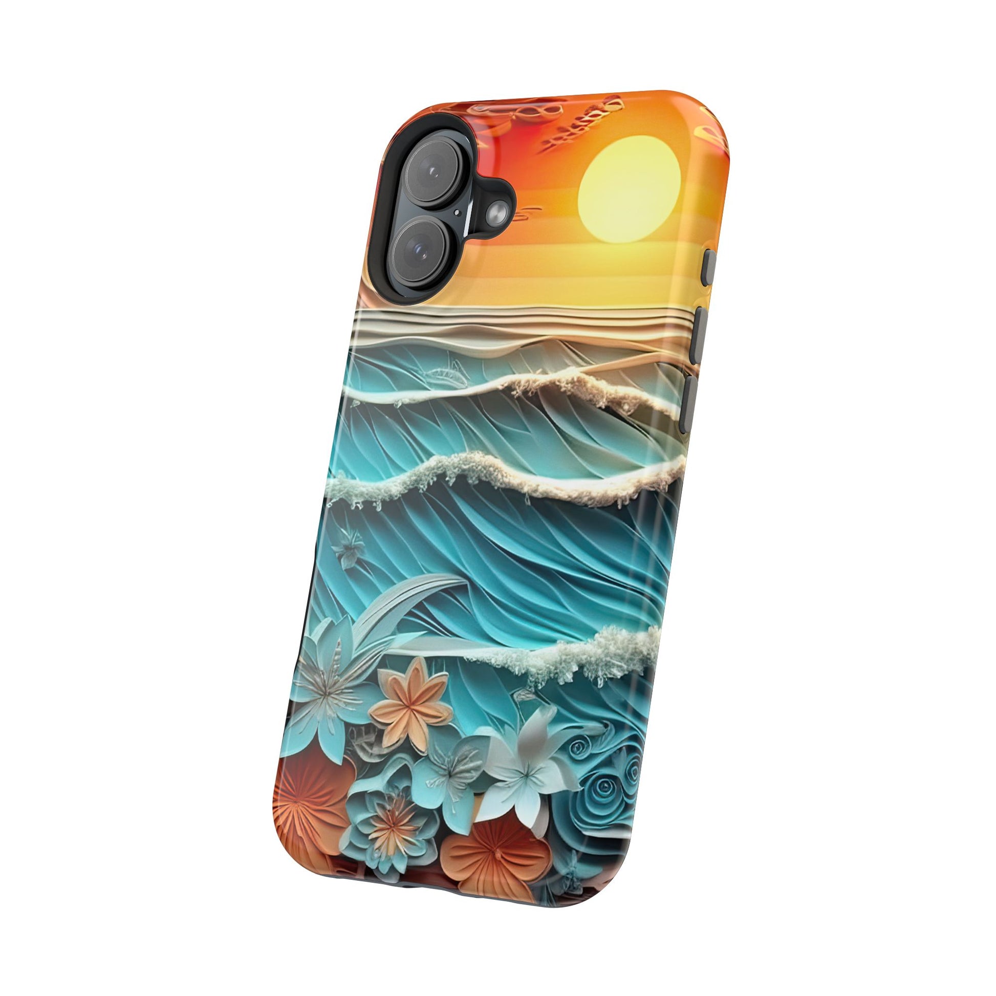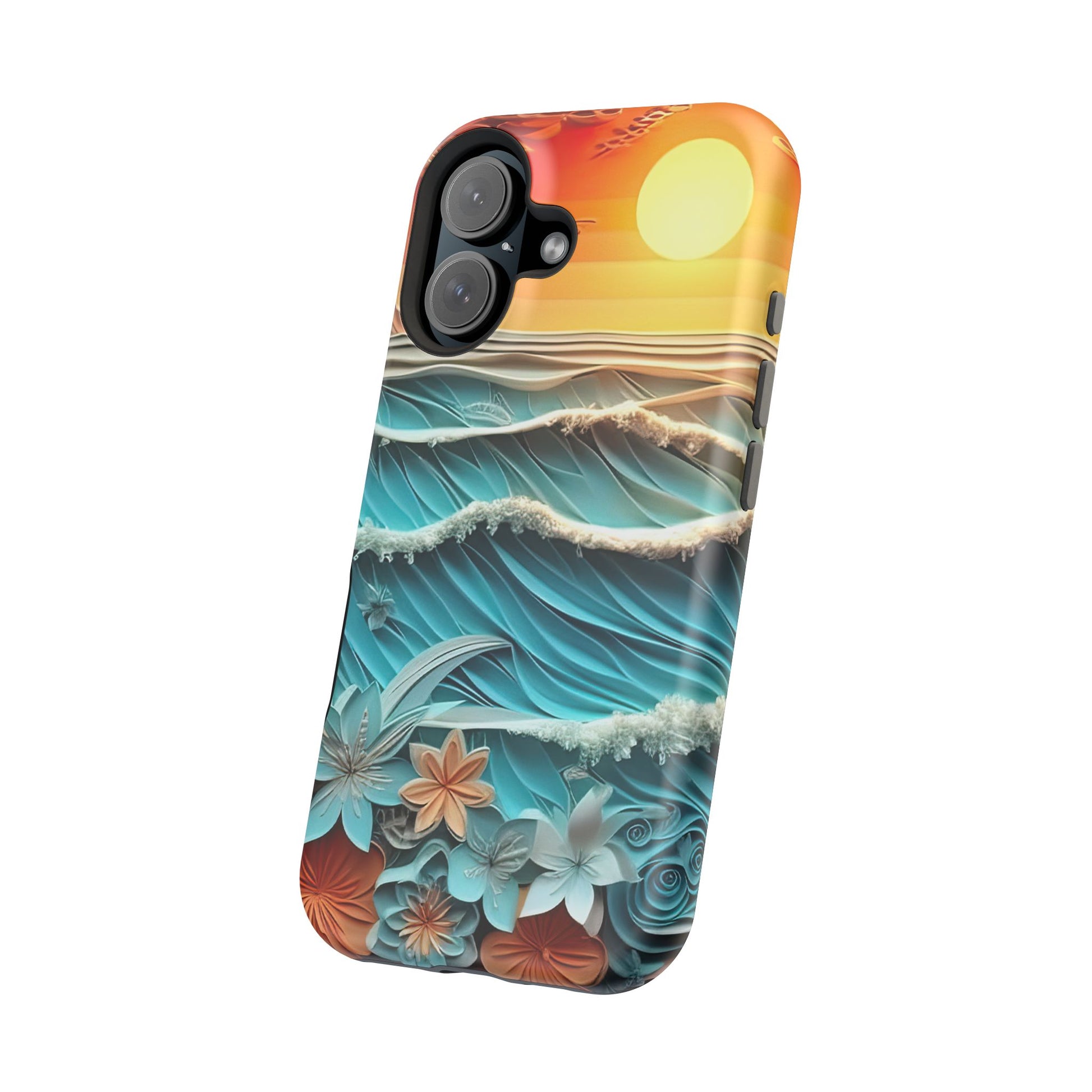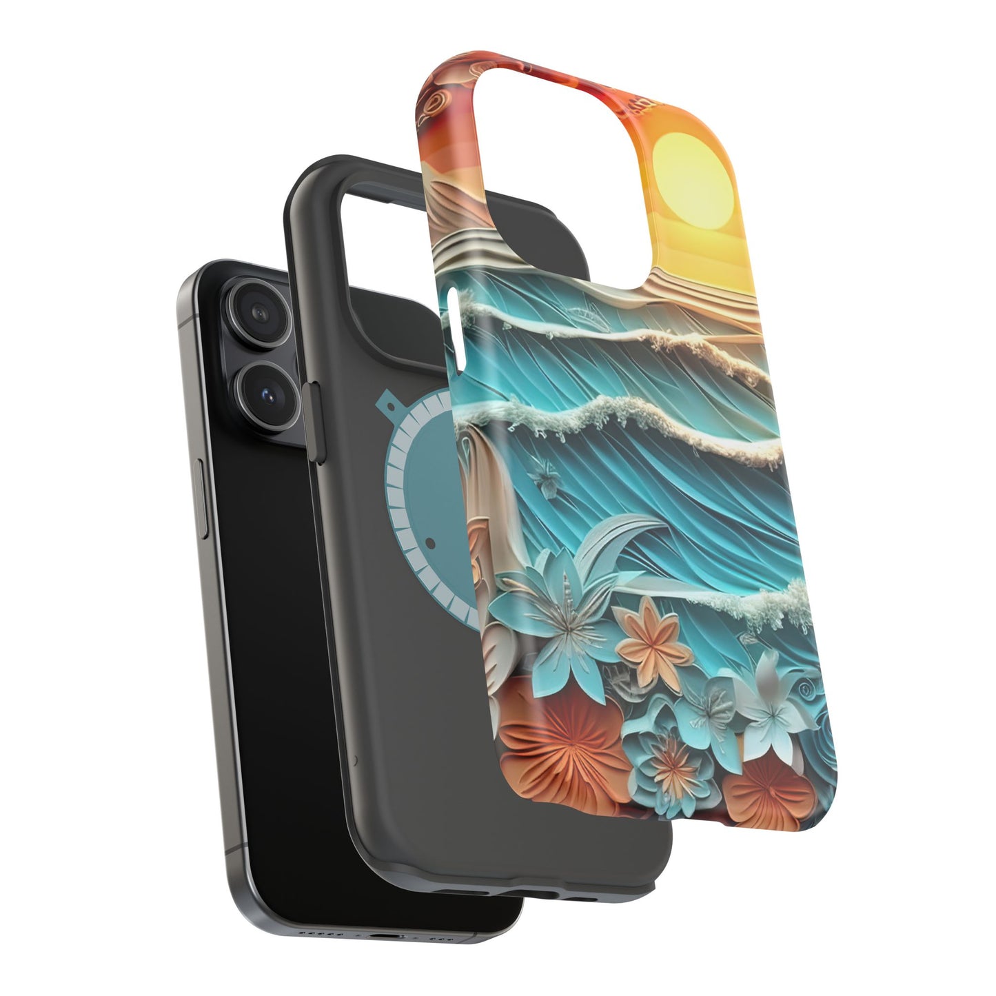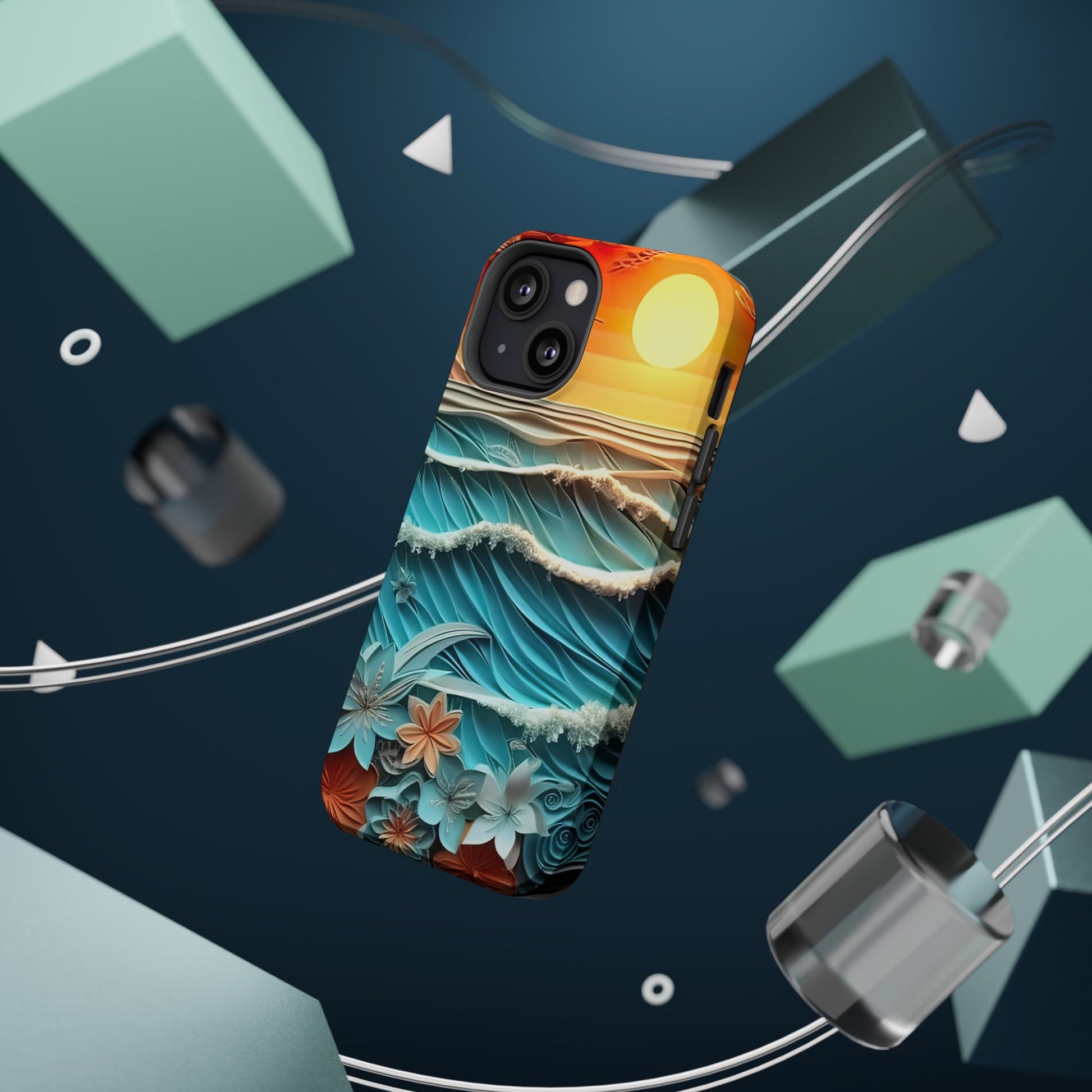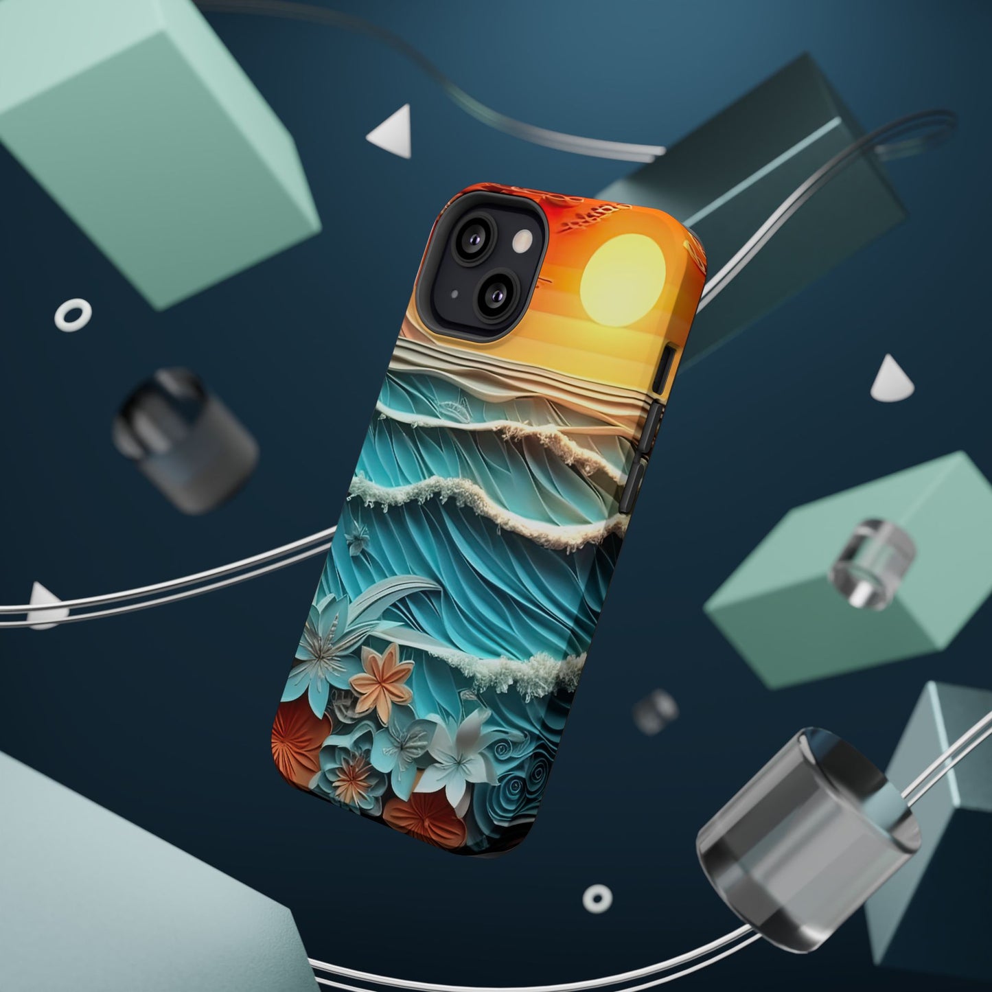 Add a touch of artistry to your phone with our Tropical Sunset Paper Art Ocean iPhone Case, perfect for beach lovers and art enthusiasts alike. This unique design features a beautifully layered paper art scene of a serene ocean with rolling waves, pastel flowers, and a warm sunset glowing over the horizon. The intricate details in soft blue, coral, and sandy beige hues bring a peaceful coastal vibe that’s both elegant and eye-catching. Crafted from premium, impact-resistant materials, this case offers reliable protection while showcasing an exquisite art piece in your hand.