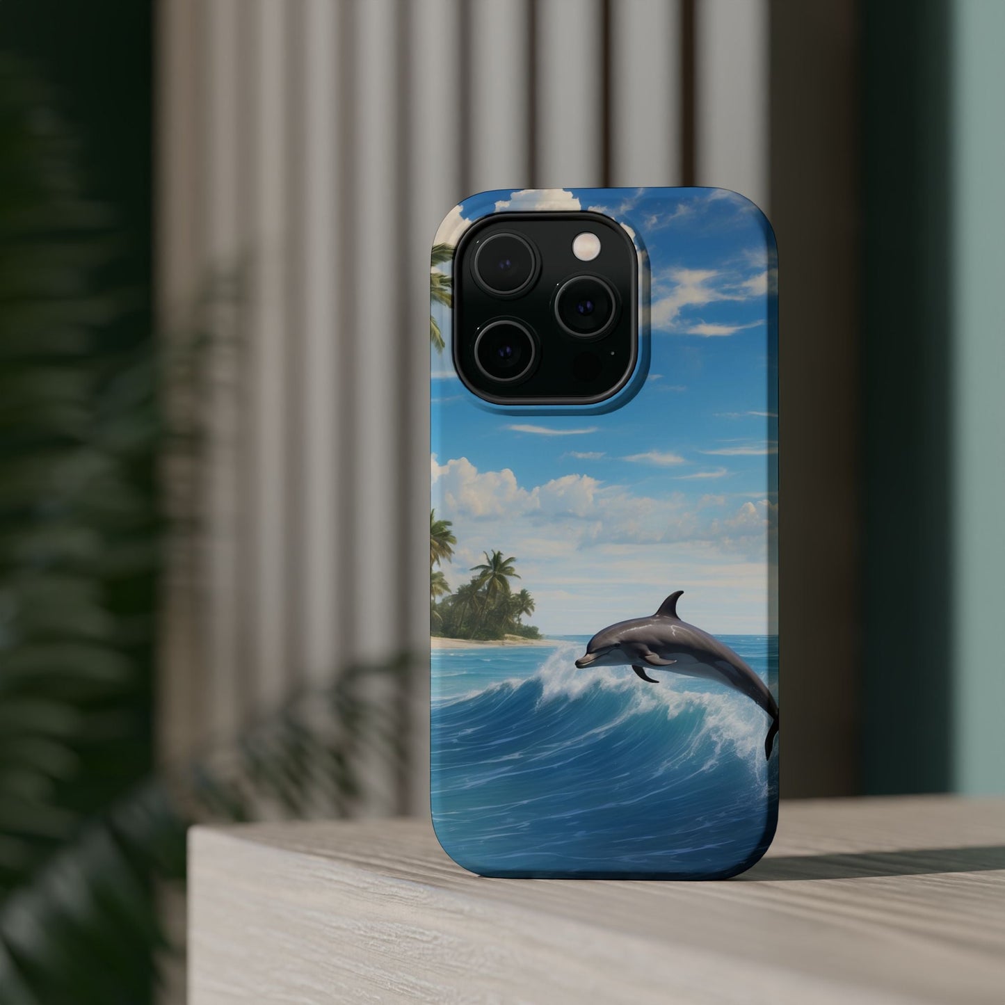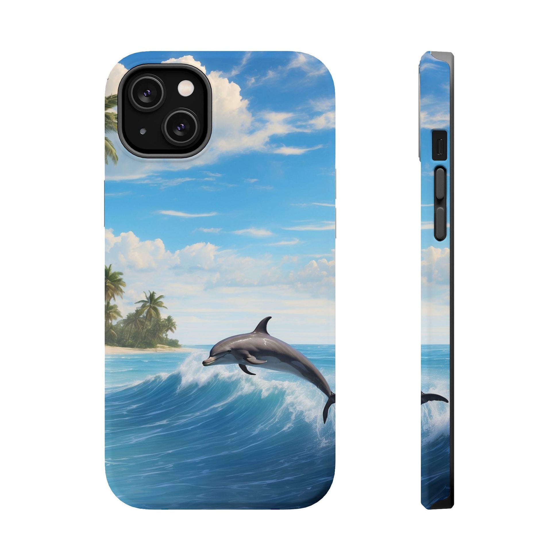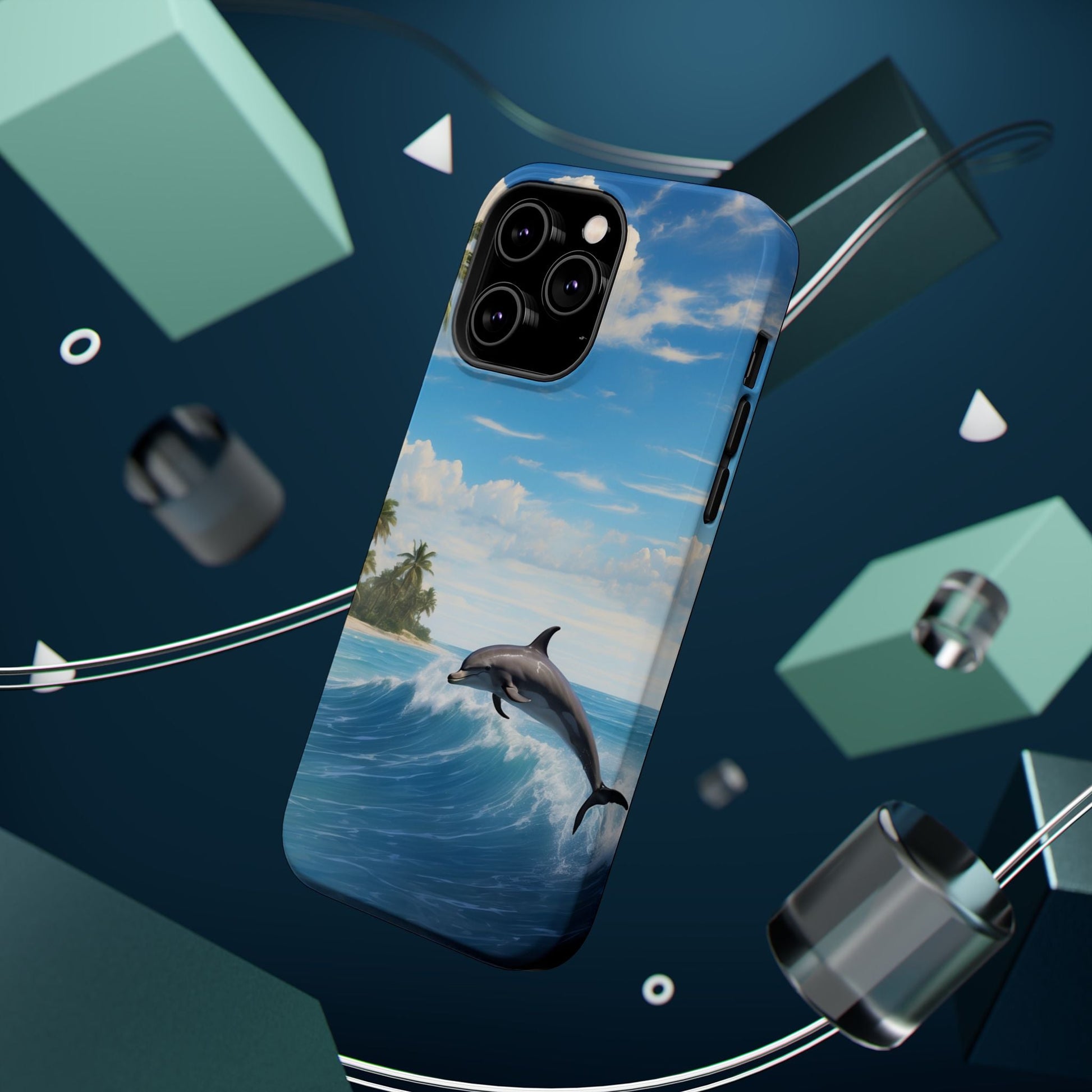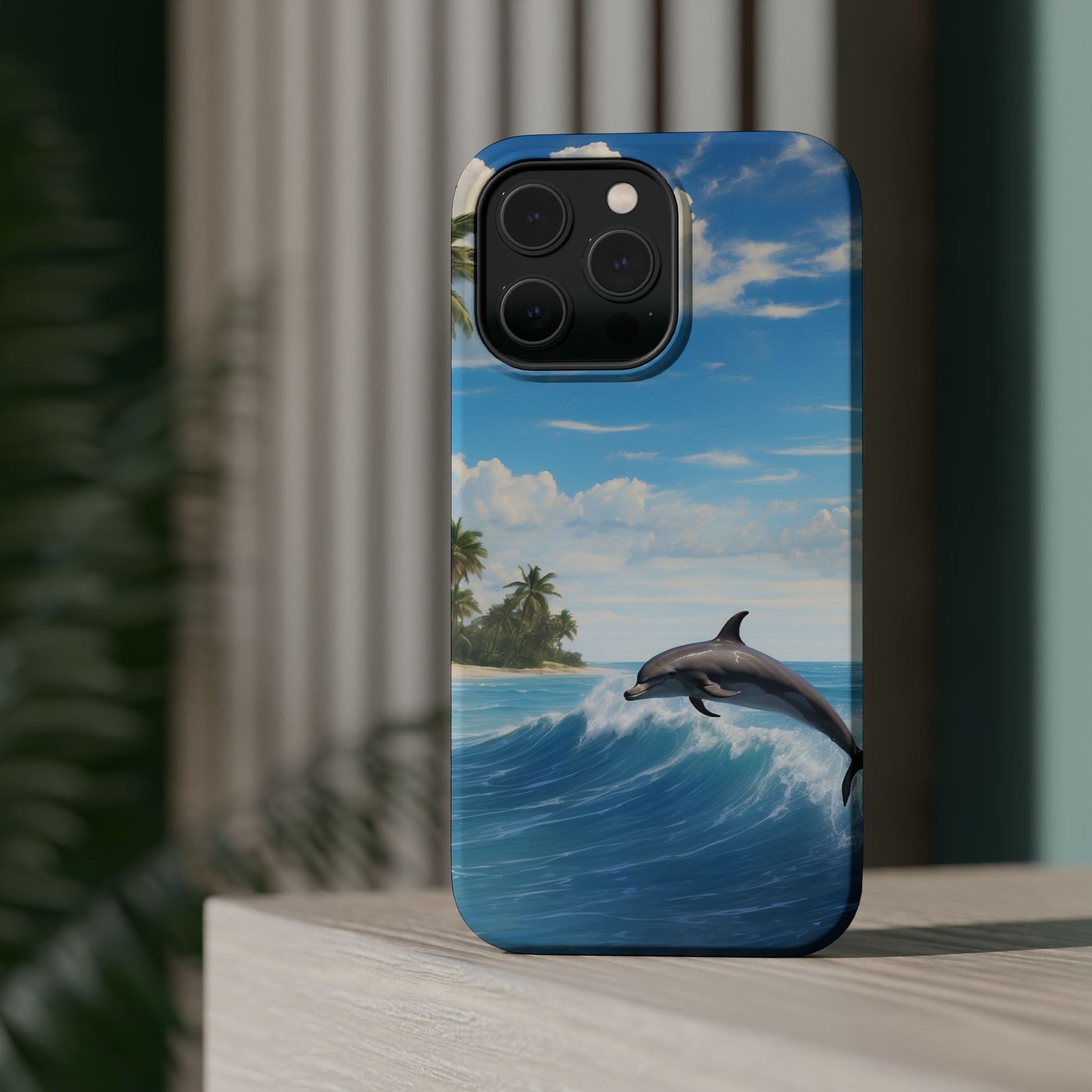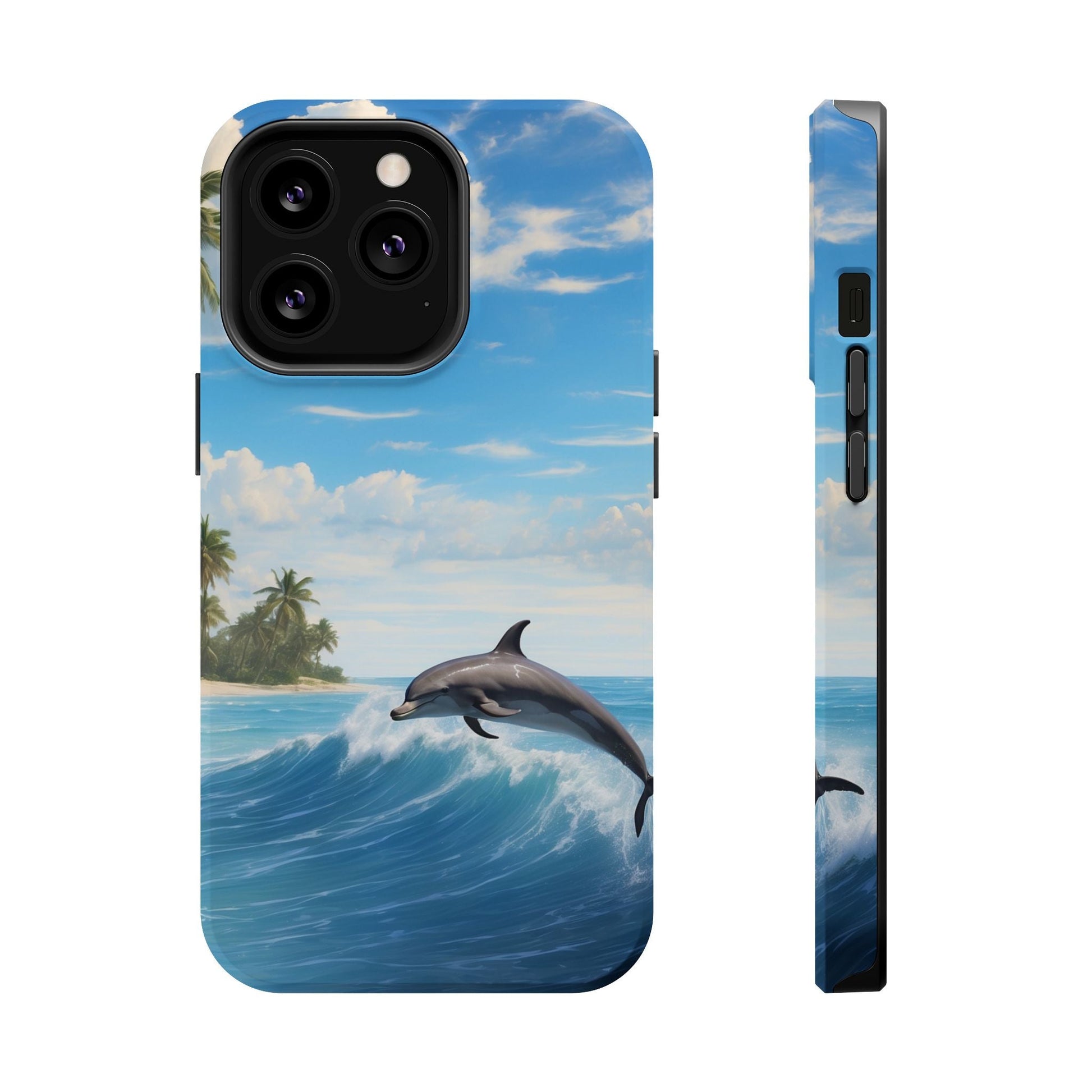 Ride the wave of convenience and style with this Tropical Surf Dolphin MagSafe Case! Featuring a majestic dolphin soaring over crystal-clear waves, this case brings a sense of freedom and ocean adventure to your device. With built-in MagSafe magnets for effortless wireless charging, plus a shockproof TPU bumper and hard polycarbonate shell, it’s both functional and stylish.
