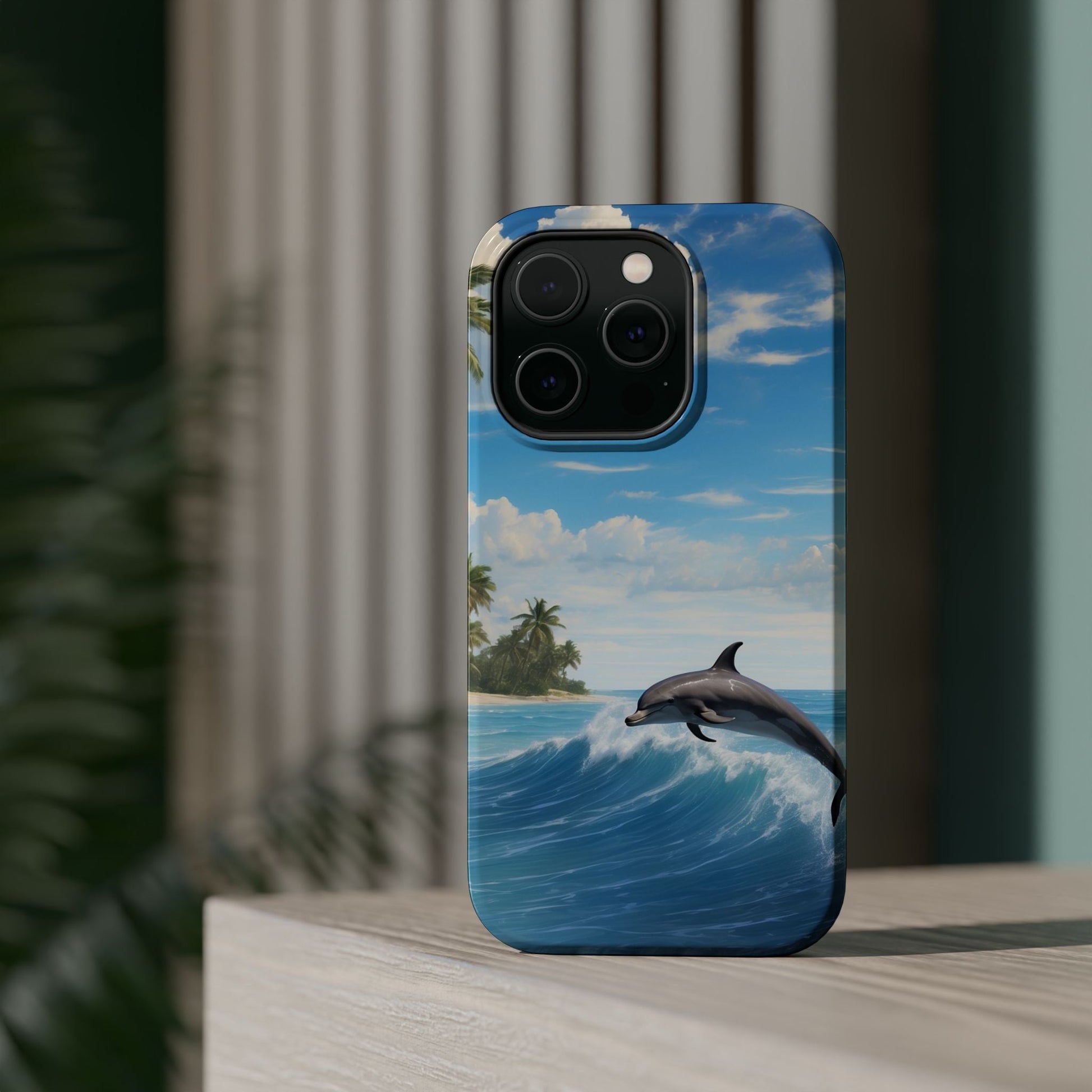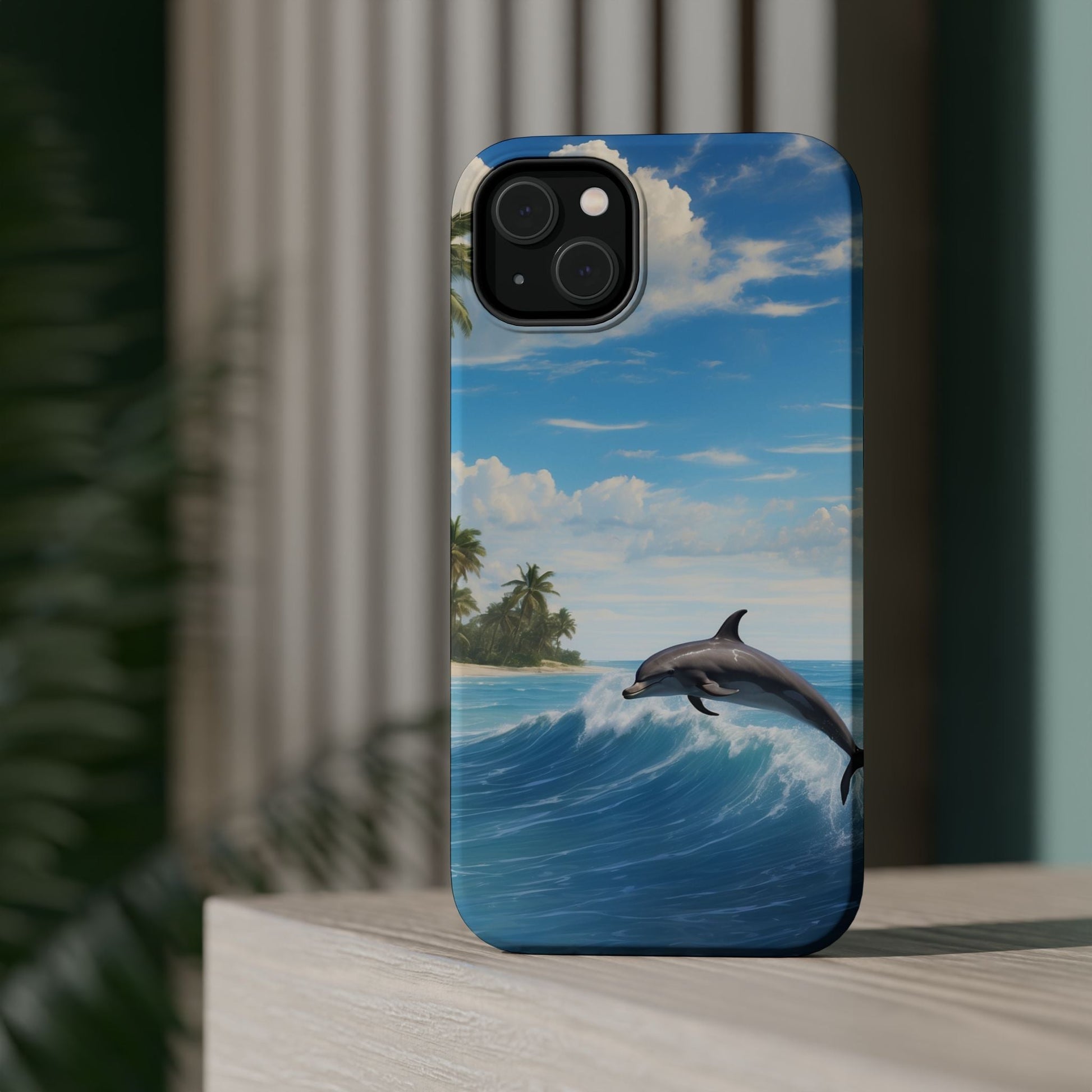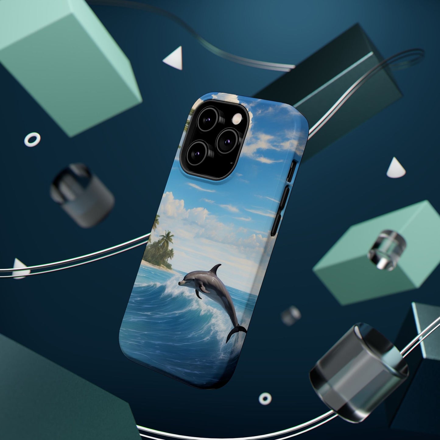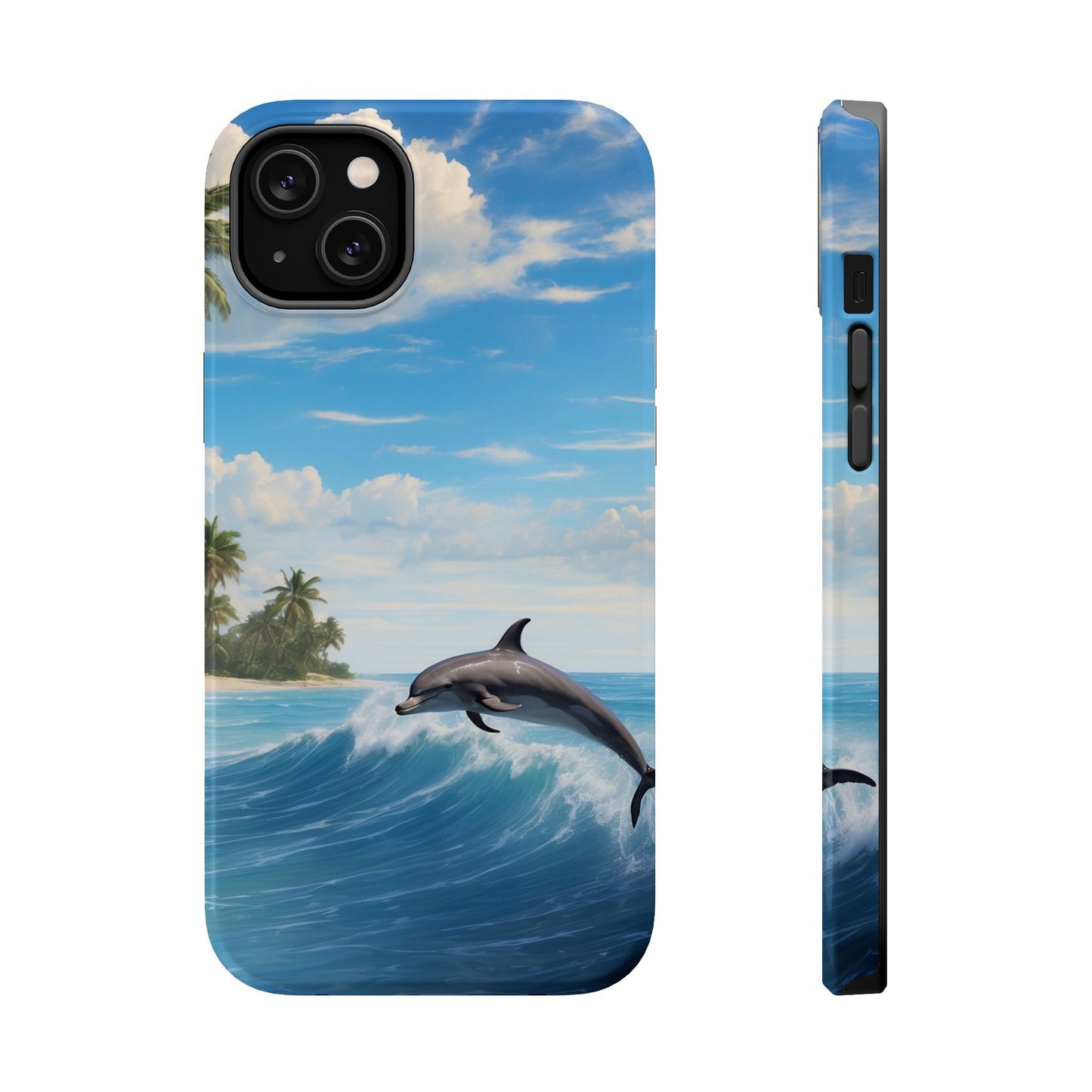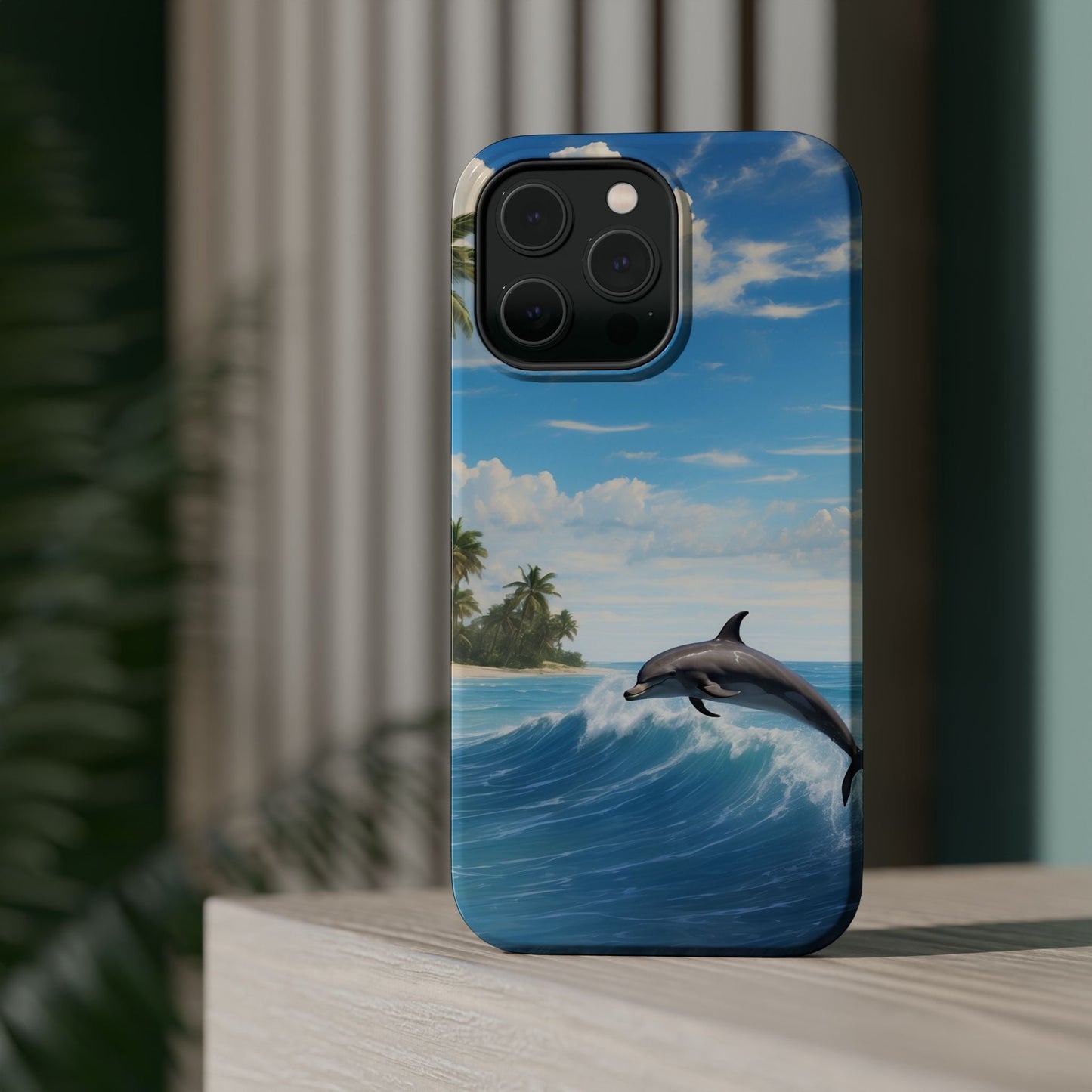 Ride the wave of convenience and style with this Tropical Surf Dolphin MagSafe Case! Featuring a majestic dolphin soaring over crystal-clear waves, this case brings a sense of freedom and ocean adventure to your device. With built-in MagSafe magnets for effortless wireless charging, plus a shockproof TPU bumper and hard polycarbonate shell, it’s both functional and stylish.