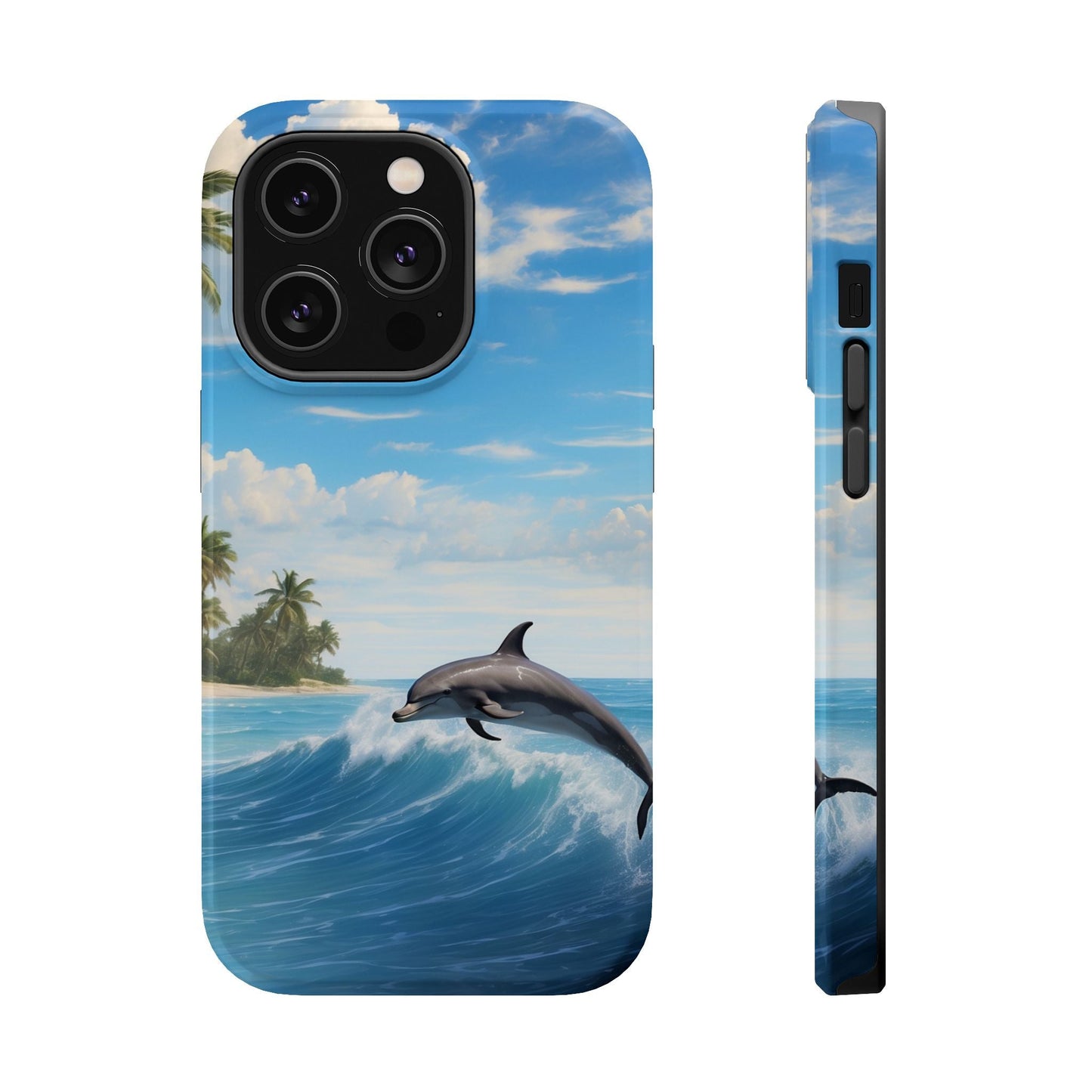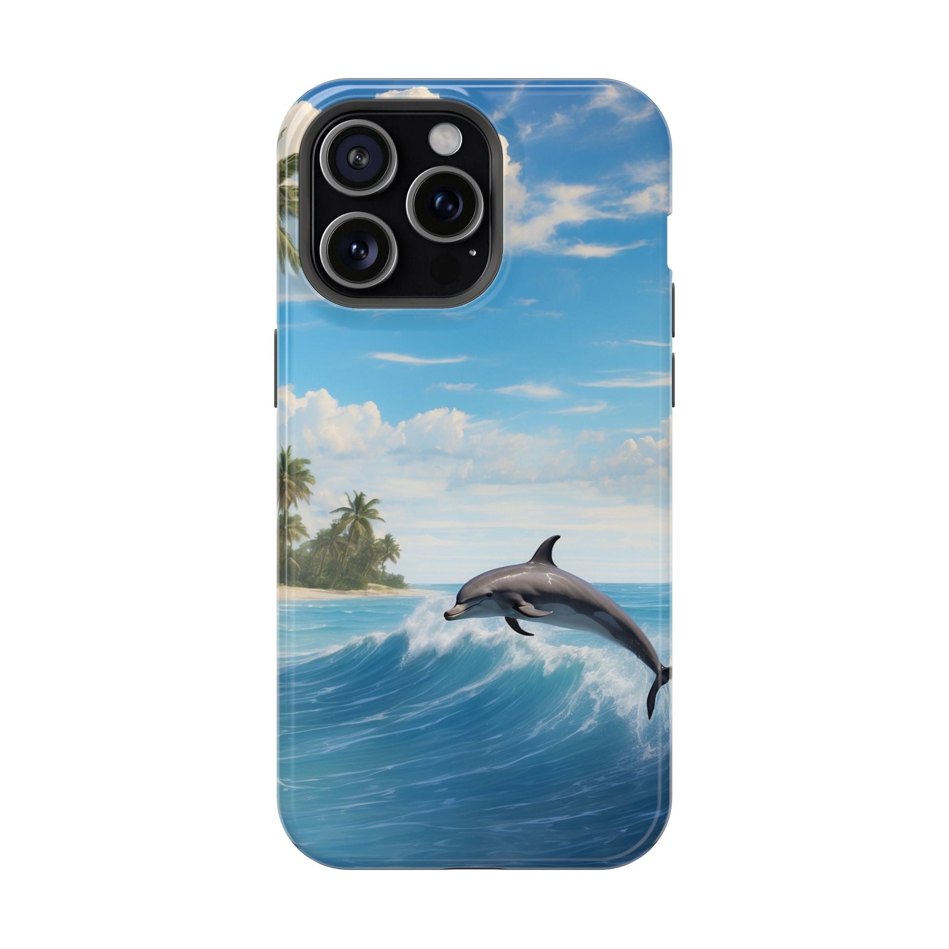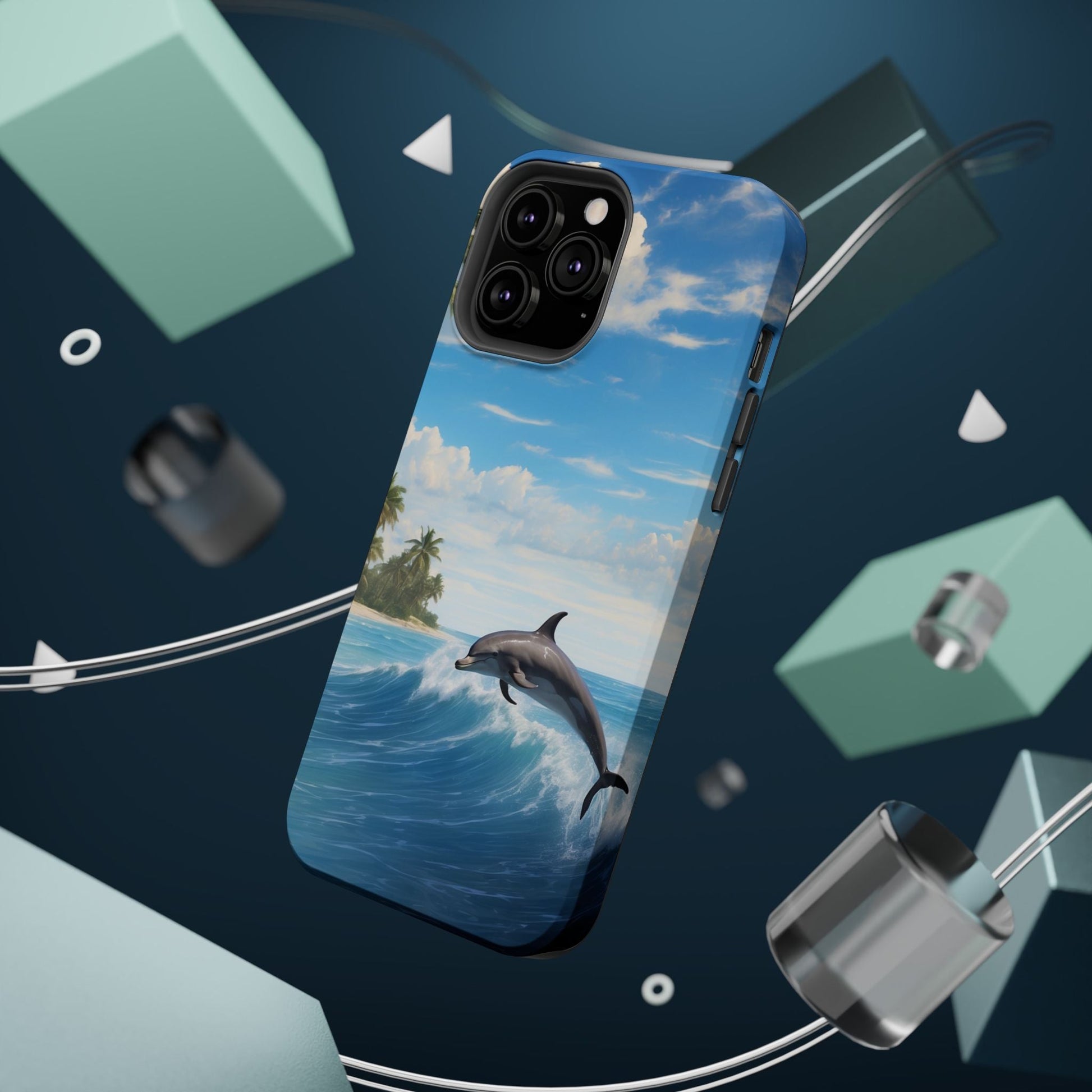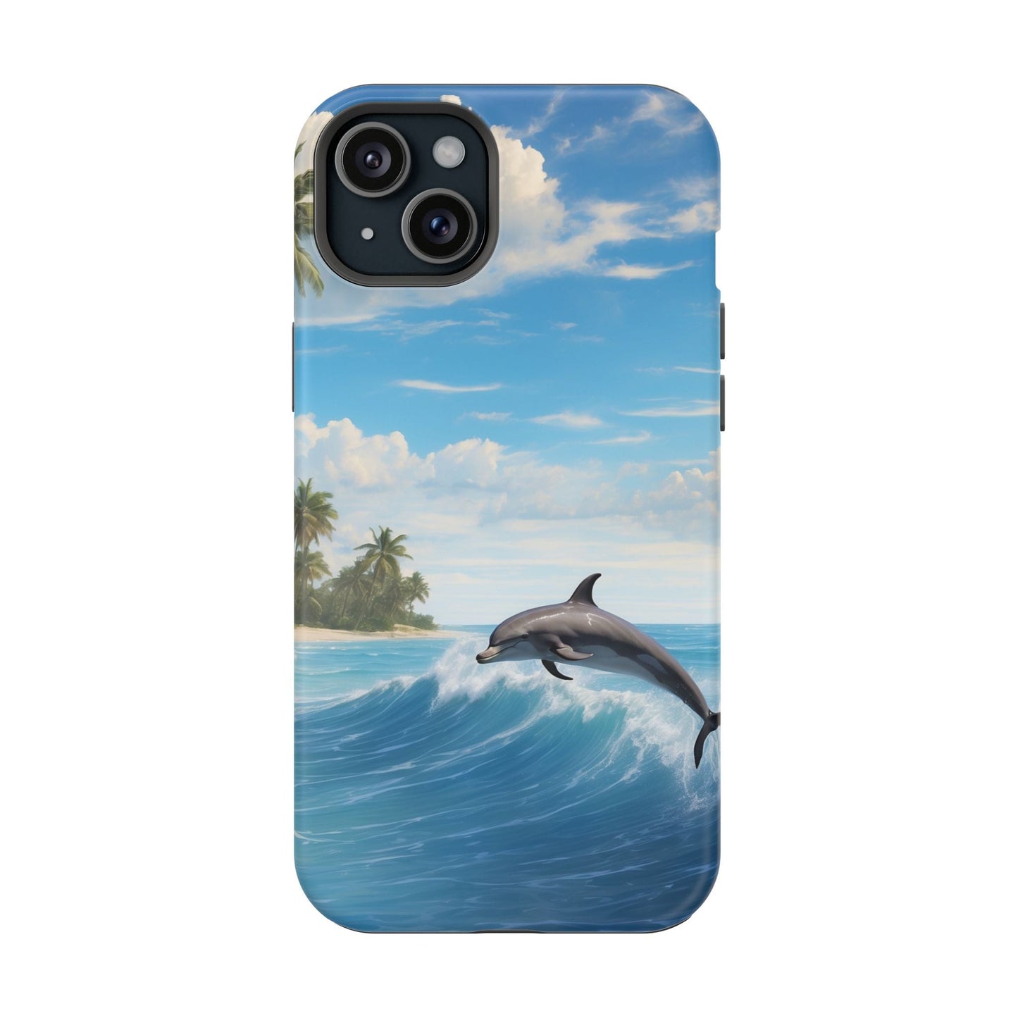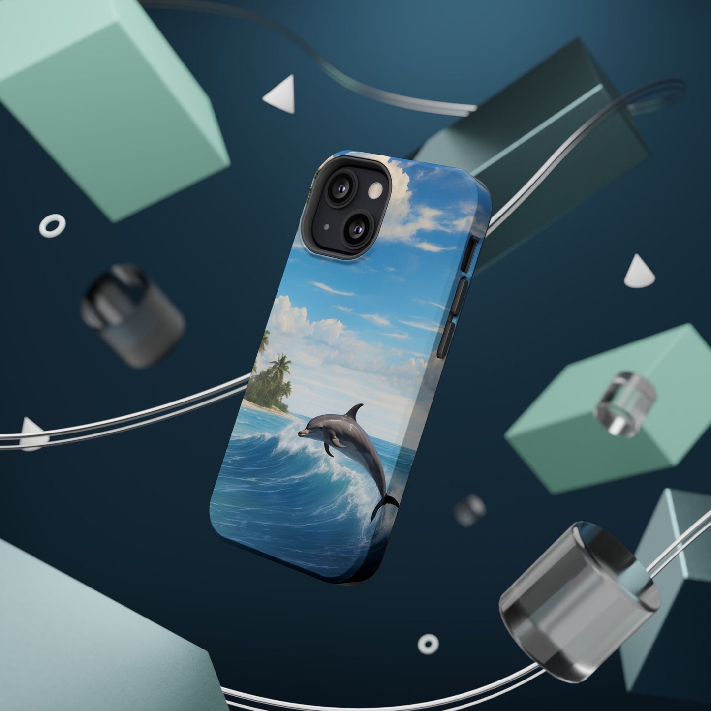 Ride the wave of convenience and style with this Tropical Surf Dolphin MagSafe Case! Featuring a majestic dolphin soaring over crystal-clear waves, this case brings a sense of freedom and ocean adventure to your device. With built-in MagSafe magnets for effortless wireless charging, plus a shockproof TPU bumper and hard polycarbonate shell, it’s both functional and stylish.
