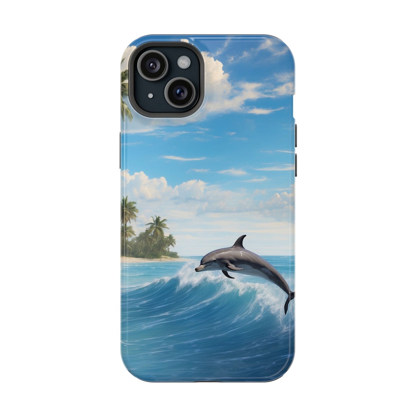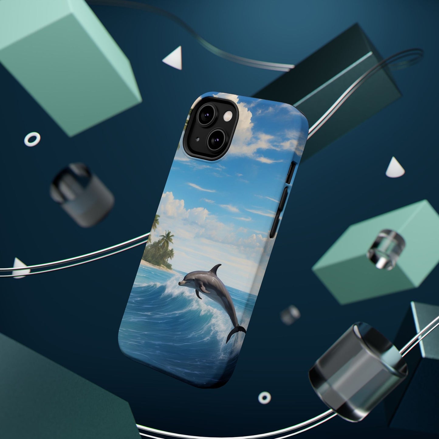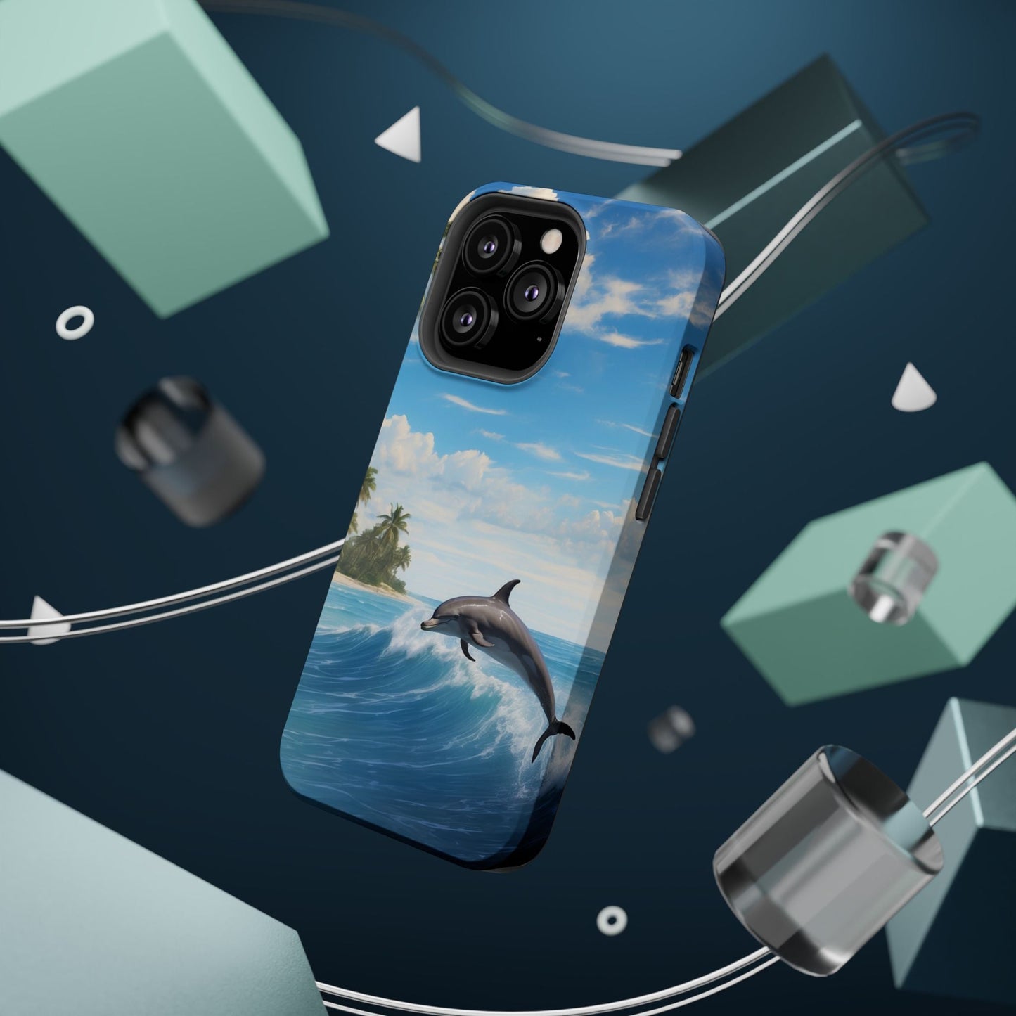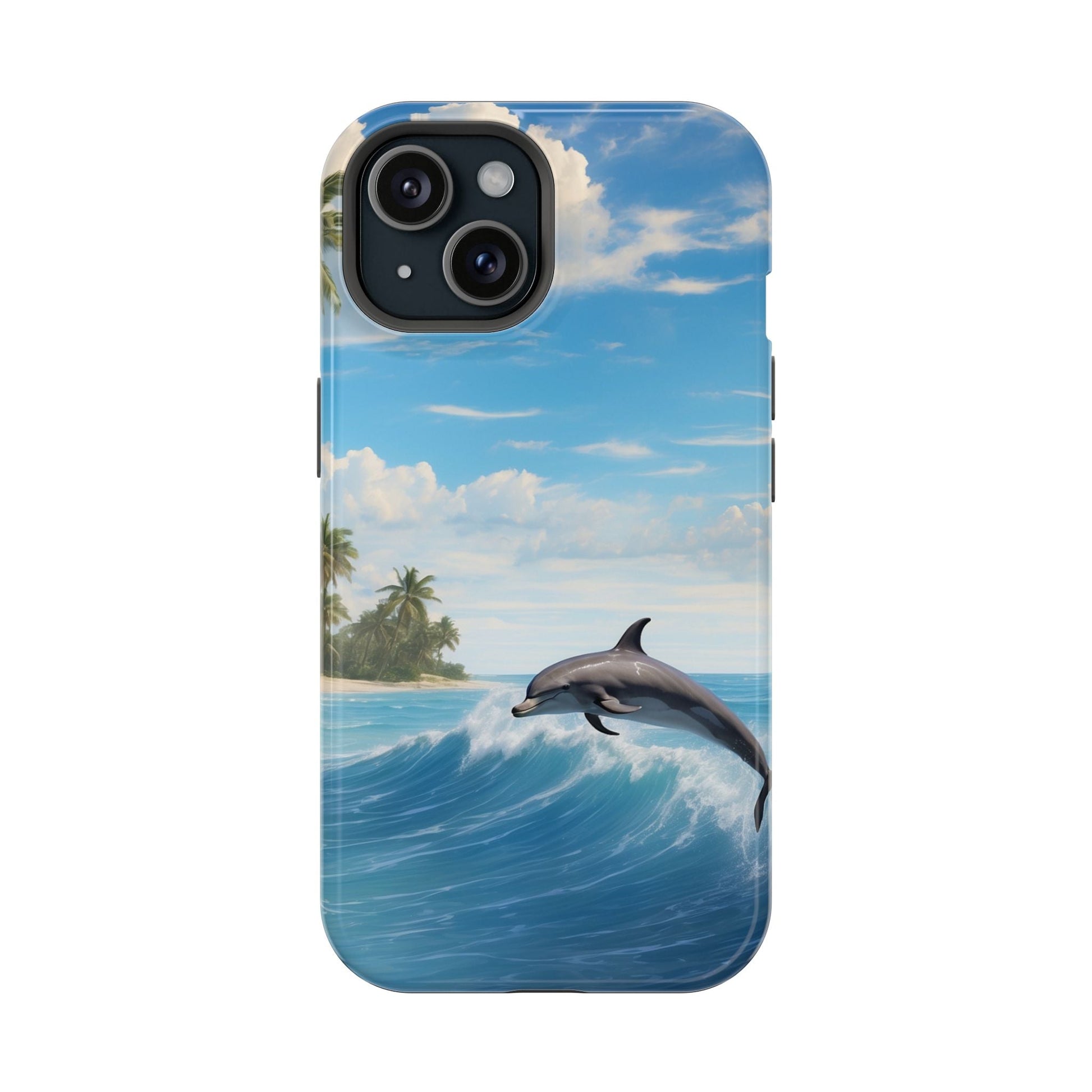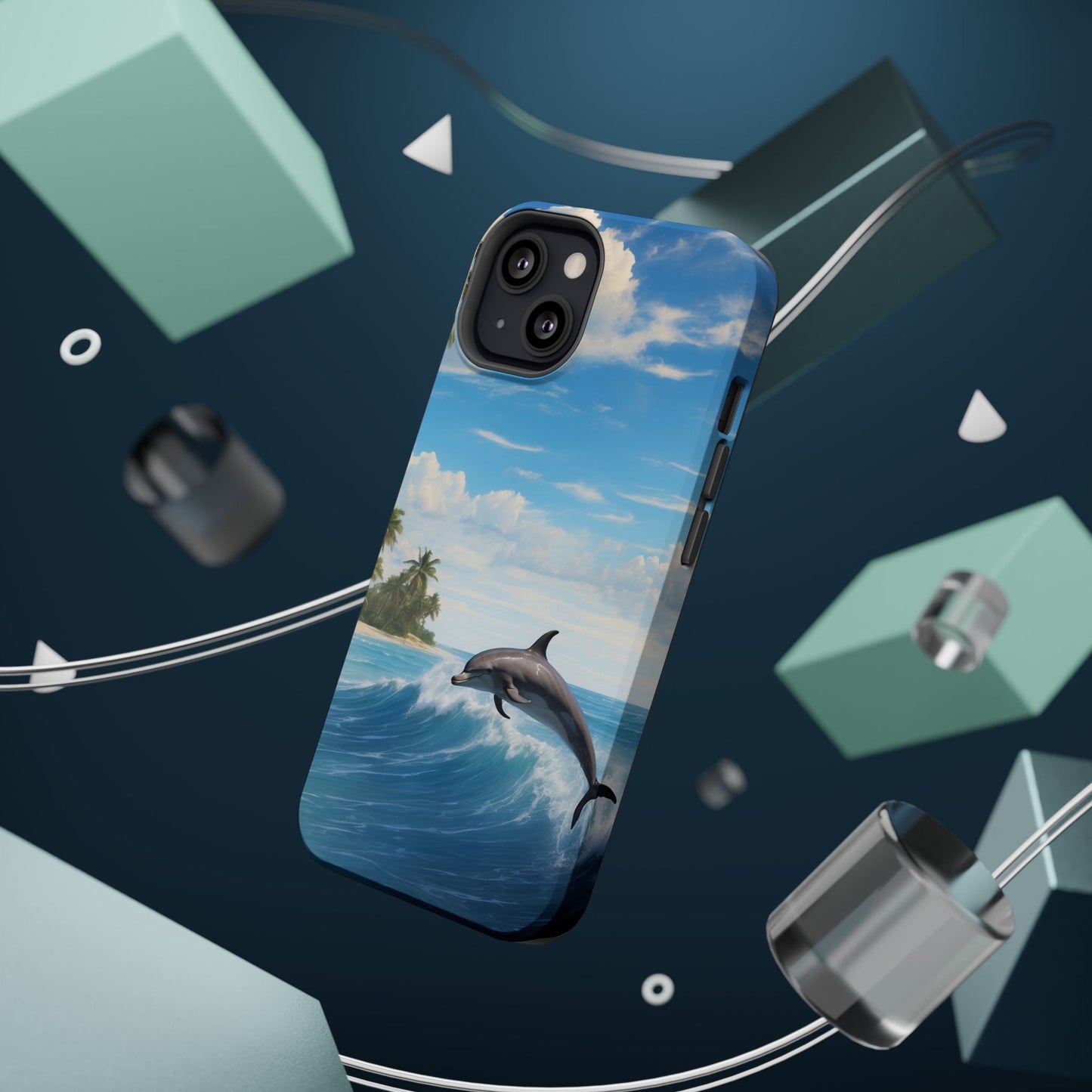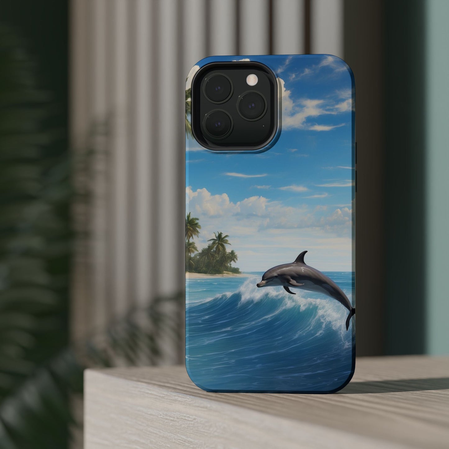 Ride the wave of convenience and style with this Tropical Surf Dolphin MagSafe Case! Featuring a majestic dolphin soaring over crystal-clear waves, this case brings a sense of freedom and ocean adventure to your device. With built-in MagSafe magnets for effortless wireless charging, plus a shockproof TPU bumper and hard polycarbonate shell, it’s both functional and stylish.