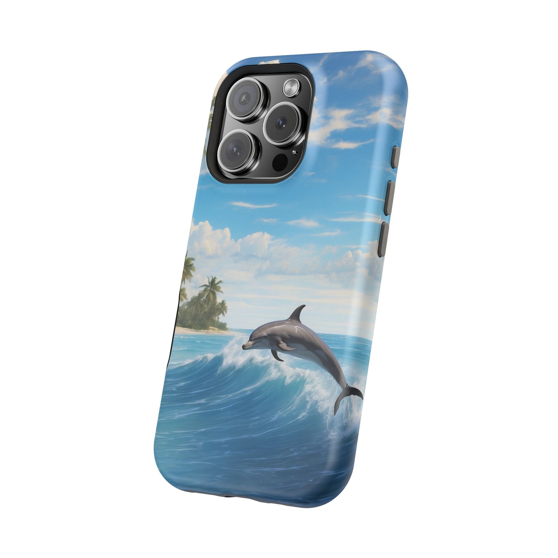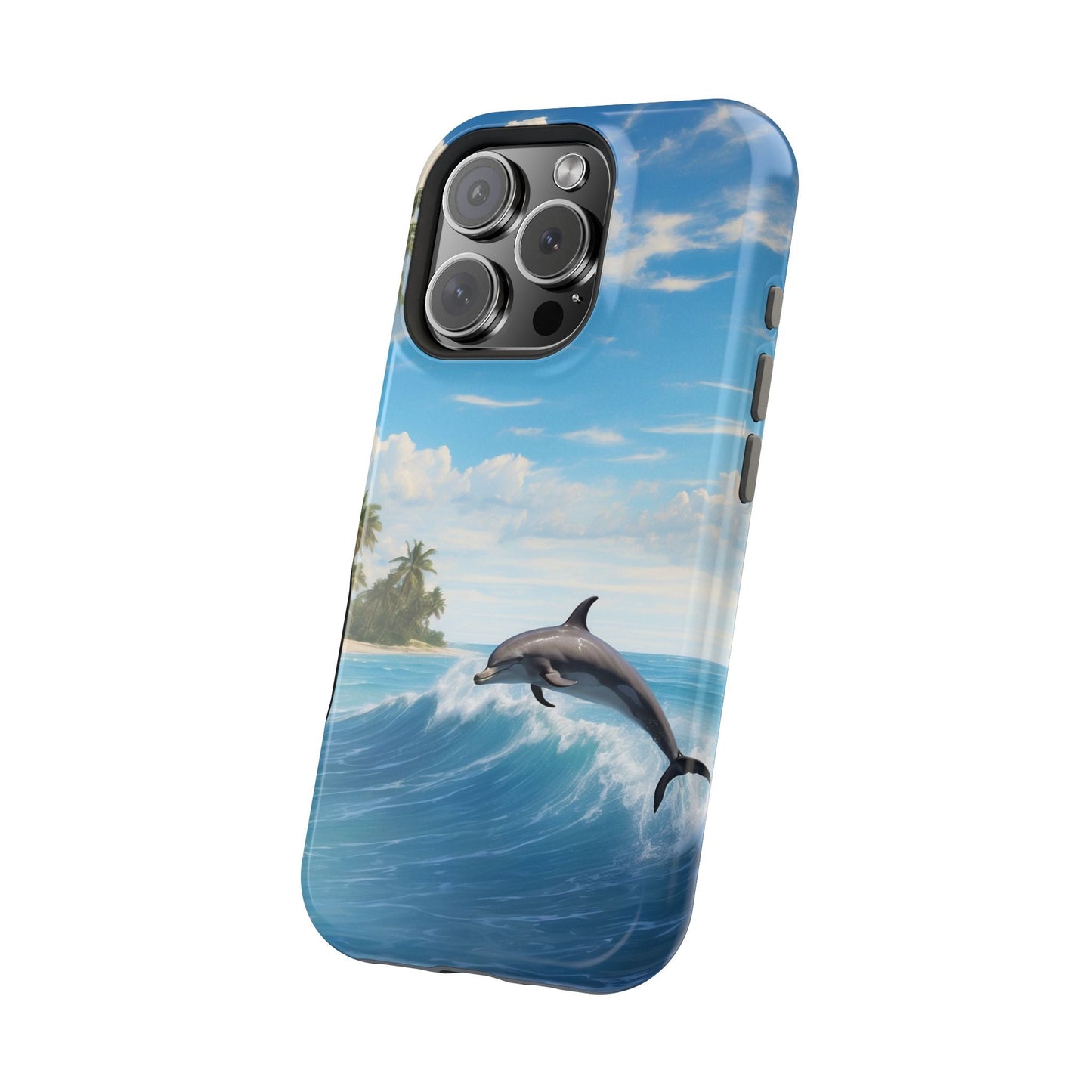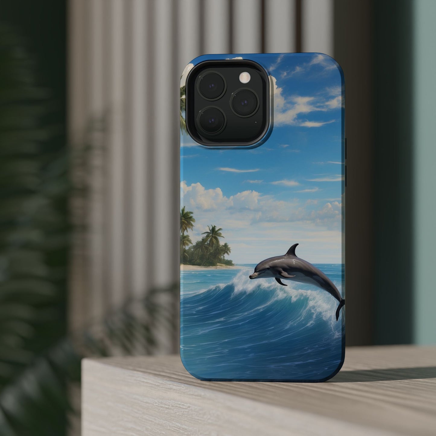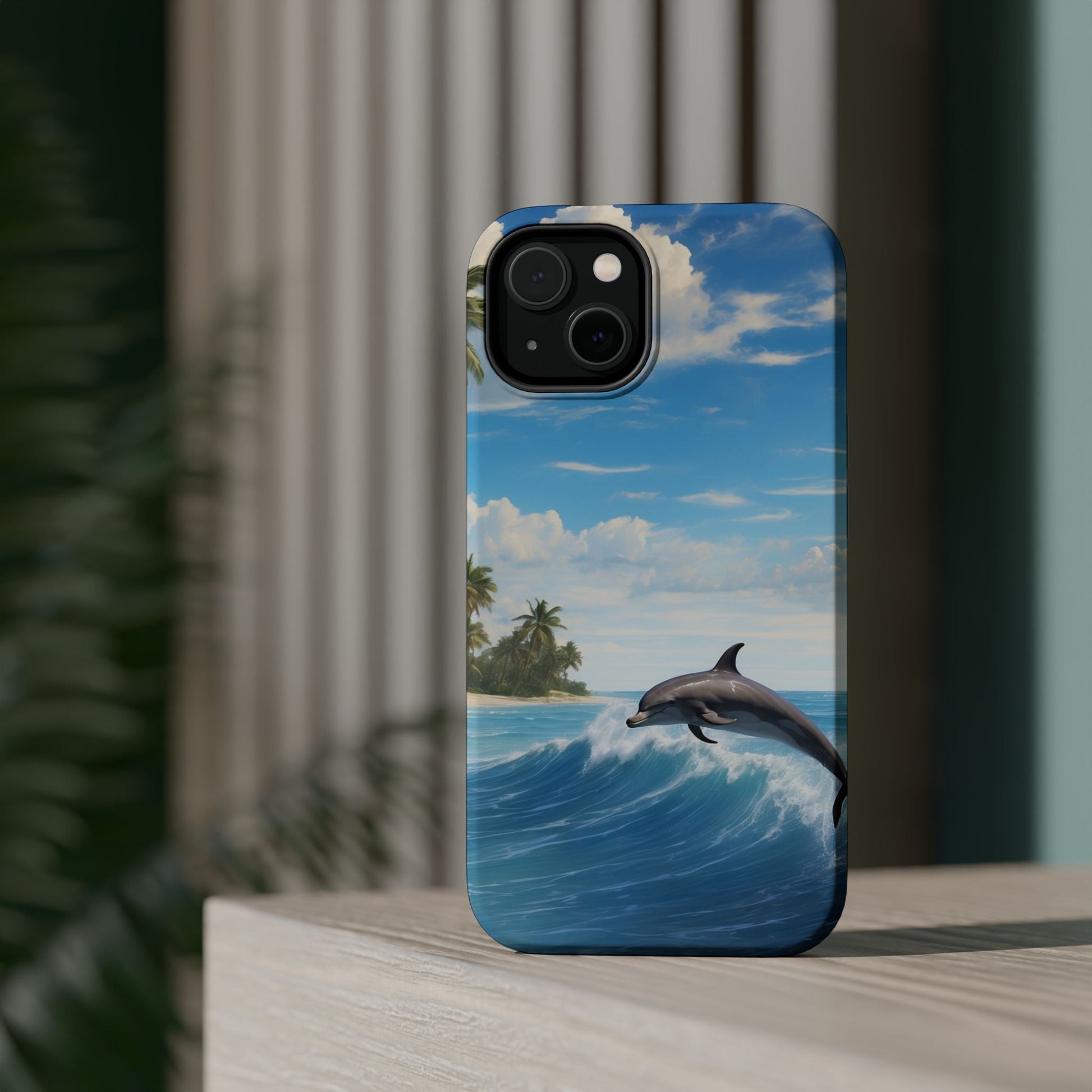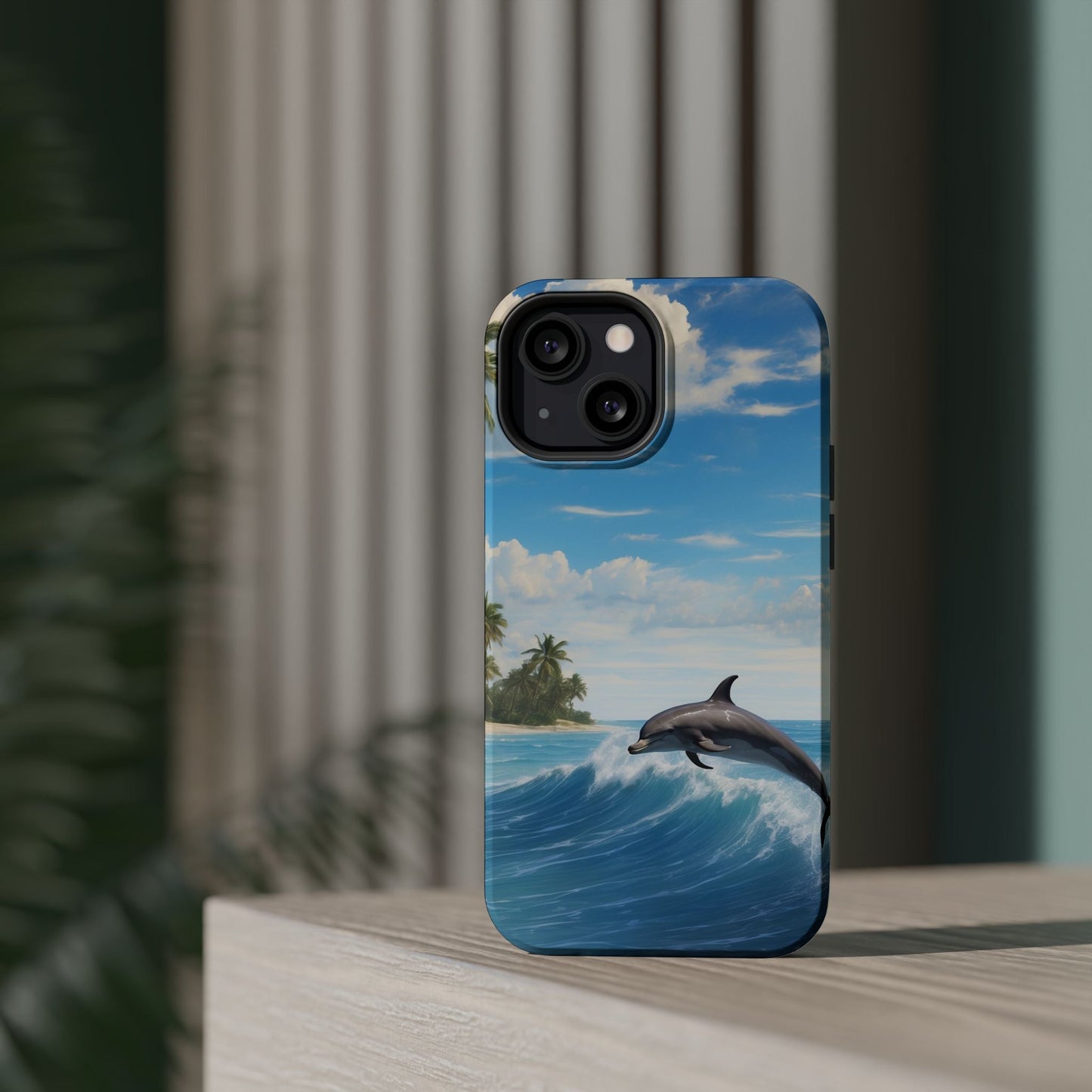 Ride the wave of convenience and style with this Tropical Surf Dolphin MagSafe Case! Featuring a majestic dolphin soaring over crystal-clear waves, this case brings a sense of freedom and ocean adventure to your device. With built-in MagSafe magnets for effortless wireless charging, plus a shockproof TPU bumper and hard polycarbonate shell, it’s both functional and stylish.