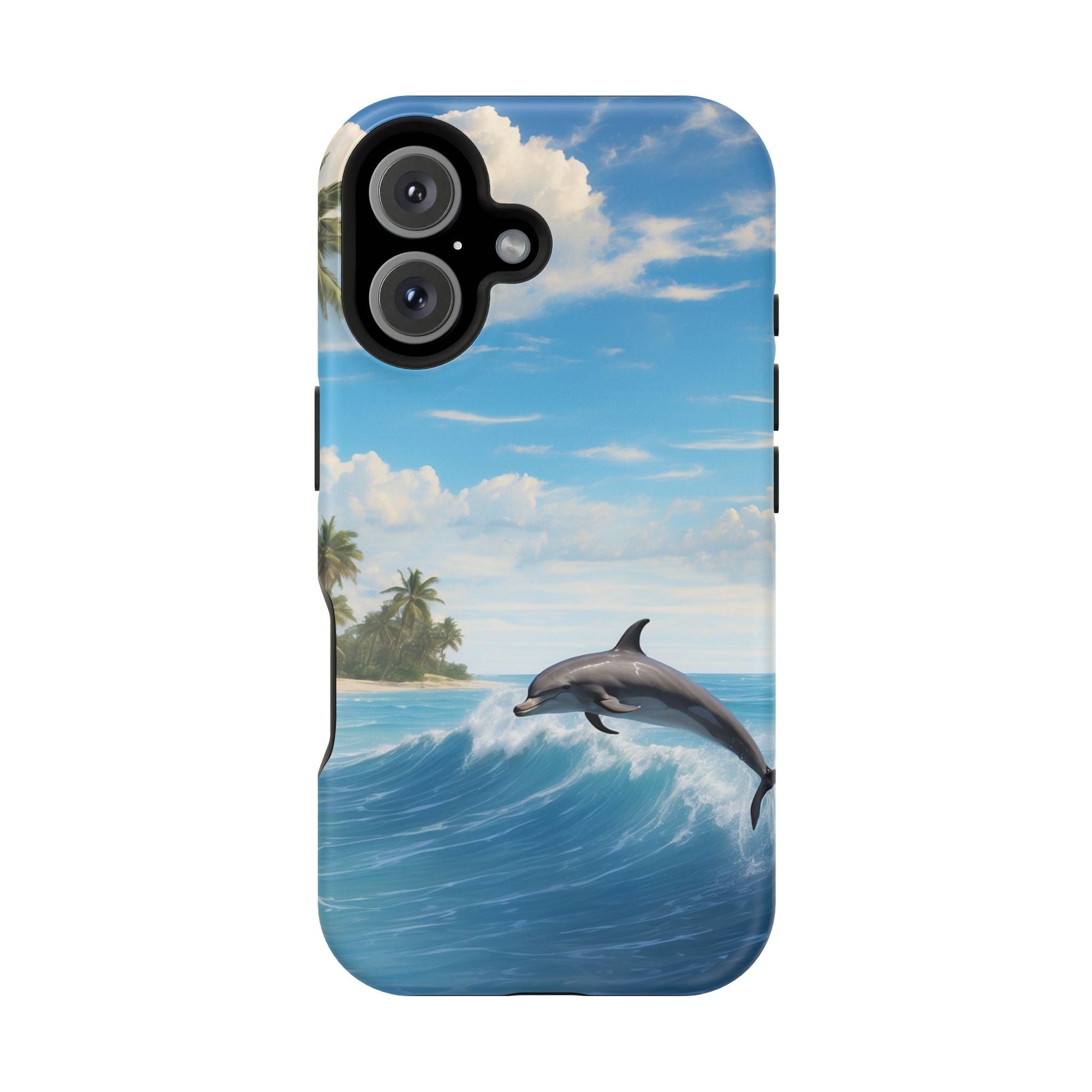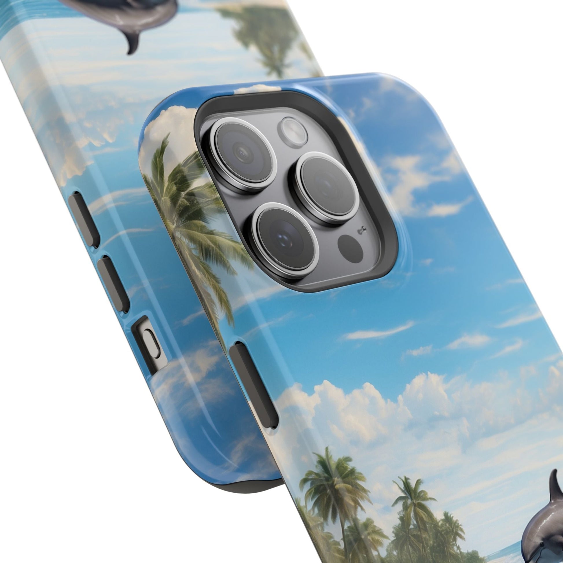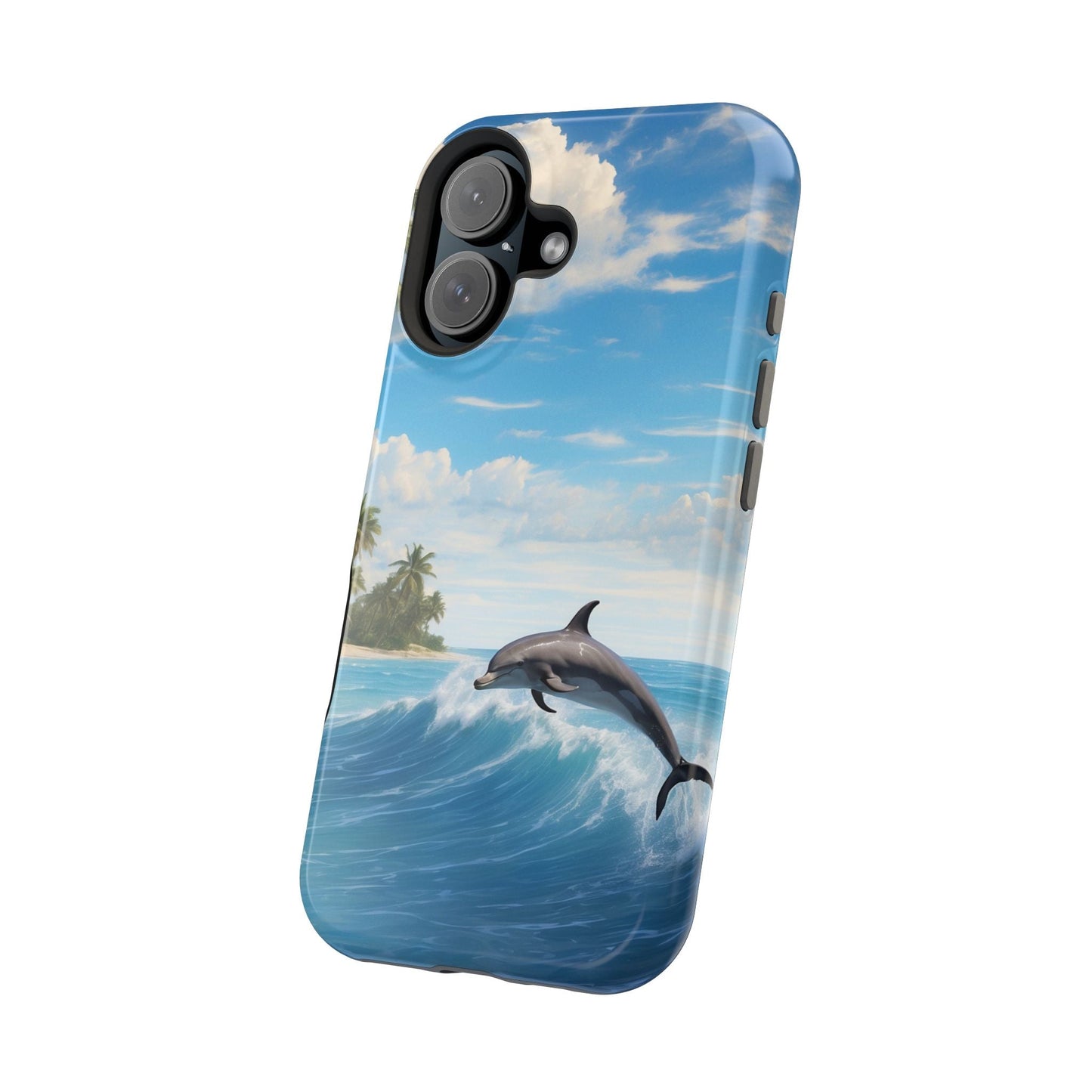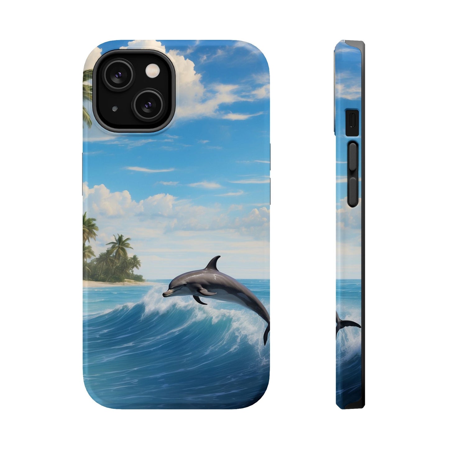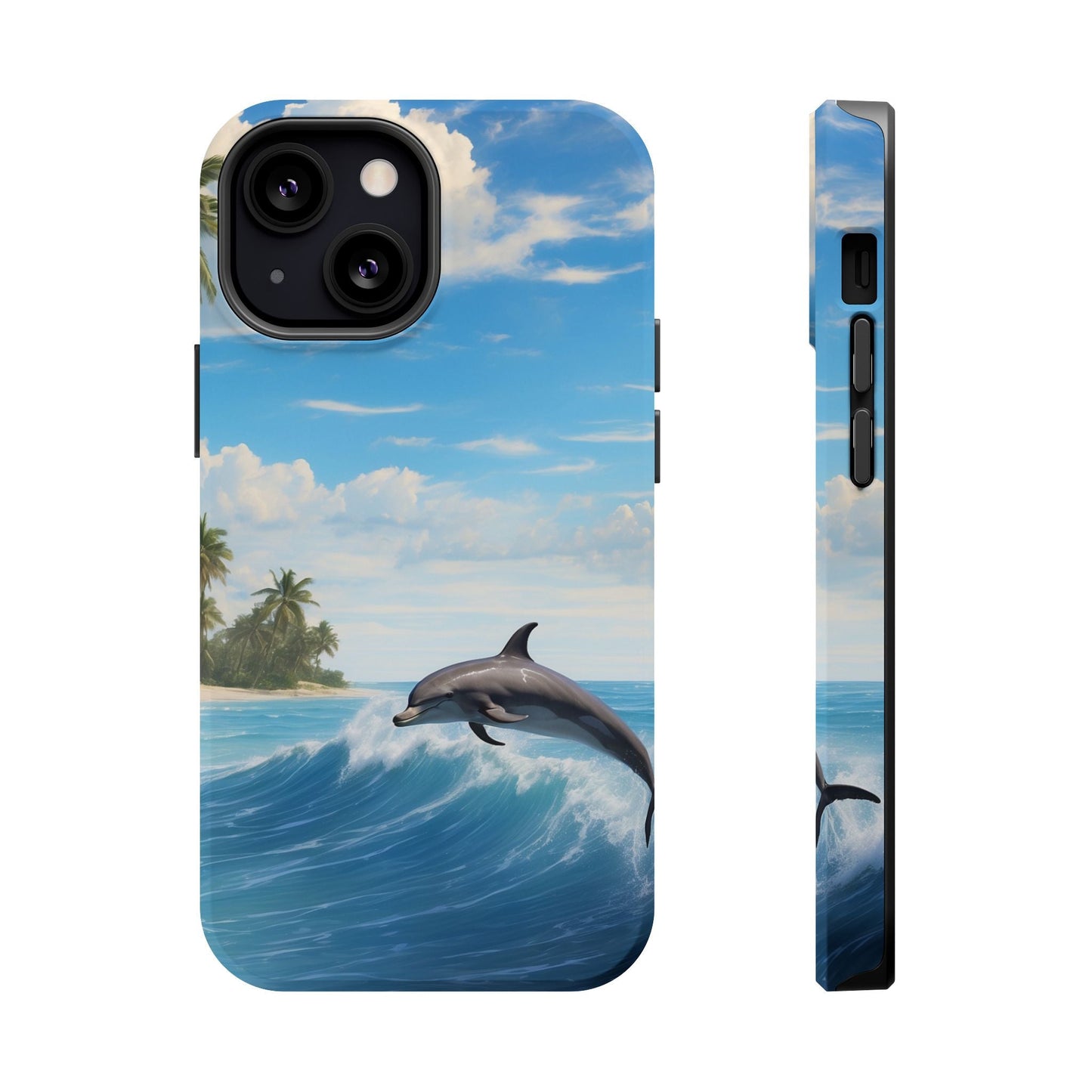 Ride the wave of convenience and style with this Tropical Surf Dolphin MagSafe Case! Featuring a majestic dolphin soaring over crystal-clear waves, this case brings a sense of freedom and ocean adventure to your device. With built-in MagSafe magnets for effortless wireless charging, plus a shockproof TPU bumper and hard polycarbonate shell, it’s both functional and stylish.