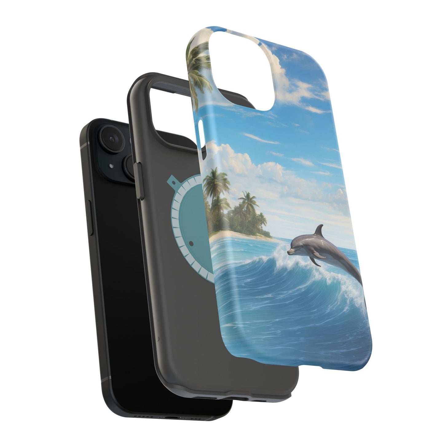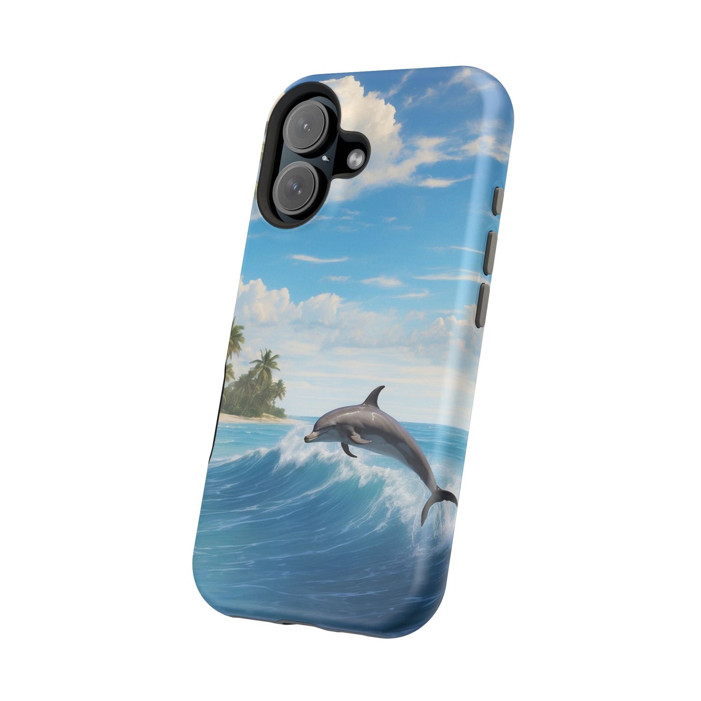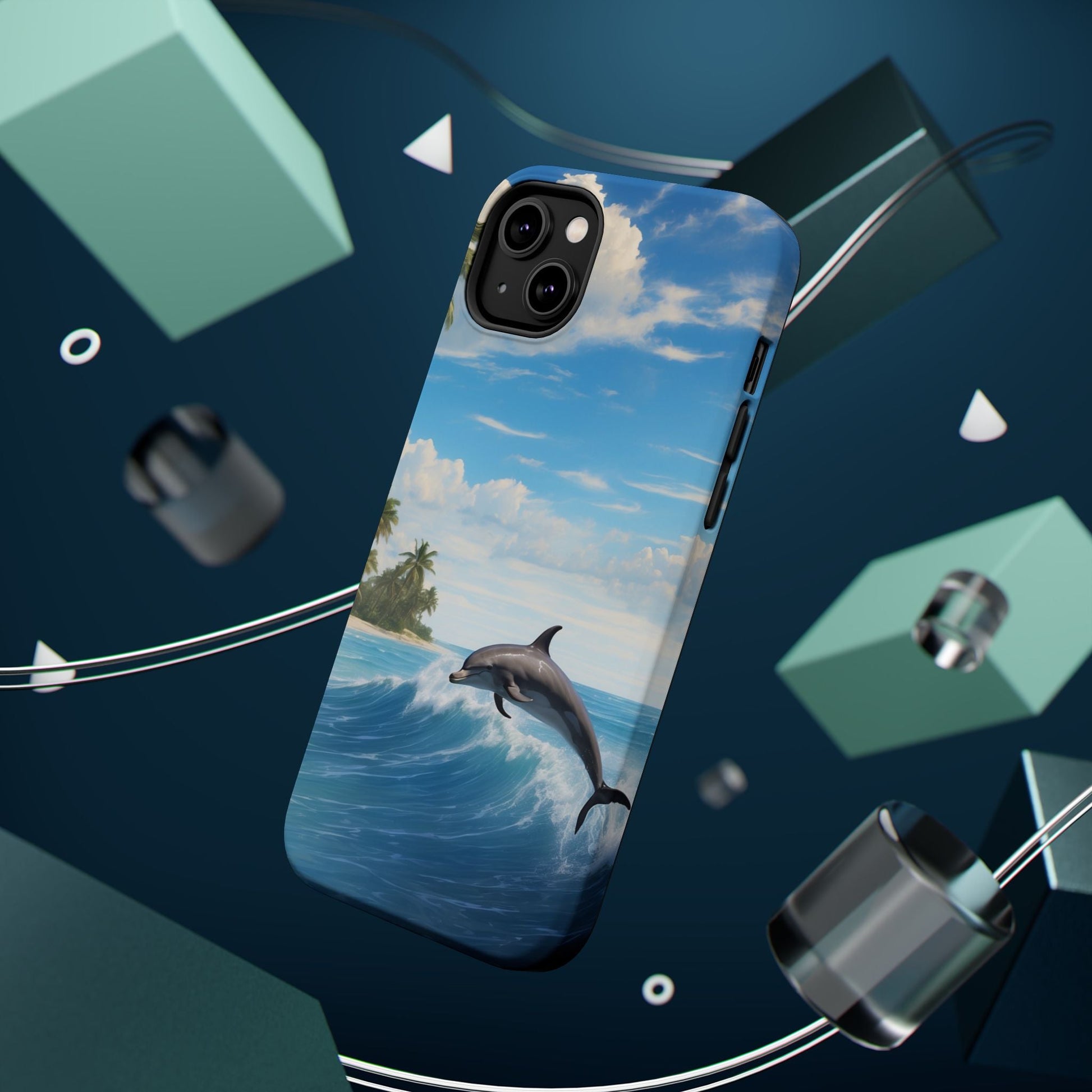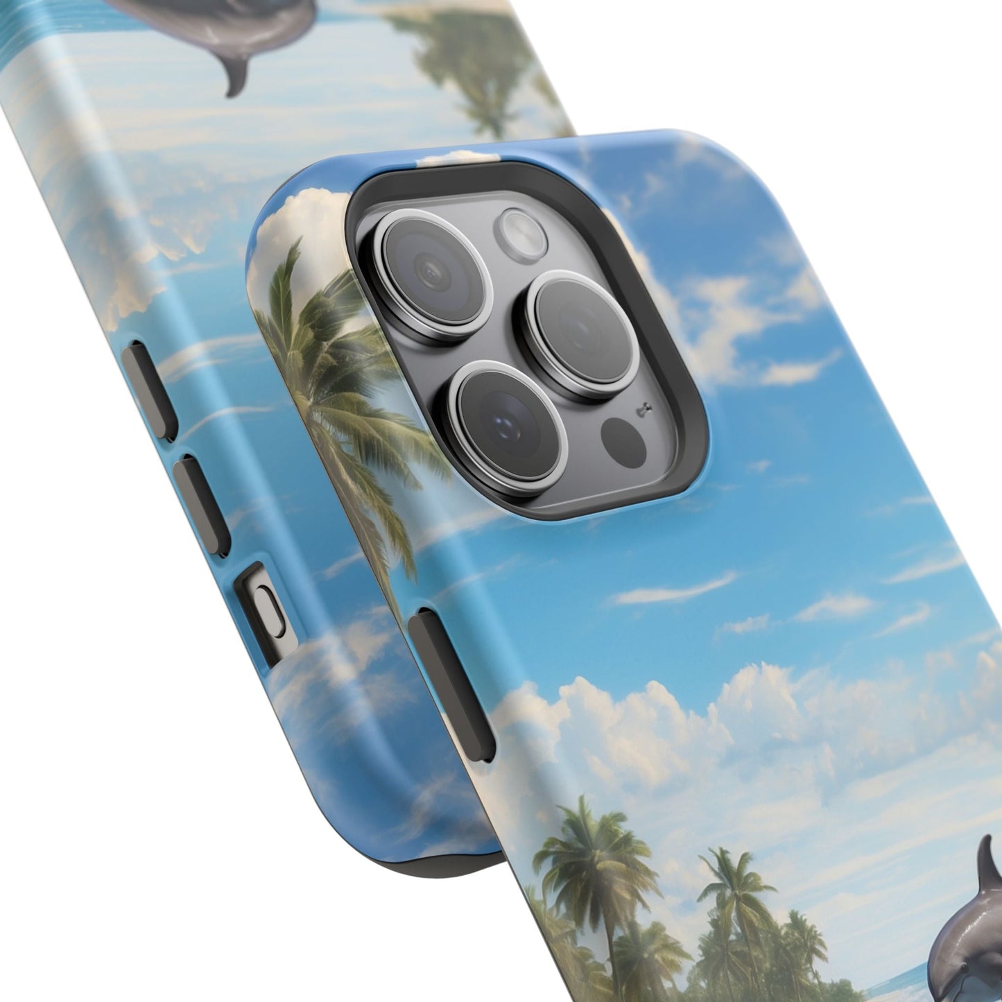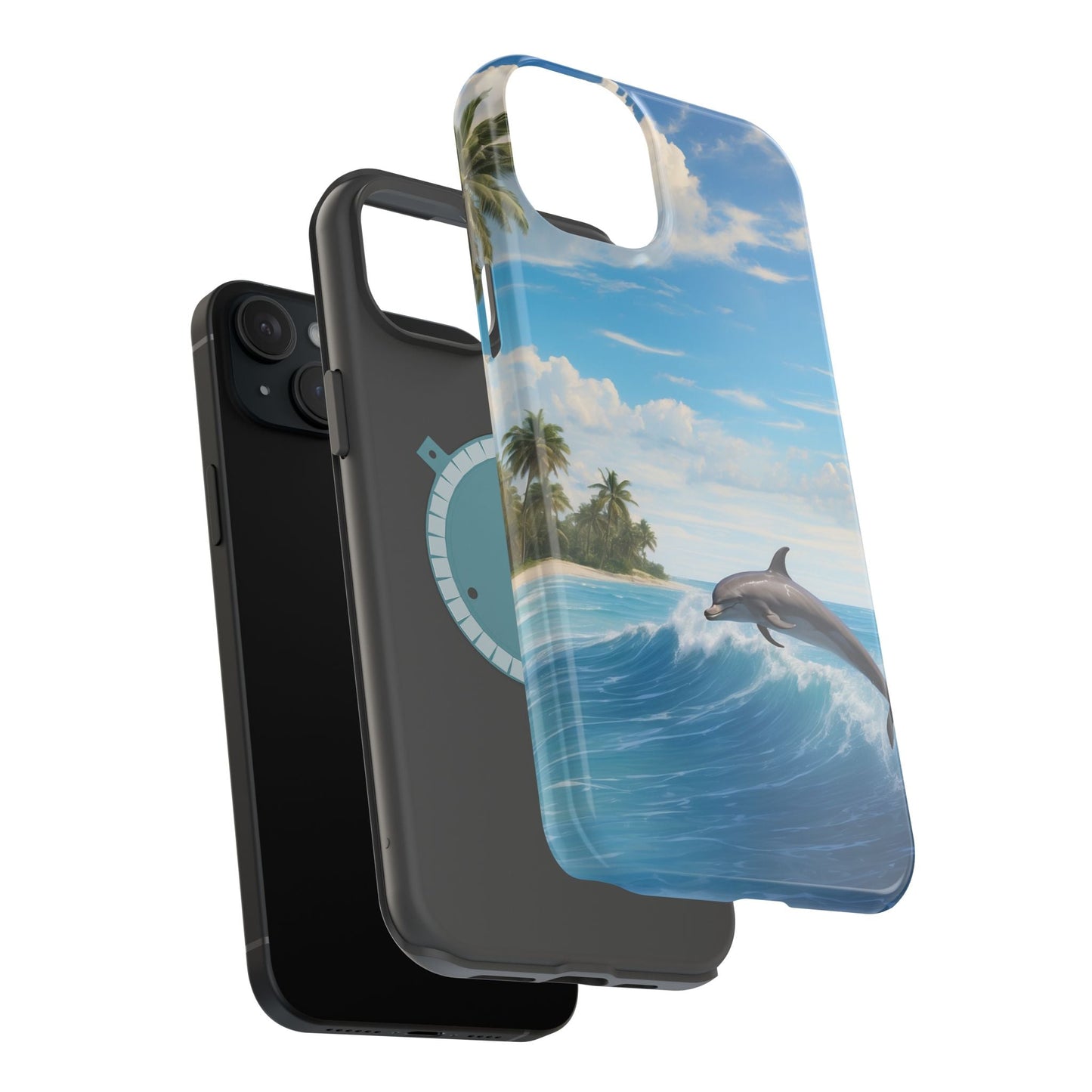 Ride the wave of convenience and style with this Tropical Surf Dolphin MagSafe Case! Featuring a majestic dolphin soaring over crystal-clear waves, this case brings a sense of freedom and ocean adventure to your device. With built-in MagSafe magnets for effortless wireless charging, plus a shockproof TPU bumper and hard polycarbonate shell, it’s both functional and stylish.