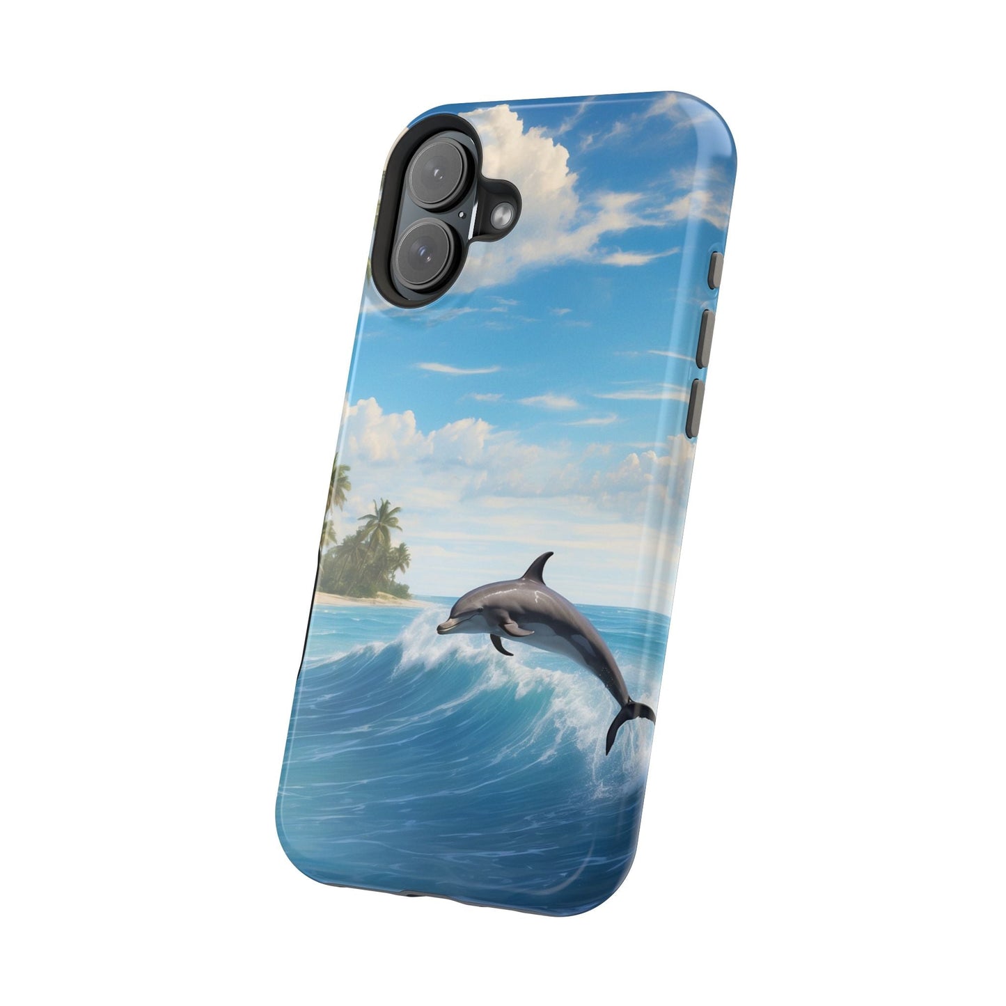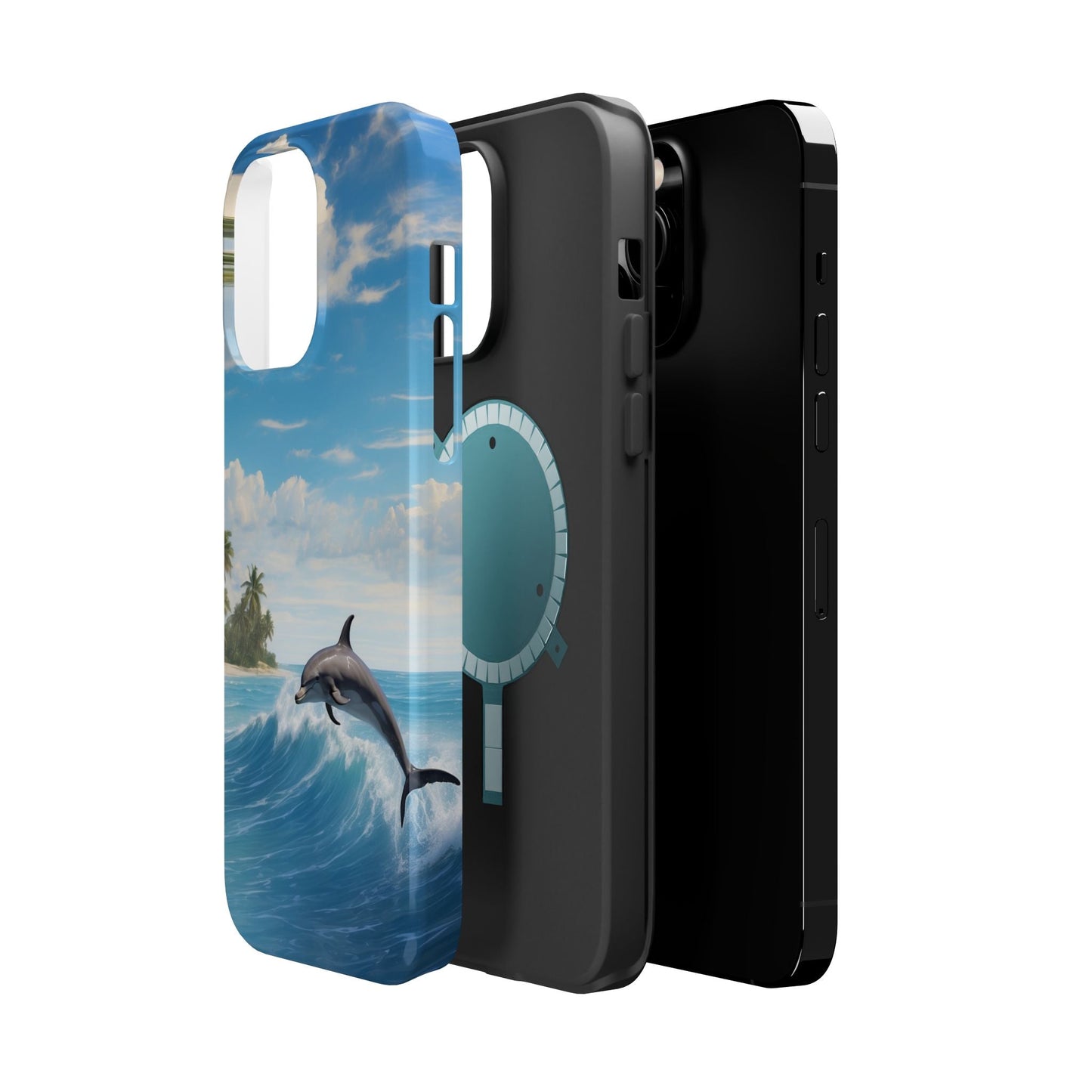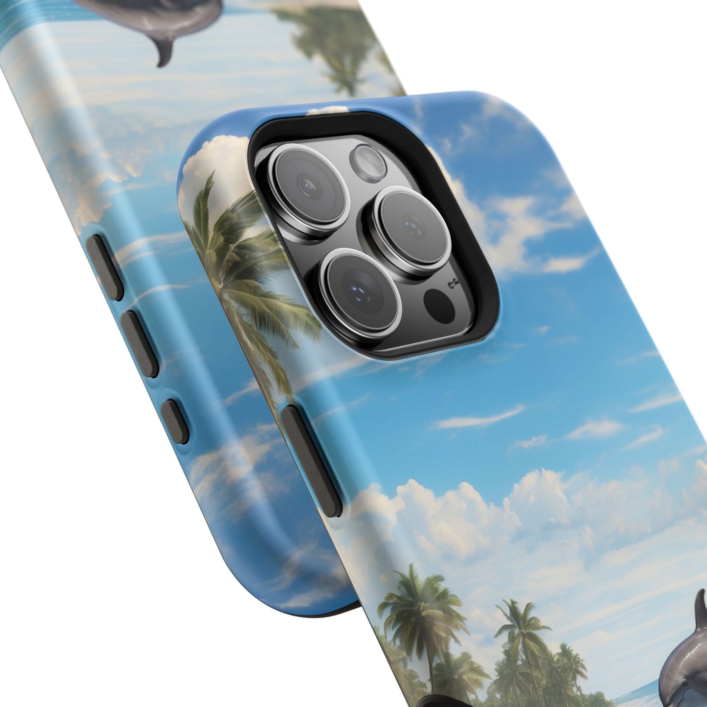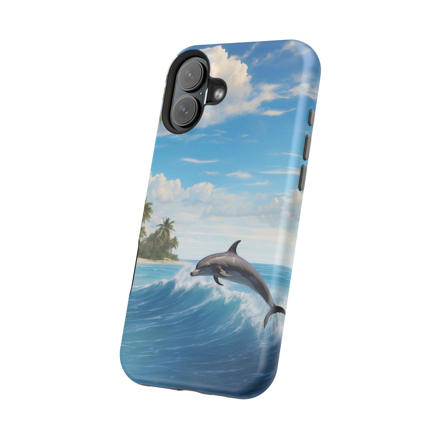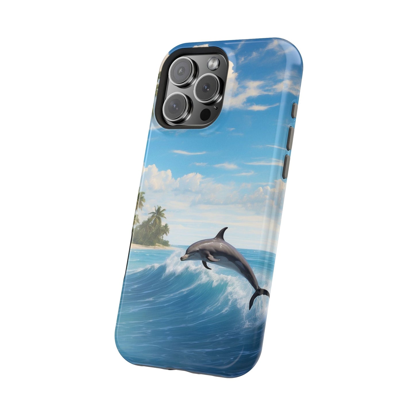 Ride the wave of convenience and style with this Tropical Surf Dolphin MagSafe Case! Featuring a majestic dolphin soaring over crystal-clear waves, this case brings a sense of freedom and ocean adventure to your device. With built-in MagSafe magnets for effortless wireless charging, plus a shockproof TPU bumper and hard polycarbonate shell, it’s both functional and stylish.