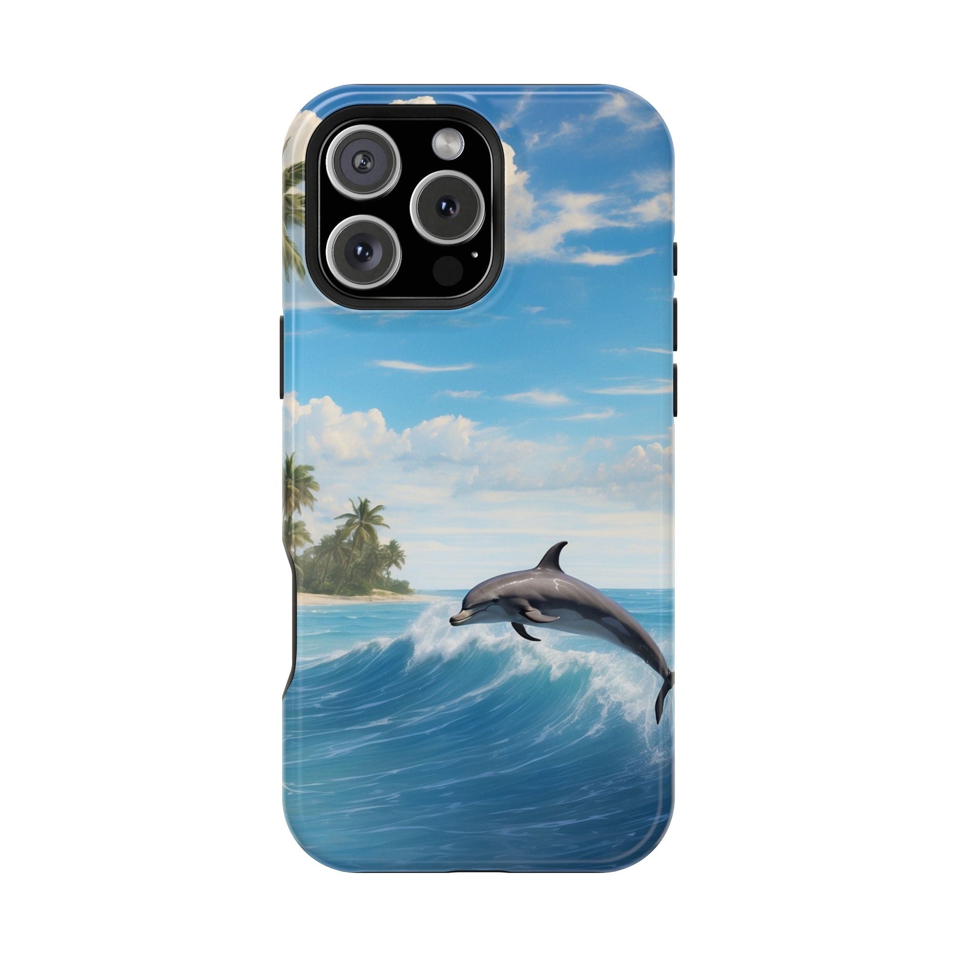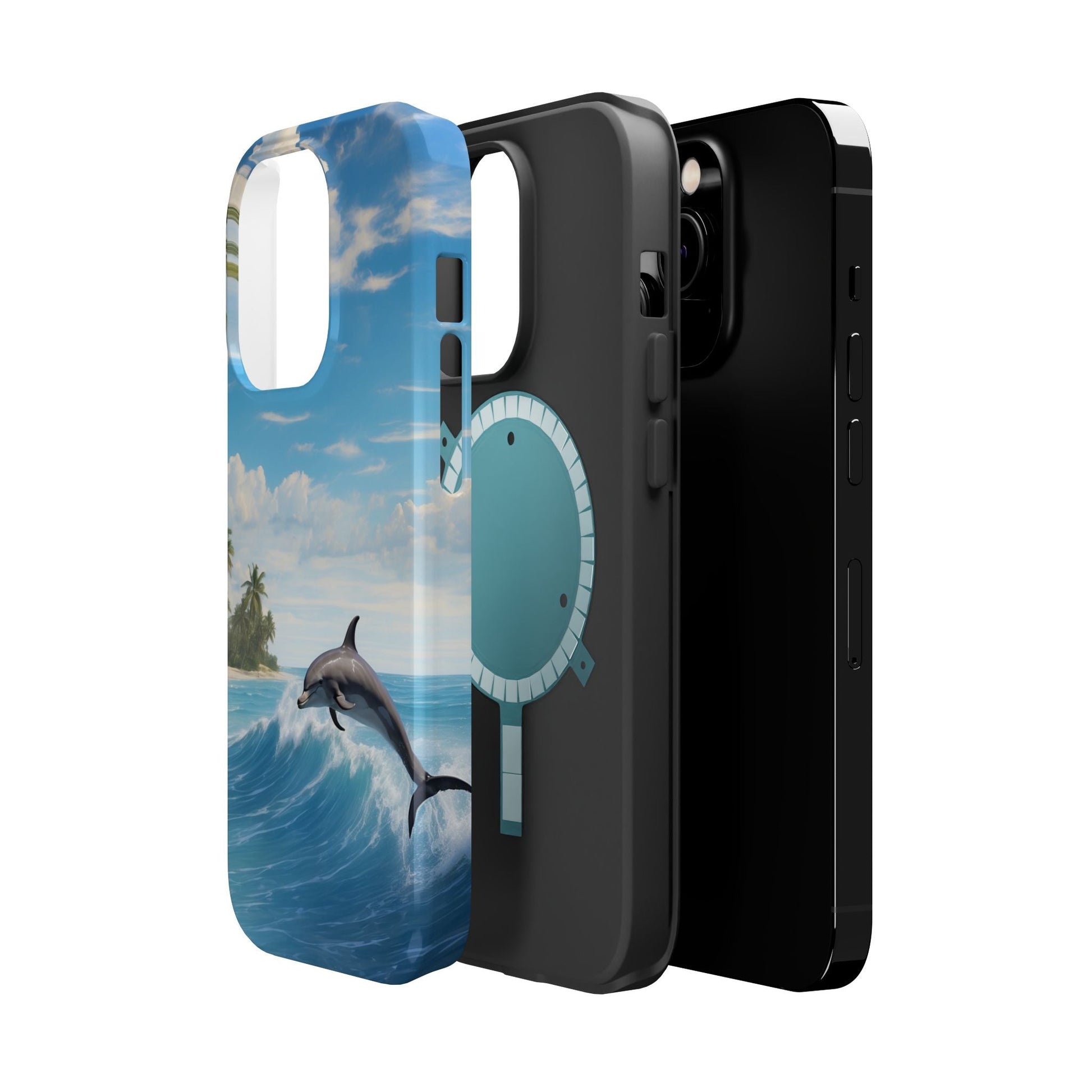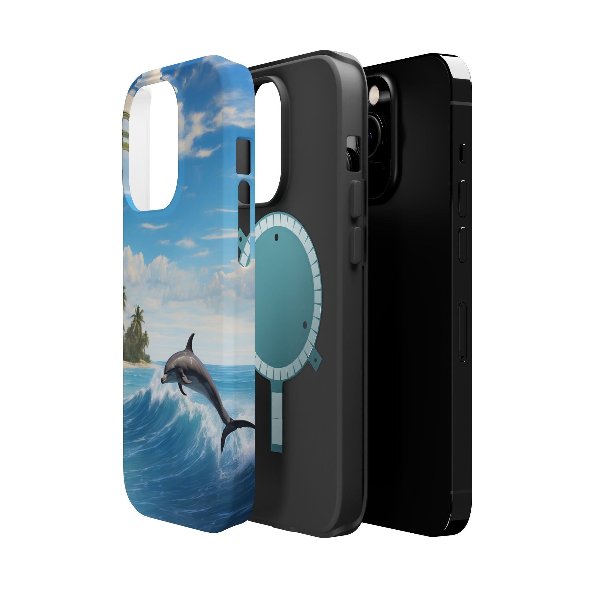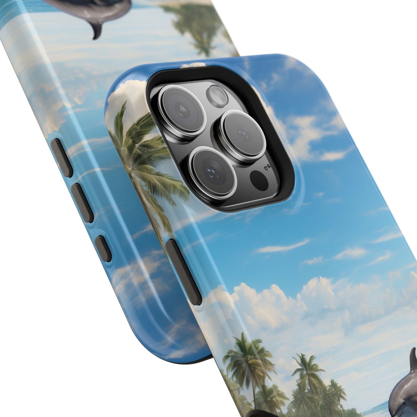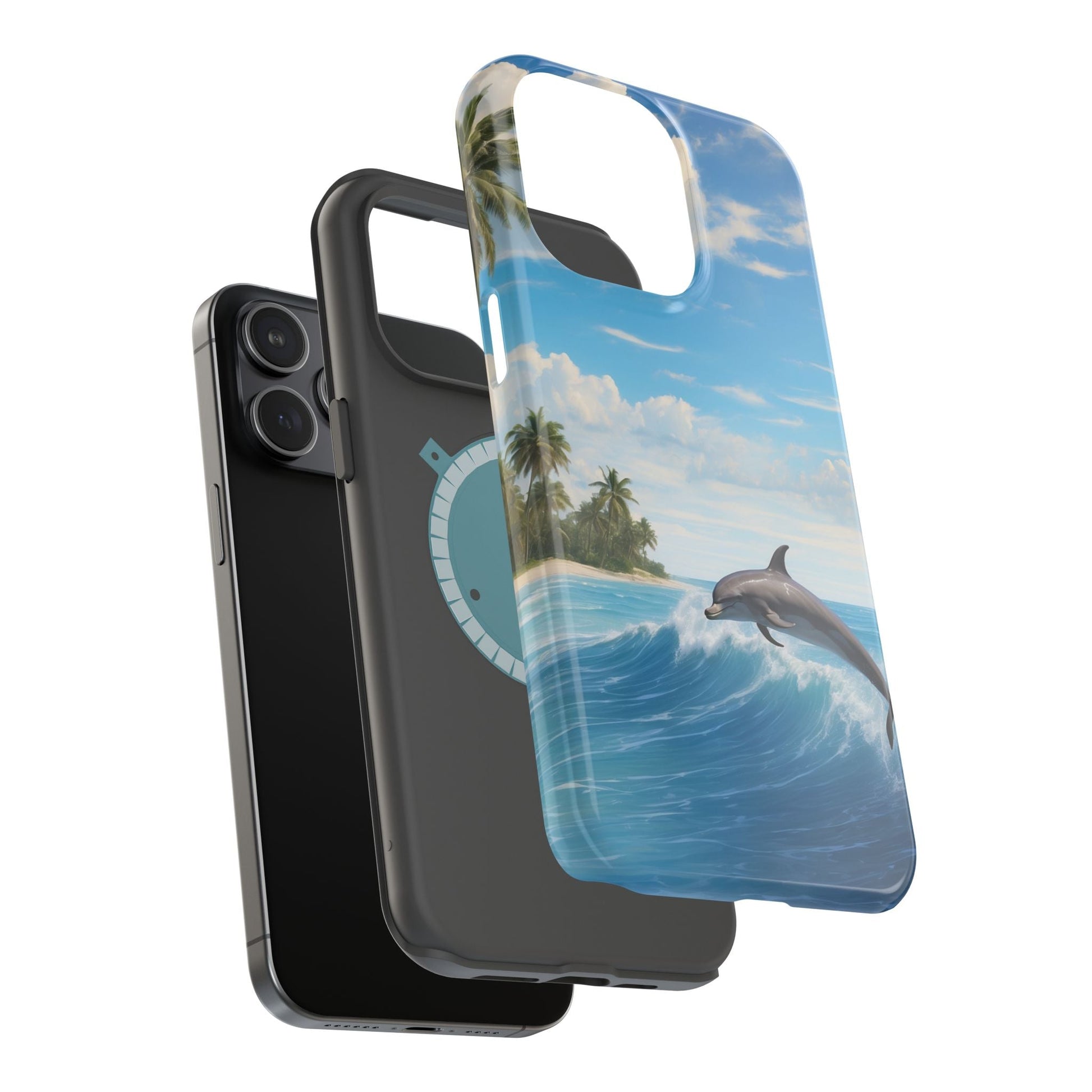 Ride the wave of convenience and style with this Tropical Surf Dolphin MagSafe Case! Featuring a majestic dolphin soaring over crystal-clear waves, this case brings a sense of freedom and ocean adventure to your device. With built-in MagSafe magnets for effortless wireless charging, plus a shockproof TPU bumper and hard polycarbonate shell, it’s both functional and stylish.