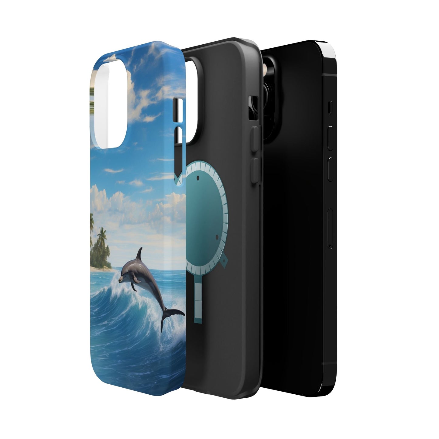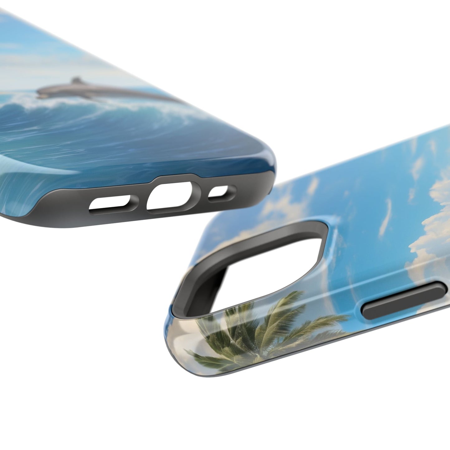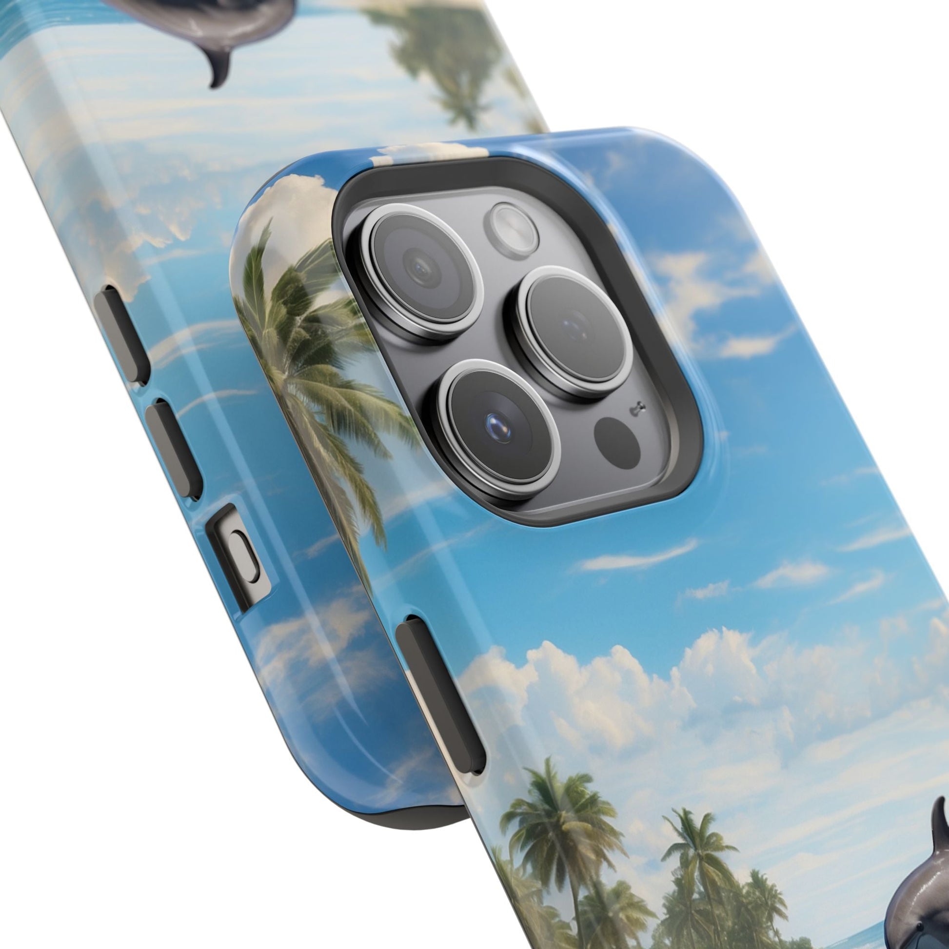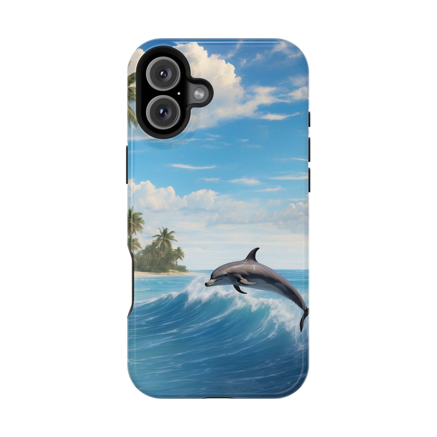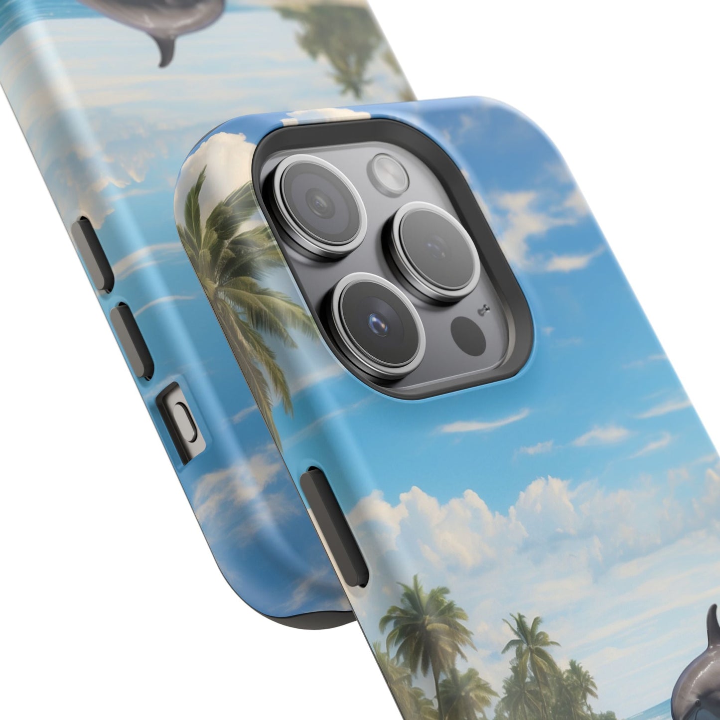 Ride the wave of convenience and style with this Tropical Surf Dolphin MagSafe Case! Featuring a majestic dolphin soaring over crystal-clear waves, this case brings a sense of freedom and ocean adventure to your device. With built-in MagSafe magnets for effortless wireless charging, plus a shockproof TPU bumper and hard polycarbonate shell, it’s both functional and stylish.