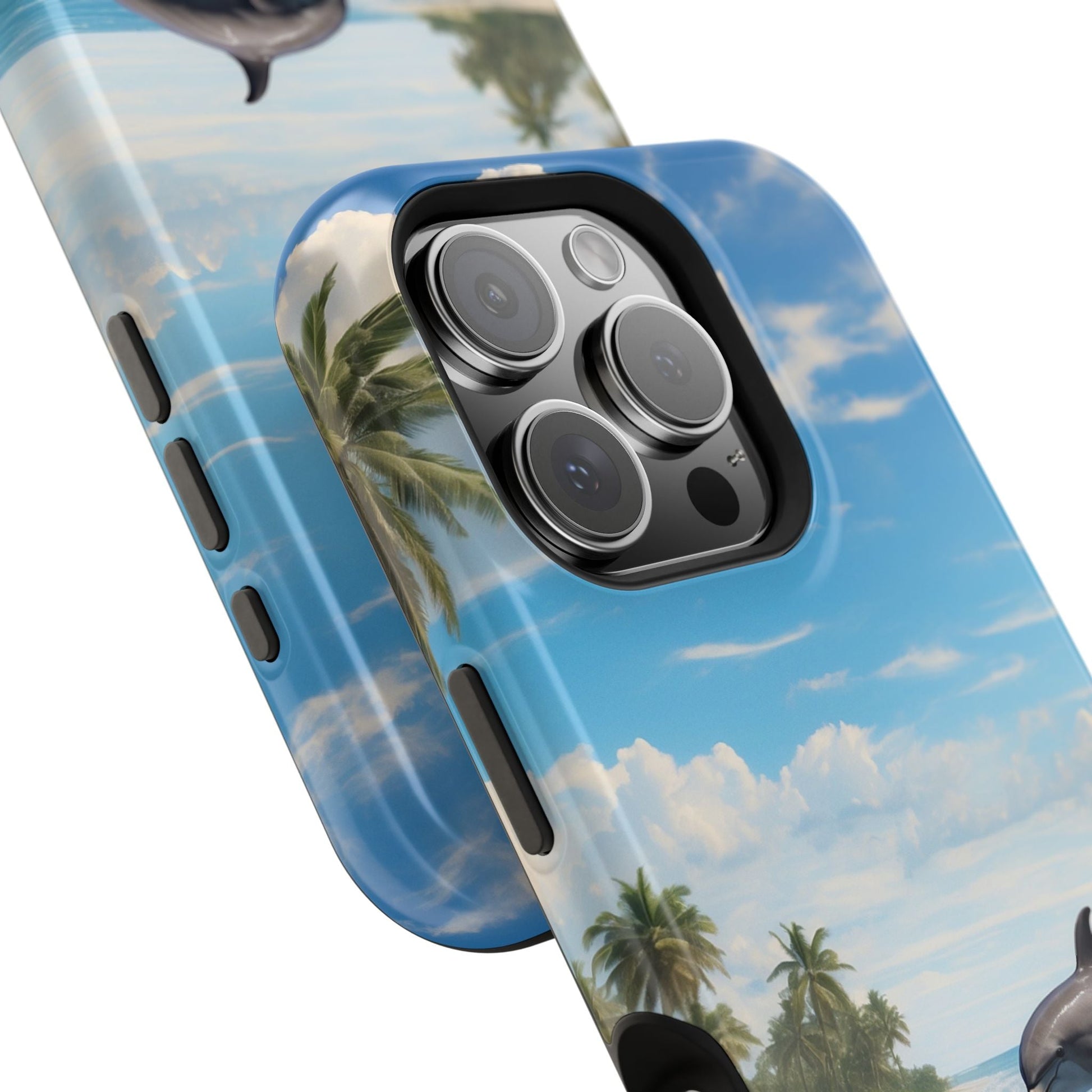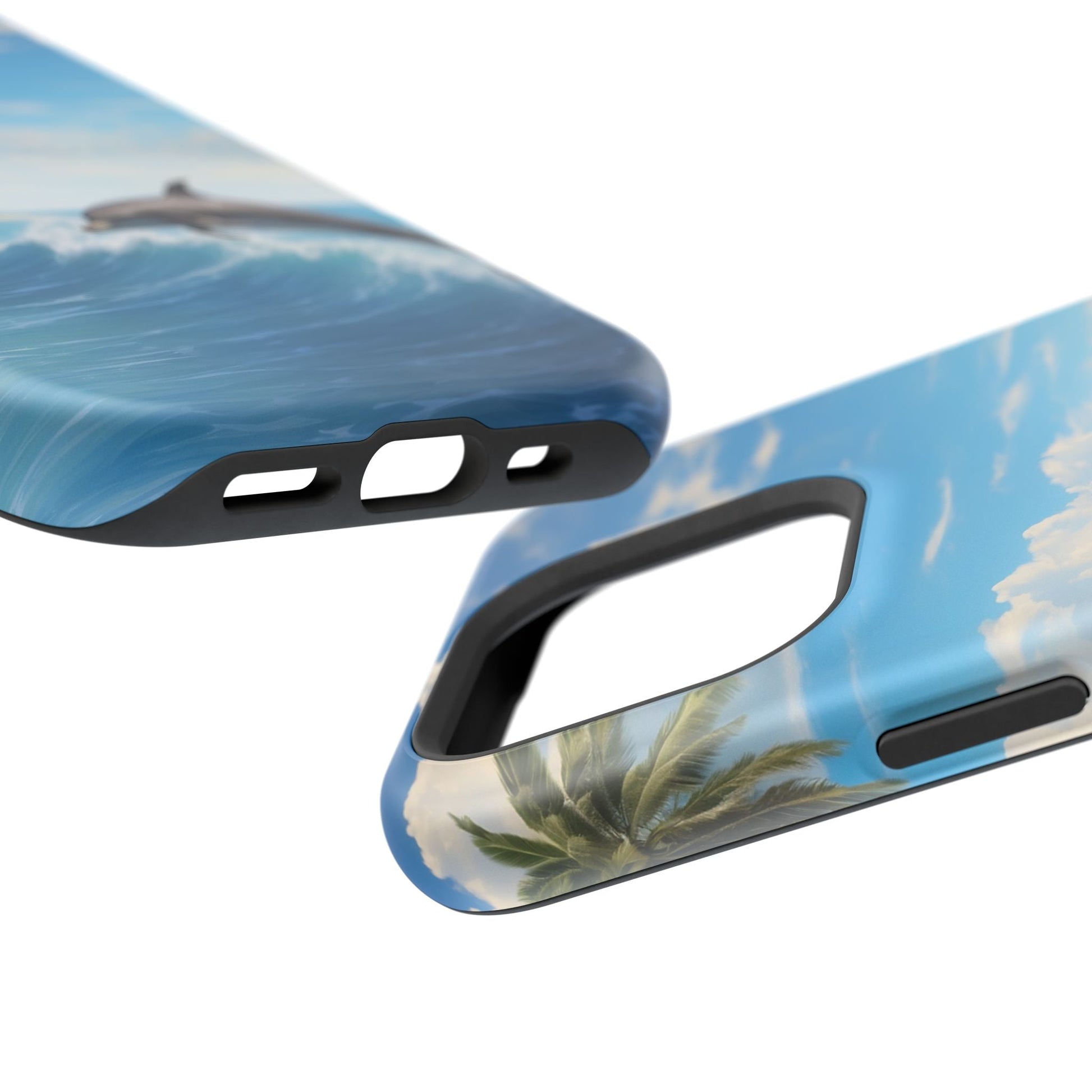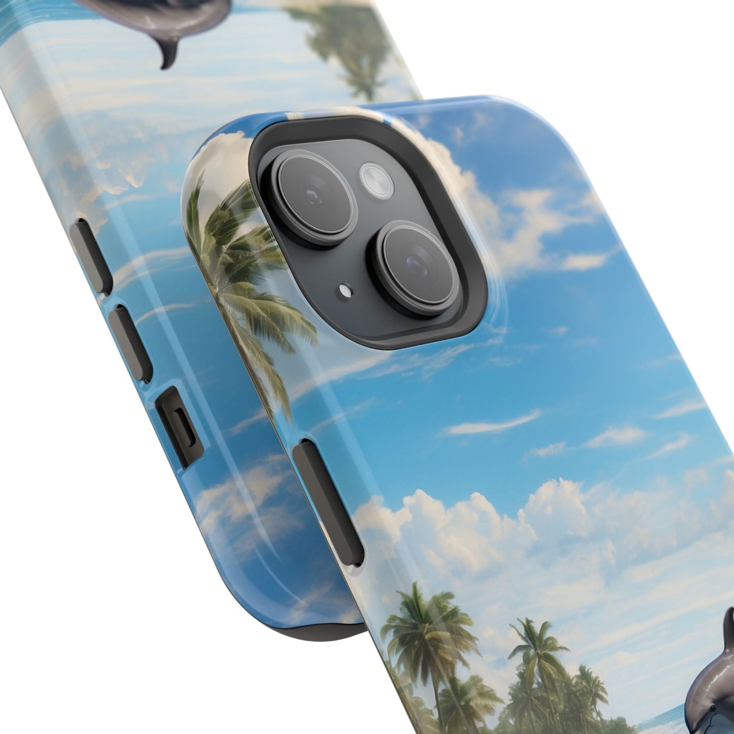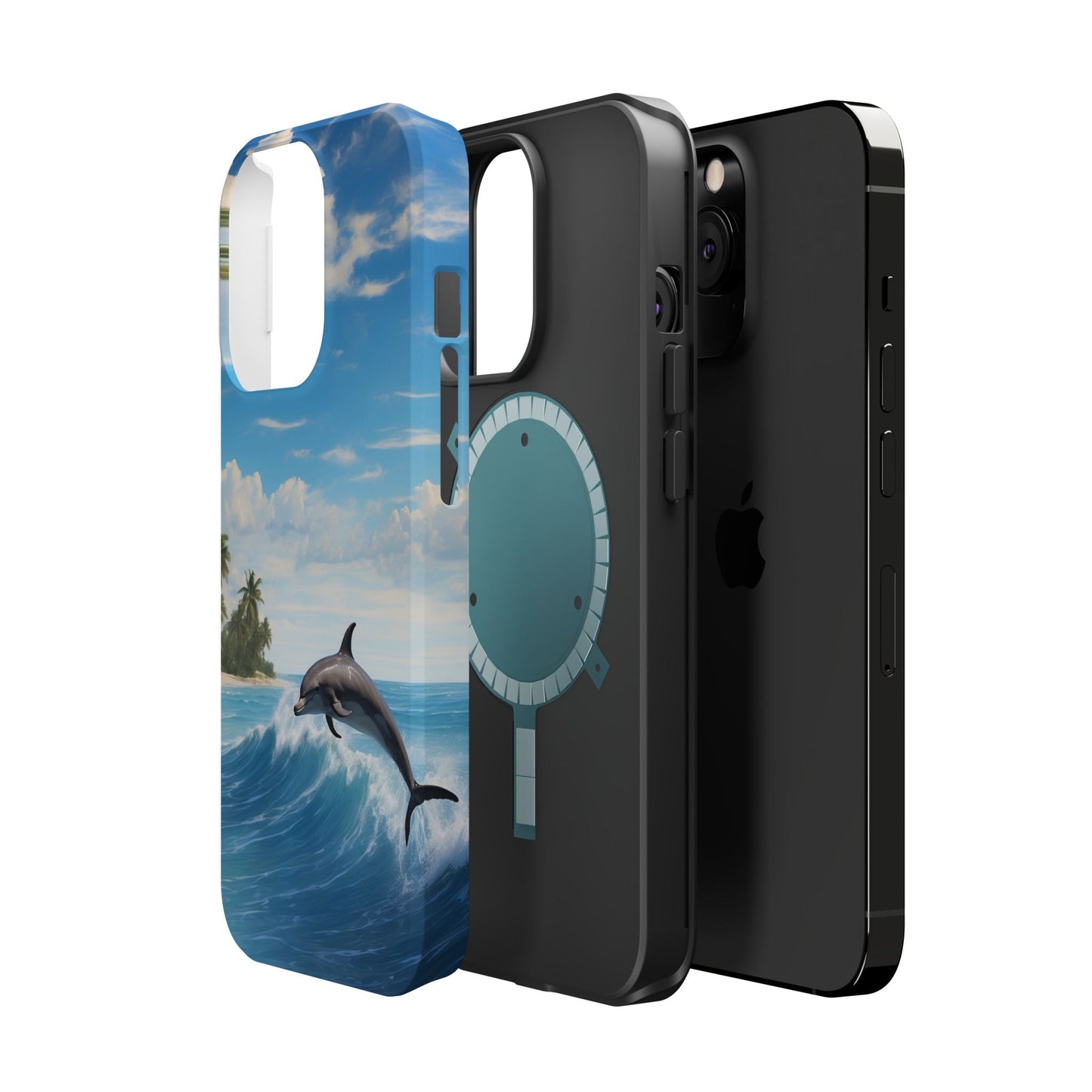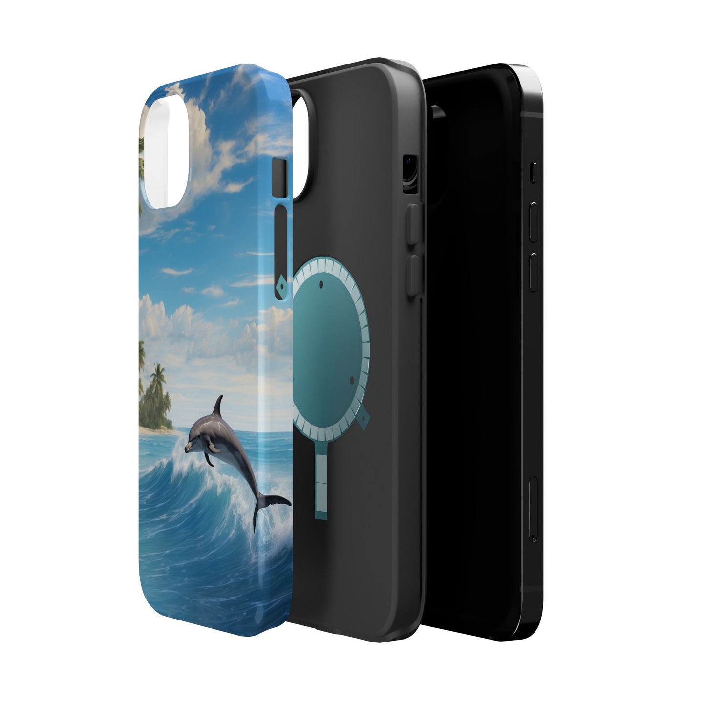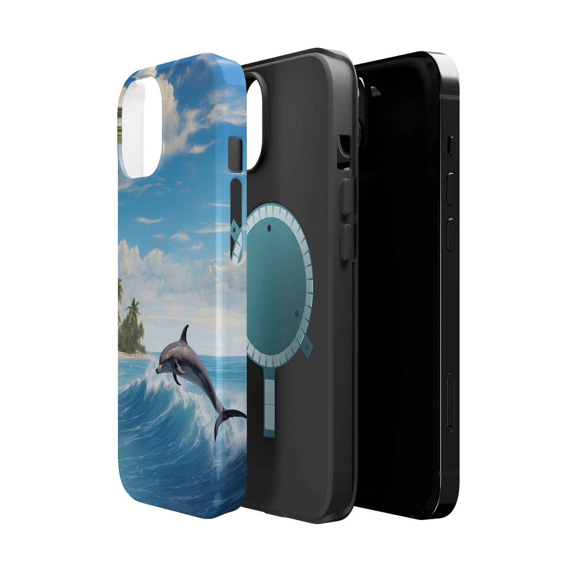 Ride the wave of convenience and style with this Tropical Surf Dolphin MagSafe Case! Featuring a majestic dolphin soaring over crystal-clear waves, this case brings a sense of freedom and ocean adventure to your device. With built-in MagSafe magnets for effortless wireless charging, plus a shockproof TPU bumper and hard polycarbonate shell, it’s both functional and stylish.