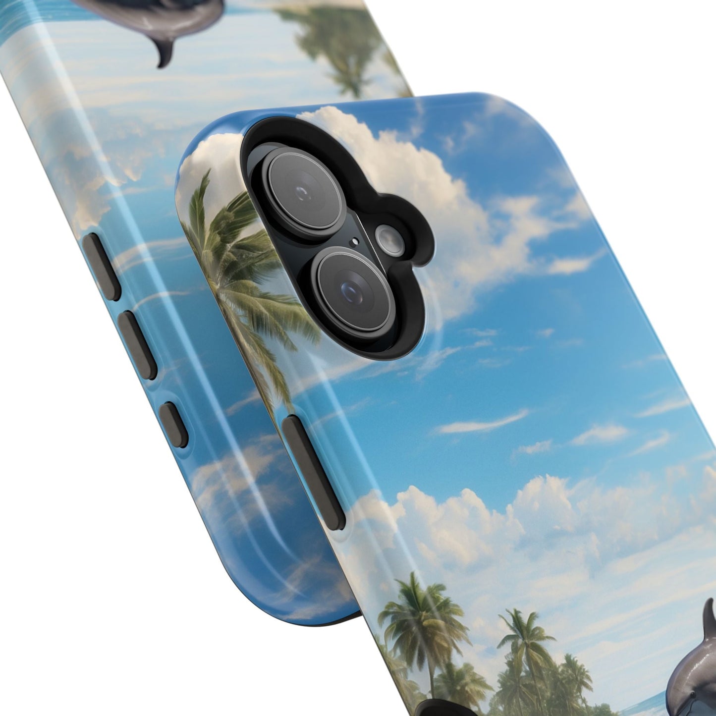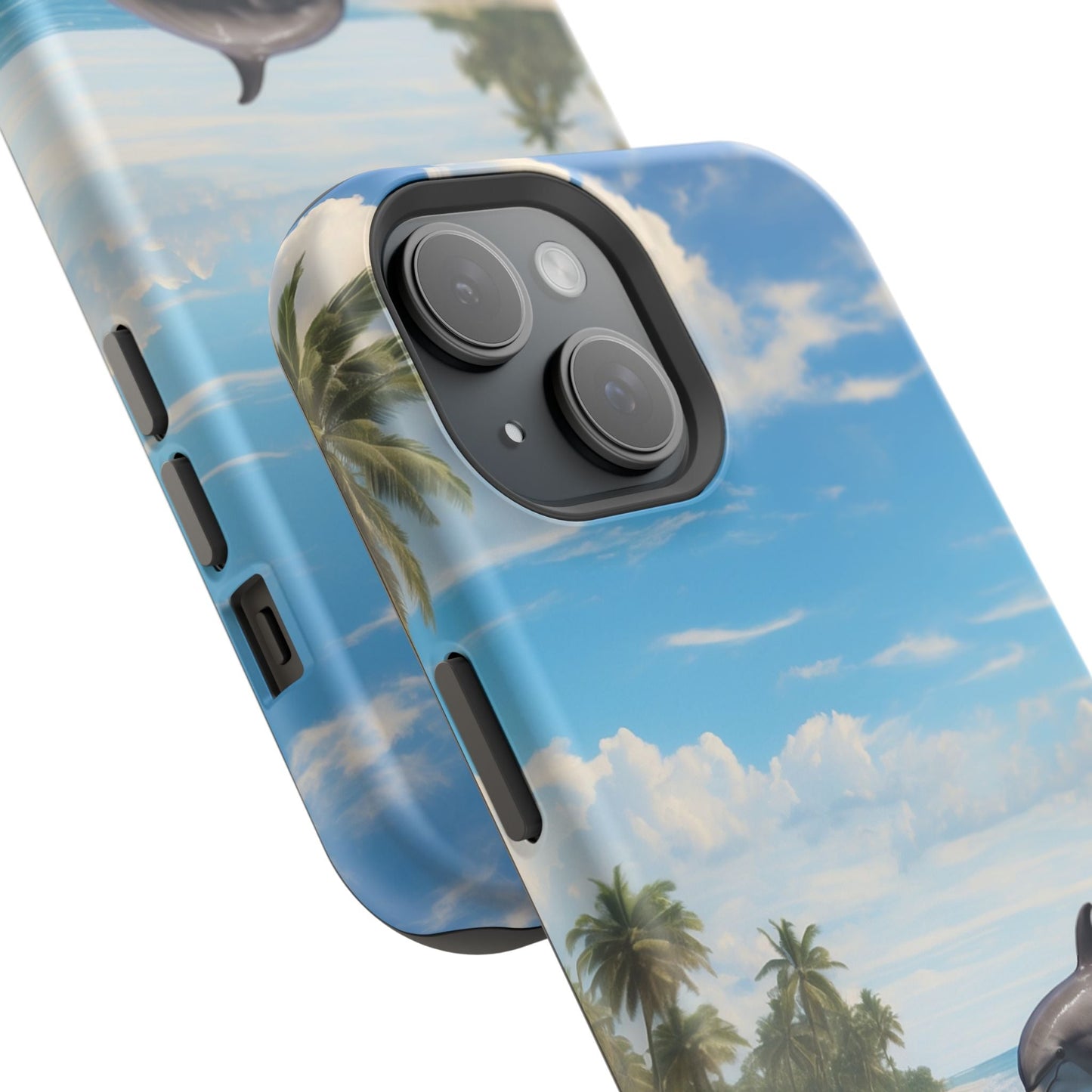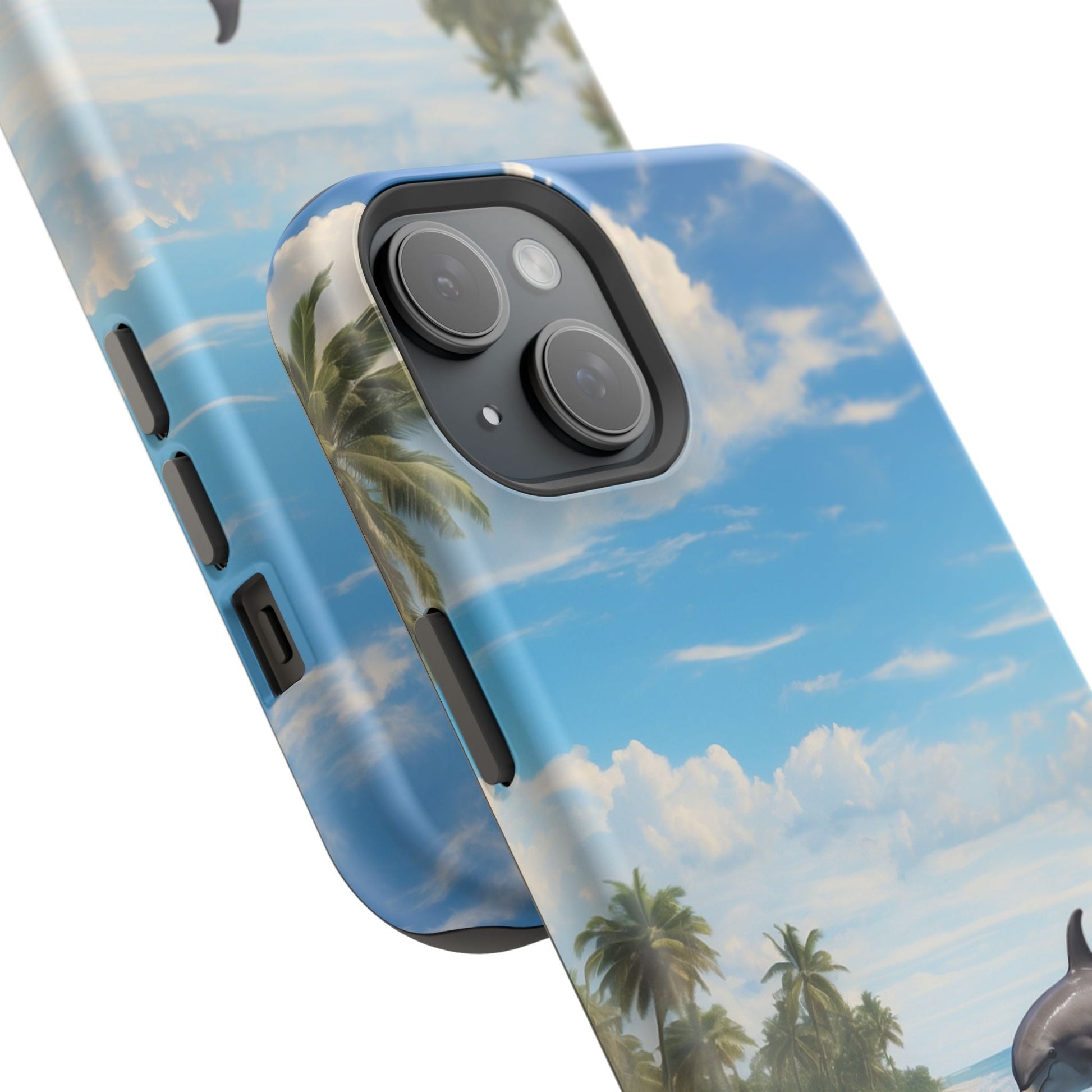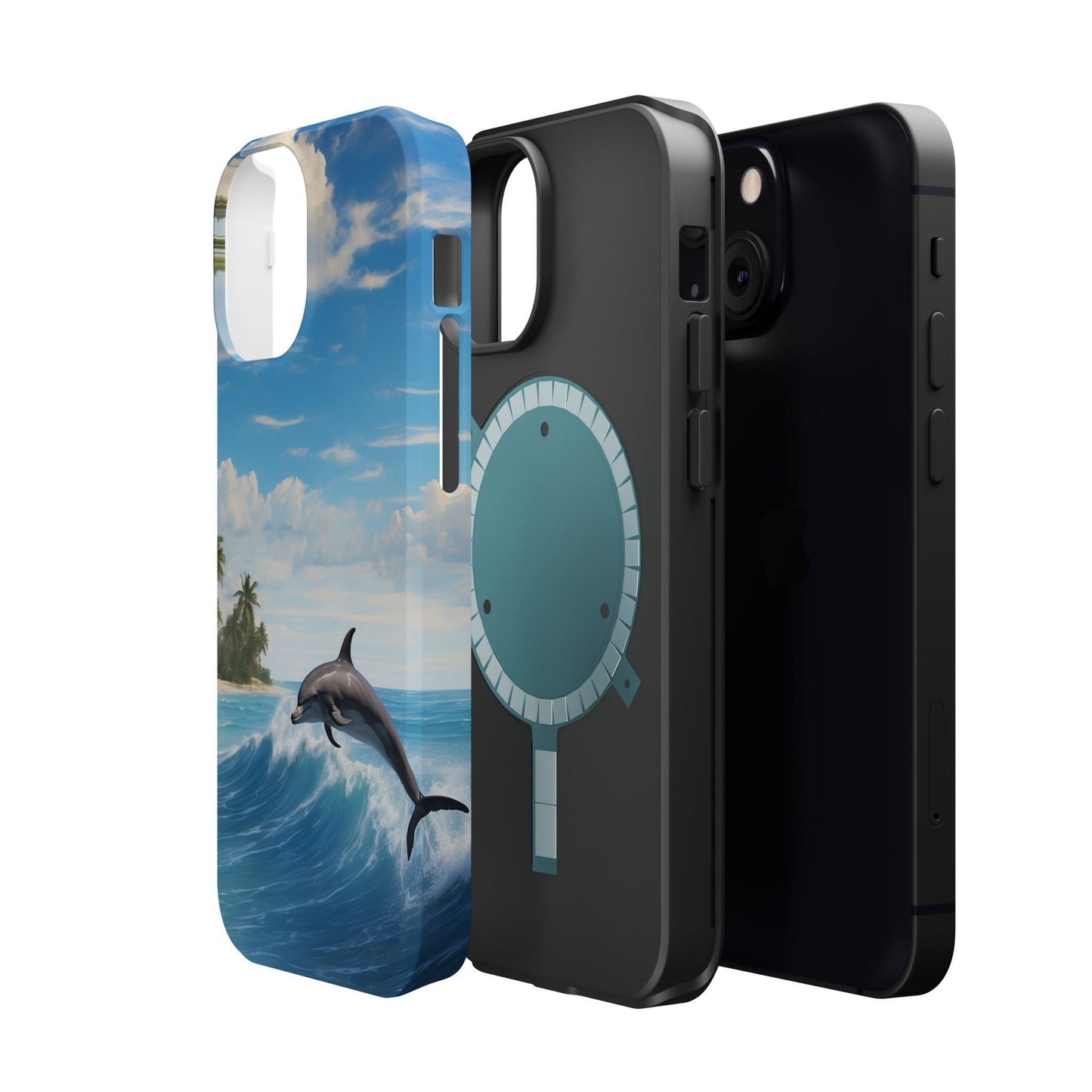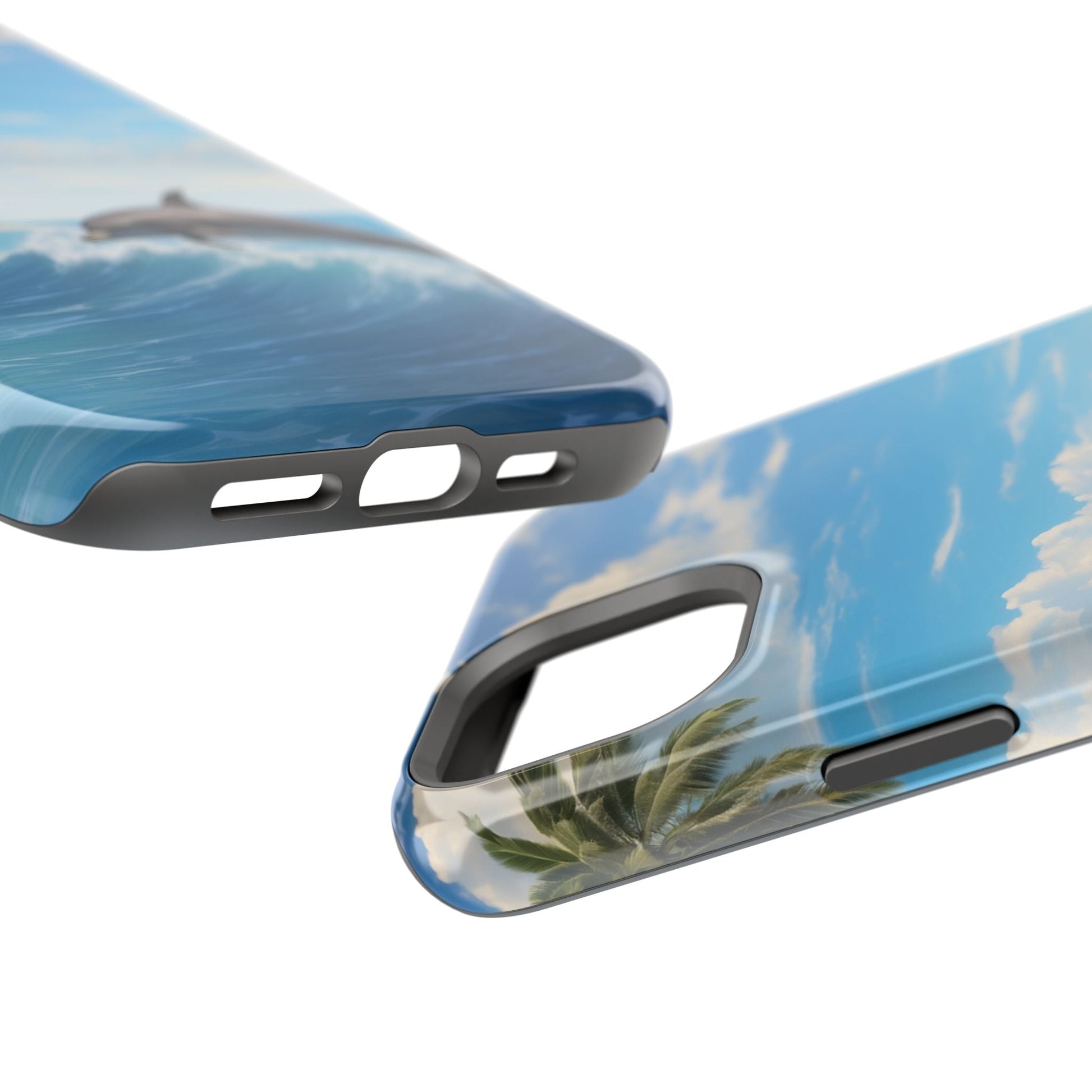 Ride the wave of convenience and style with this Tropical Surf Dolphin MagSafe Case! Featuring a majestic dolphin soaring over crystal-clear waves, this case brings a sense of freedom and ocean adventure to your device. With built-in MagSafe magnets for effortless wireless charging, plus a shockproof TPU bumper and hard polycarbonate shell, it’s both functional and stylish.